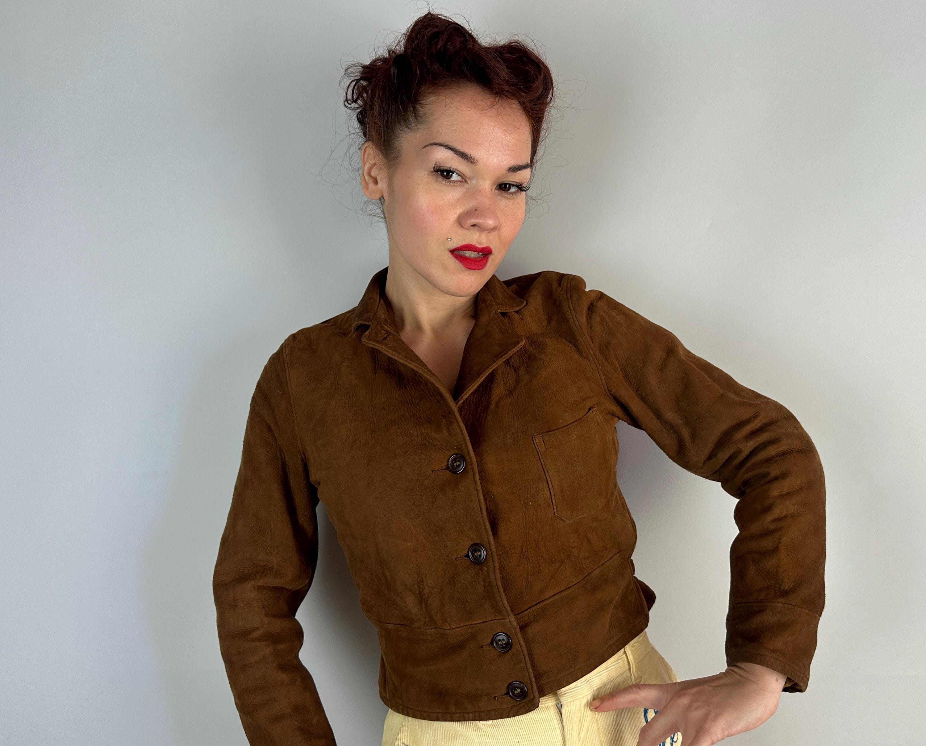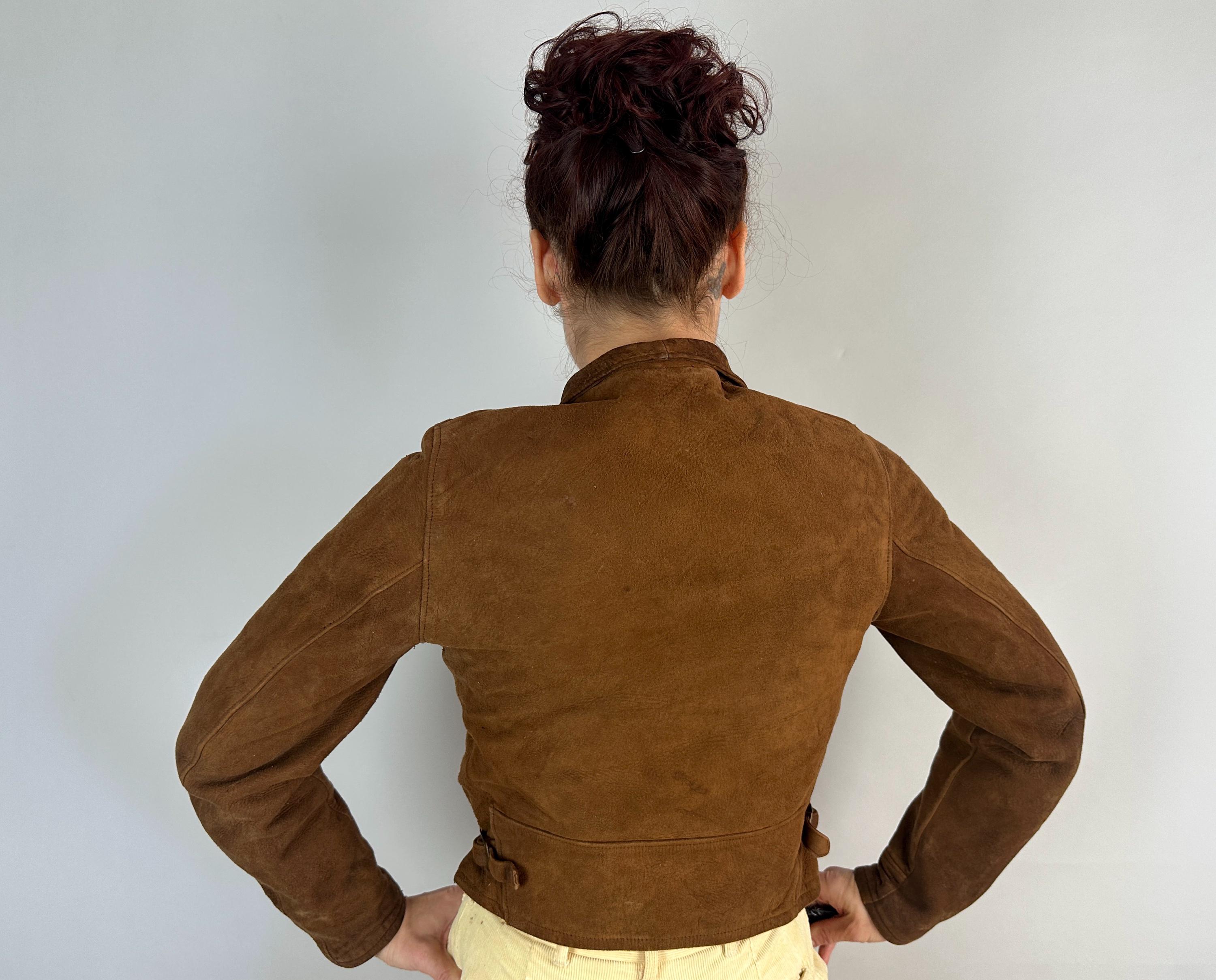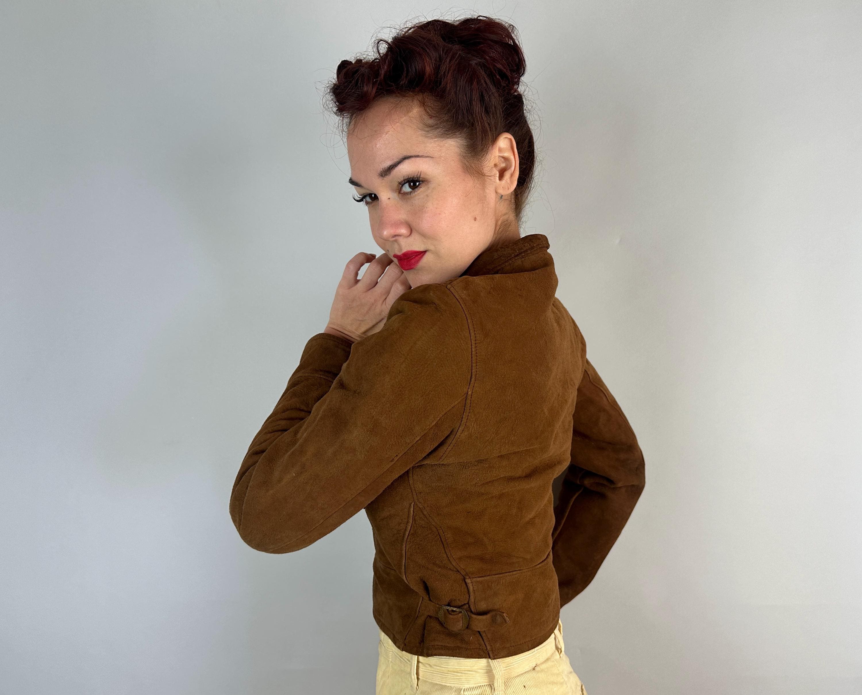 You'll be set to tackle anything and look chic doing it in this 1930s cossack jacket! Supple walnut brown suede looks super chic in this cropped cut. It fastens with buttons and features hammered brass waist adjusters, chest pocket, and notched collar. A full flannel lining makes a cozy addition. This jacket is in great vintage condition, with no stains, holes, or odors to note.