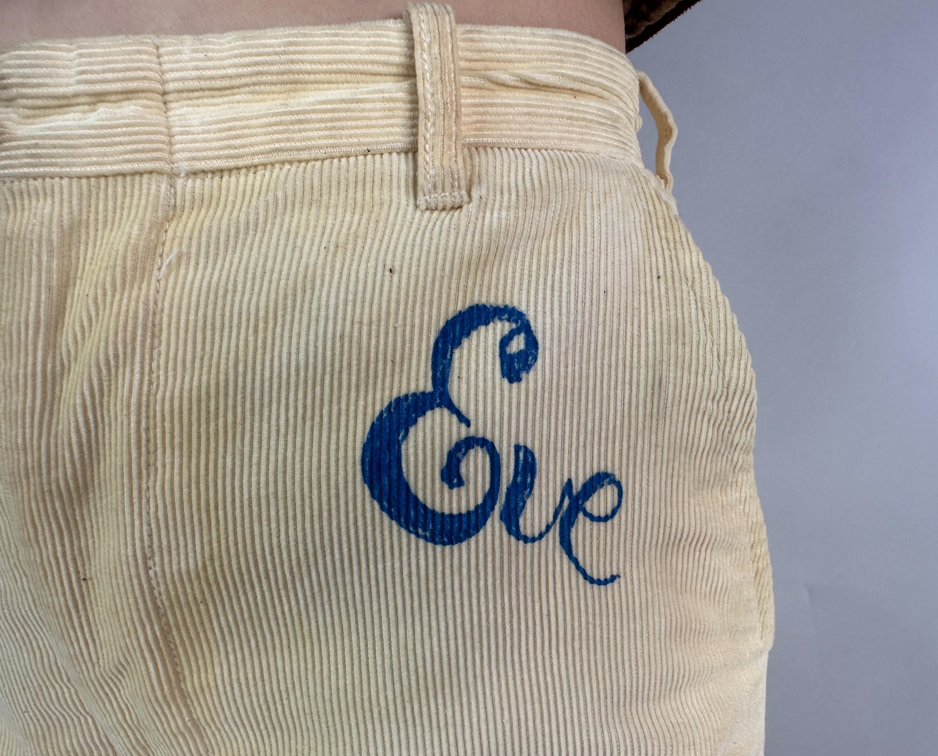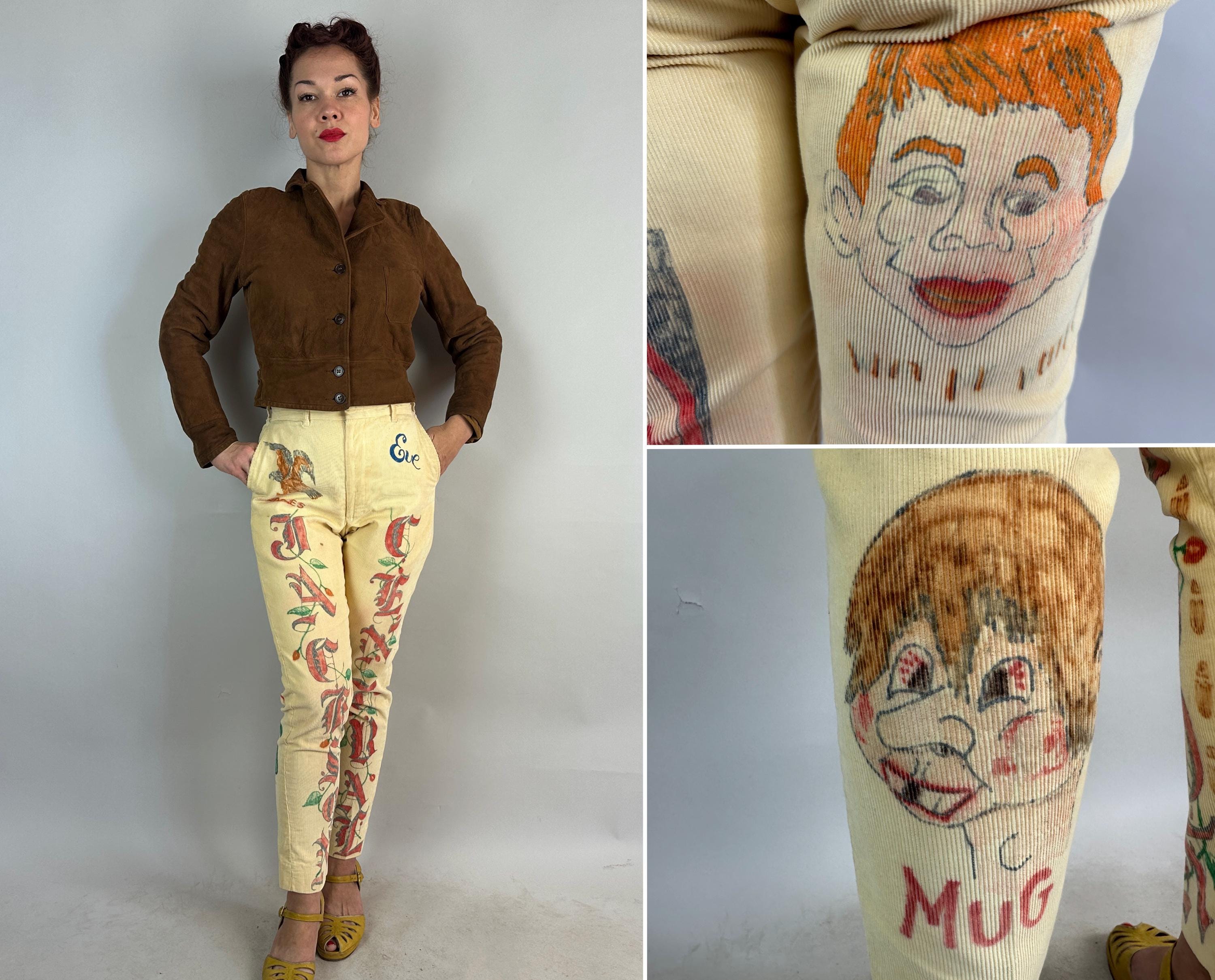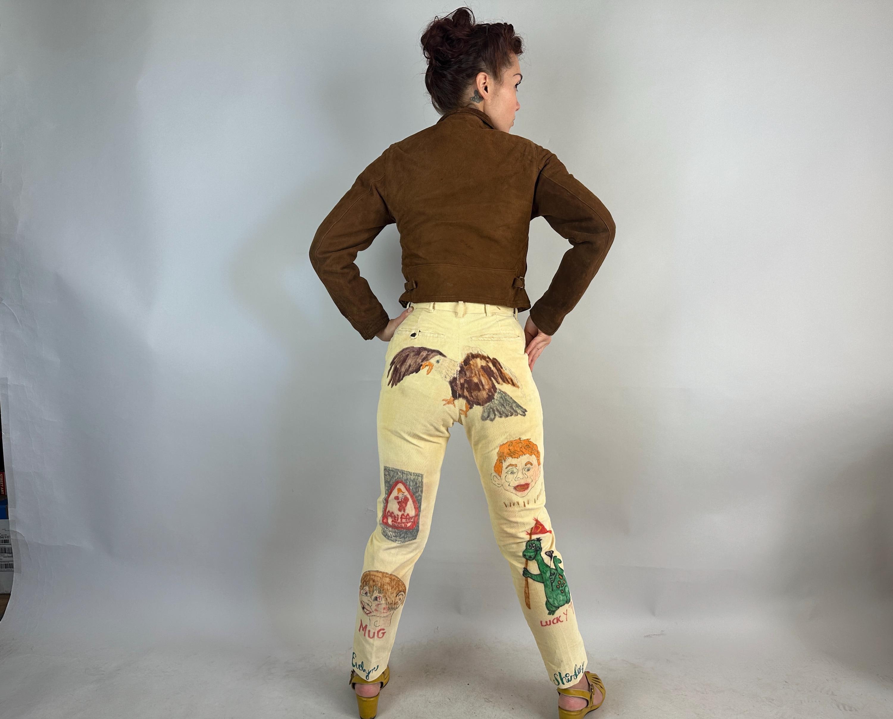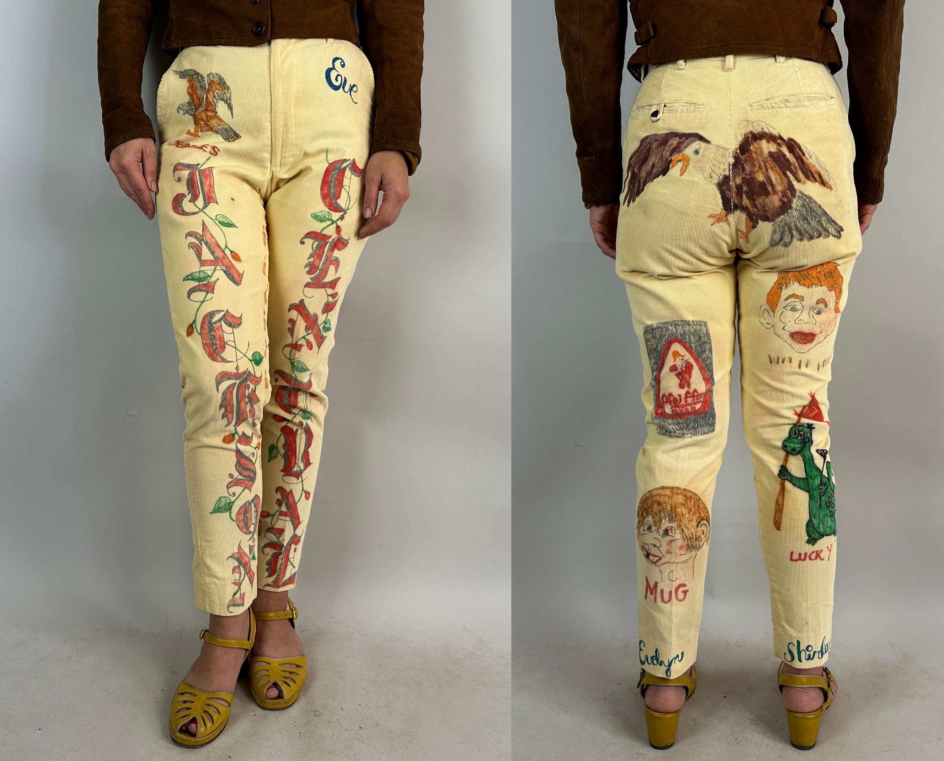 You'll be flying high on good vibes just like a senior at the end of year in these 1960s senior cords! The corduroy trousers are eggshell white making the ideal background for the artistic flair of these Jackson Central students. Hand drawn images feature great throwbacks to their time including Mad Magazine cartoons (started in '52!), gothic lettering, and a trio of girl's names in lovely script. The pants are fashioned with slanted hip pockets, welted back pockets (one with button tab), belt loops, and hidden hook and eye with metal "Talon" zipper fly. These trousers are in great vintage condition, with no holes, stains, or odors to note.