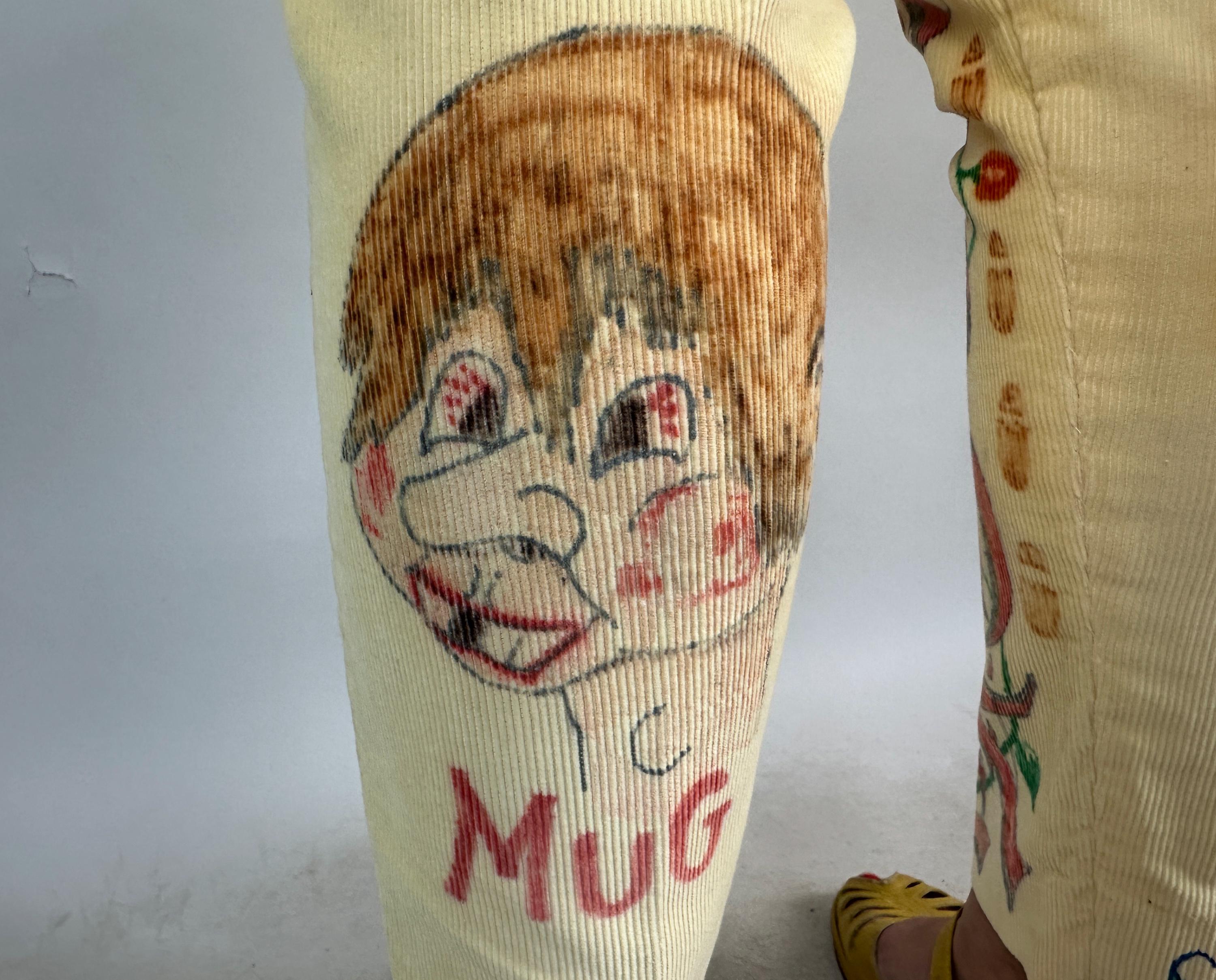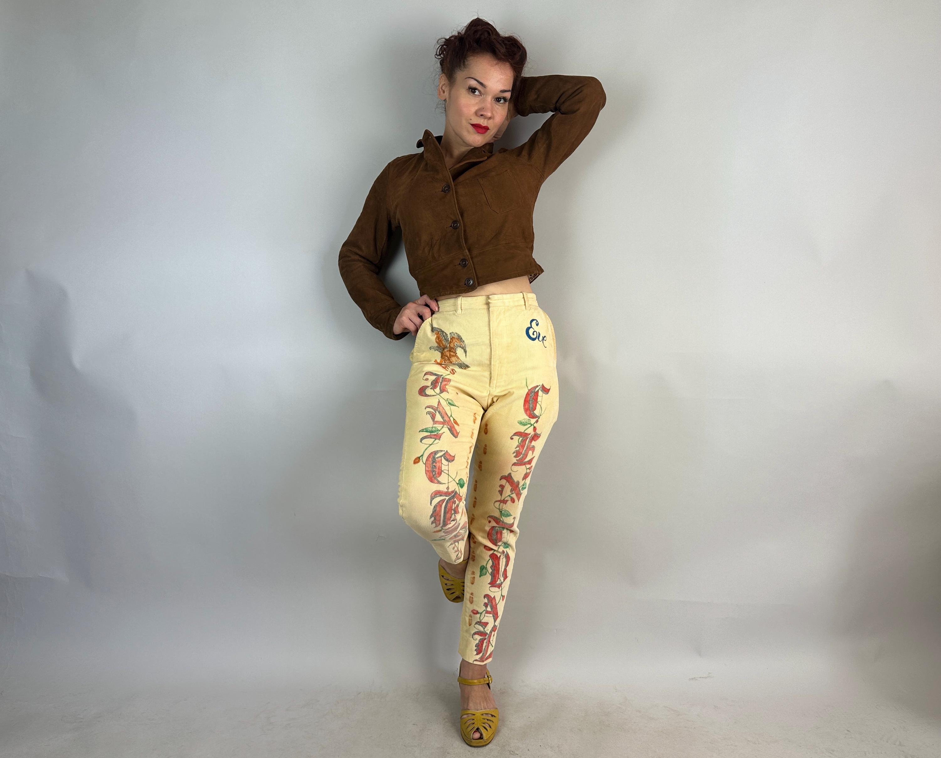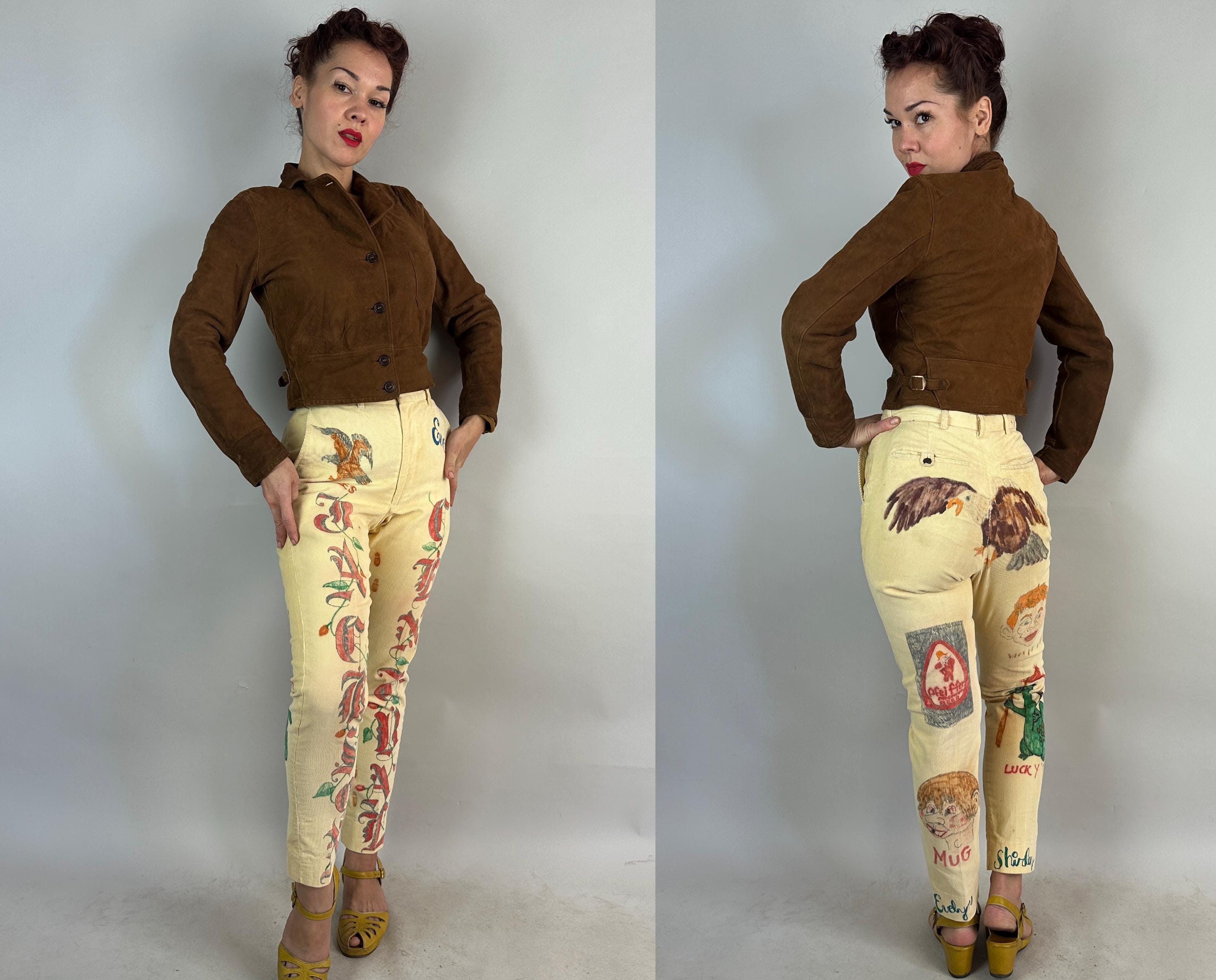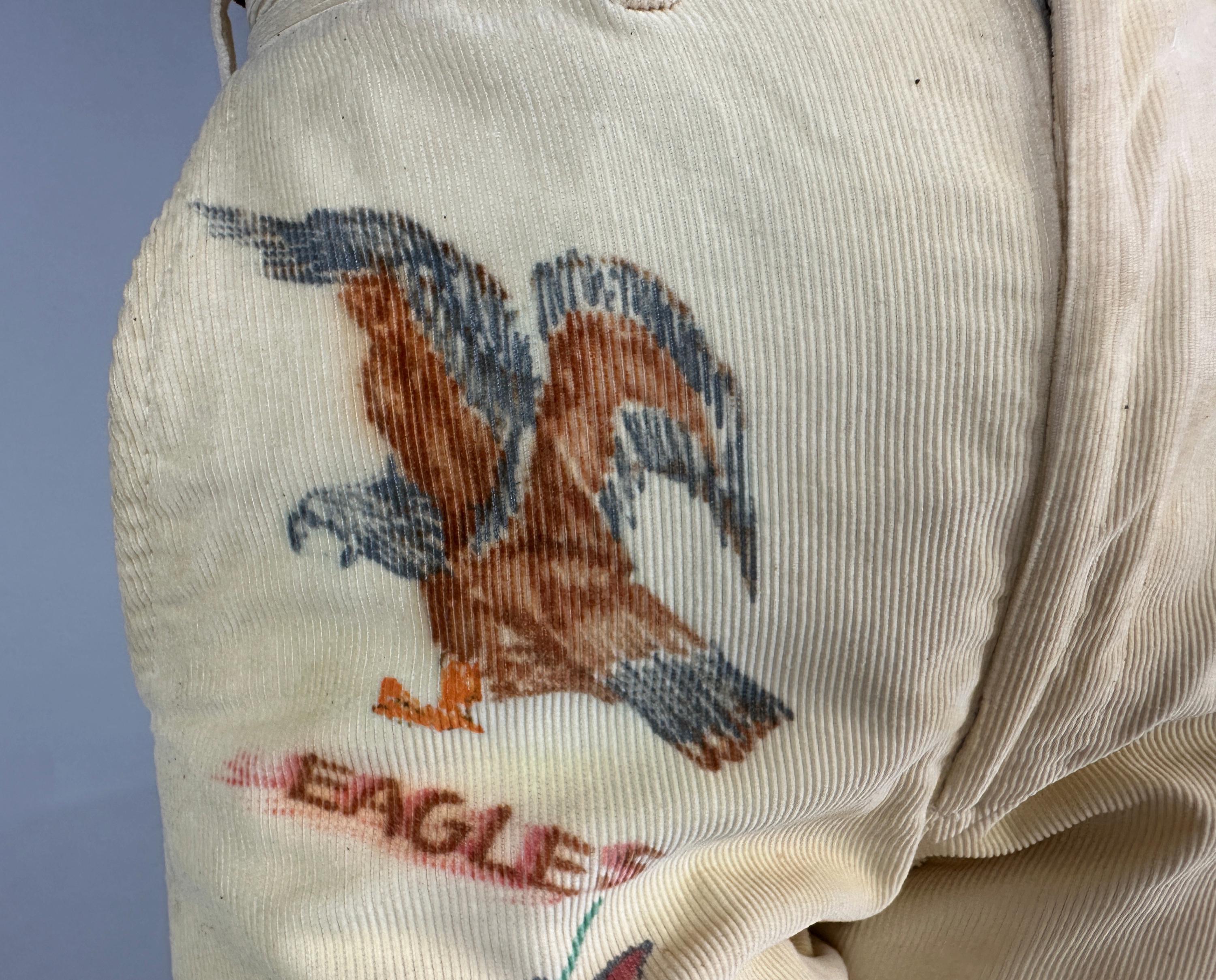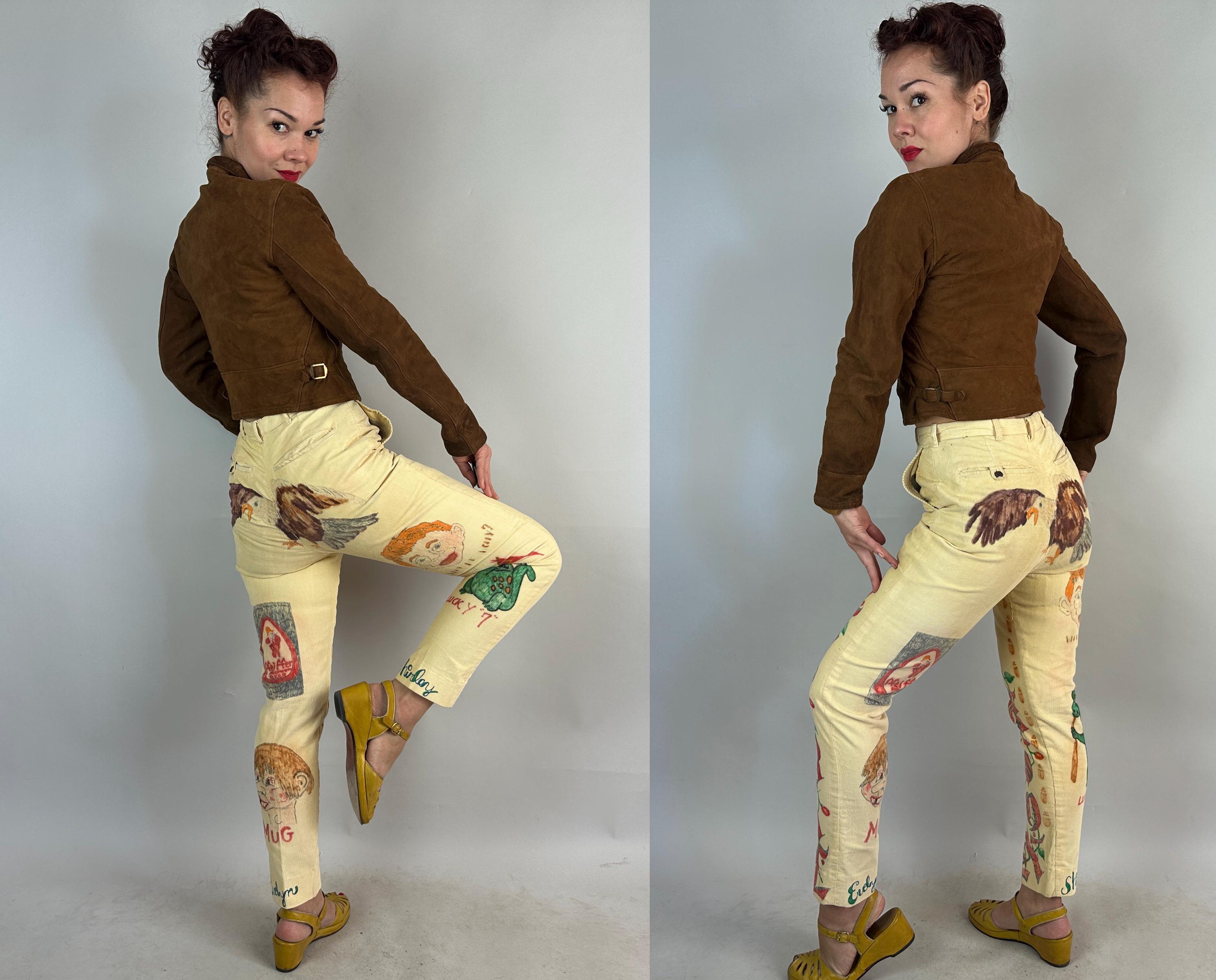 You'll be flying high on good vibes just like a senior at the end of year in these 1960s senior cords! The corduroy trousers are eggshell white making the ideal background for the artistic flair of these Jackson Central students. Hand drawn images feature great throwbacks to their time including Mad Magazine cartoons (started in '52!), gothic lettering, and a trio of girl's names in lovely script. The pants are fashioned with slanted hip pockets, welted back pockets (one with button tab), belt loops, and hidden hook and eye with metal "Talon" zipper fly. These trousers are in great vintage condition, with no holes, stains, or odors to note.