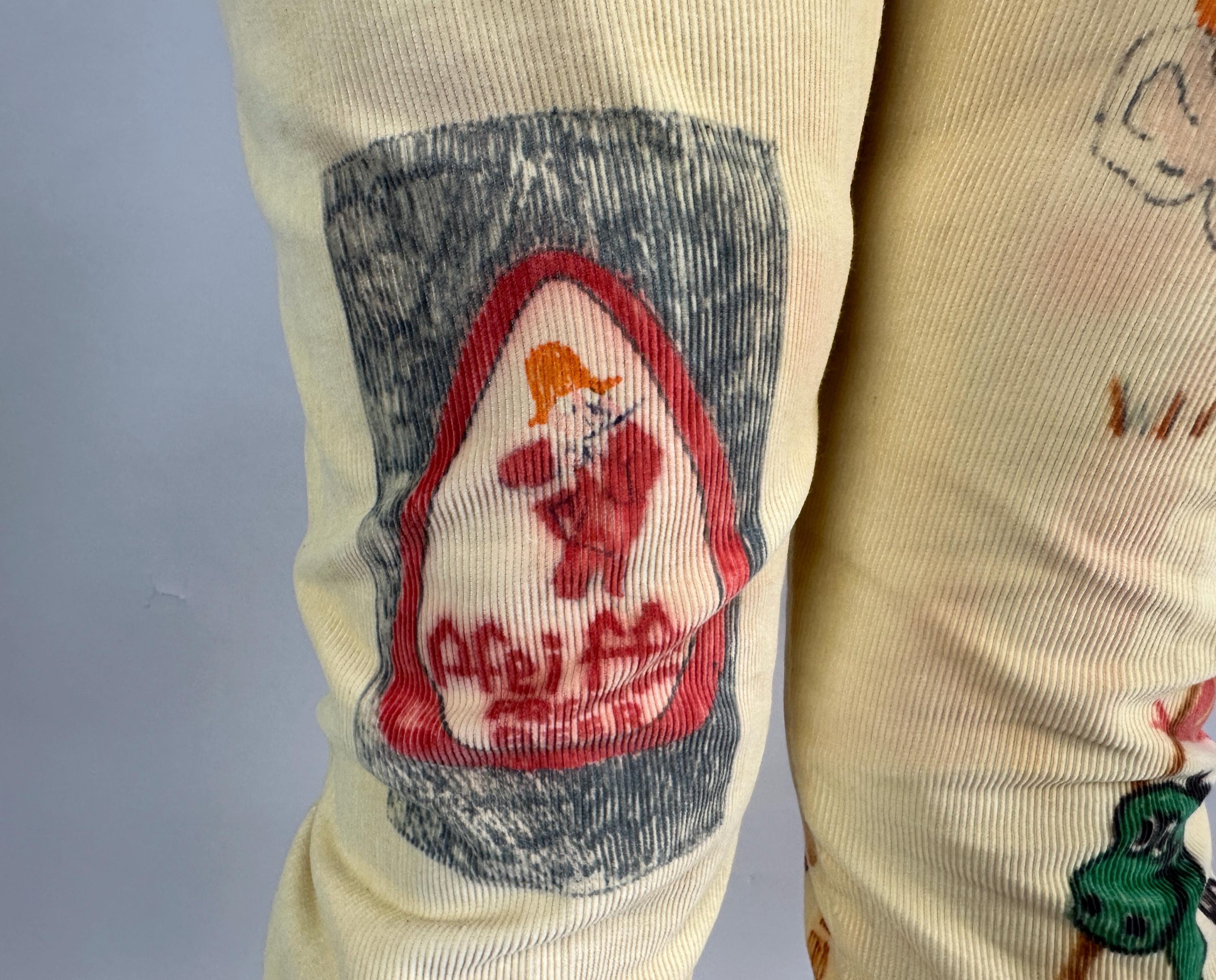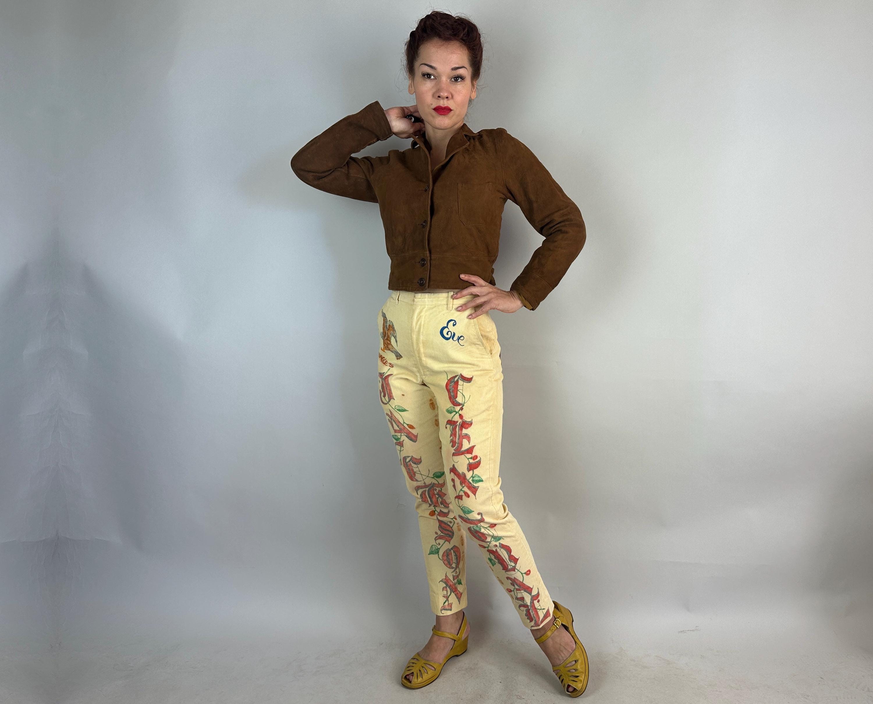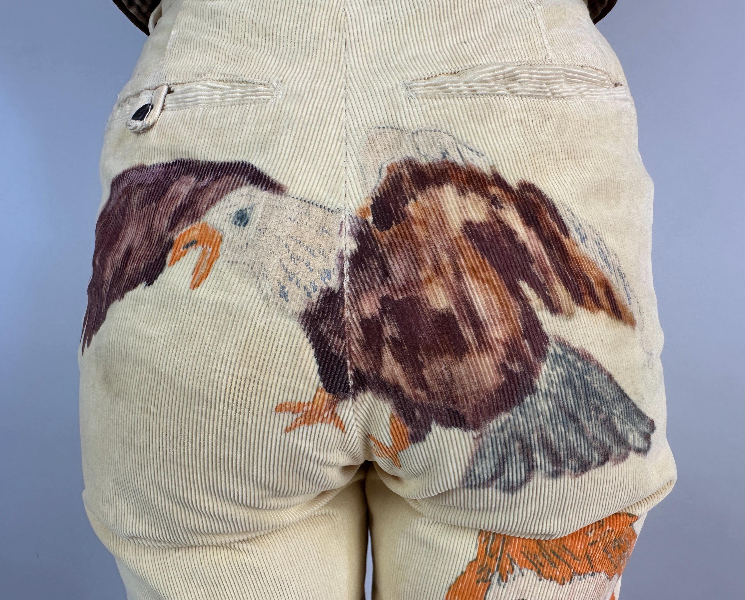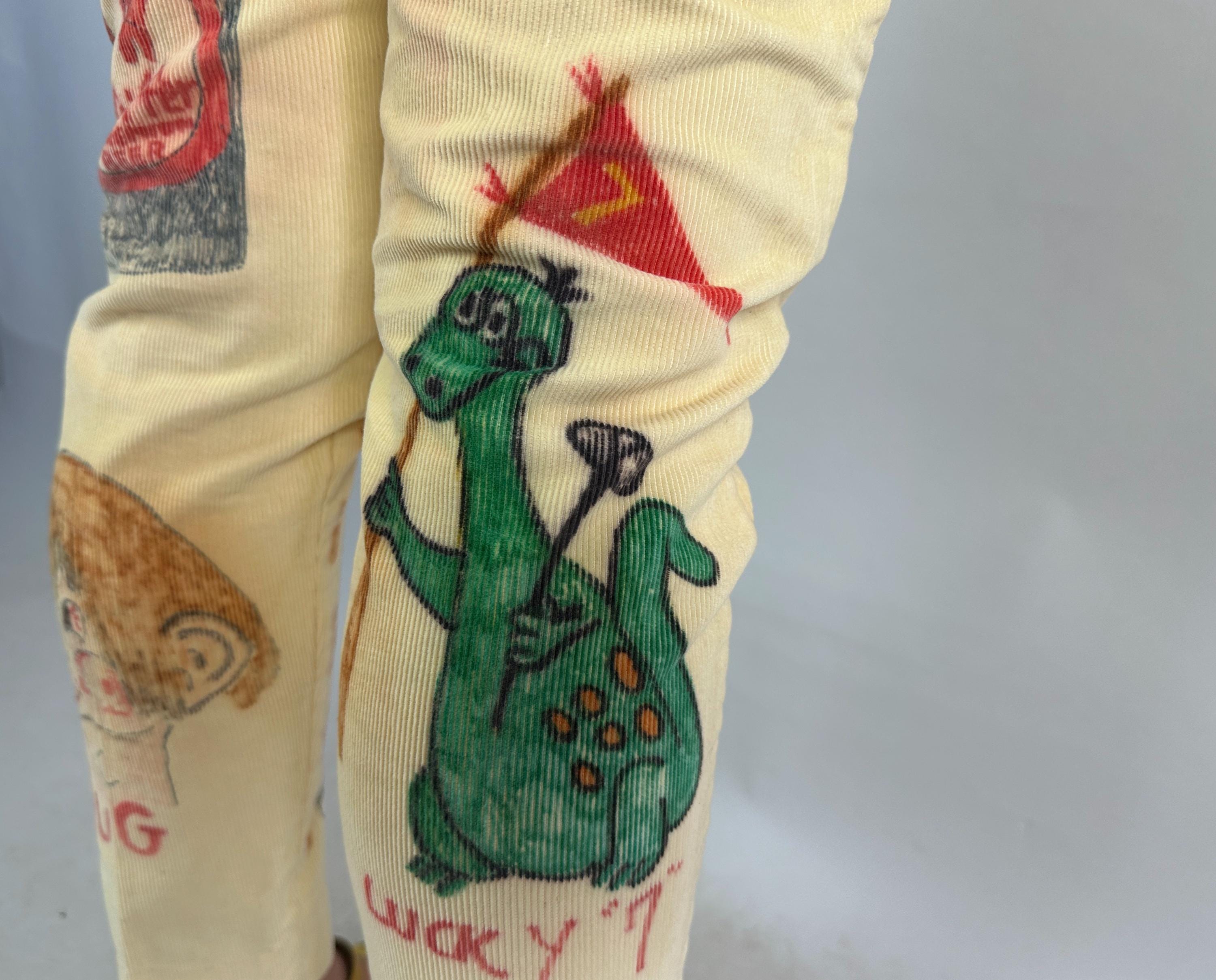 You'll be flying high on good vibes just like a senior at the end of year in these 1960s senior cords! The corduroy trousers are eggshell white making the ideal background for the artistic flair of these Jackson Central students. Hand drawn images feature great throwbacks to their time including Mad Magazine cartoons (started in '52!), gothic lettering, and a trio of girl's names in lovely script. The pants are fashioned with slanted hip pockets, welted back pockets (one with button tab), belt loops, and hidden hook and eye with metal "Talon" zipper fly. These trousers are in great vintage condition, with no holes, stains, or odors to note.