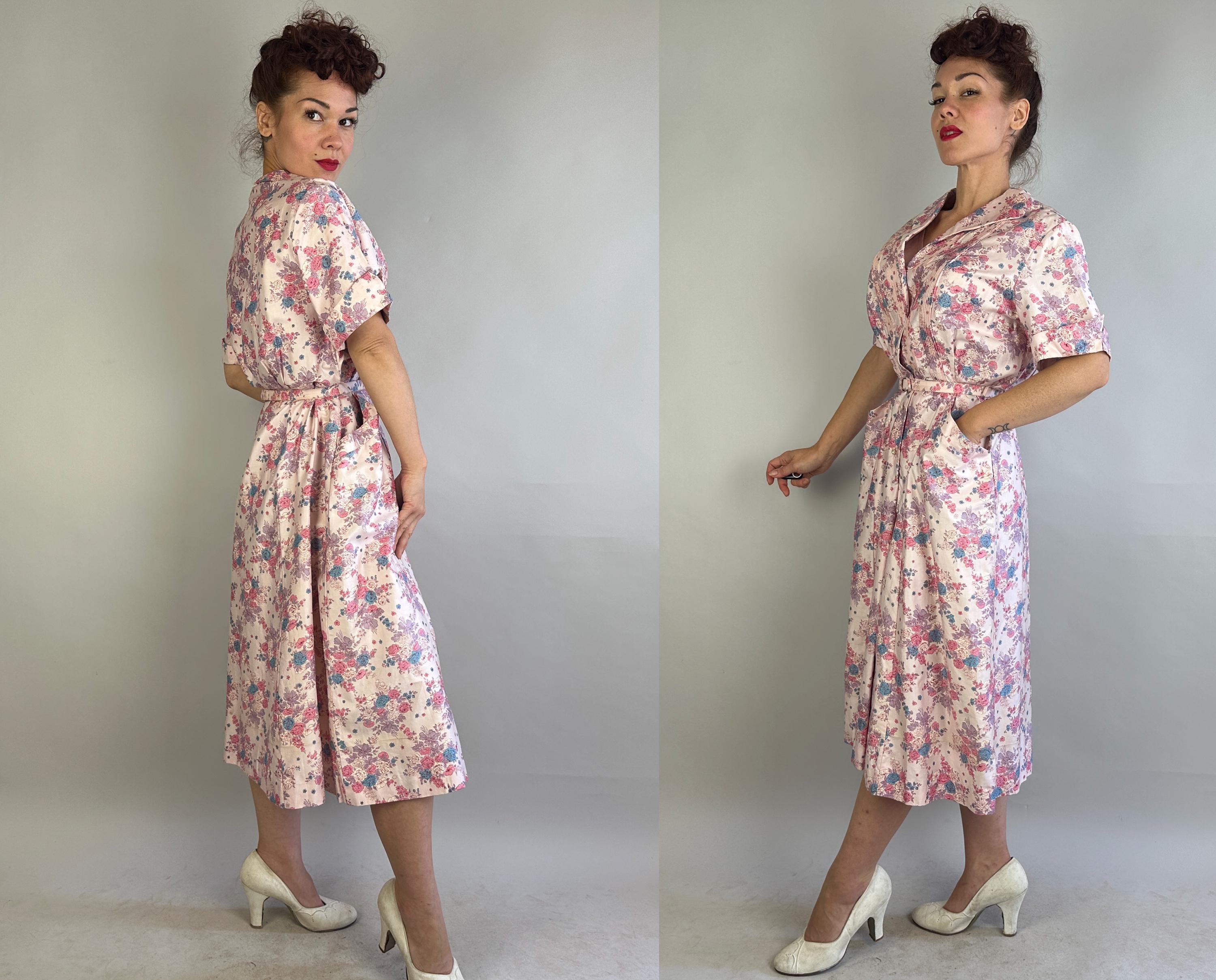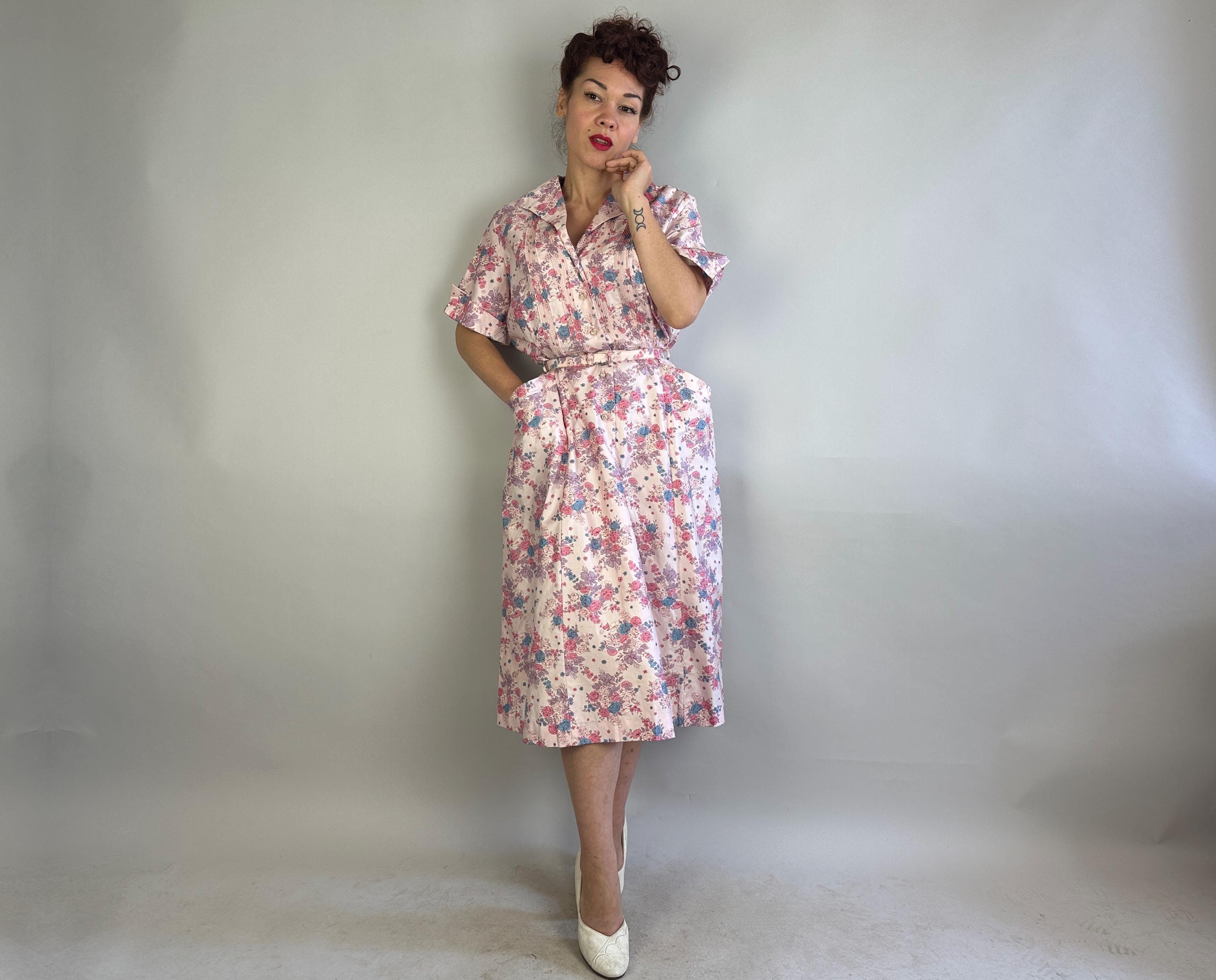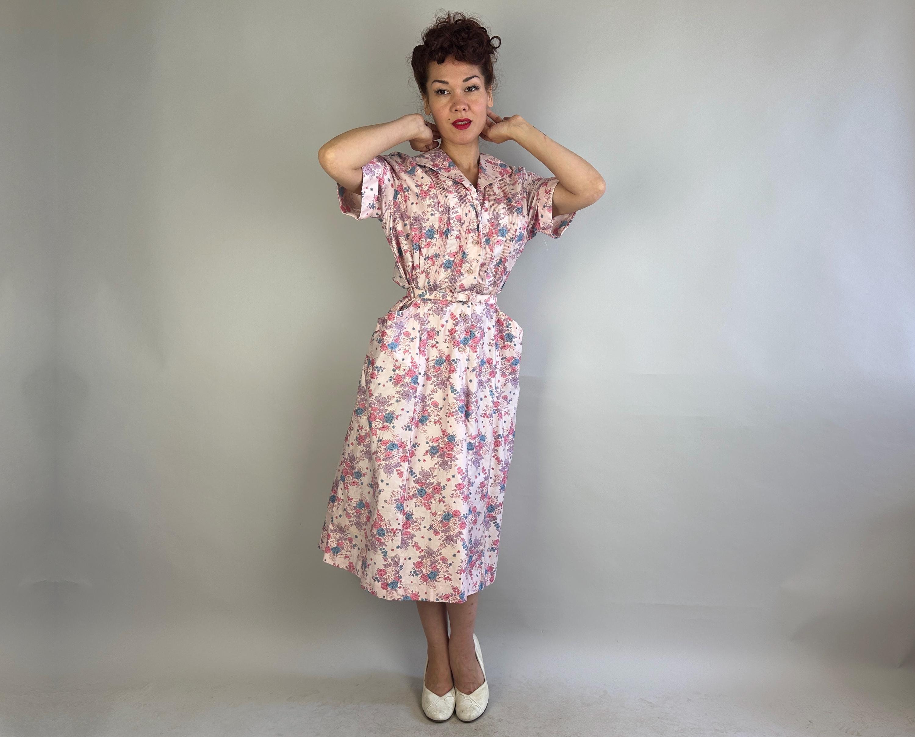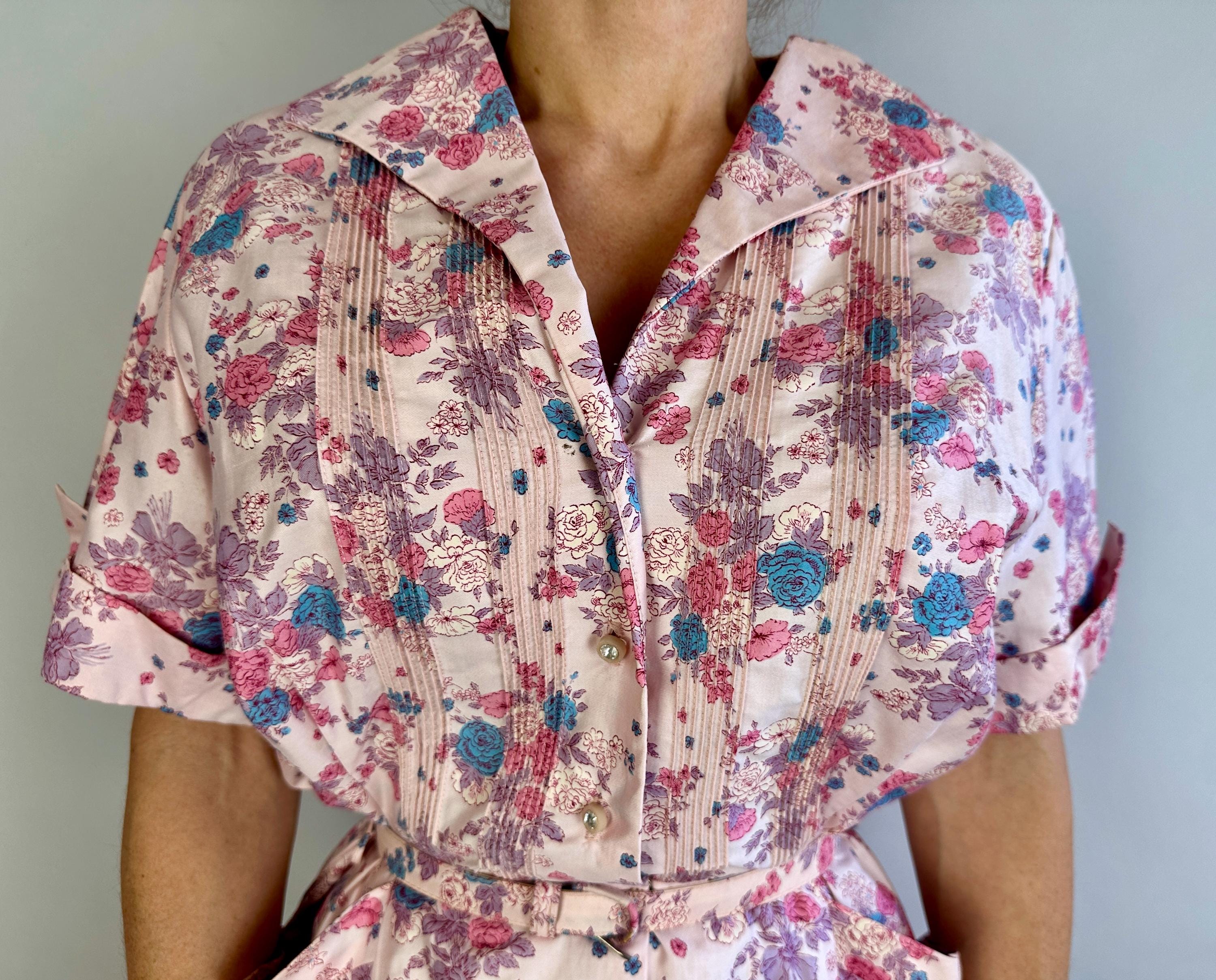 Bethe gift of a bouquet when you spend the day with your beau in this 1950s dress! The baby pink combed cotton has a light sheen enhancing the print of floral bouquets depicted in shades of lavender, bubblegum, sky blue, and palest blush. In a shirtwaist cut, accents include rows of pintucks on the bodice, wing collar, pointed notch cuffs, and slanted hip pockets. Rhinestone buttons fasten and a matching belt is the finishing touch. Labeled "Pat Perkins". This dress is in great vintage condition, with no holes, stains, or odors to note. Dress has been pinned on model to show fit.