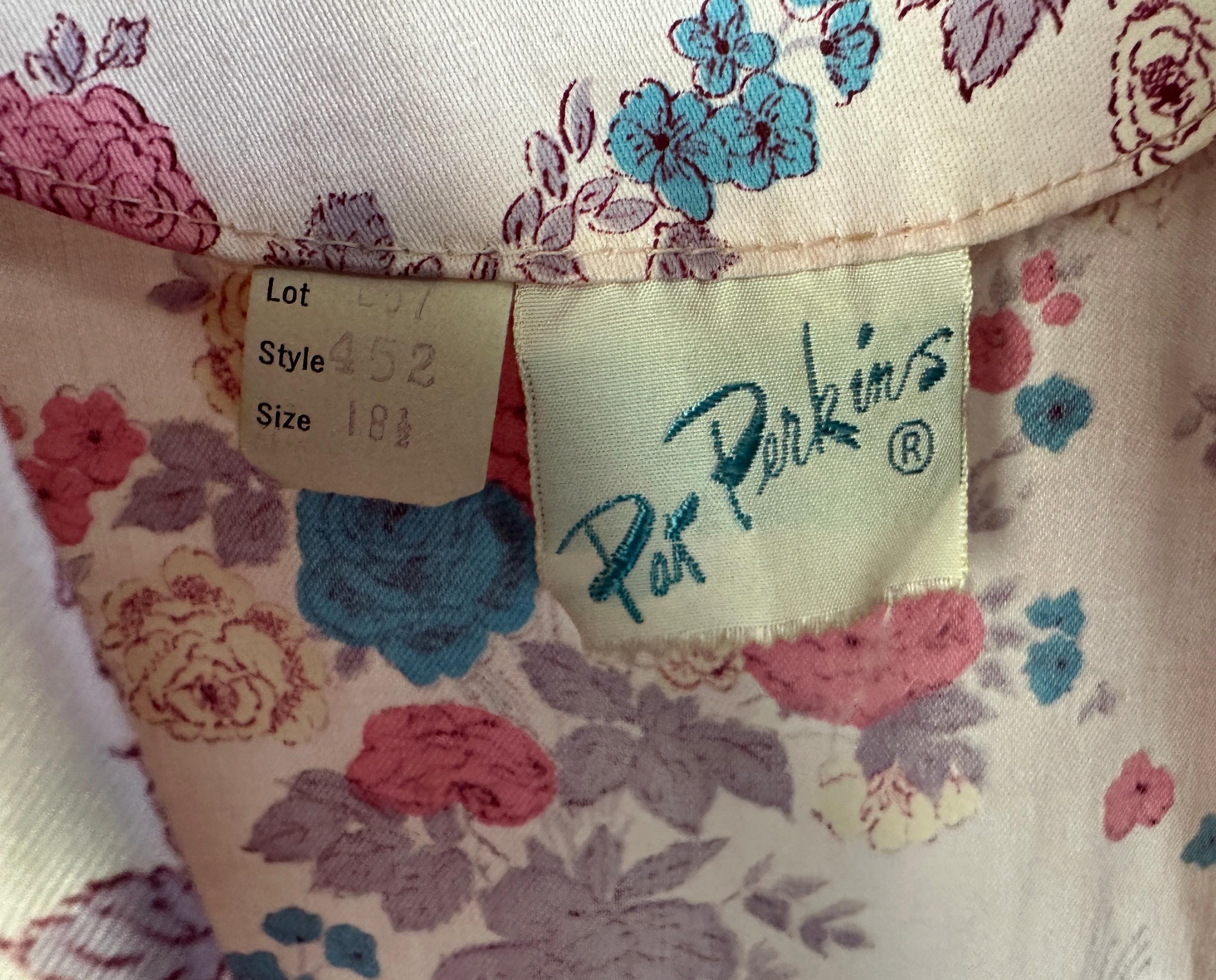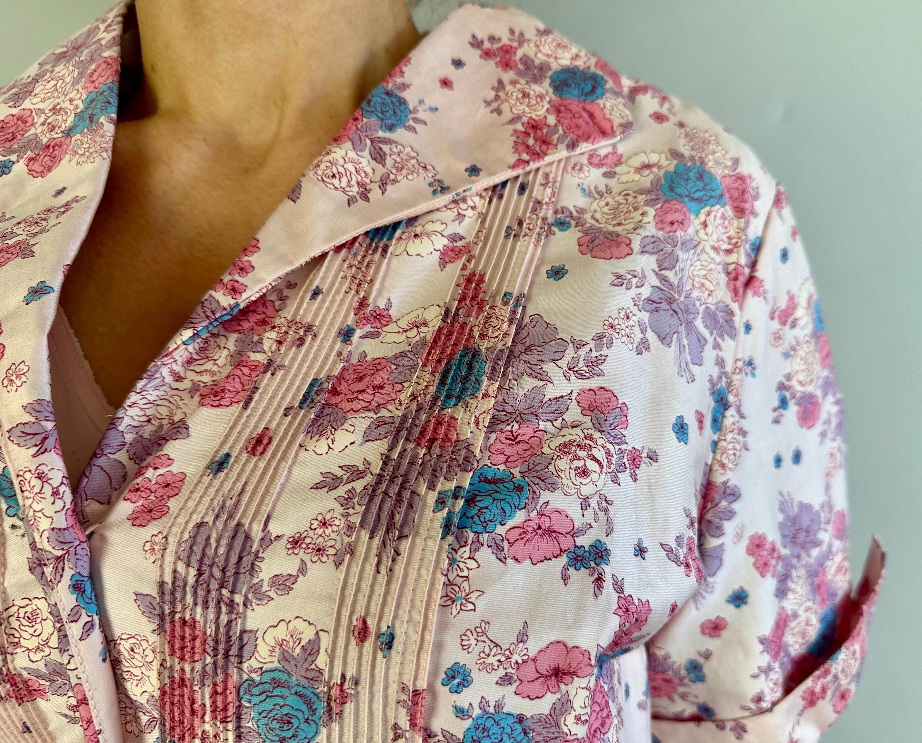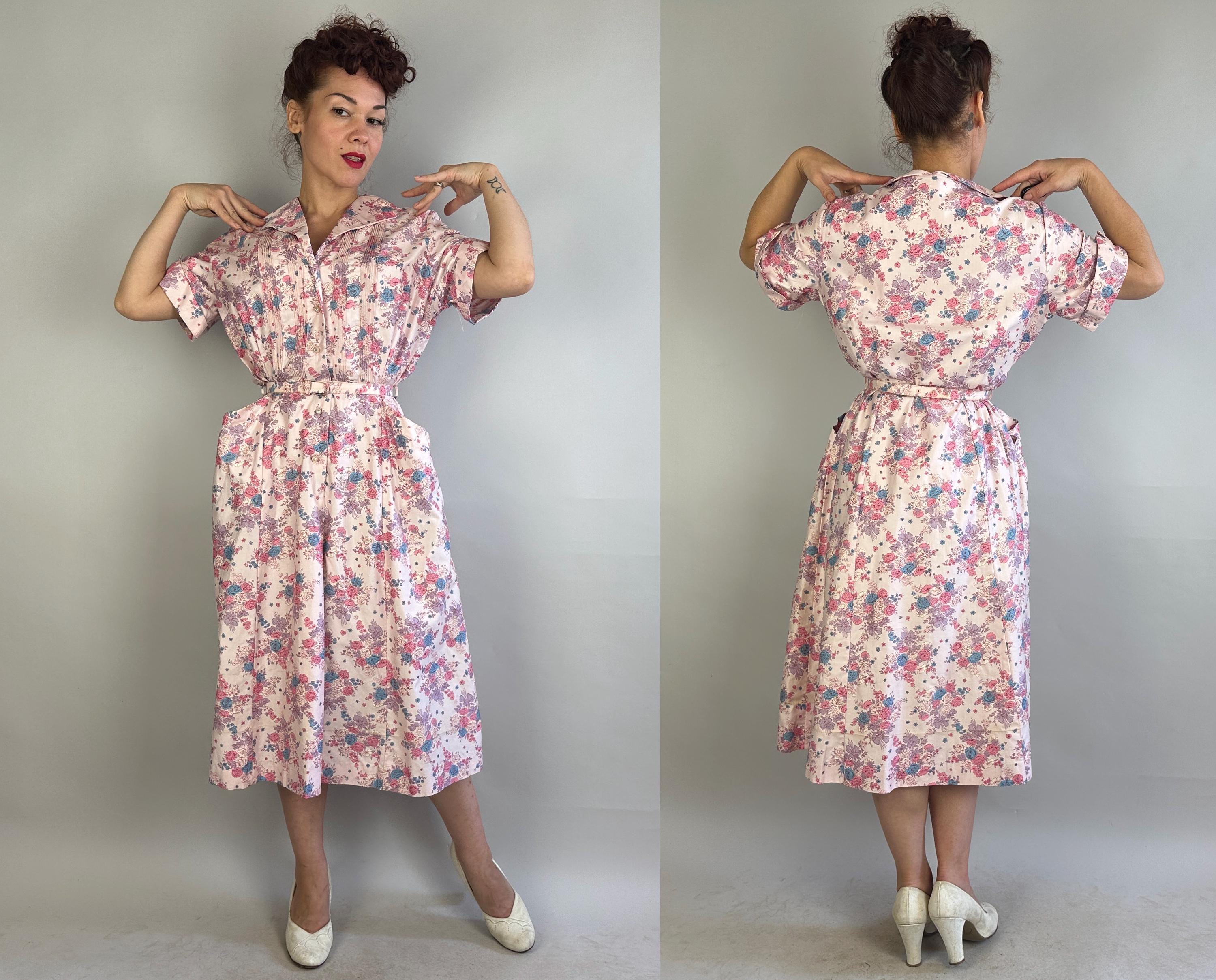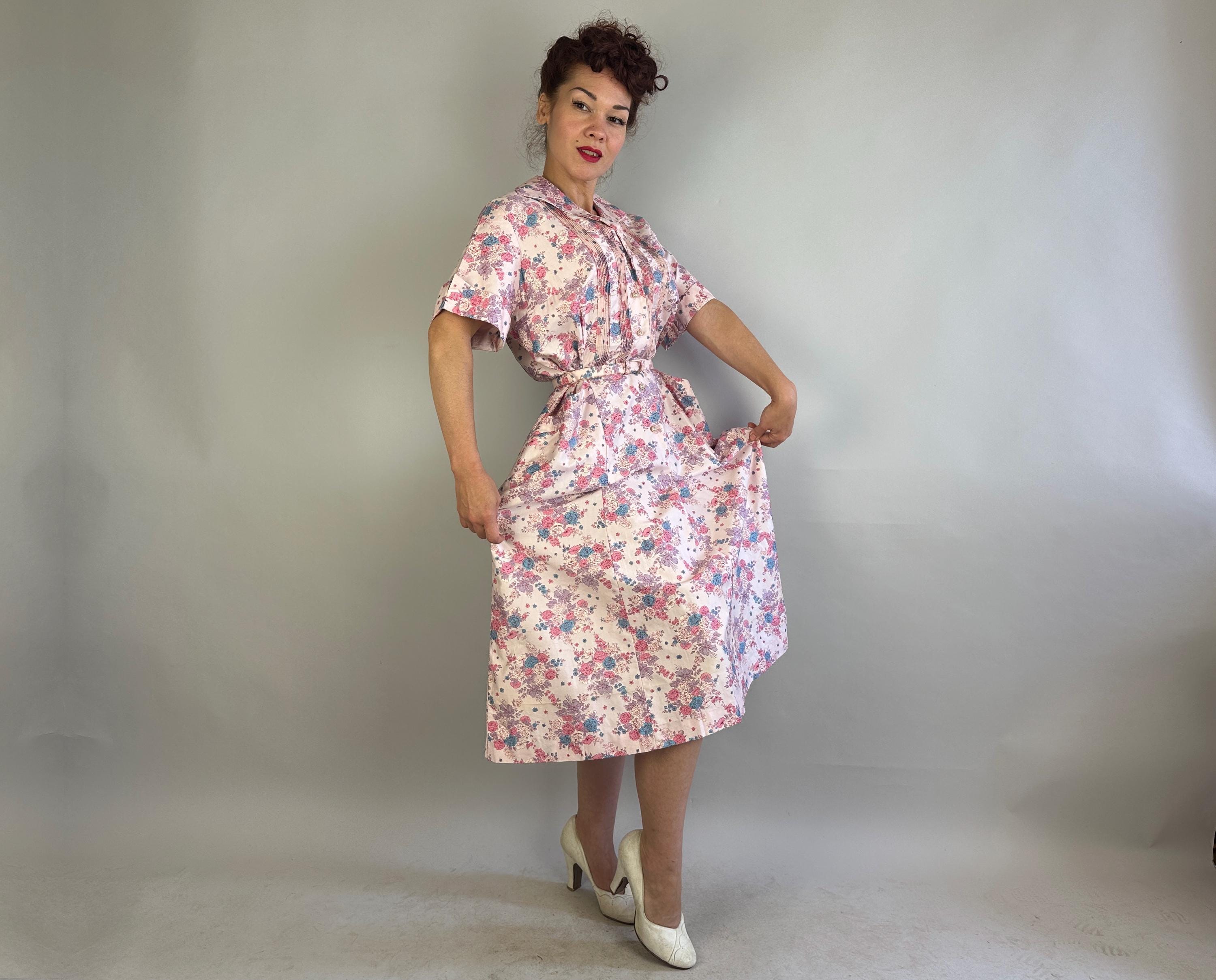 Bethe gift of a bouquet when you spend the day with your beau in this 1950s dress! The baby pink combed cotton has a light sheen enhancing the print of floral bouquets depicted in shades of lavender, bubblegum, sky blue, and palest blush. In a shirtwaist cut, accents include rows of pintucks on the bodice, wing collar, pointed notch cuffs, and slanted hip pockets. Rhinestone buttons fasten and a matching belt is the finishing touch. Labeled "Pat Perkins". This dress is in great vintage condition, with no holes, stains, or odors to note. Dress has been pinned on model to show fit.