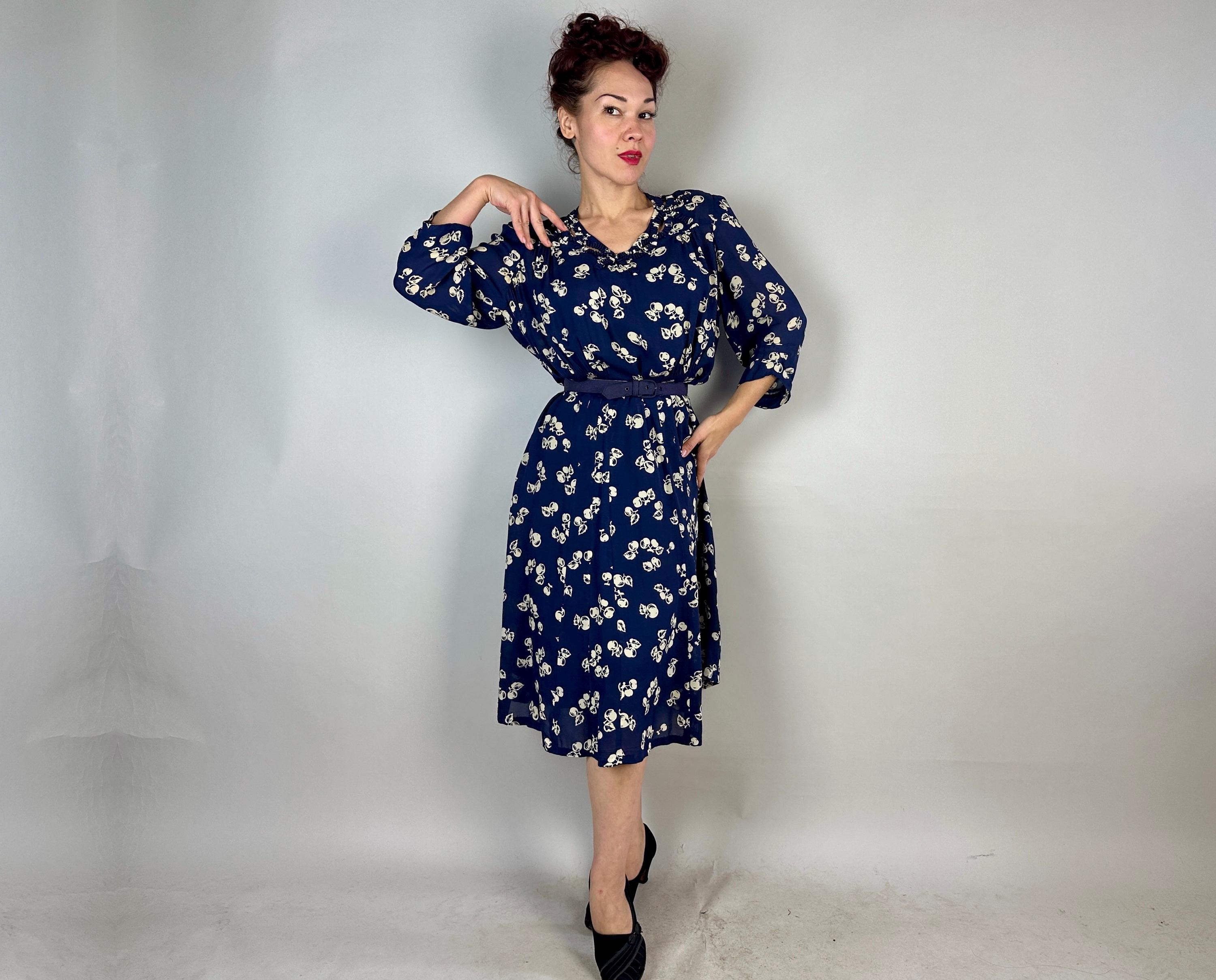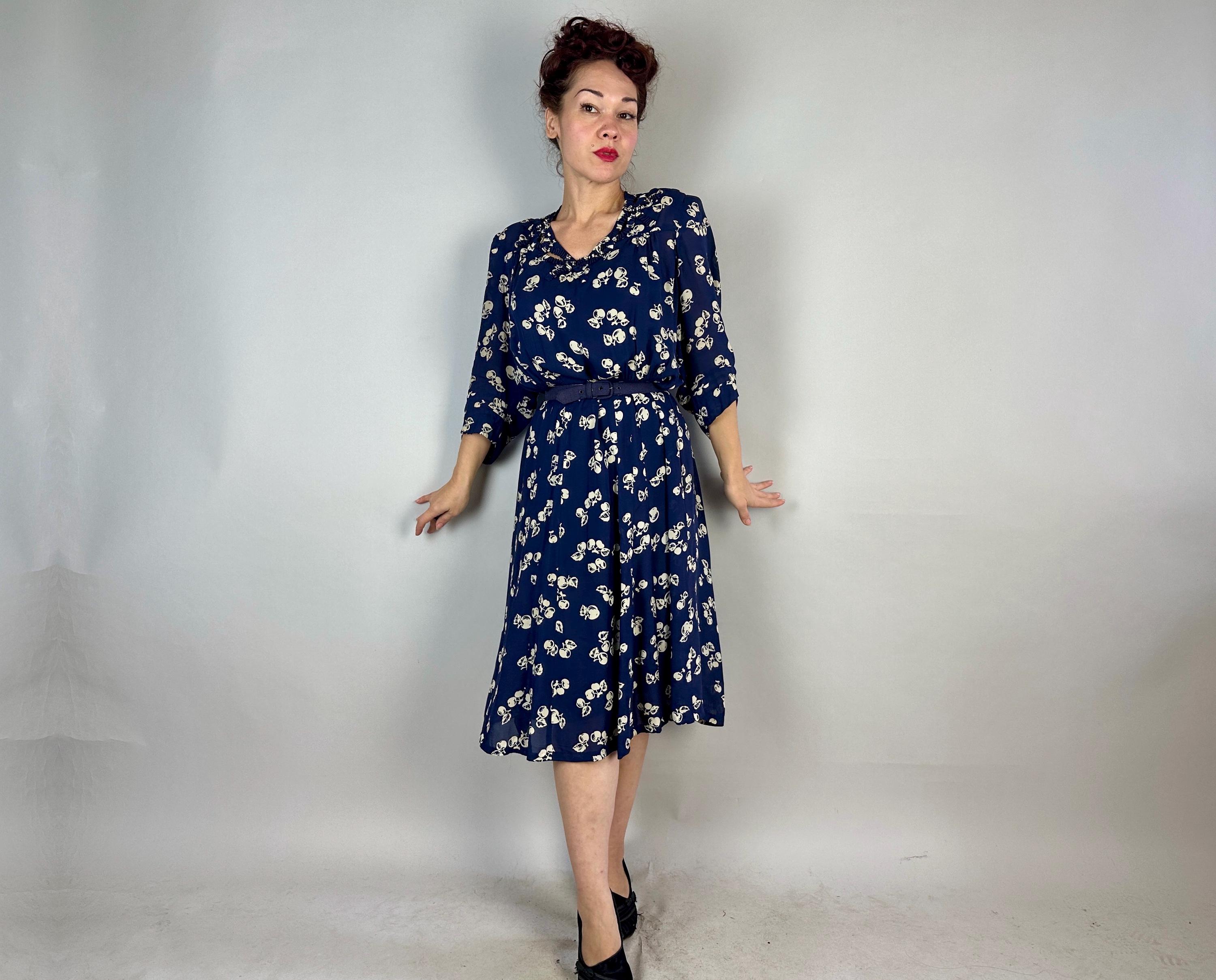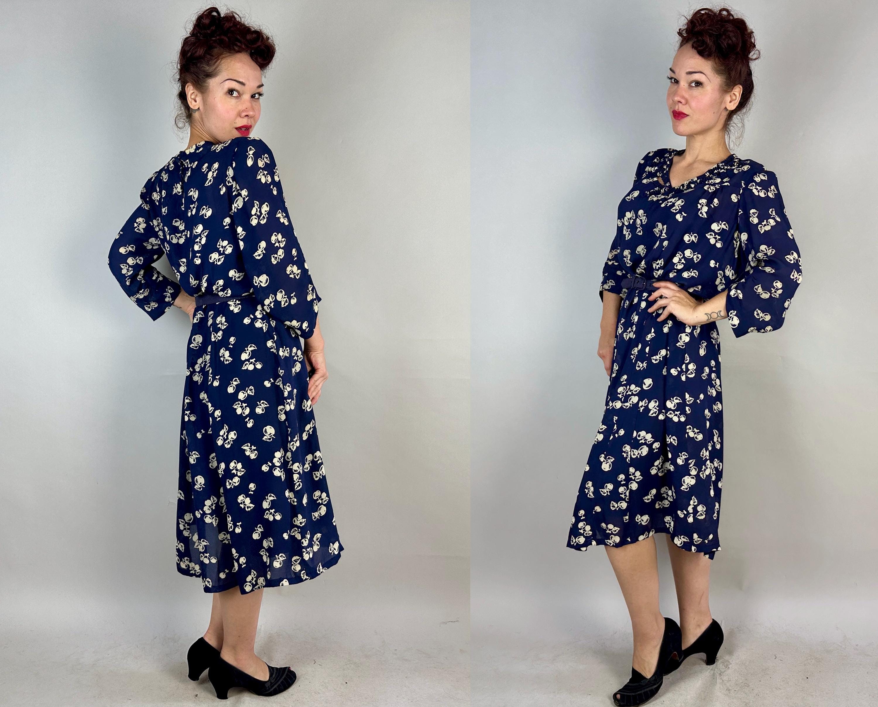 The orchard calls for the perfect date so take your spot under the apple tree wearing this 1940s dress! Navy blue rayon chiffon features a pattern of leaf-on apples in ivory with a semi-sheer drape. The neckline is extra lovely with pleated ruffles forming bows with peek-a-boo cutouts and rhinestone beads on the centres and seven loop buttons fasten at the nape. The dress is also fashioned with padded shouders, three quarter length sleeves with elbow darts, smocked sections on the waist, and gored skirt. Slips on overhead. This dress is in great vintage condition, with faint discolouration under one arm but no holes or odors to note. Please note, belt is model's own.