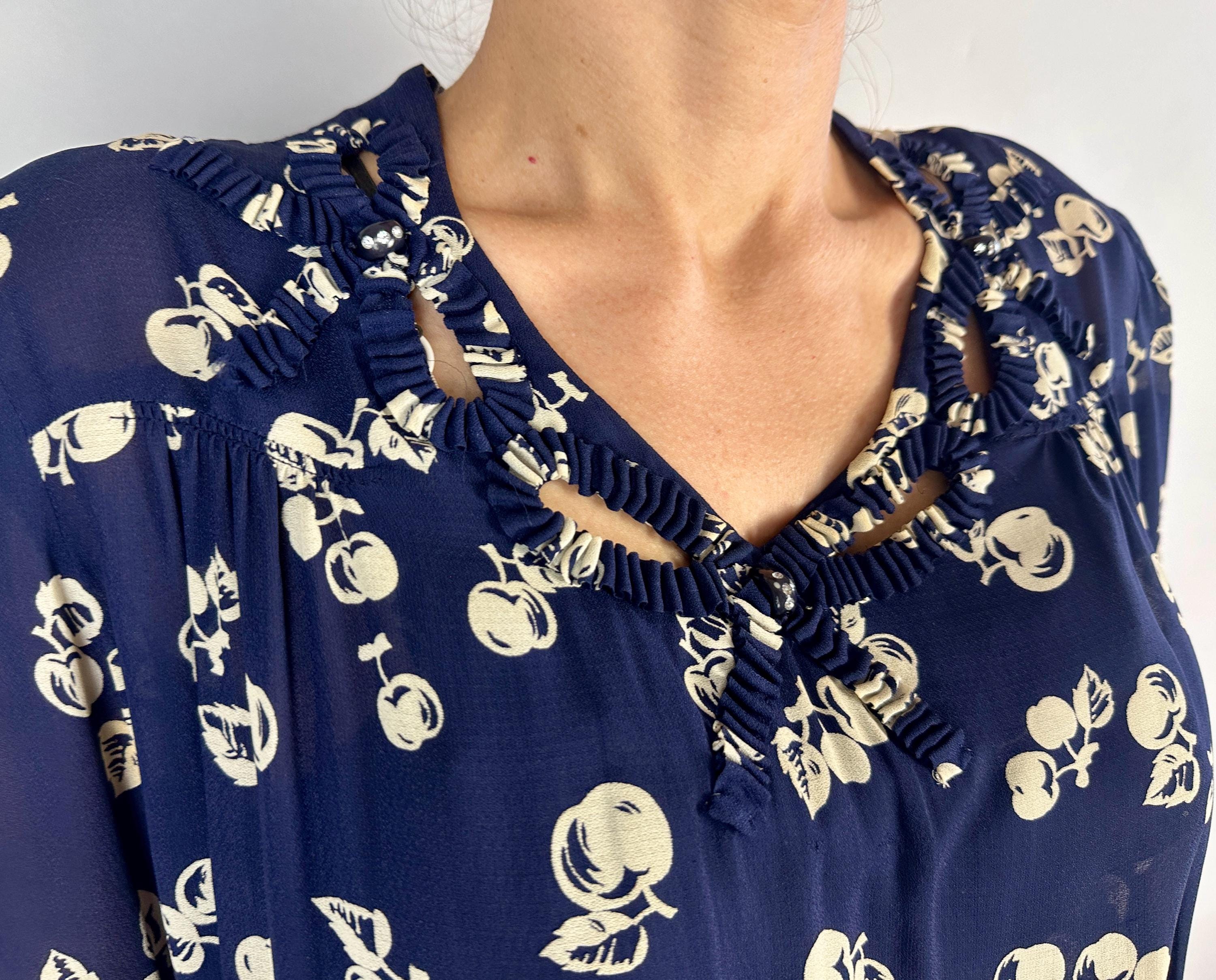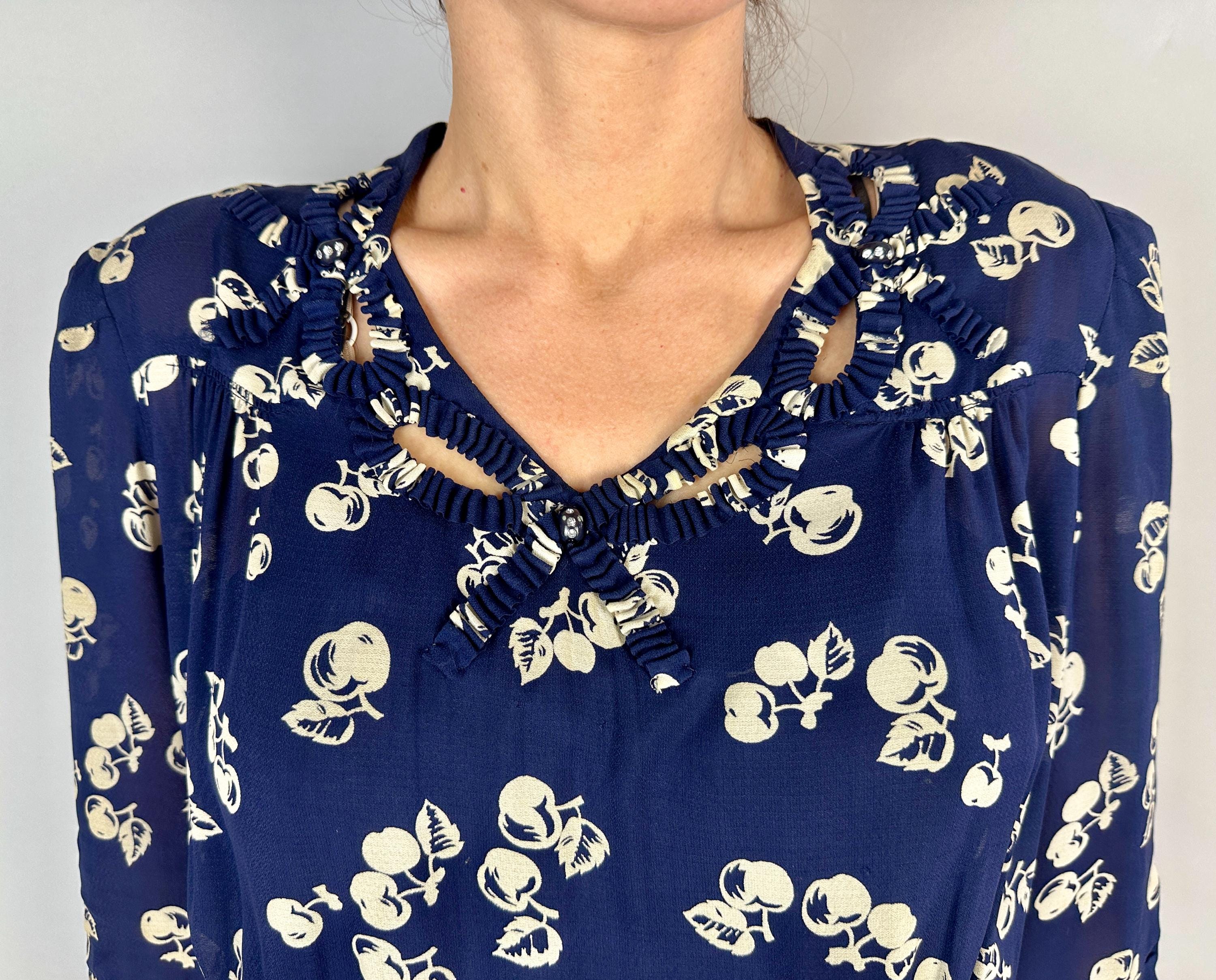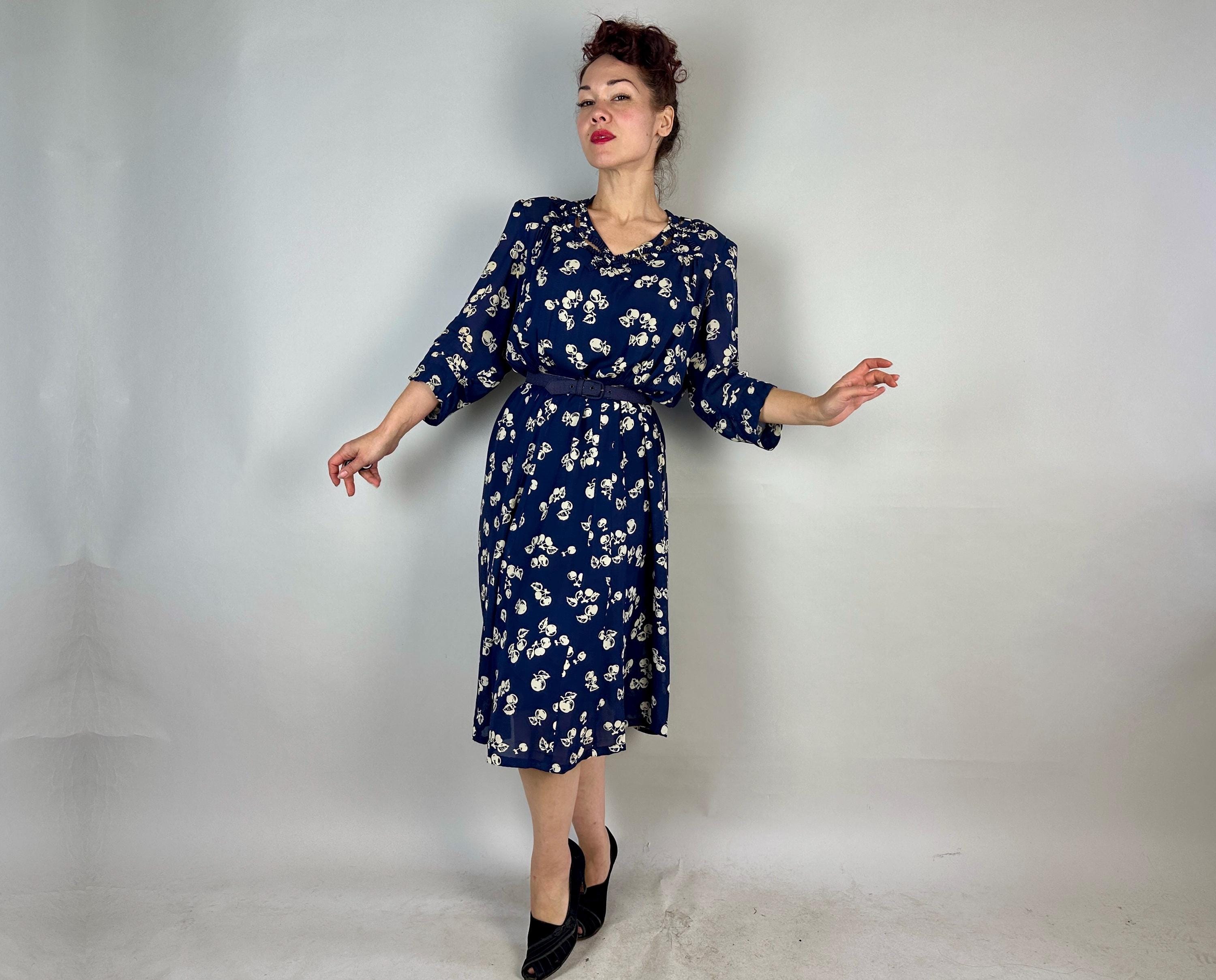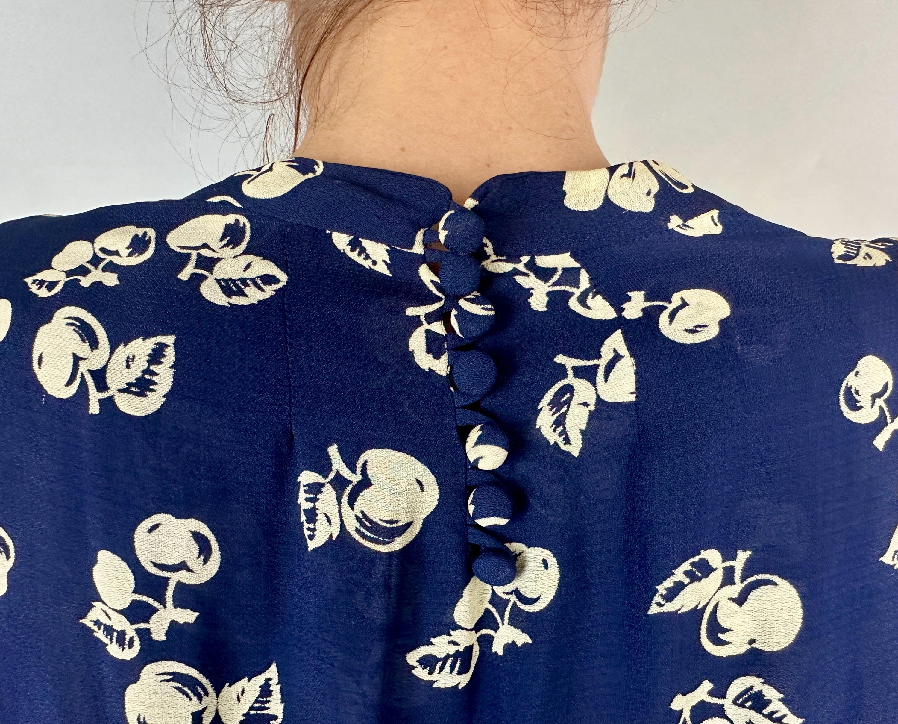 The orchard calls for the perfect date so take your spot under the apple tree wearing this 1940s dress! Navy blue rayon chiffon features a pattern of leaf-on apples in ivory with a semi-sheer drape. The neckline is extra lovely with pleated ruffles forming bows with peek-a-boo cutouts and rhinestone beads on the centres and seven loop buttons fasten at the nape. The dress is also fashioned with padded shouders, three quarter length sleeves with elbow darts, smocked sections on the waist, and gored skirt. Slips on overhead. This dress is in great vintage condition, with faint discolouration under one arm but no holes or odors to note. Please note, belt is model's own.