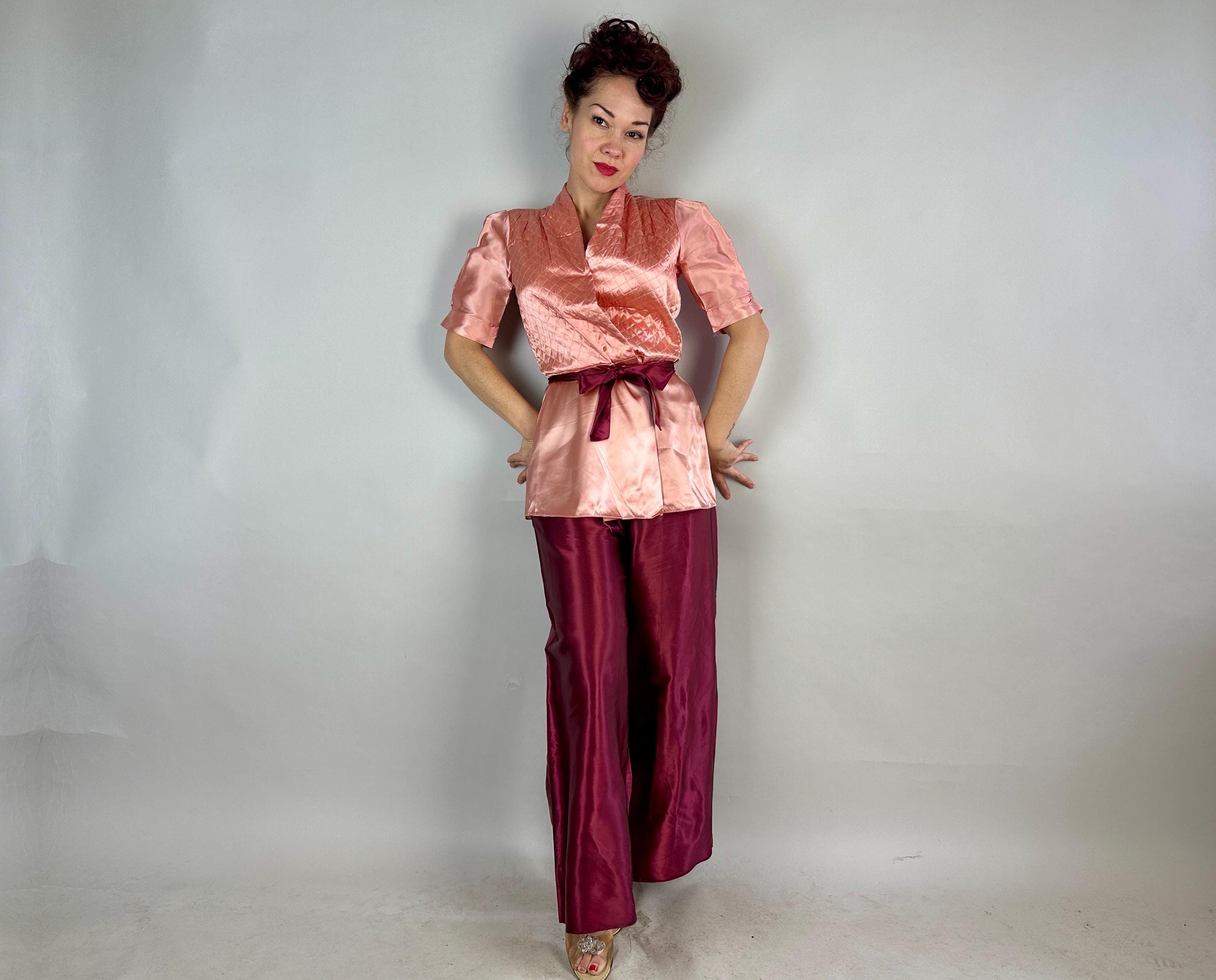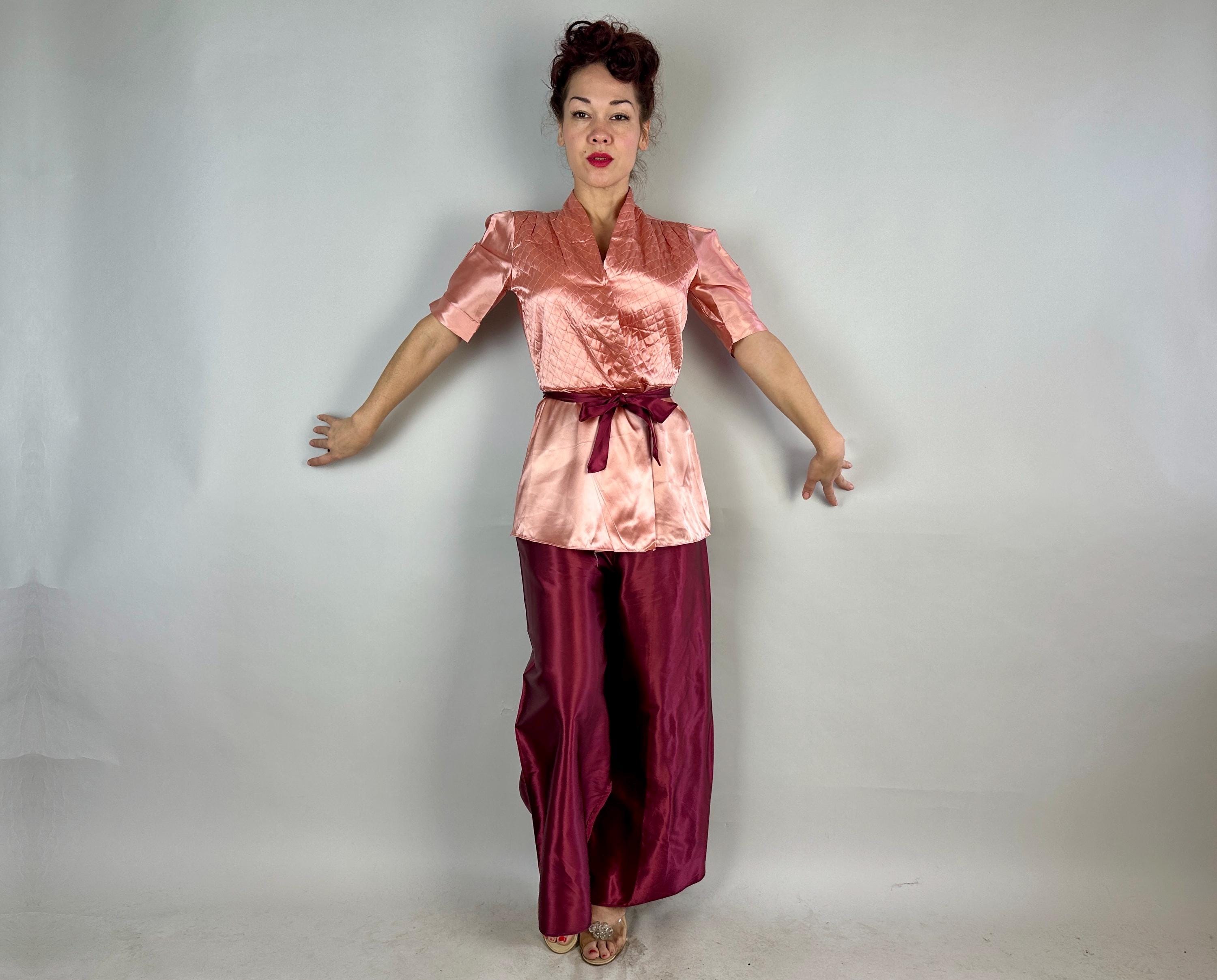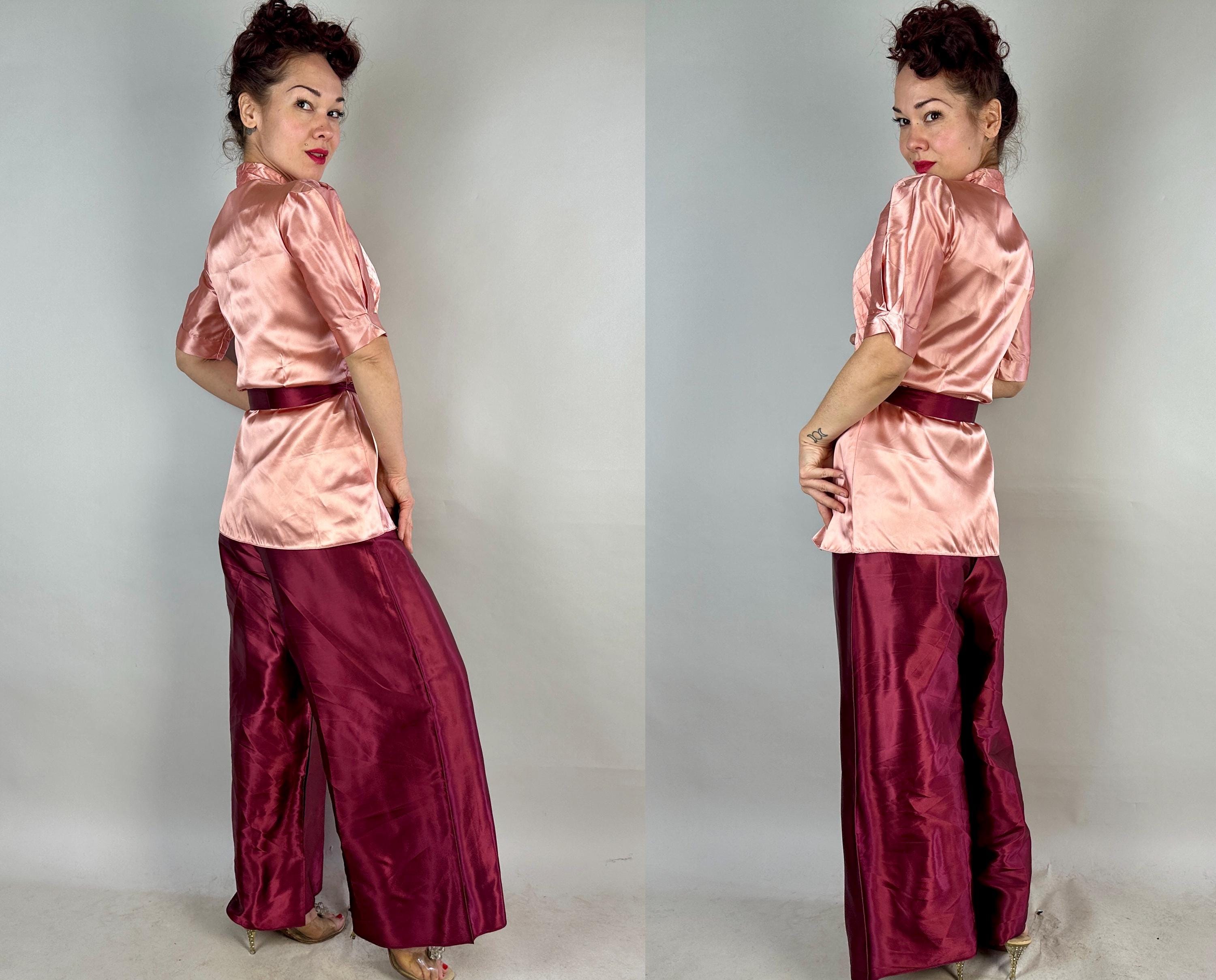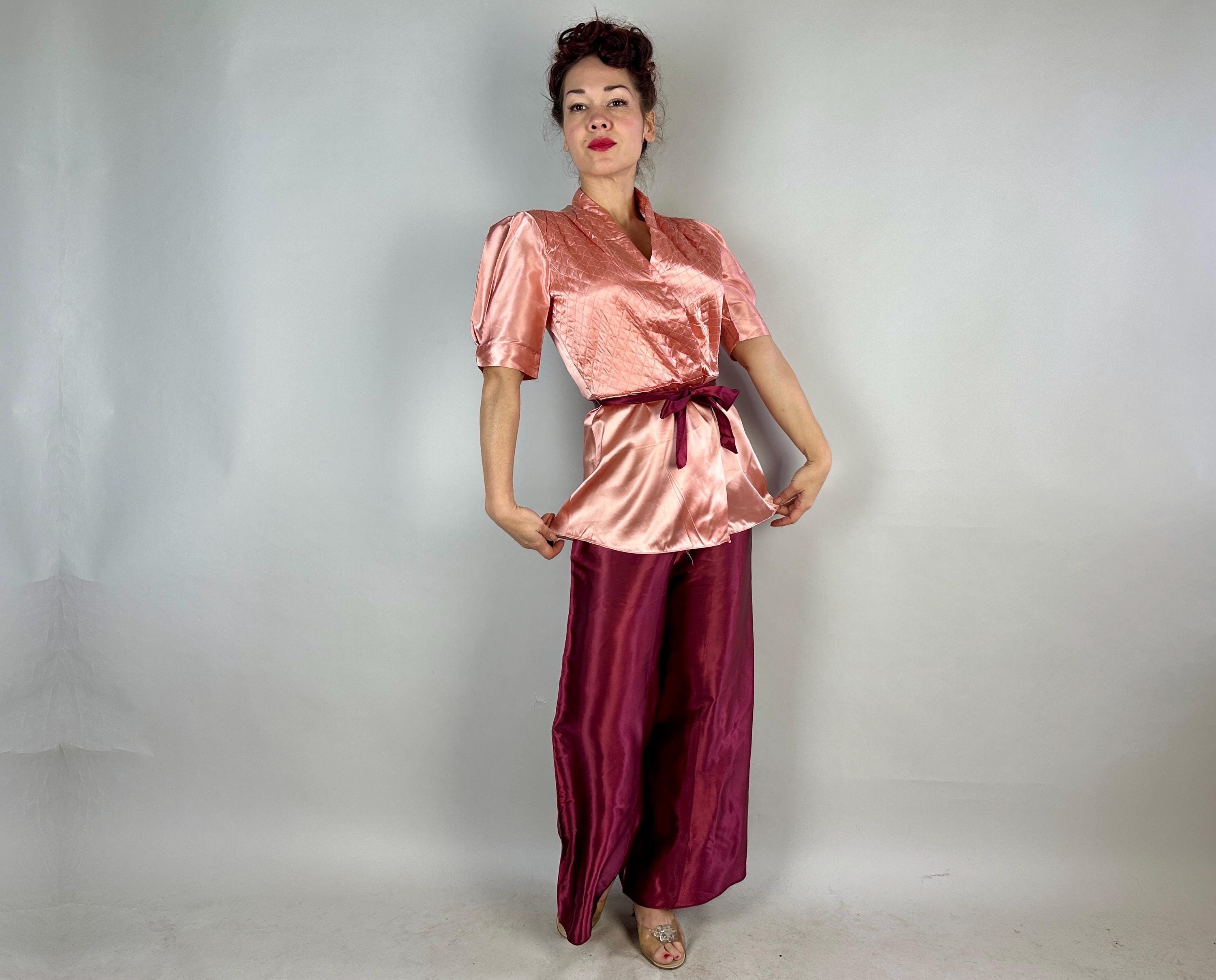 Get cozy in the most glam way in this 1940's set! Rayon satin is extra stylish in this combo of ballet pink and garnet red. The top has lots of flexibilty with it's wrap style and is accented with diamond quilting on the front bodice. Also styled with pleated puff sleeves, peplum, and sash belt. The ultra wide leg pants have a double button waistband and hidden buttons fastening on the side. This set is in great vintage condition, with no holes, stains, or odors to note.
