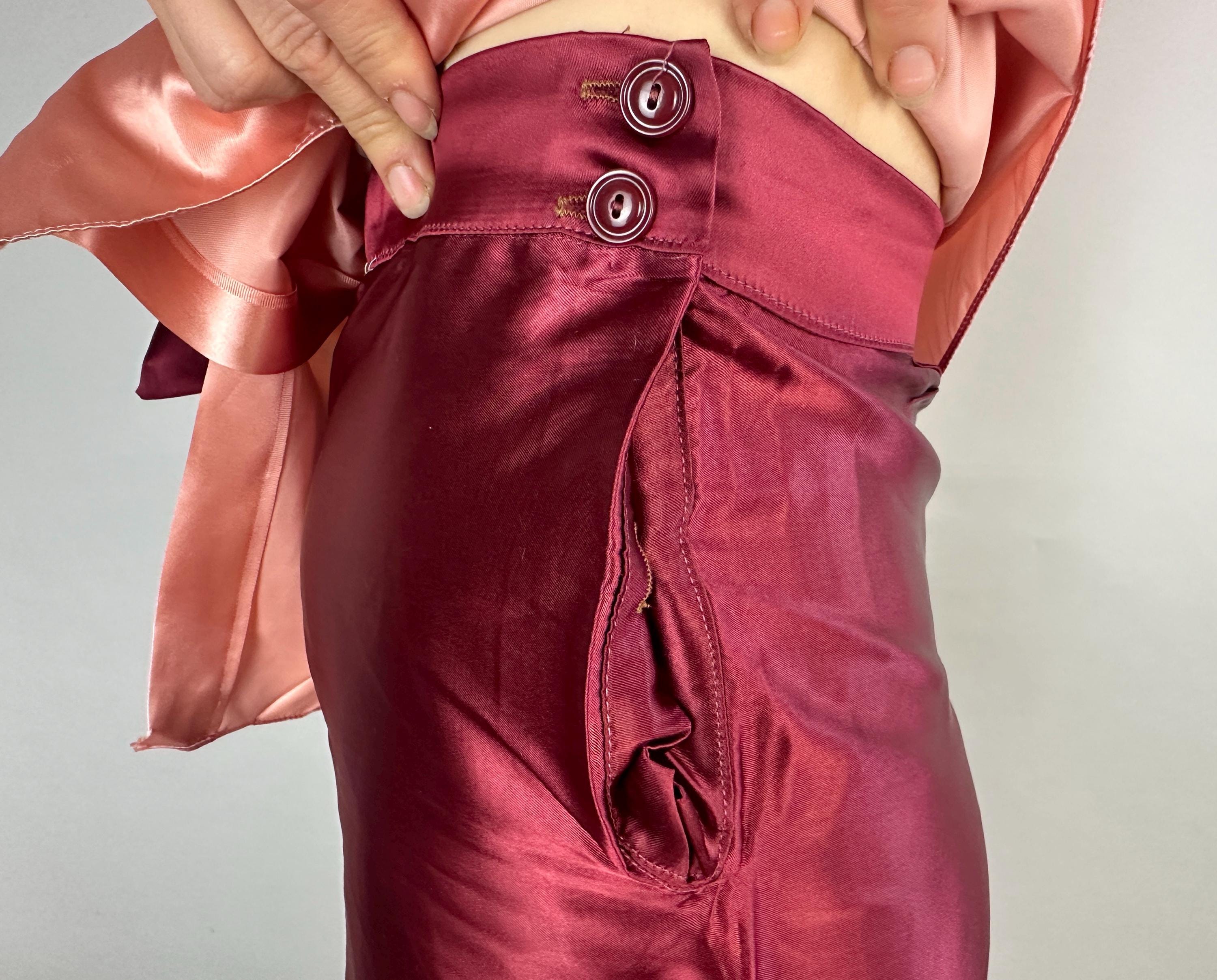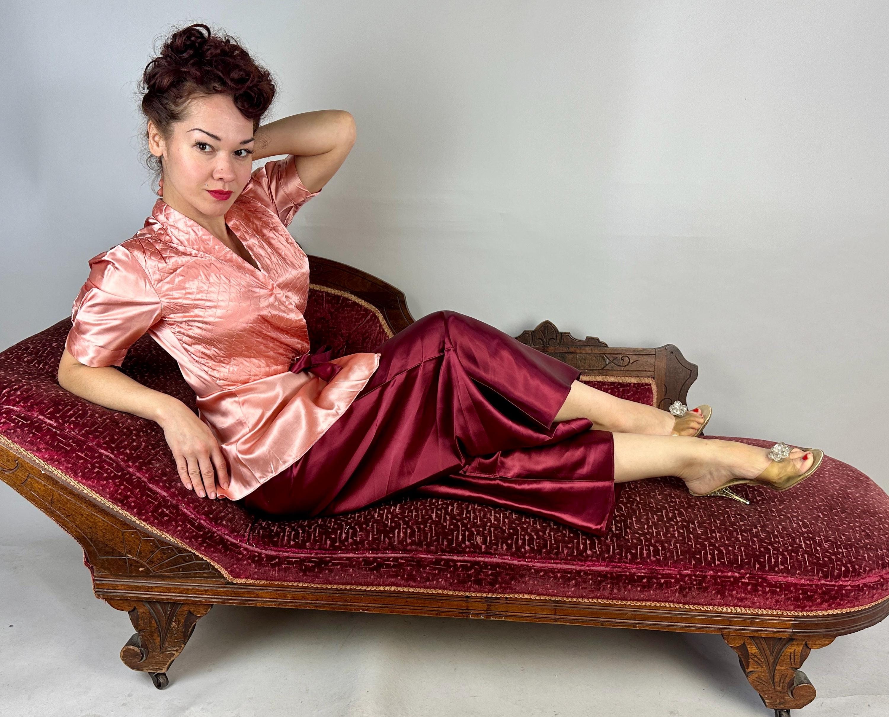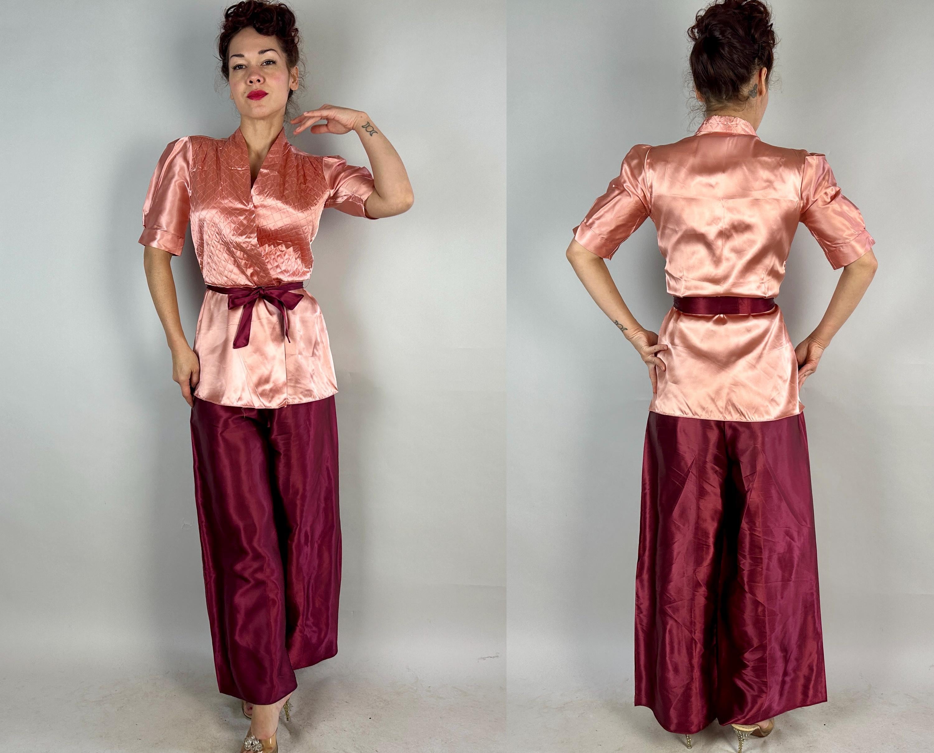 Get cozy in the most glam way in this 1940's set! Rayon satin is extra stylish in this combo of ballet pink and garnet red. The top has lots of flexibilty with it's wrap style and is accented with diamond quilting on the front bodice. Also styled with pleated puff sleeves, peplum, and sash belt. The ultra wide leg pants have a double button waistband and hidden buttons fastening on the side. This set is in great vintage condition, with no holes, stains, or odors to note.