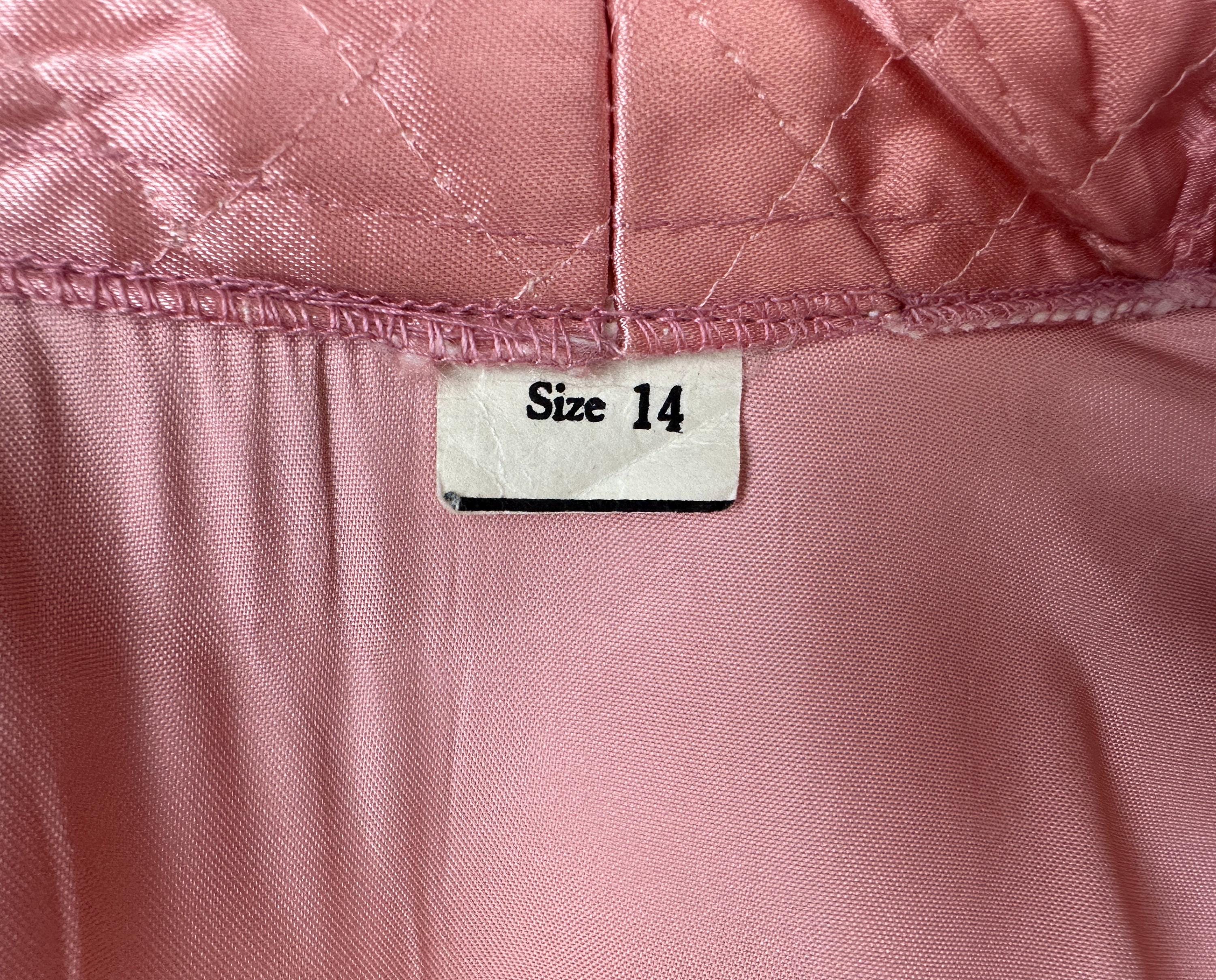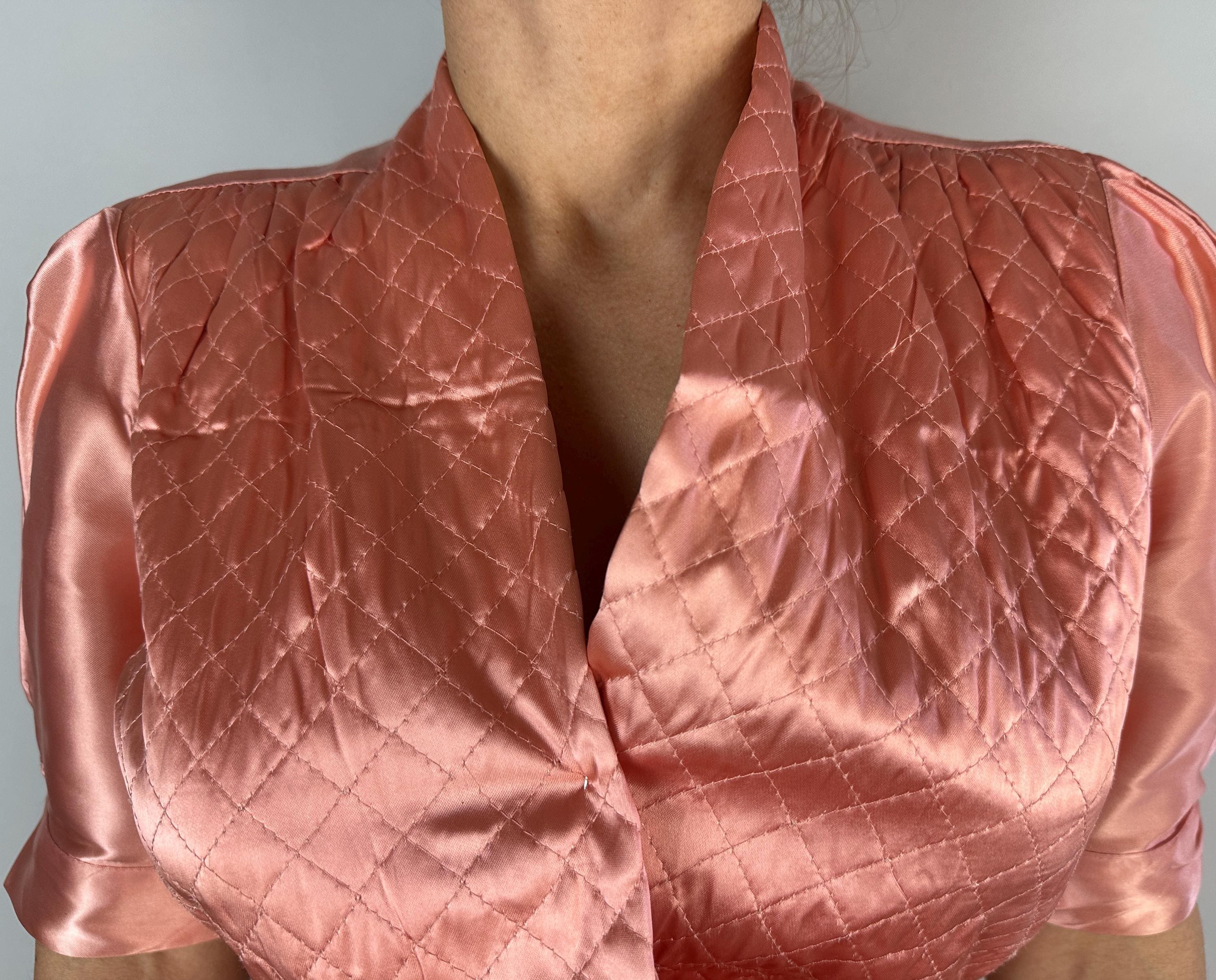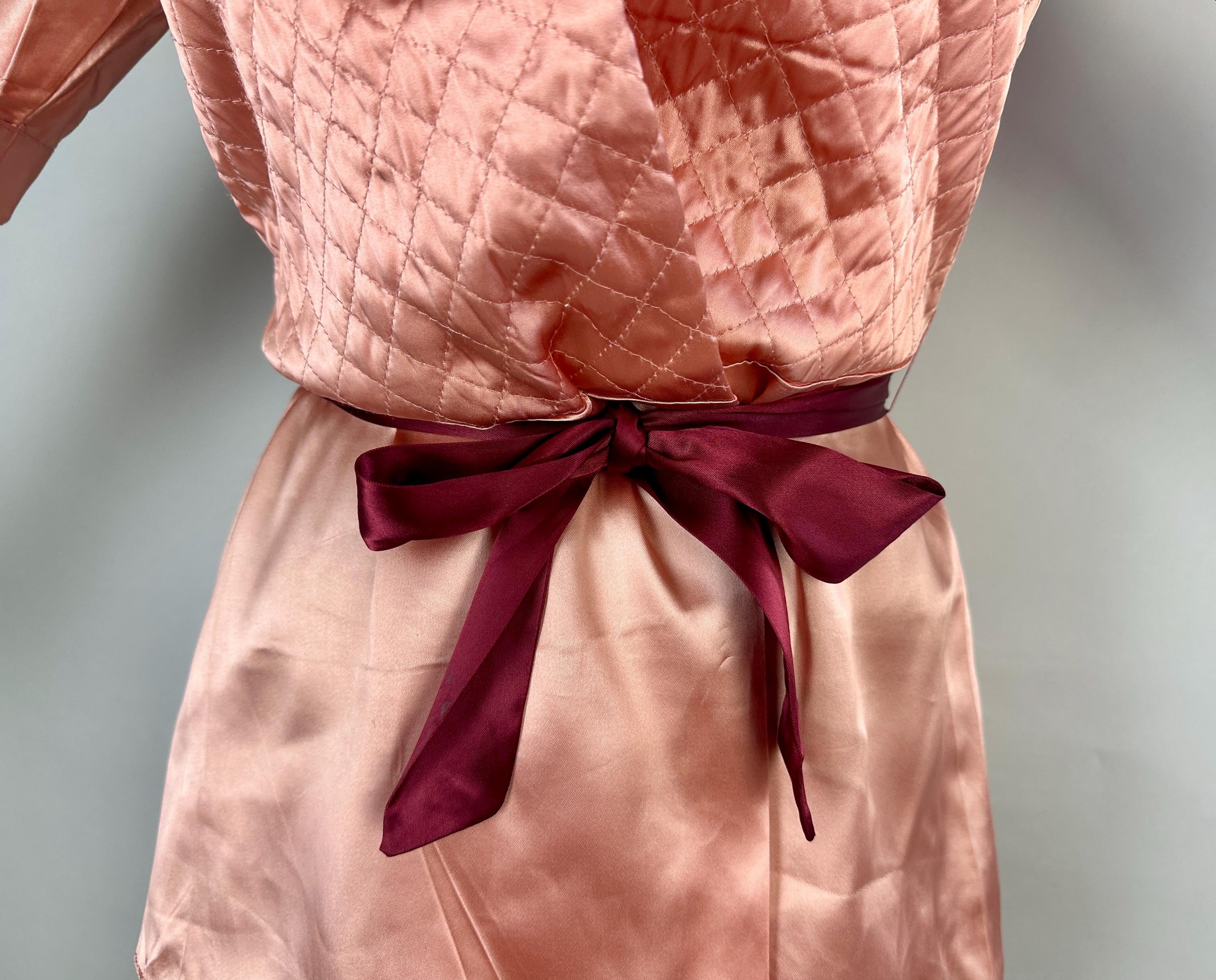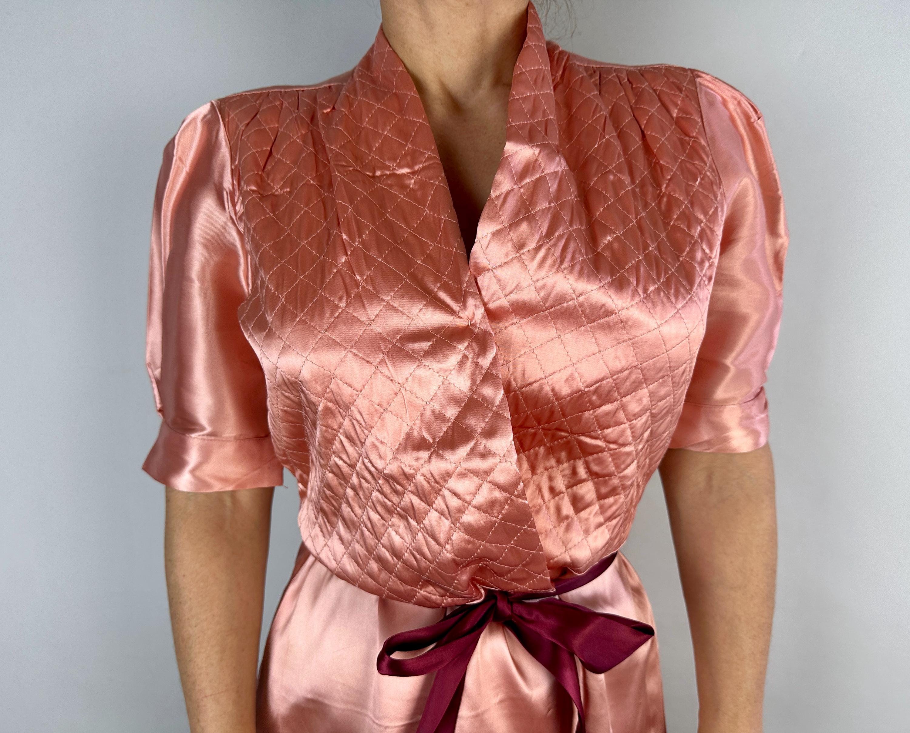 Get cozy in the most glam way in this 1940's set! Rayon satin is extra stylish in this combo of ballet pink and garnet red. The top has lots of flexibilty with it's wrap style and is accented with diamond quilting on the front bodice. Also styled with pleated puff sleeves, peplum, and sash belt. The ultra wide leg pants have a double button waistband and hidden buttons fastening on the side. This set is in great vintage condition, with no holes, stains, or odors to note.