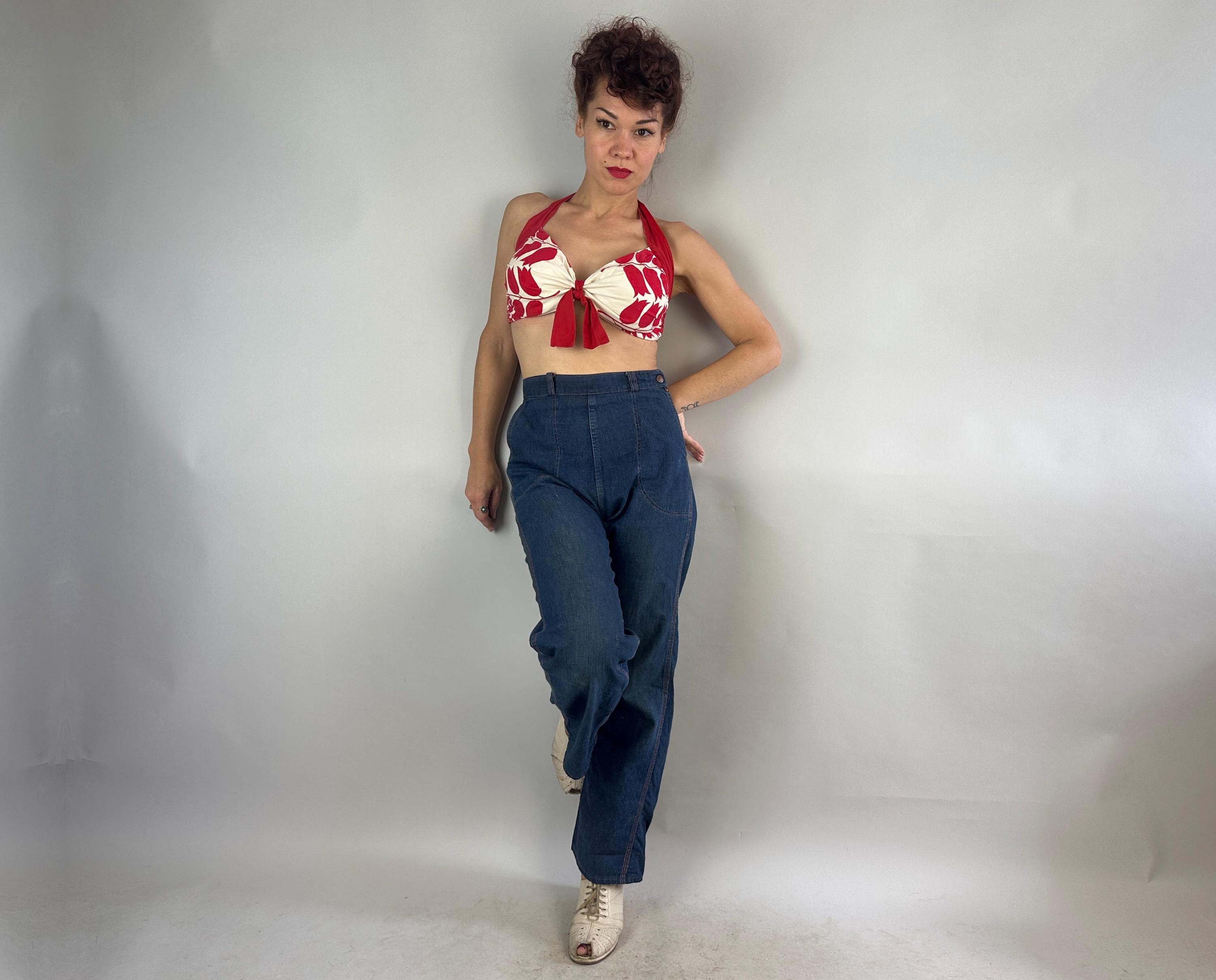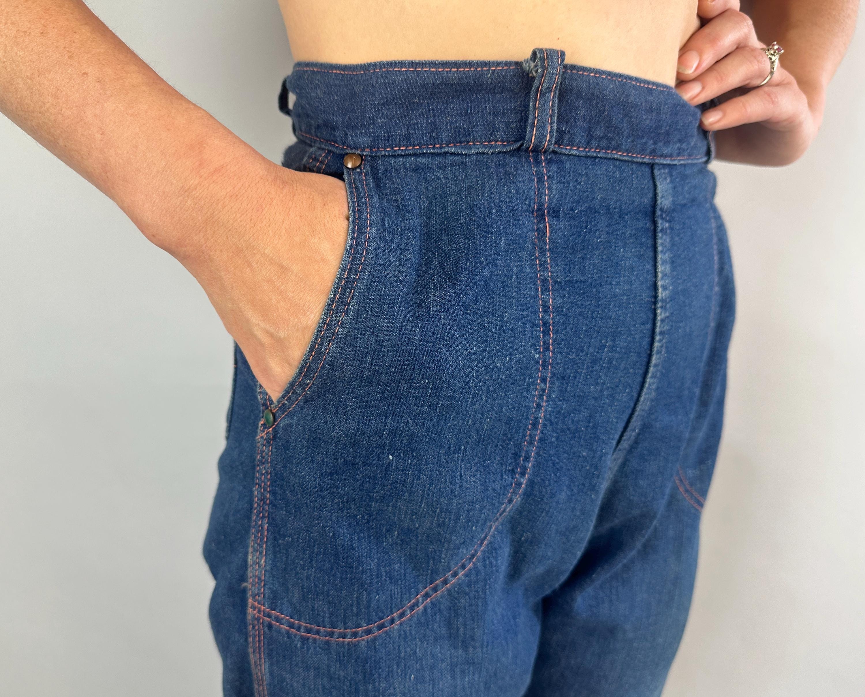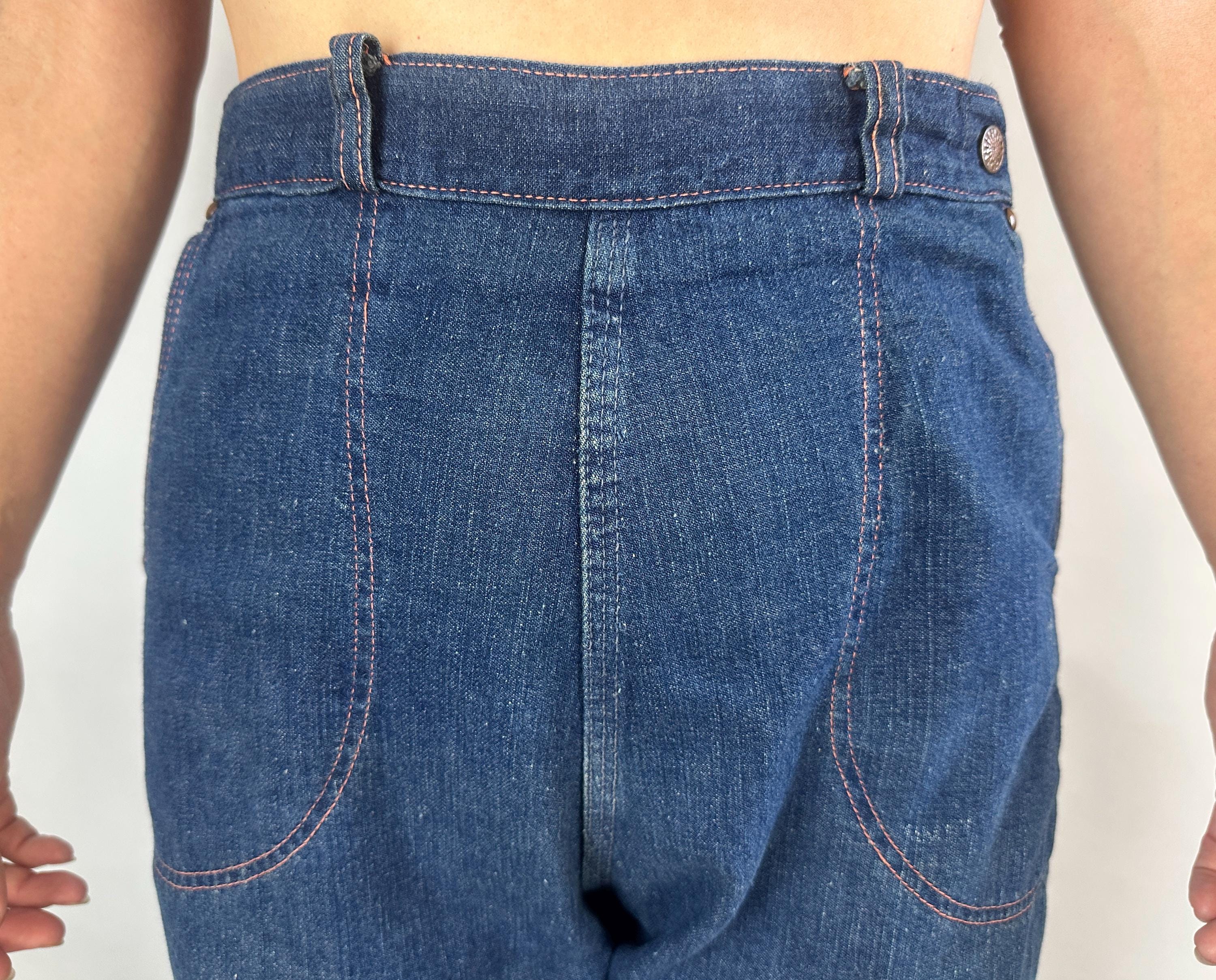 You'll be rough and ready to rumble around the ranch in these 1950s jeans! The indigo blue denim is super soft and dark and broken in and is accented with creamsicle top stitching and four pockets keep your necessities close. Metal zipper with snap on the side. These trousers are in great vintage condition with no holes, stains, odors to note.