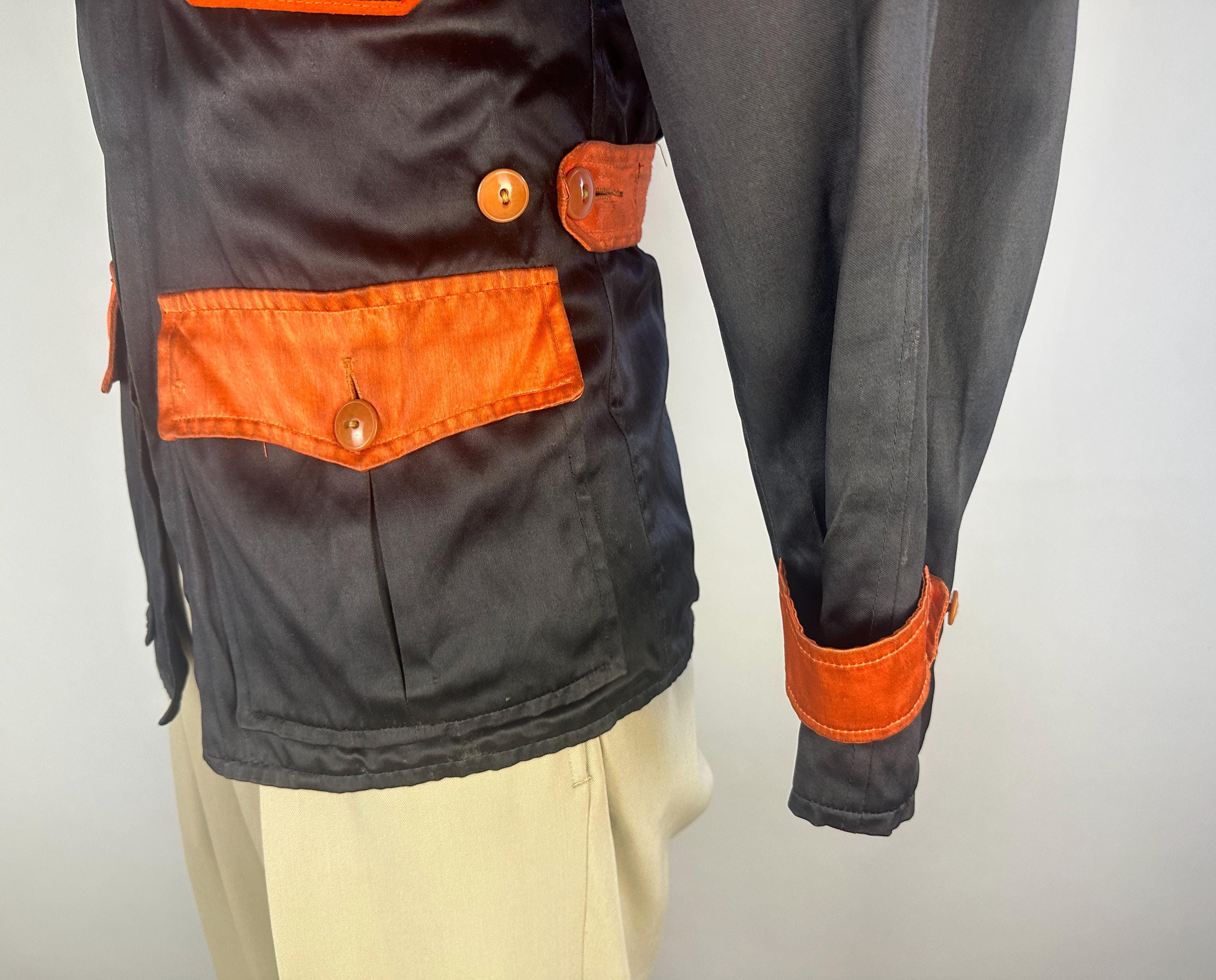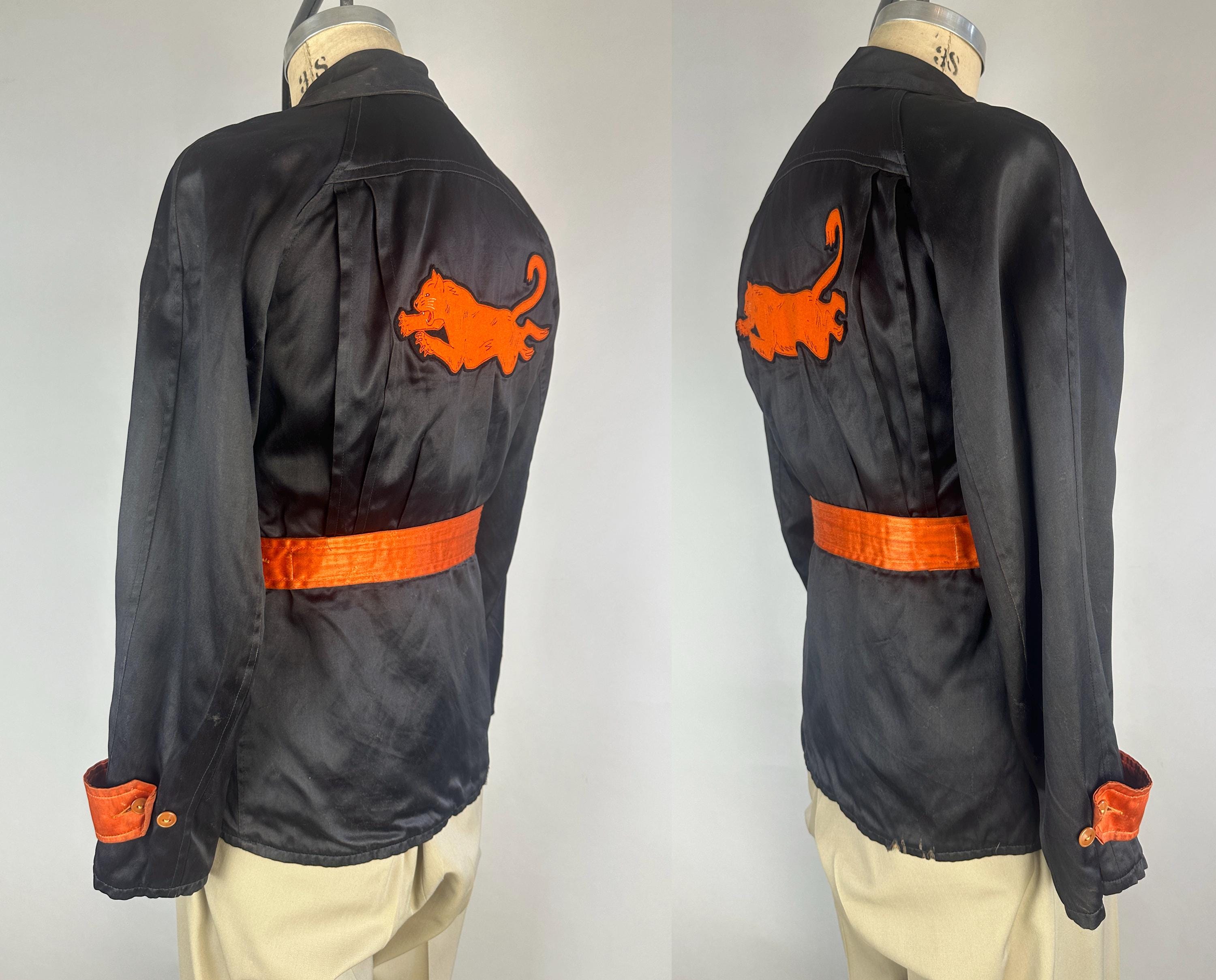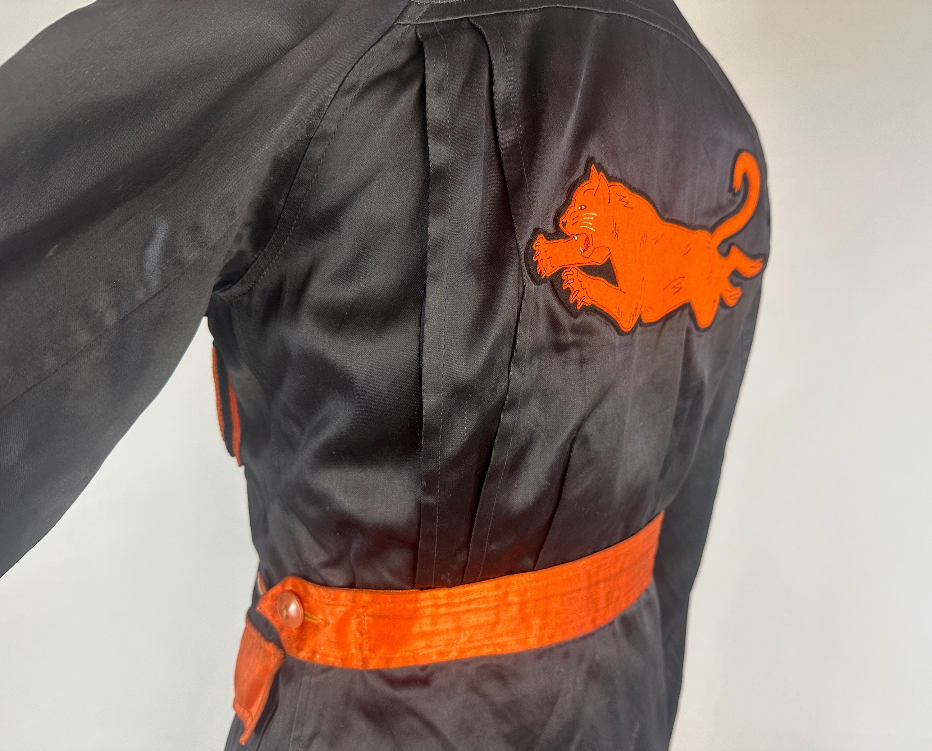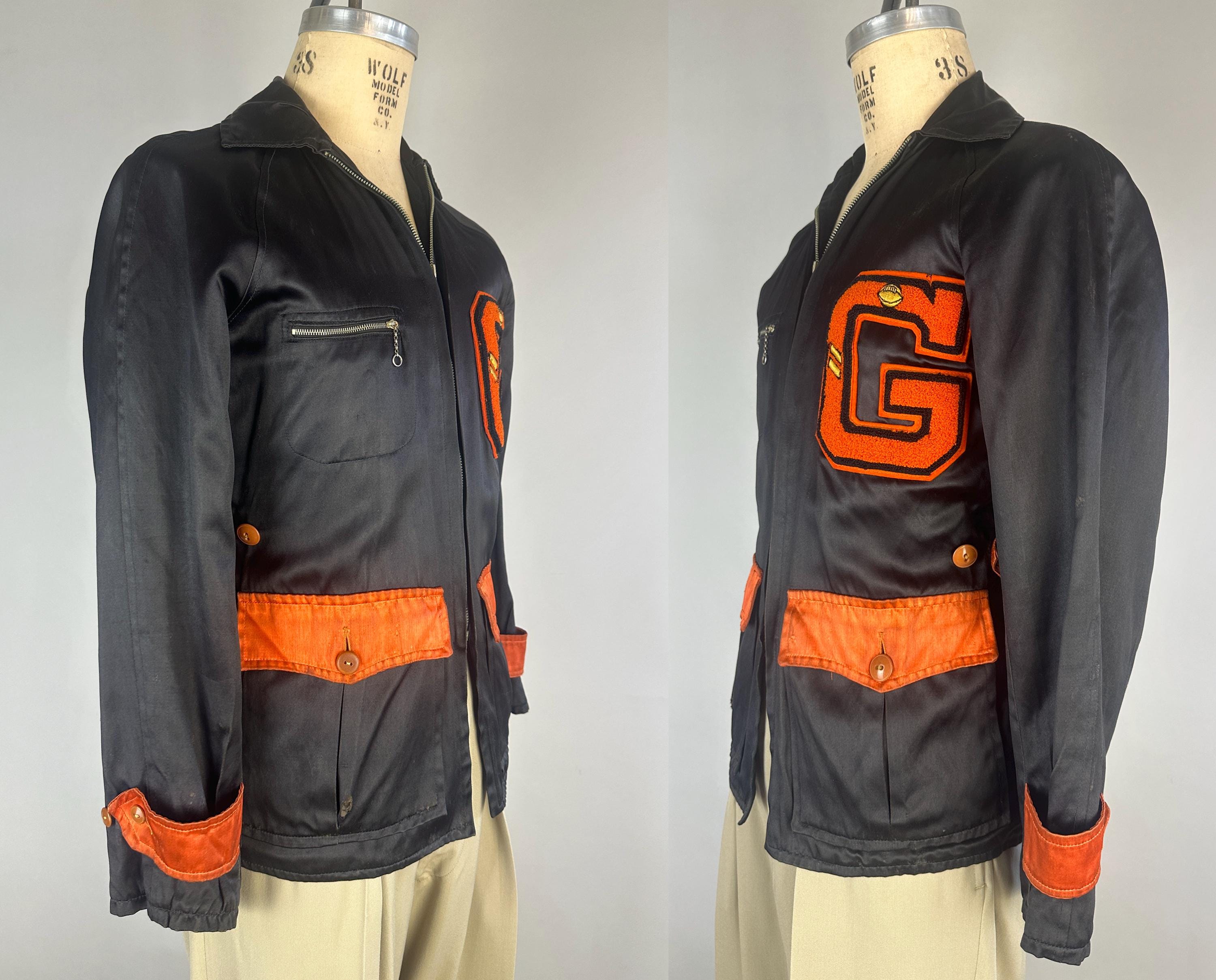 You'll be fierce and feisty in this 1930s letterman jacket! A dreamy combo of black and orange to match that tiger spirit, the sateen has just the right sheen to really make the wool patches pop. The patches include a striking feline on the back and "G" with a football on the front. The stylish fit features raglan sleeves, belted back with waist cinching options achieved with buttons on the sides, buttoning flap pockets with box pleat accents, buttoning cuff straps, and chest pocket with loop pull metal "Talon" zipper. A deco "Talon" zip runs up the center front. Fully lined with flannel. From the “Lowe & Campbell” label. This jacket is in great vintage condition, with some overall wear and no holes or odors to note.
