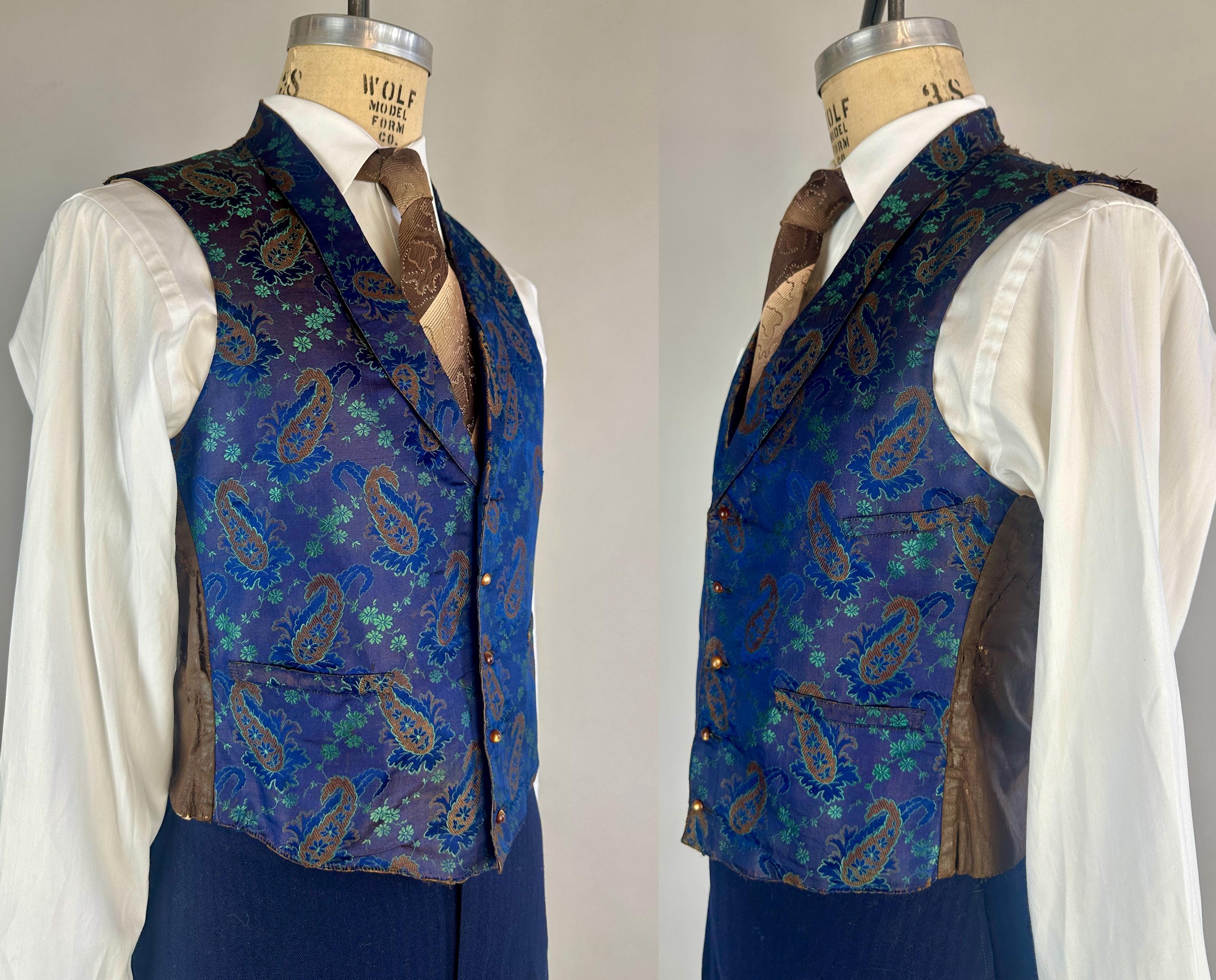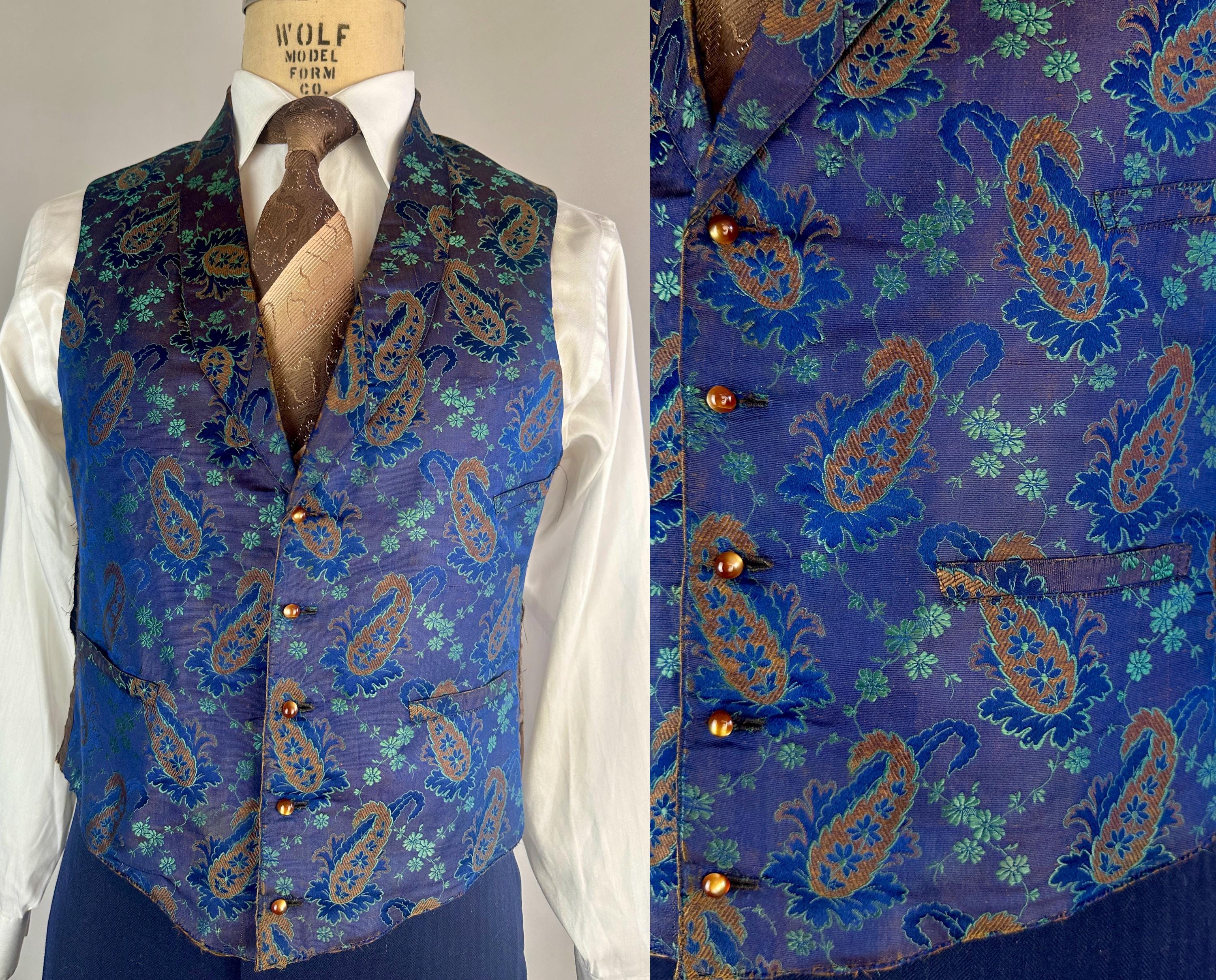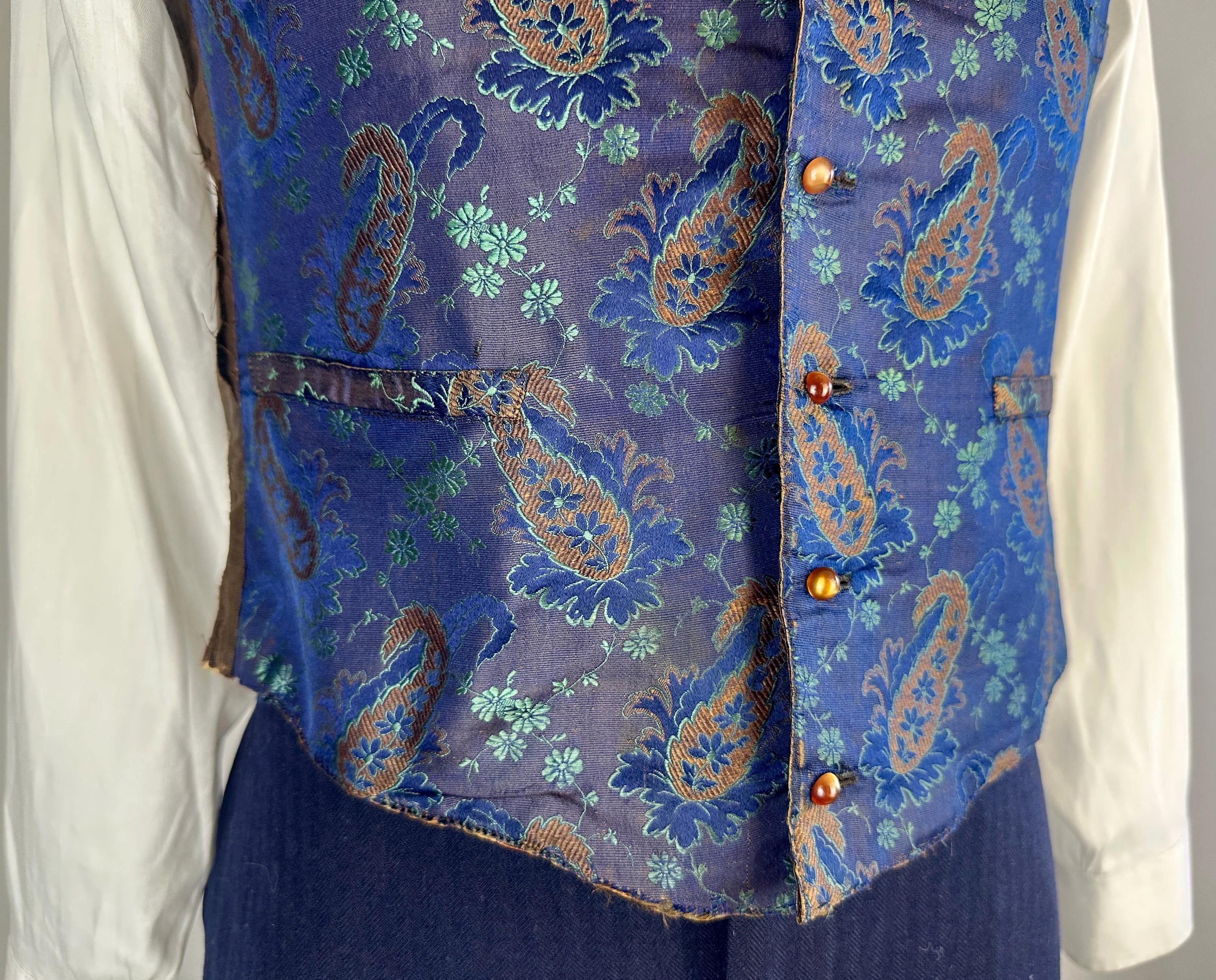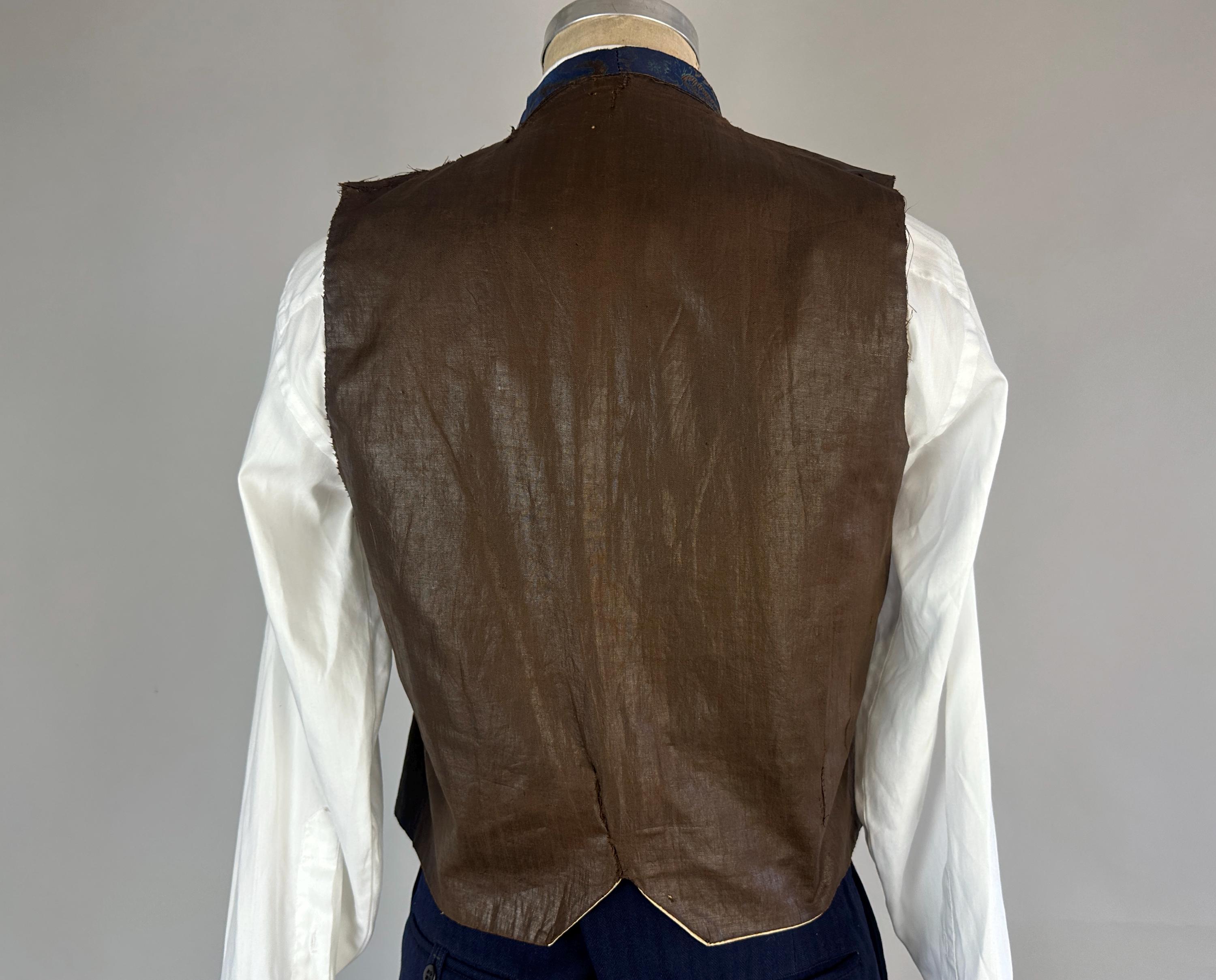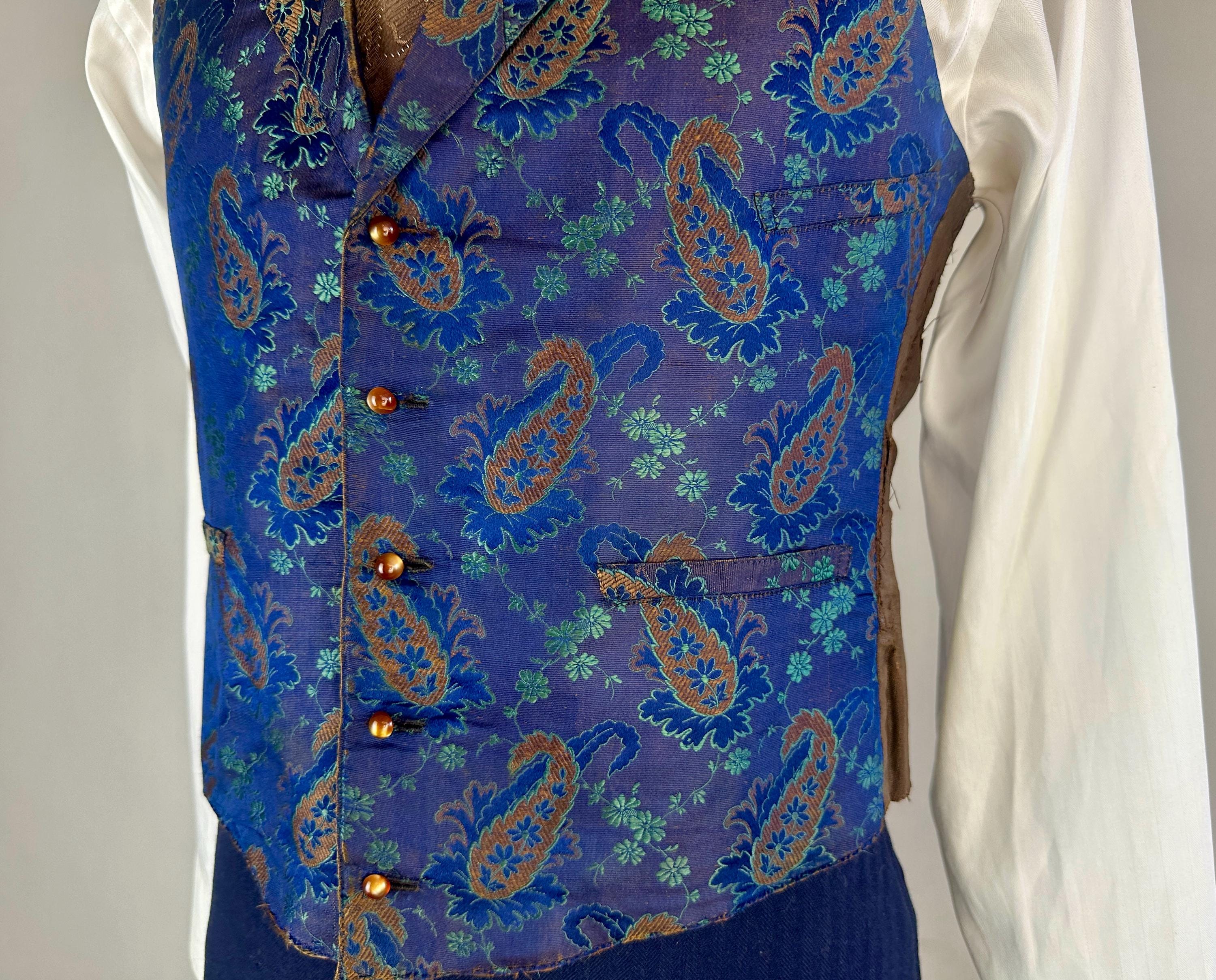 You'll delight and be delighted by this antique waistcoat of impecable silk! This 1800s garment is fit for a true dandy with it's stunning silk jacquard of paisley marrying shades of moody blues that flash with irridescent sheen with each movement. Touches of bronze in the silk are matched with the pearlescent buttons fastening the front. Fashioned with a shawl lapel and three welted pockets, combed cotton makes up the back and a full lining and strips of leather line just the front hem adding a little structure. We estimate this piece to be from the mid-Victorian period. This vest is in good, very wearable antique condition and presents beautifully on the front - truly incredible for its age and size! The back has some period mends and edge wear. No stains, holes, or odors to note.