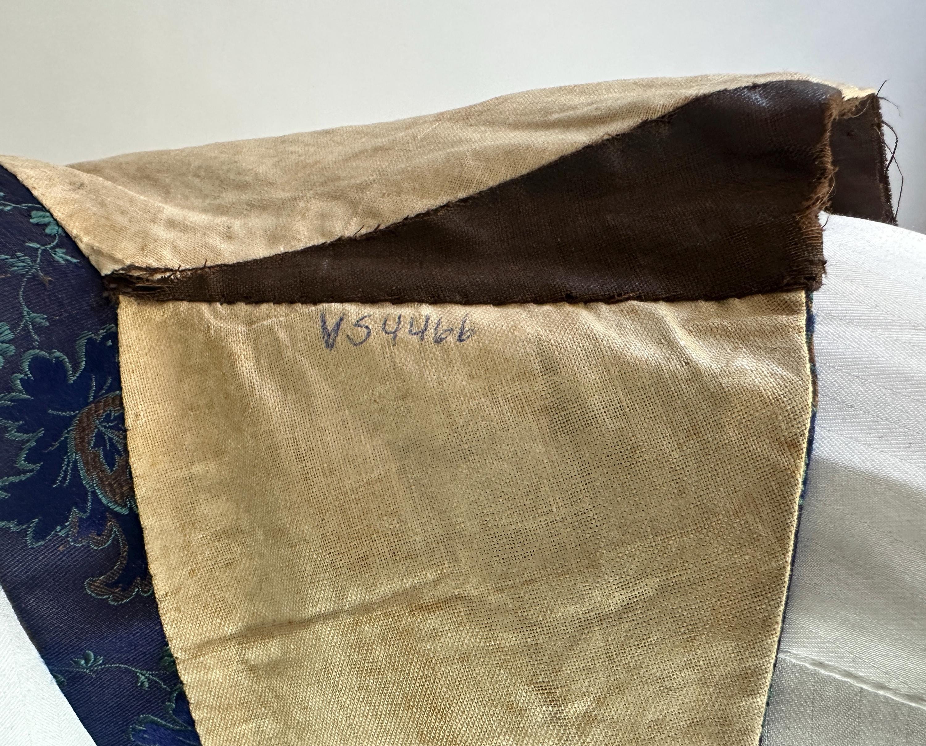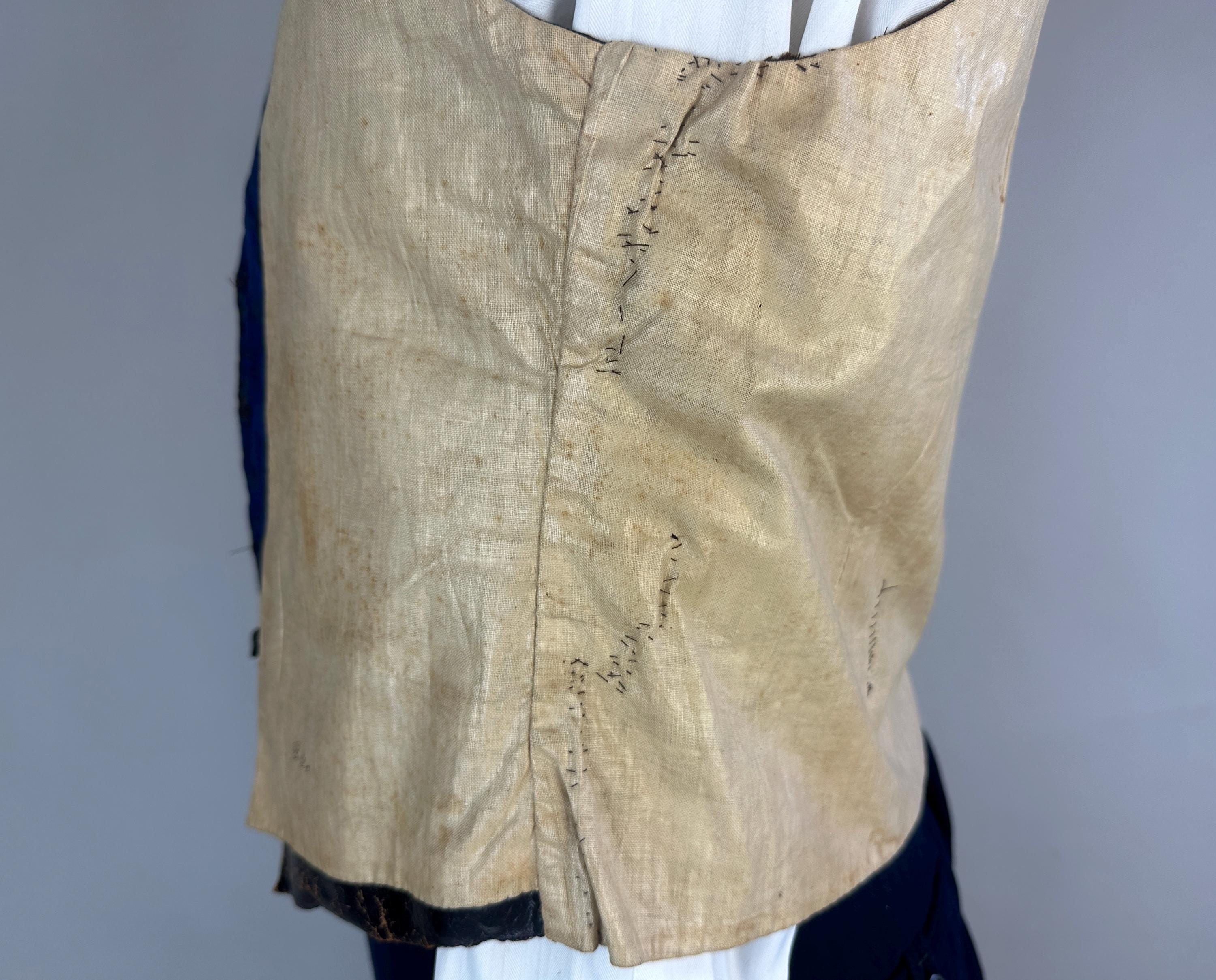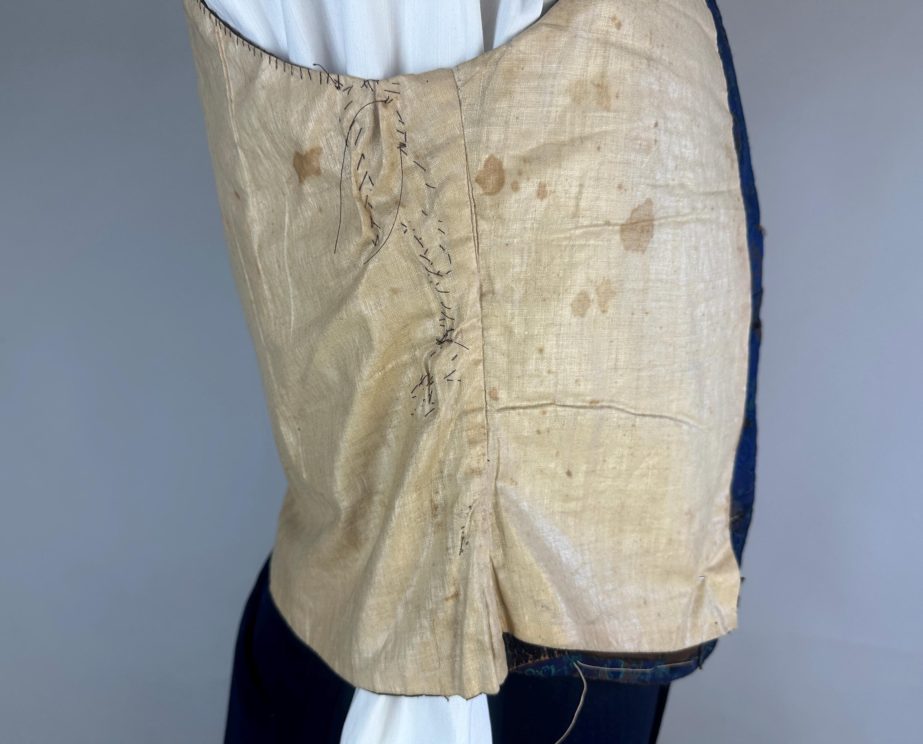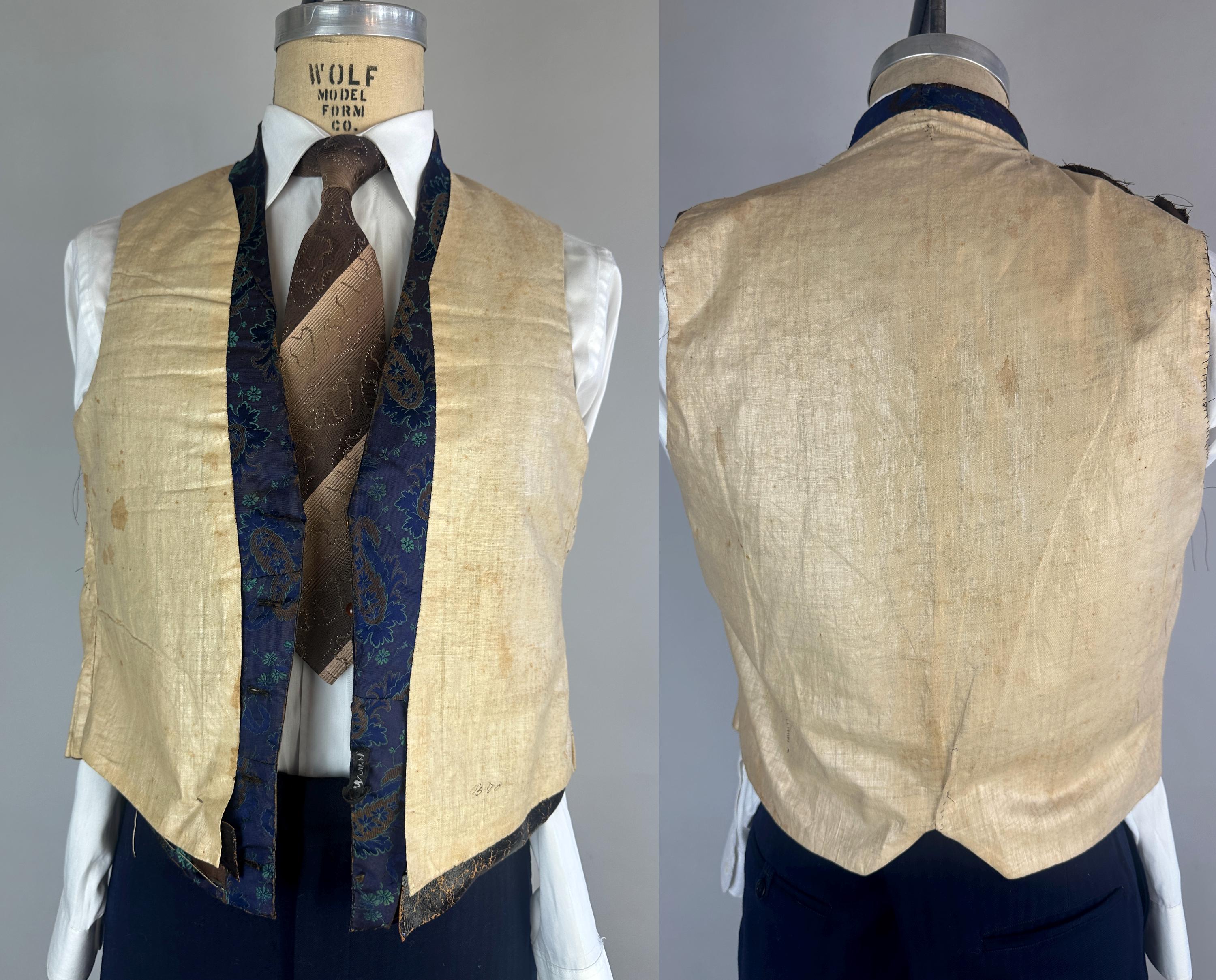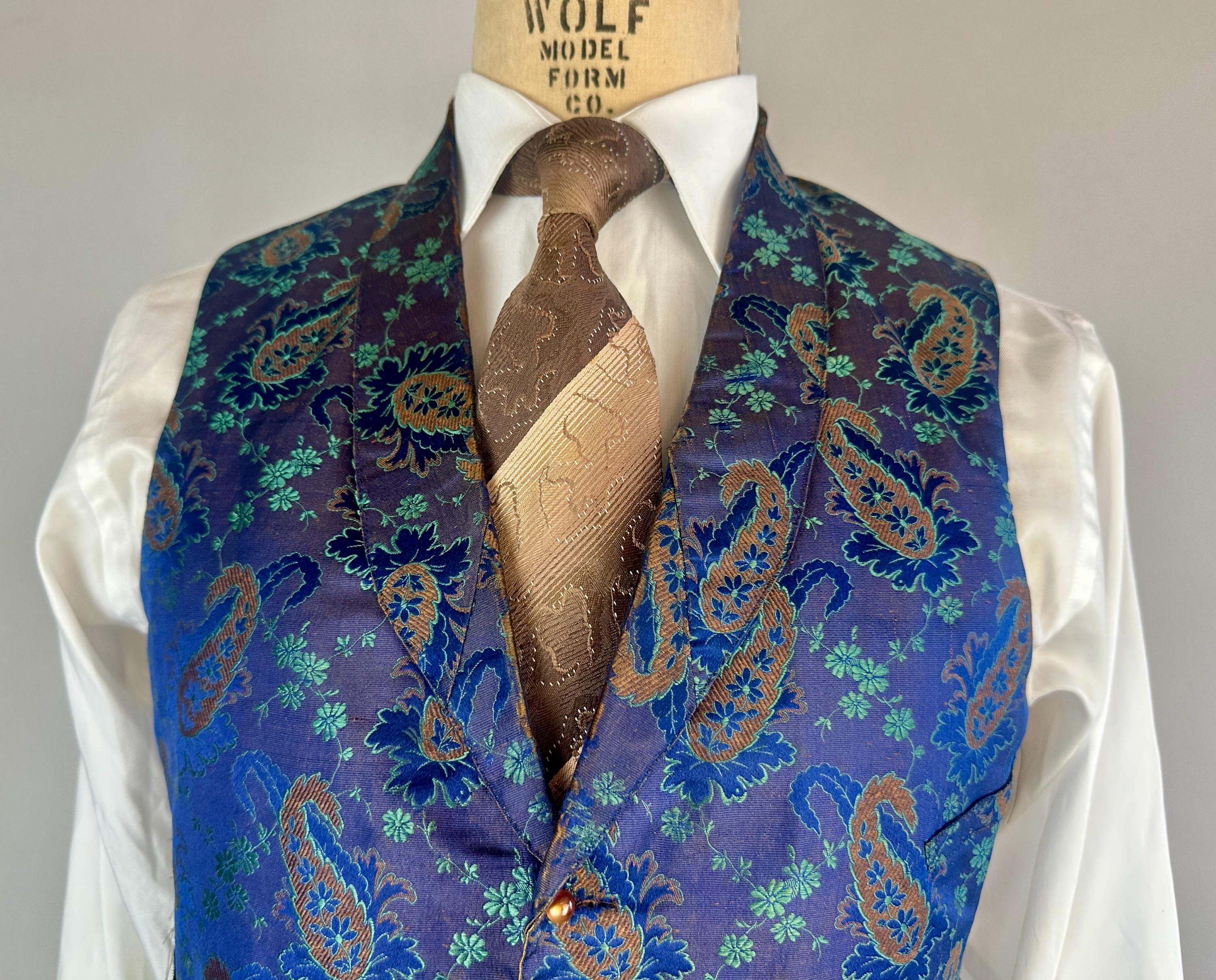 You'll delight and be delighted by this antique waistcoat of impecable silk! This 1800s garment is fit for a true dandy with it's stunning silk jacquard of paisley marrying shades of moody blues that flash with irridescent sheen with each movement. Touches of bronze in the silk are matched with the pearlescent buttons fastening the front. Fashioned with a shawl lapel and three welted pockets, combed cotton makes up the back and a full lining and strips of leather line just the front hem adding a little structure. We estimate this piece to be from the mid-Victorian period. This vest is in good, very wearable antique condition and presents beautifully on the front - truly incredible for its age and size! The back has some period mends and edge wear. No stains, holes, or odors to note.