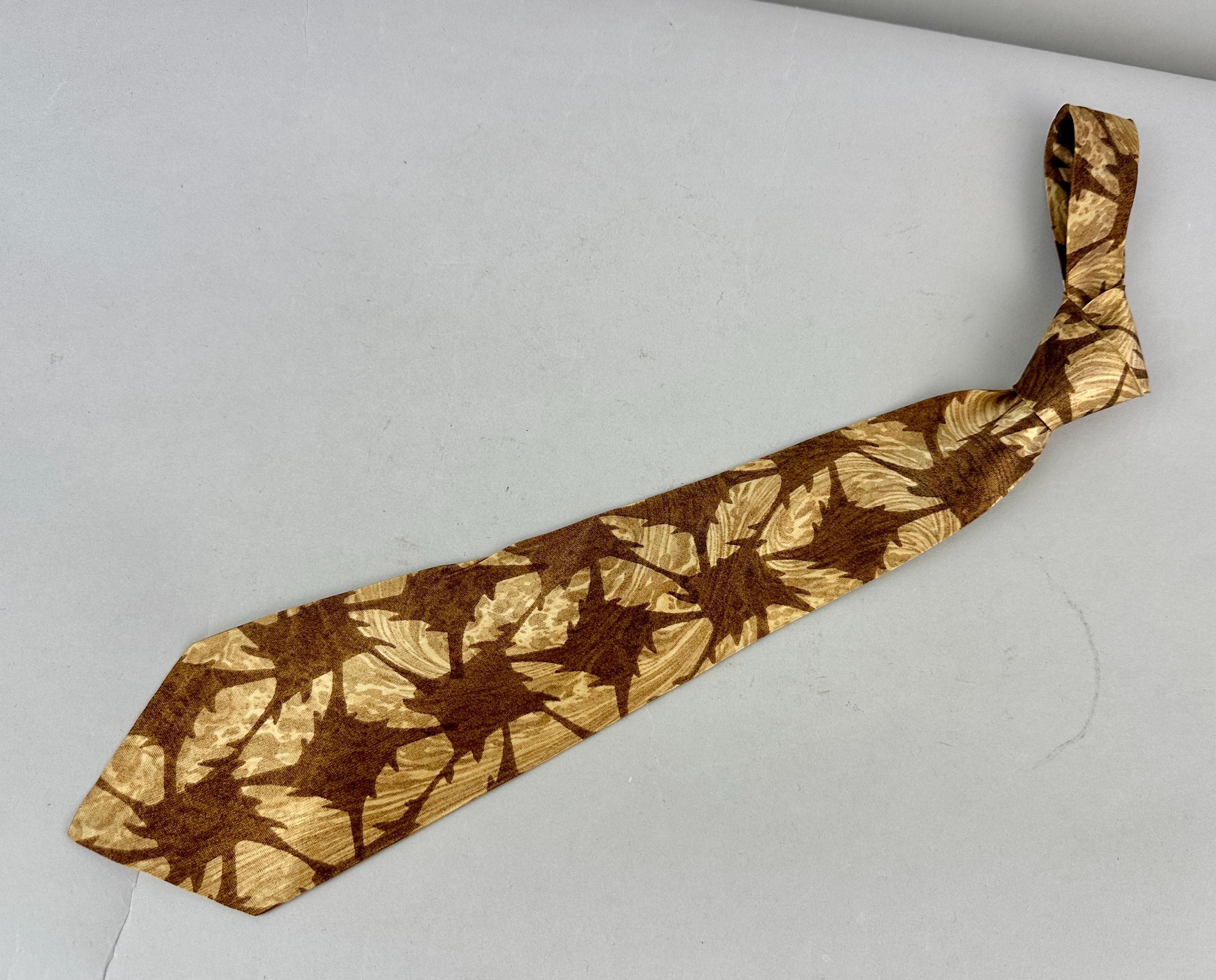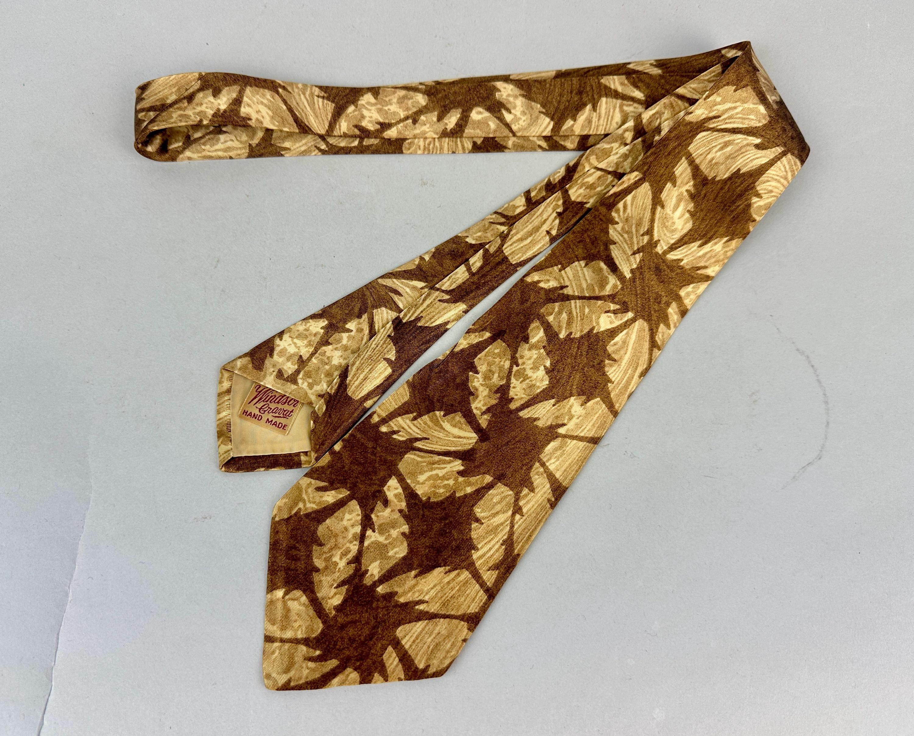 Make the most of brown leaves and grey skies by suiting up with this 1940s tie! The rayon is printed with leaves in a formation of swirling wreaths in brown sepia tones. Fully lined and labeled "Windsor". Pairs well with a wide variety of Art Deco and Mid-Century suit colors and fabric types. This tie is in great vintage condition with no flaws found!