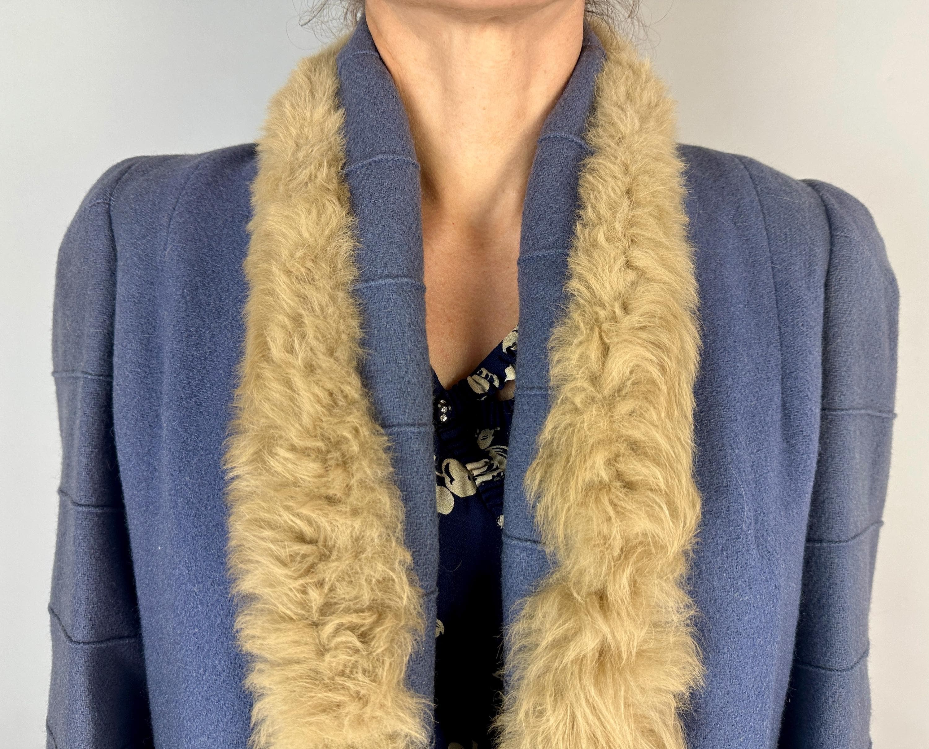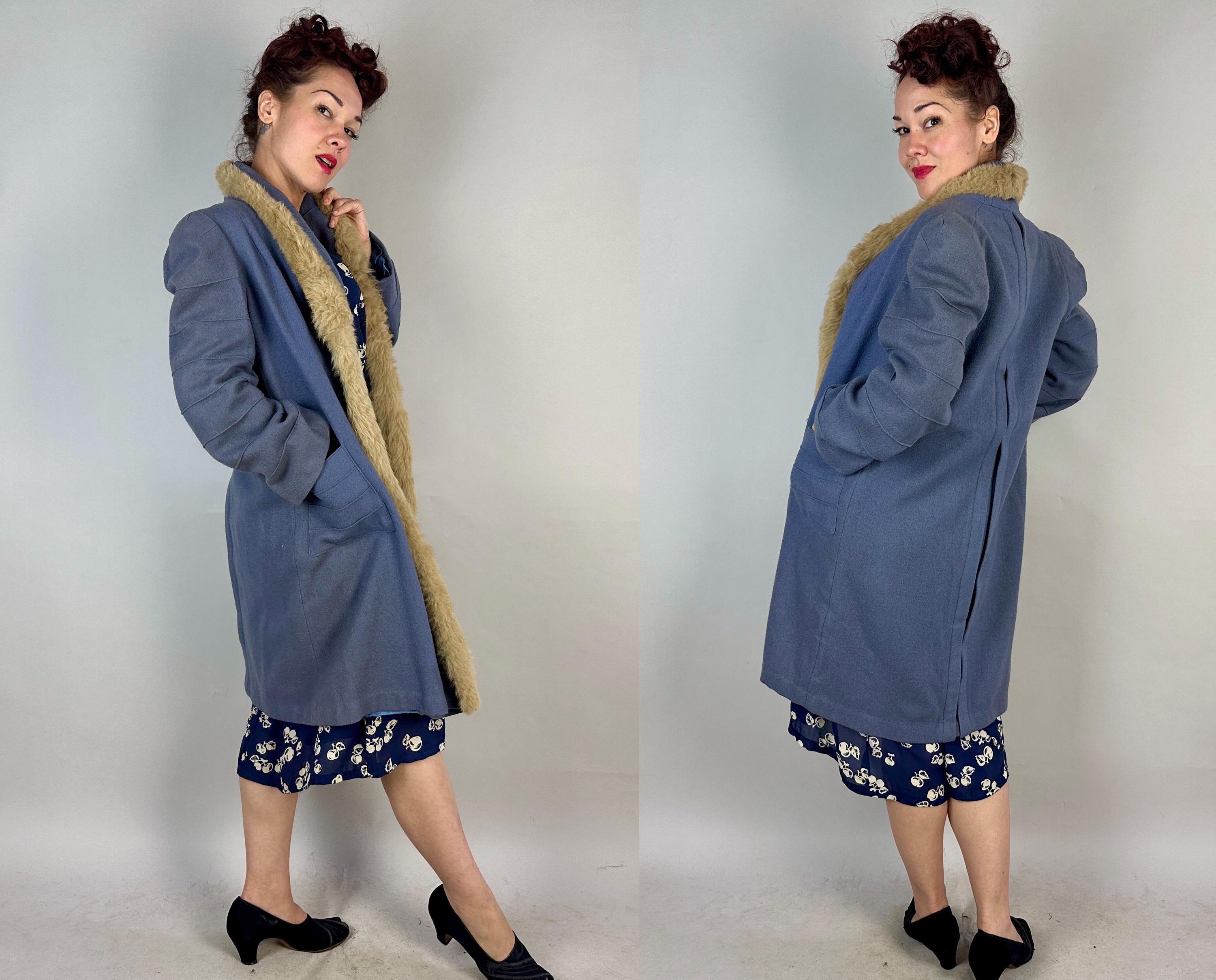 This 1930s coat will have you primmed for the season in the best way possible! Wool of dusty perriwinkle is paired with blonde fur trimming the full length of the swing style opening and can be laid flat in a shawl lapel style or held up around the neck with aid from the well structured seams. Pintucks make decorative stripes on the sleeves, patch pockets, and the lapel and a box pleat runs down the full length of the back. The shoulders are structured with padding and darts and the cuffs are bell cut. Fully lined. This coat is in great vintage condition, with no holes, stains, or odors to note.