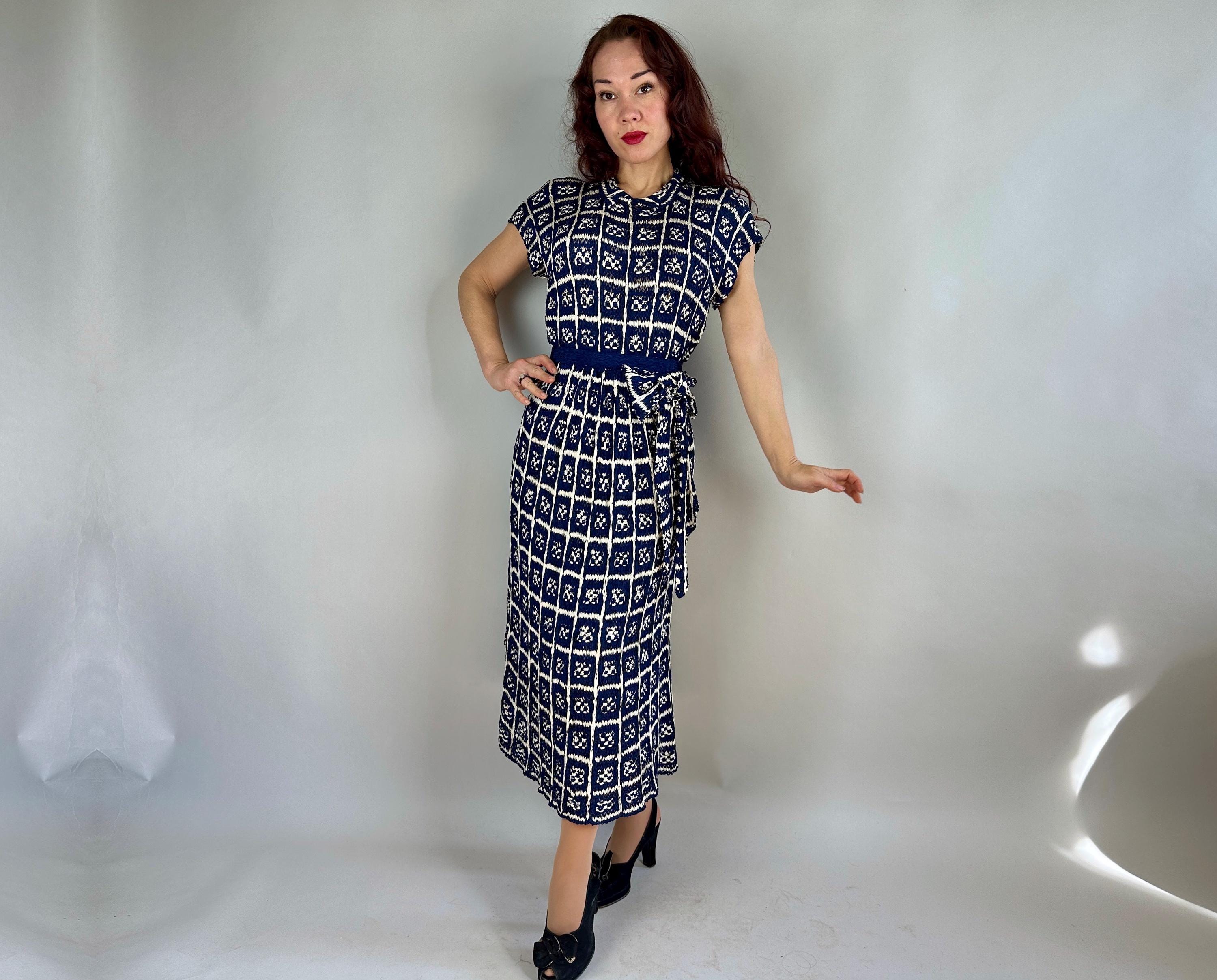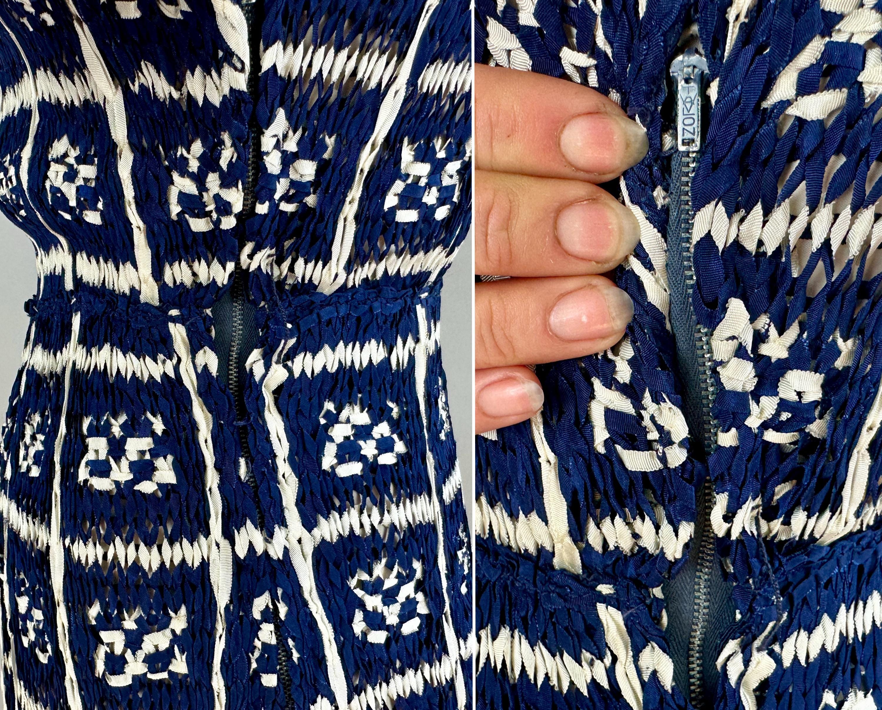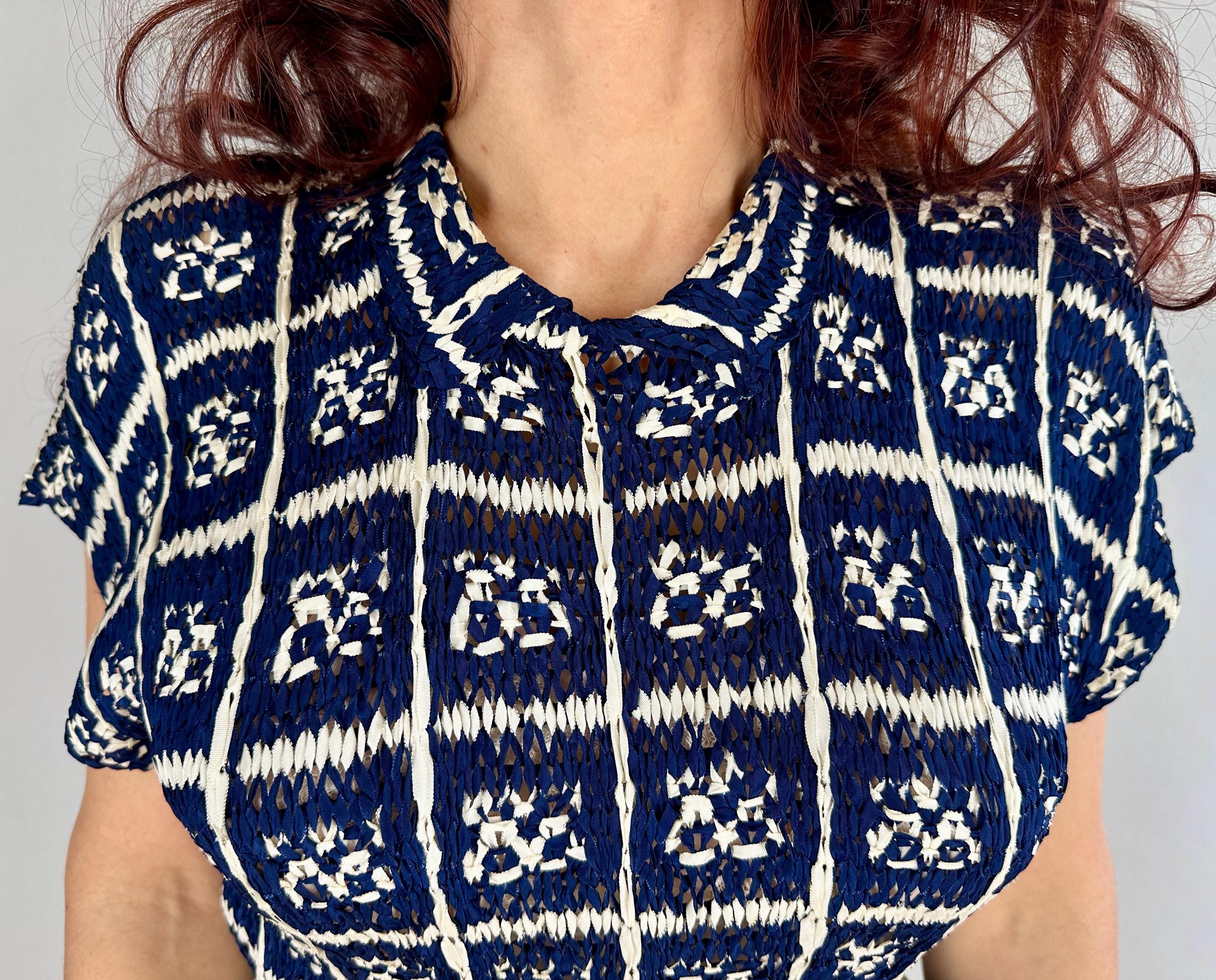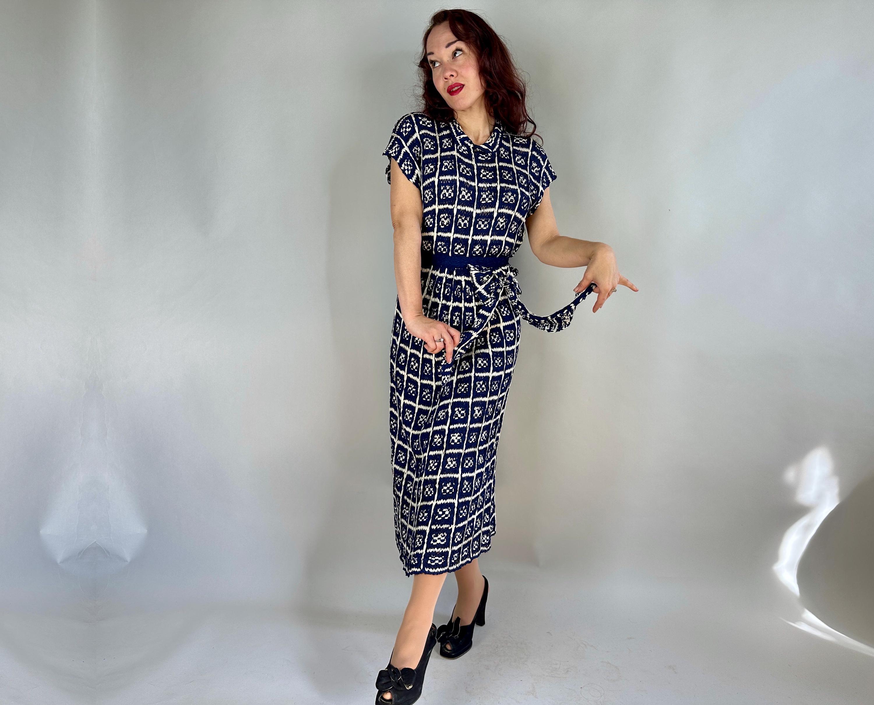 You'll surely gather admirers when wearing this ravishing ribbon knit dress from the 1940s! Navy blue and white ribbon is knit creating a windowpane pattern with a clover in each. It has a high neck with pointed collar fastening with snaps at the nape,cap sleeves, and straight skirt with sultry cling. A matching belt includes a jaunty peplum bow! Metal V for Victory "Talon" side zipper pinpointing this dress to WWII. This dress is in great vintage condition, with no holes, stains, or odors to note.