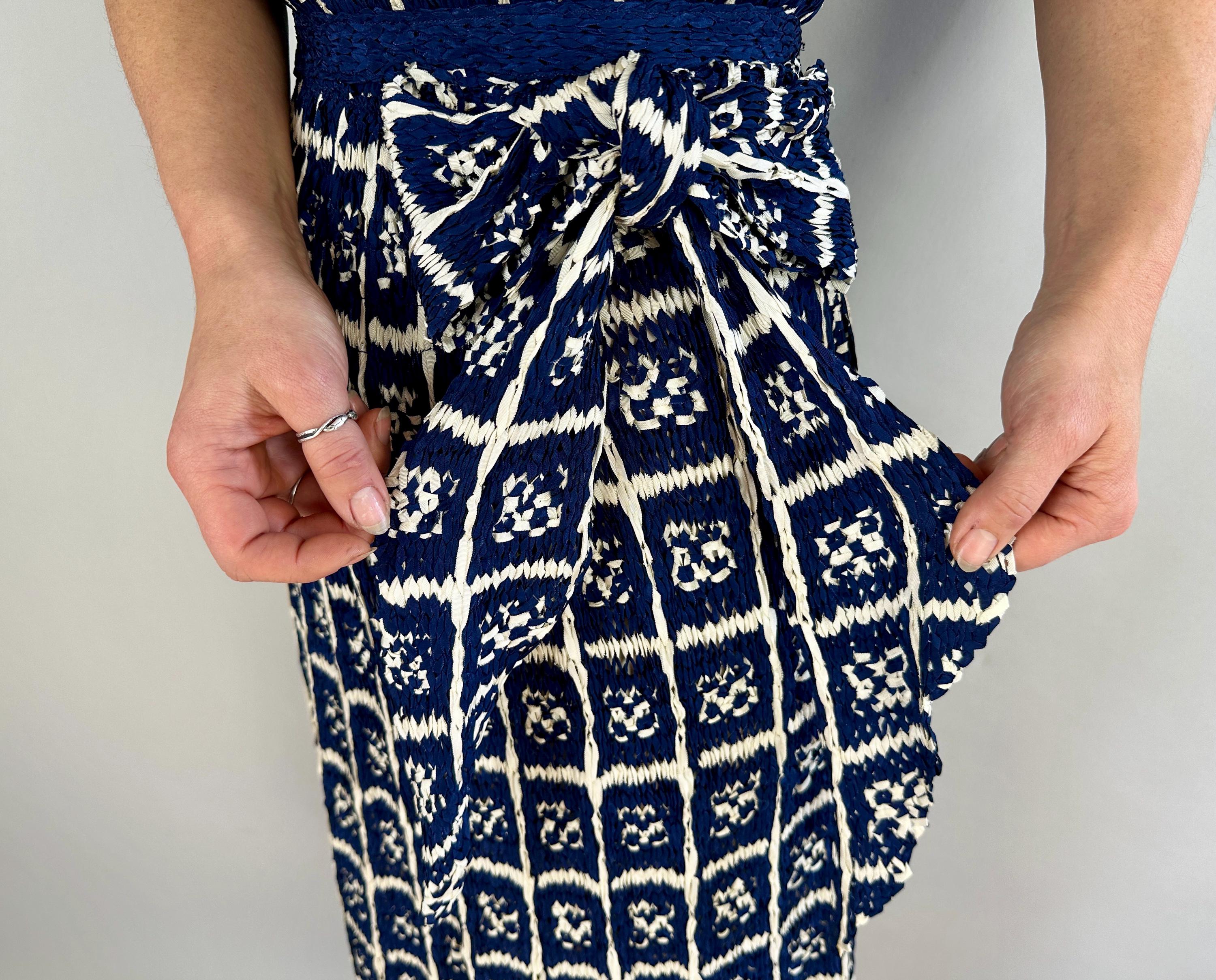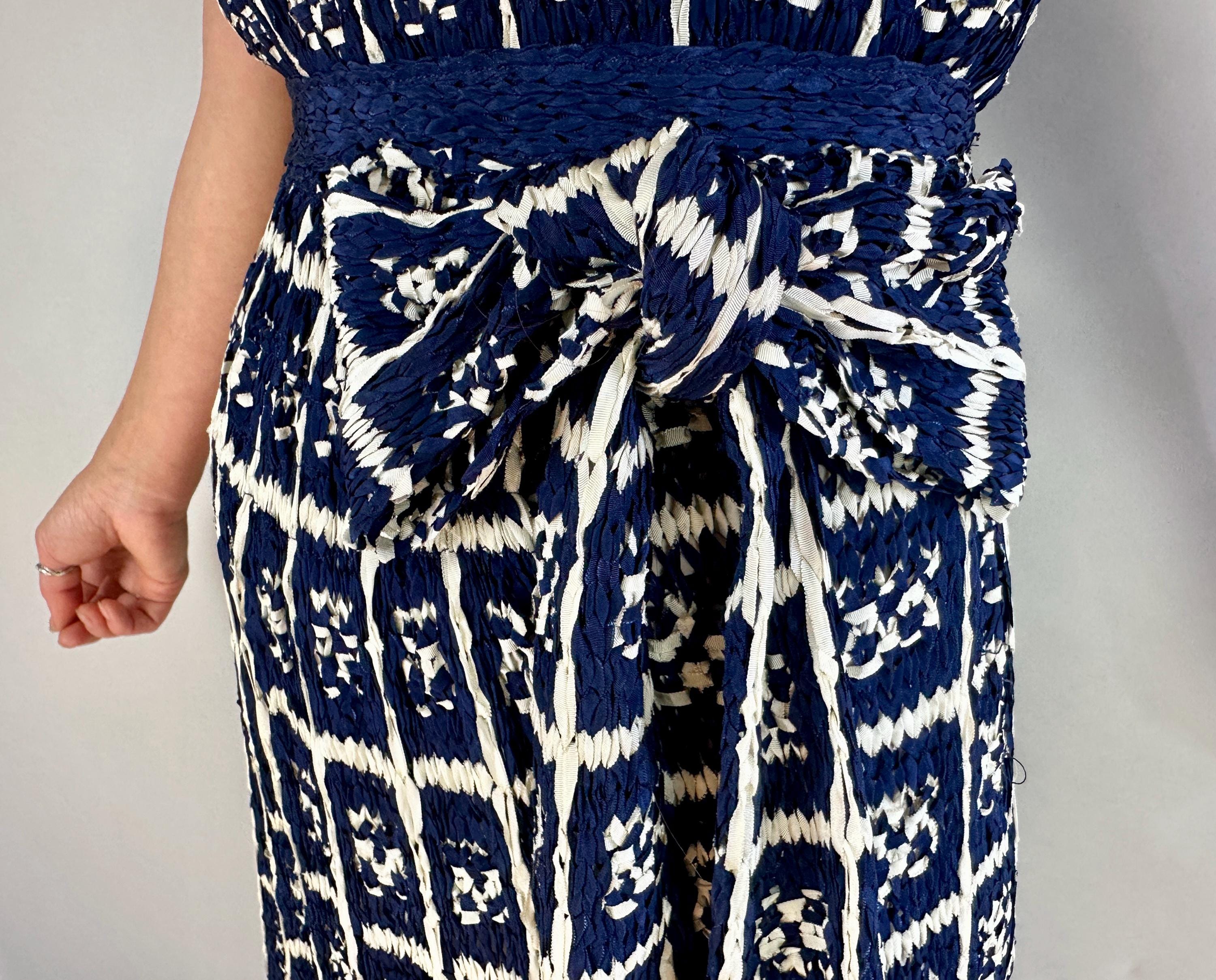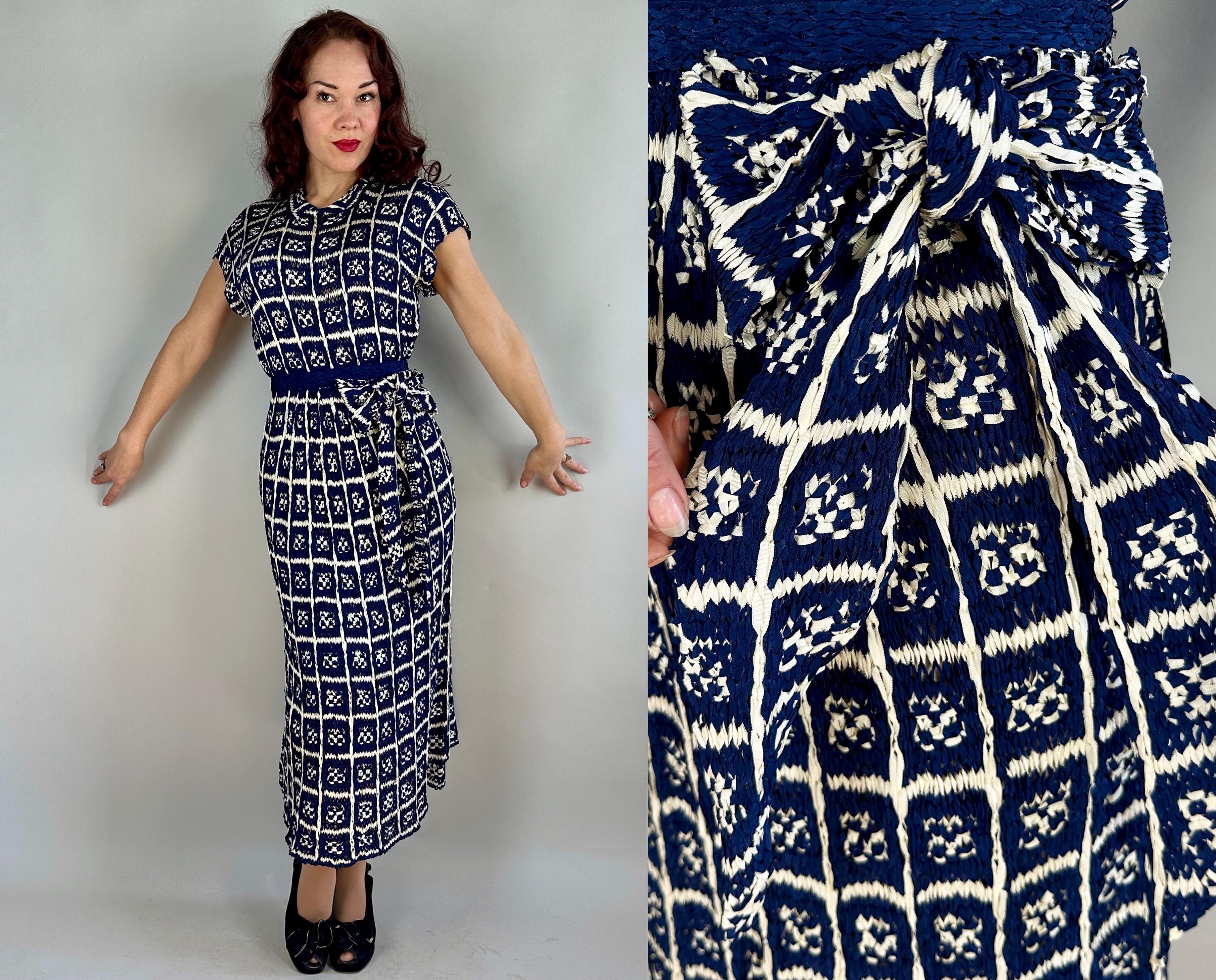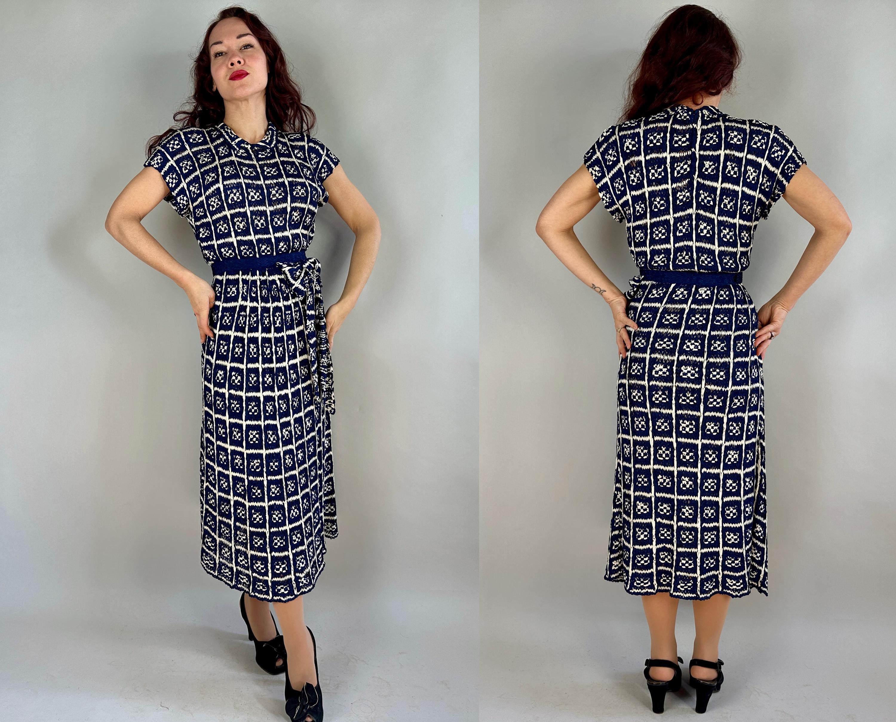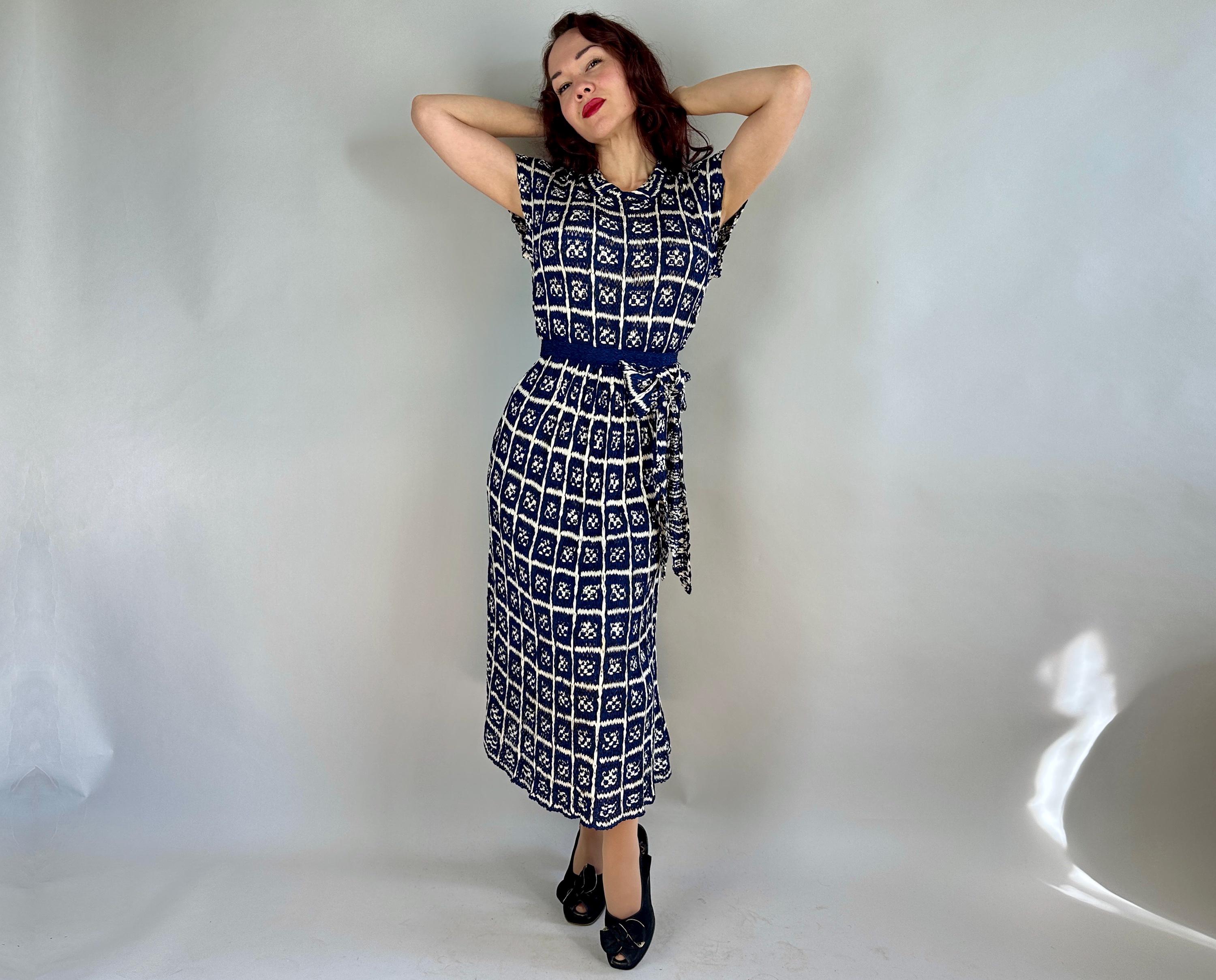You'll surely gather admirers when wearing this ravishing ribbon knit dress from the 1940s! Navy blue and white ribbon is knit creating a windowpane pattern with a clover in each. It has a high neck with pointed collar fastening with snaps at the nape,cap sleeves, and straight skirt with sultry cling. A matching belt includes a jaunty peplum bow! Metal V for Victory "Talon" side zipper pinpointing this dress to WWII. This dress is in great vintage condition, with no holes, stains, or odors to note.