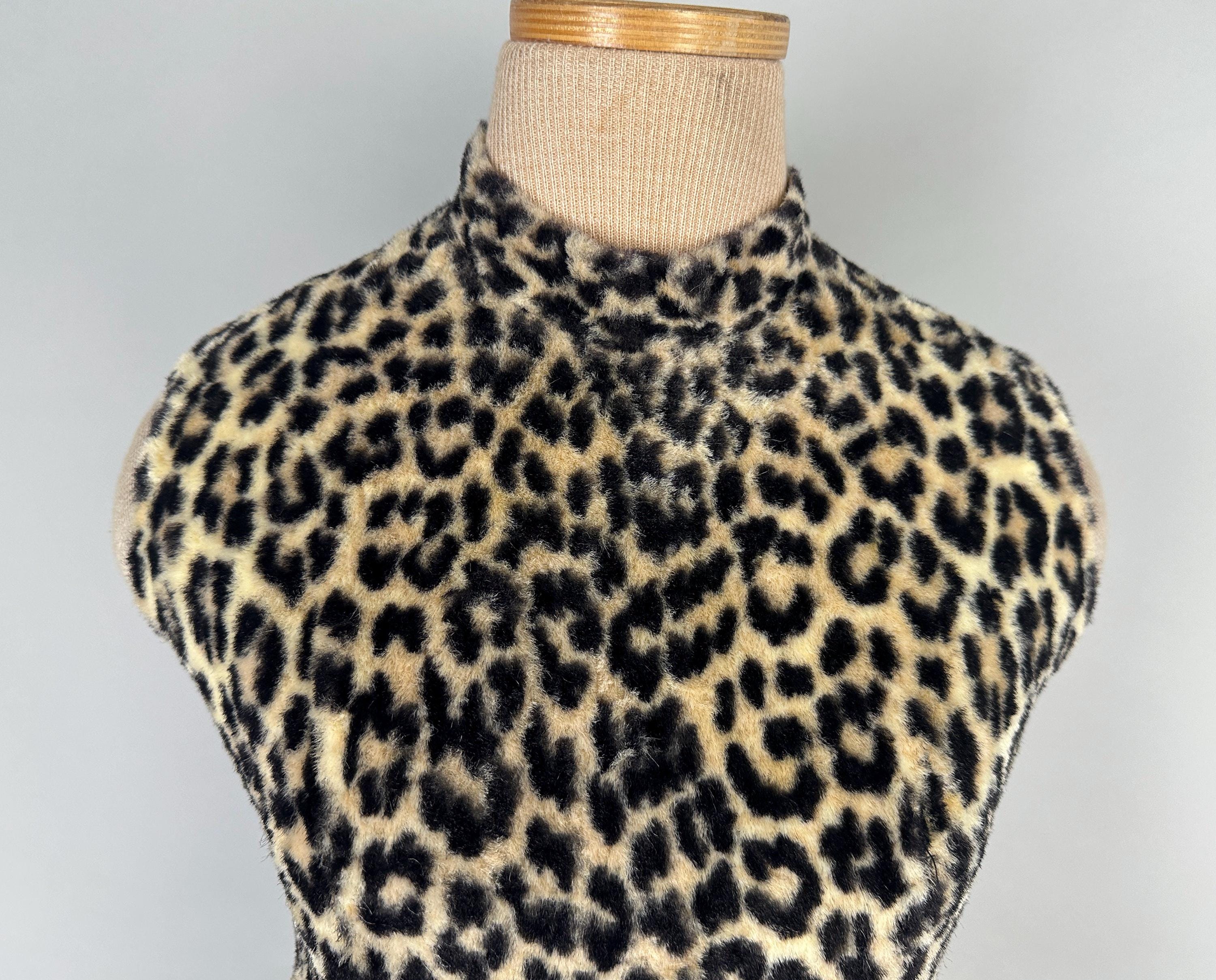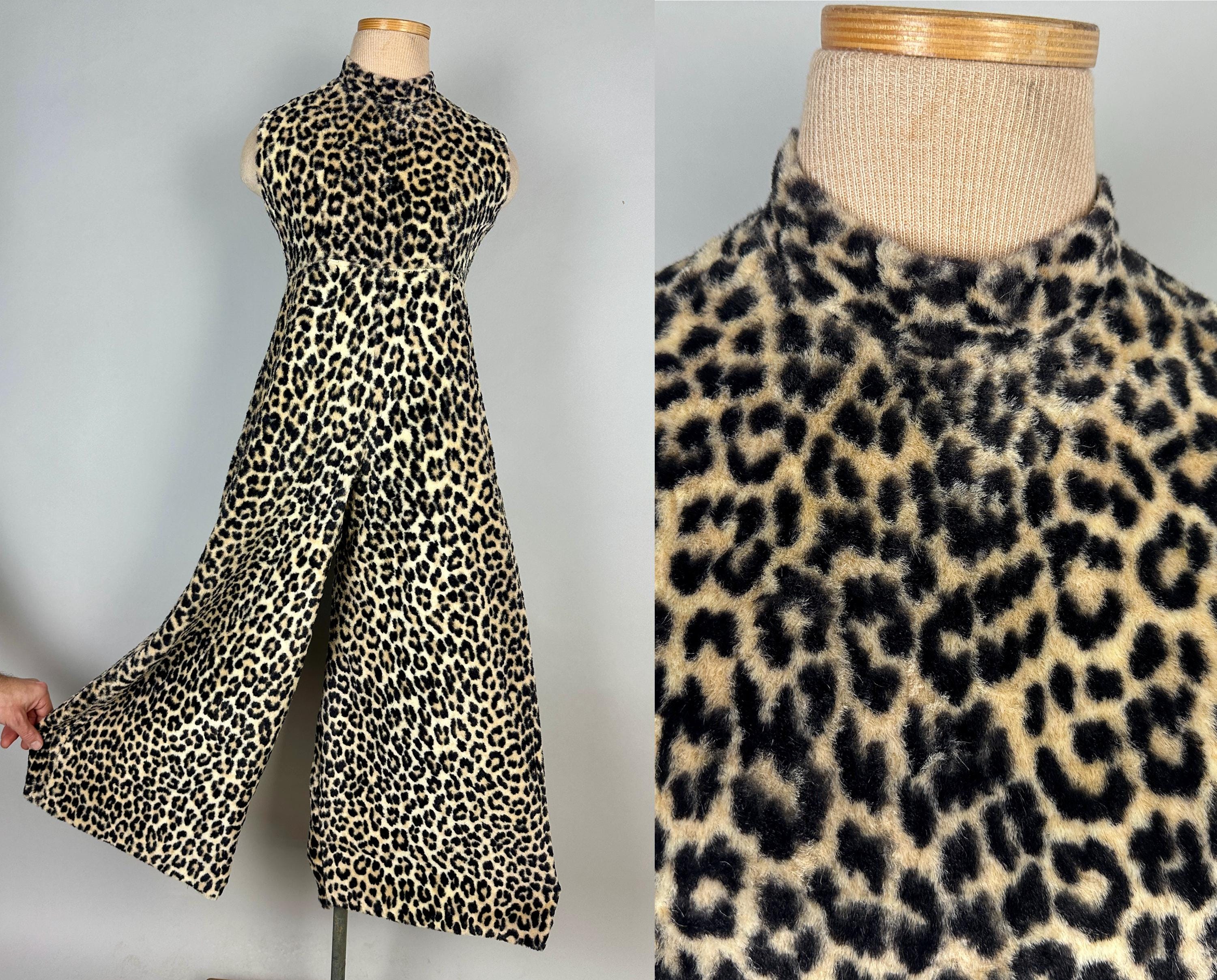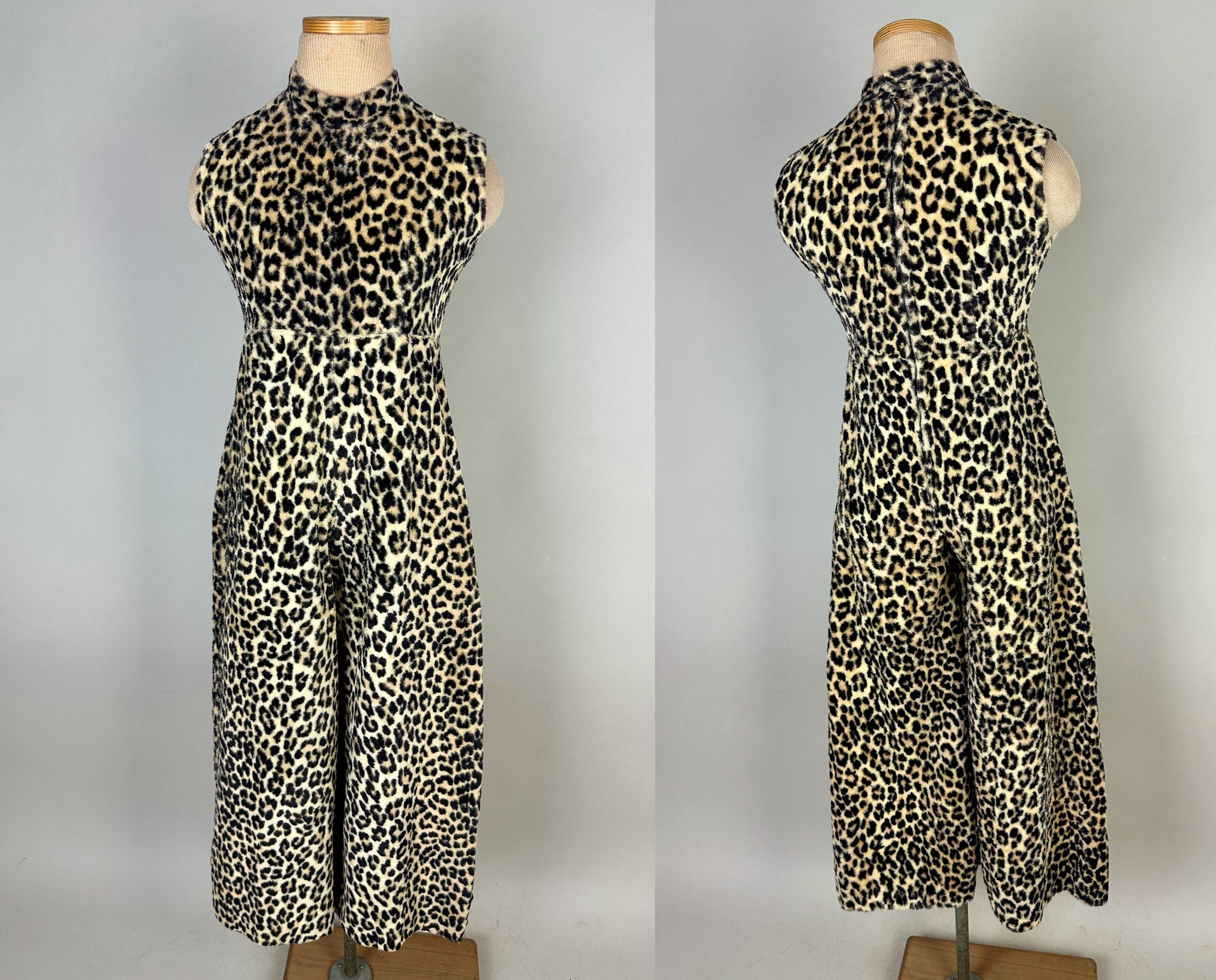 You're sure to catch your prey in this killer 1950s catsuit! Leopard print faux fur will make this a femme fatale staple and with a short nap and rayon lining you'll stay comfortable and pettable. Sleeveless and fashioned with a mock turtle neck and ultra wide palazzo style pants legs, an elegant silhouette makes this piece versatile for many occassions and a fun backdrop for accessories. Metal zip runs up the back. This jumpsuit is in great vintage condition, with no holes, stains, or odors to note.