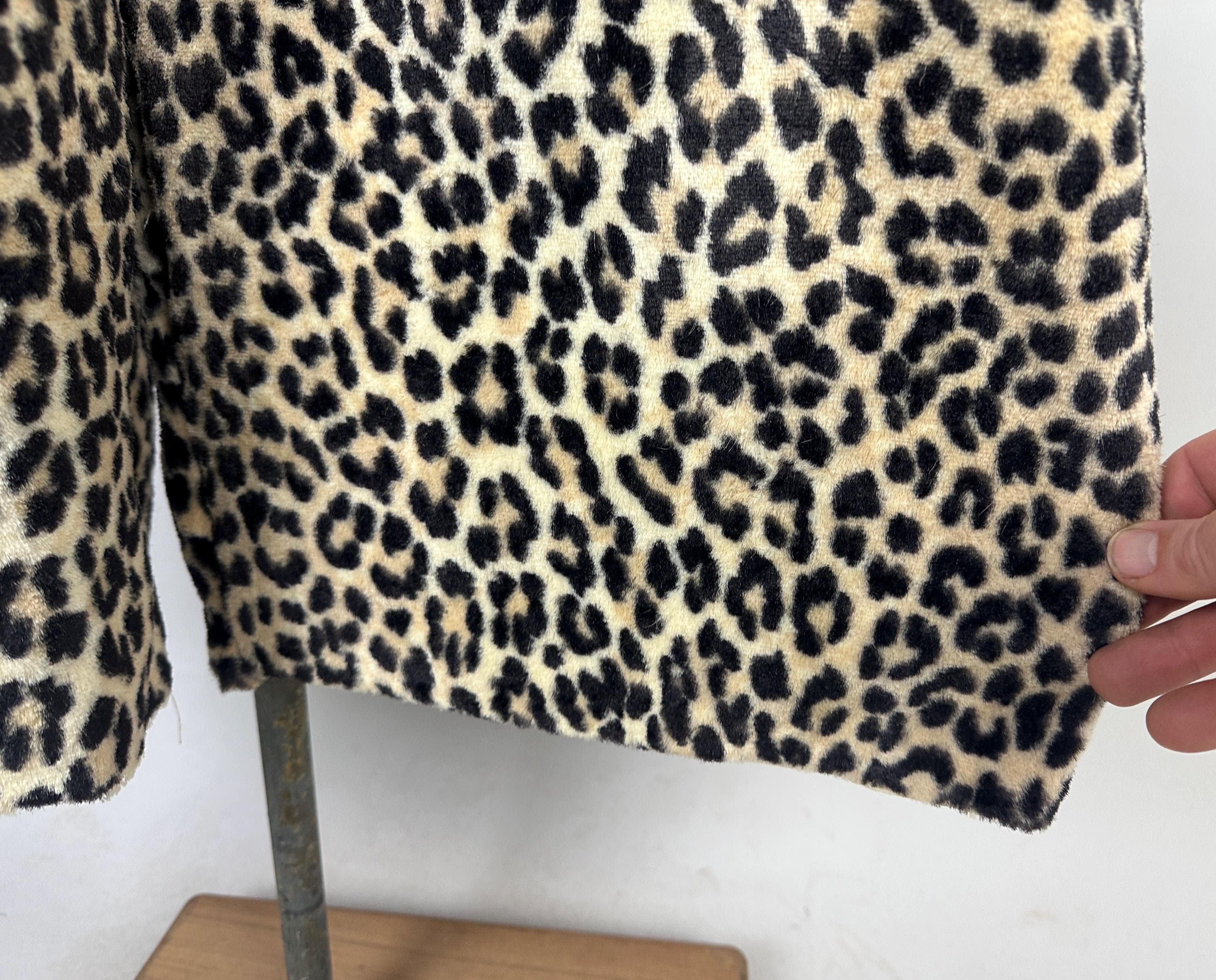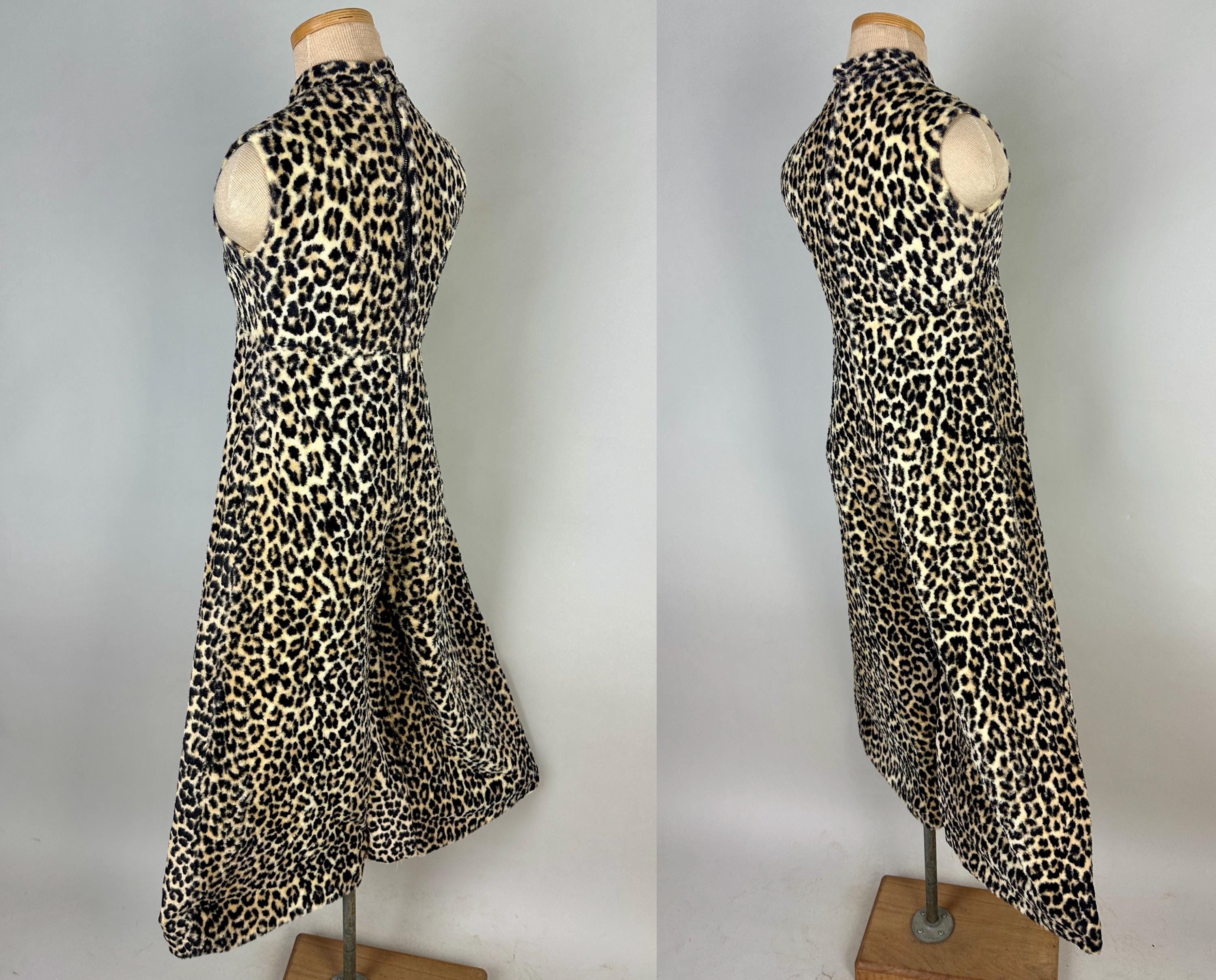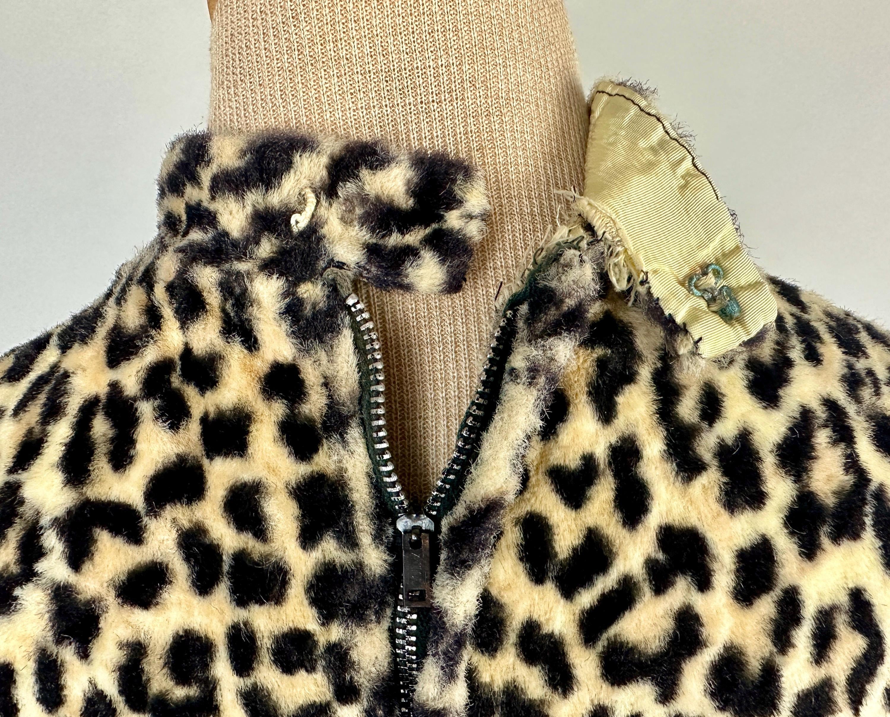 You're sure to catch your prey in this killer 1950s catsuit! Leopard print faux fur will make this a femme fatale staple and with a short nap and rayon lining you'll stay comfortable and pettable. Sleeveless and fashioned with a mock turtle neck and ultra wide palazzo style pants legs, an elegant silhouette makes this piece versatile for many occassions and a fun backdrop for accessories. Metal zip runs up the back. This jumpsuit is in great vintage condition, with no holes, stains, or odors to note.