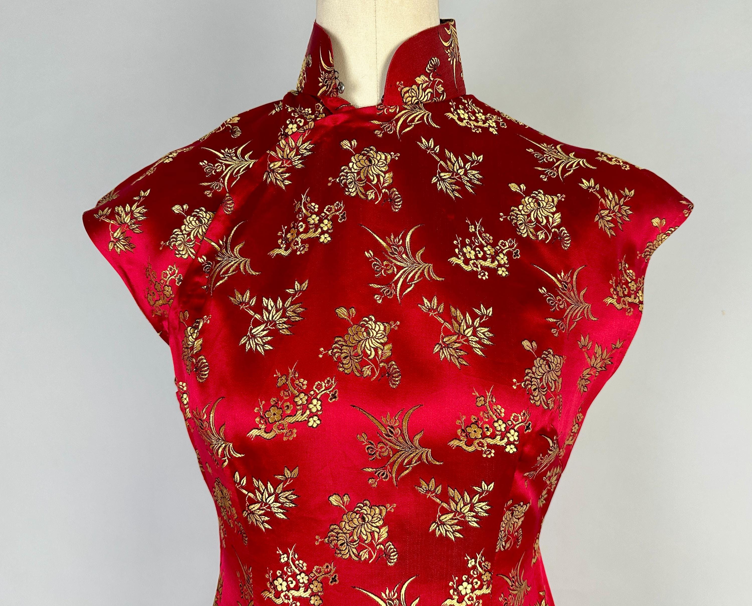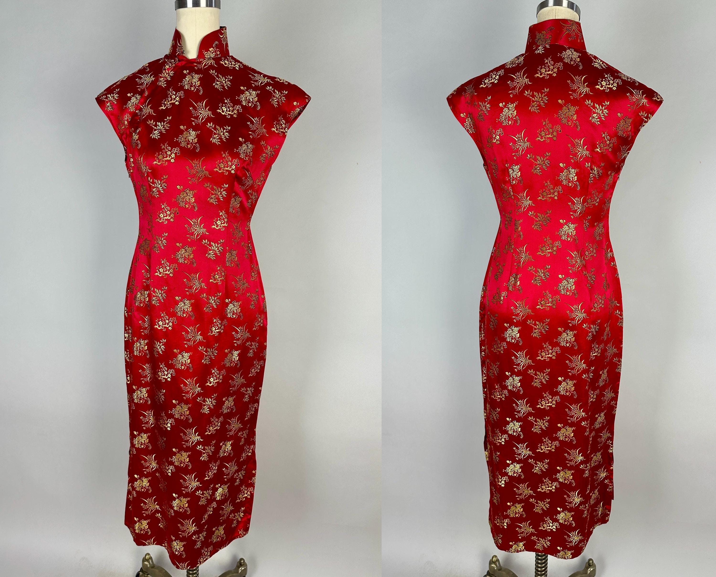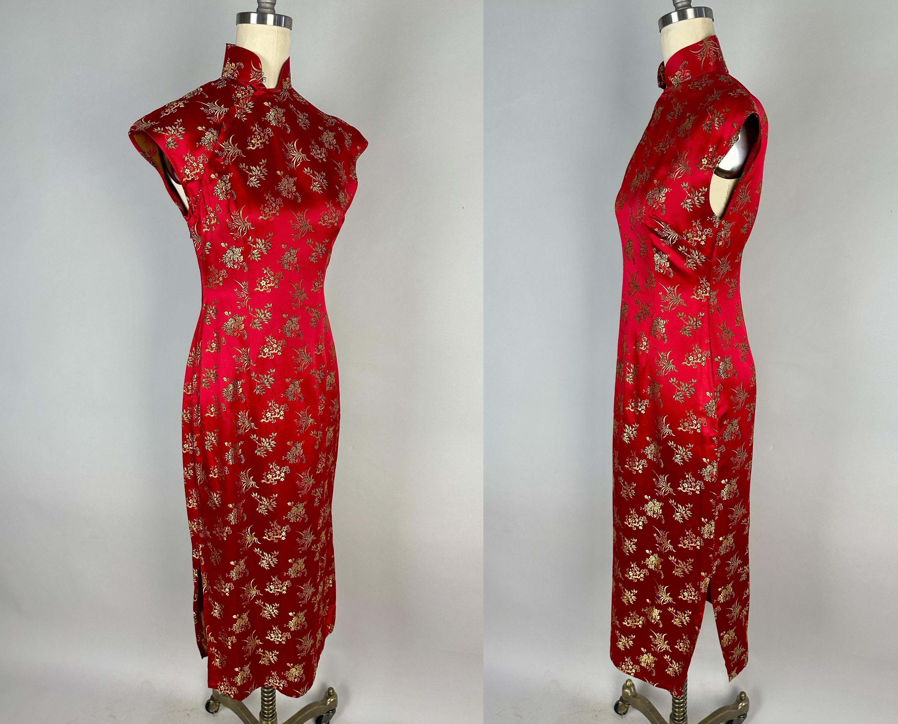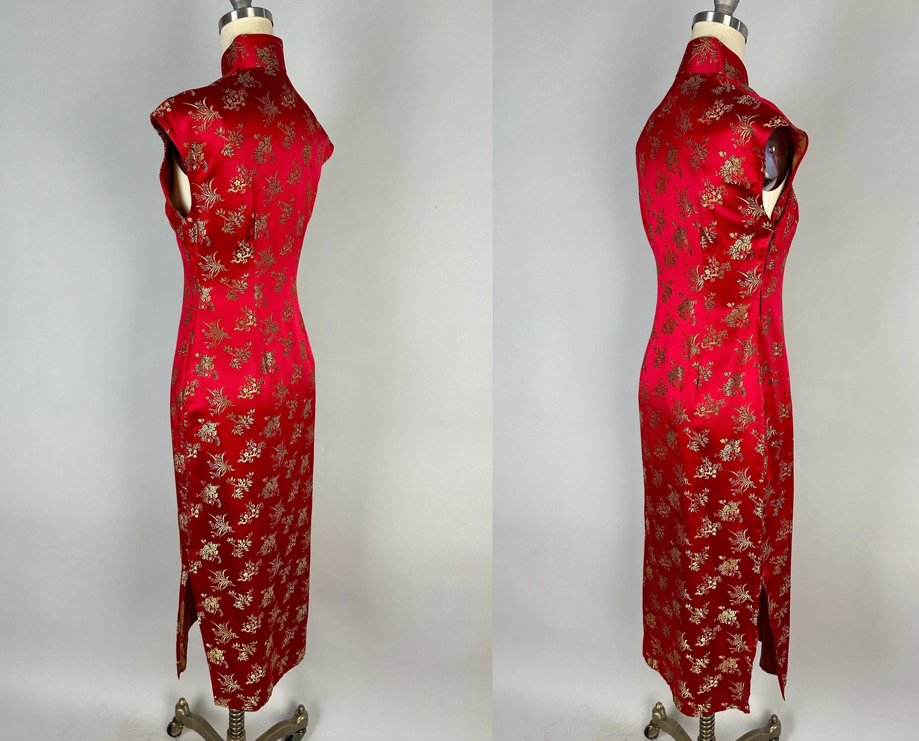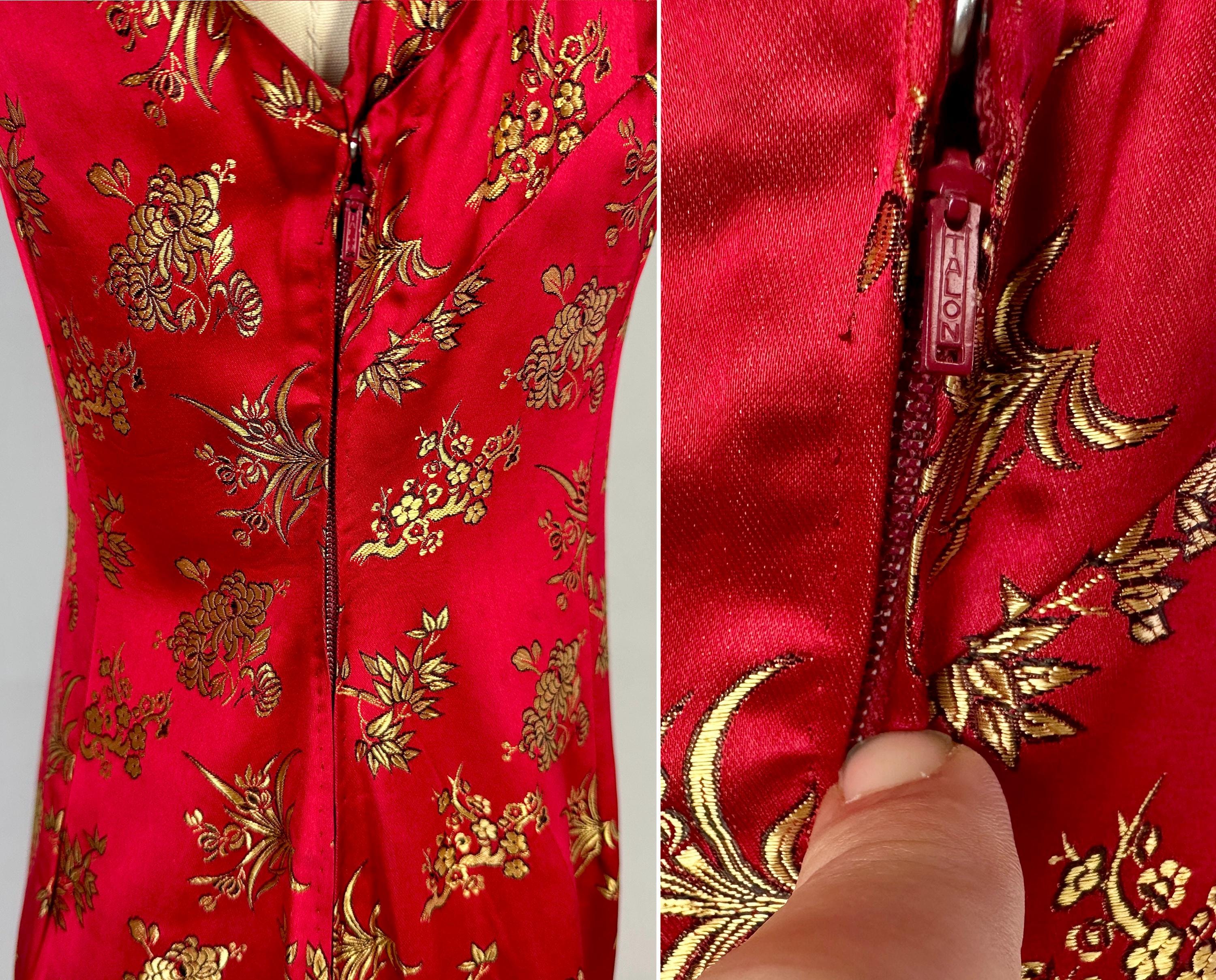 Dazzle like a jewel in this 1950s cheongsam! The traditional style features Mandarin collar, cap sleeves, and side slits. The silk is a gorgeous ruby red with a floral brocade pattern in gold, a combo that shimmers under light beautifully. Metal "Talon" side zipper with snaps across the chest. This dress is in great vintage condition, with no holes, stains, or odors to note.