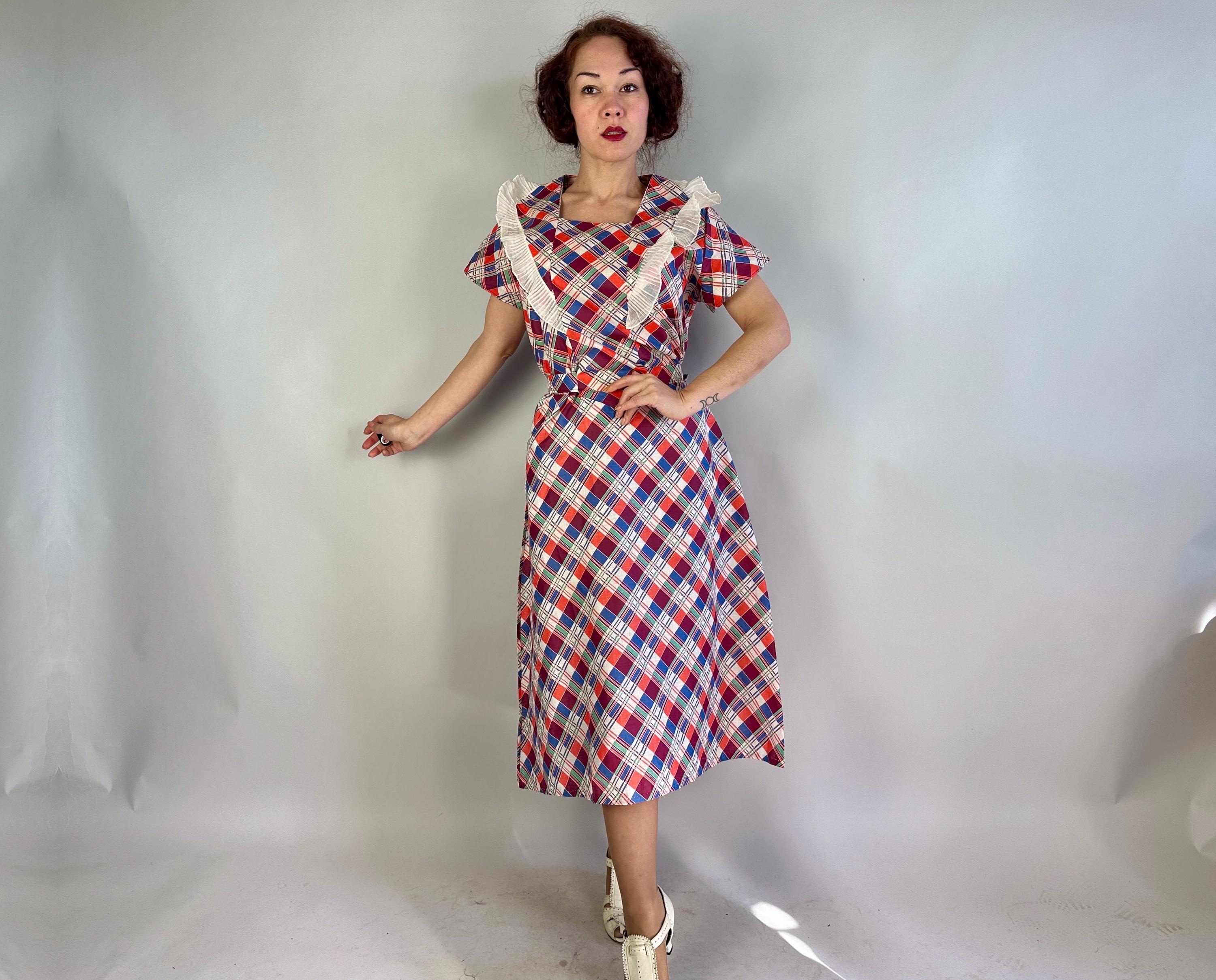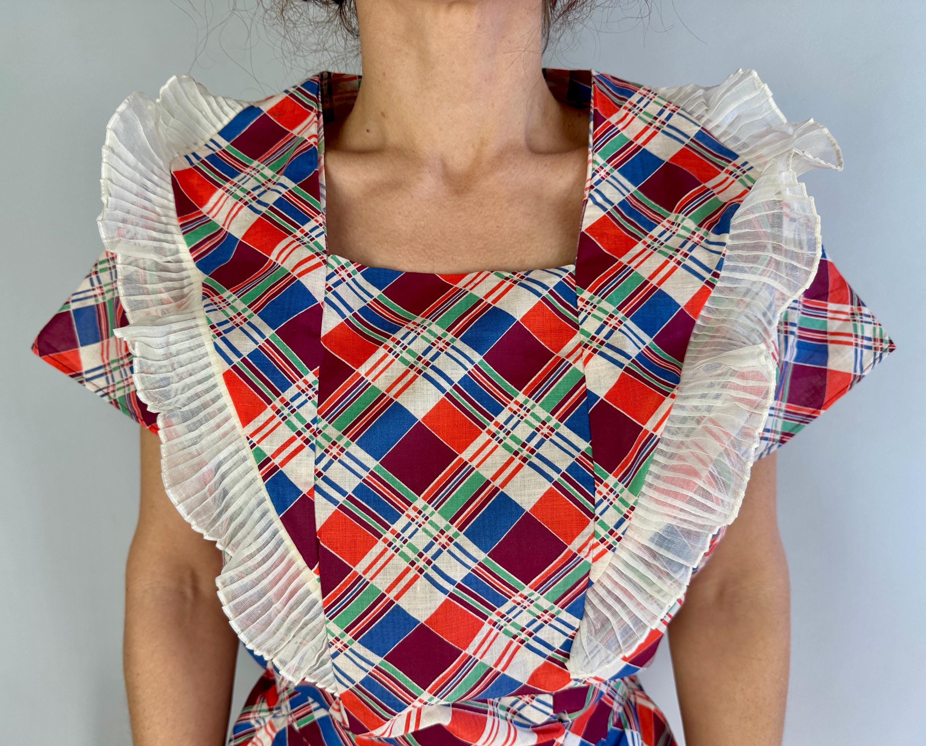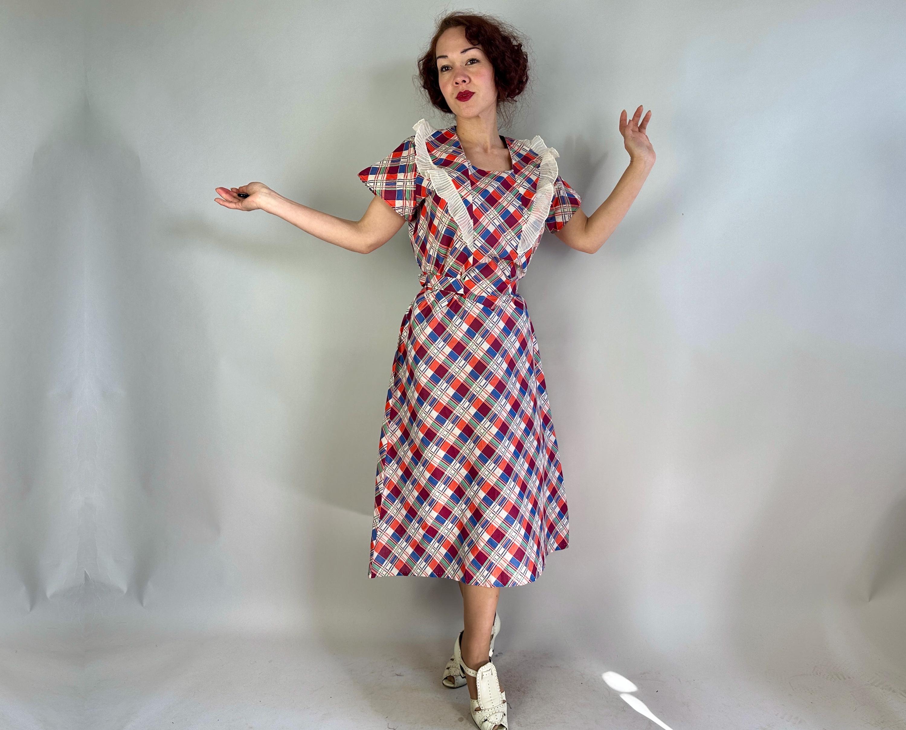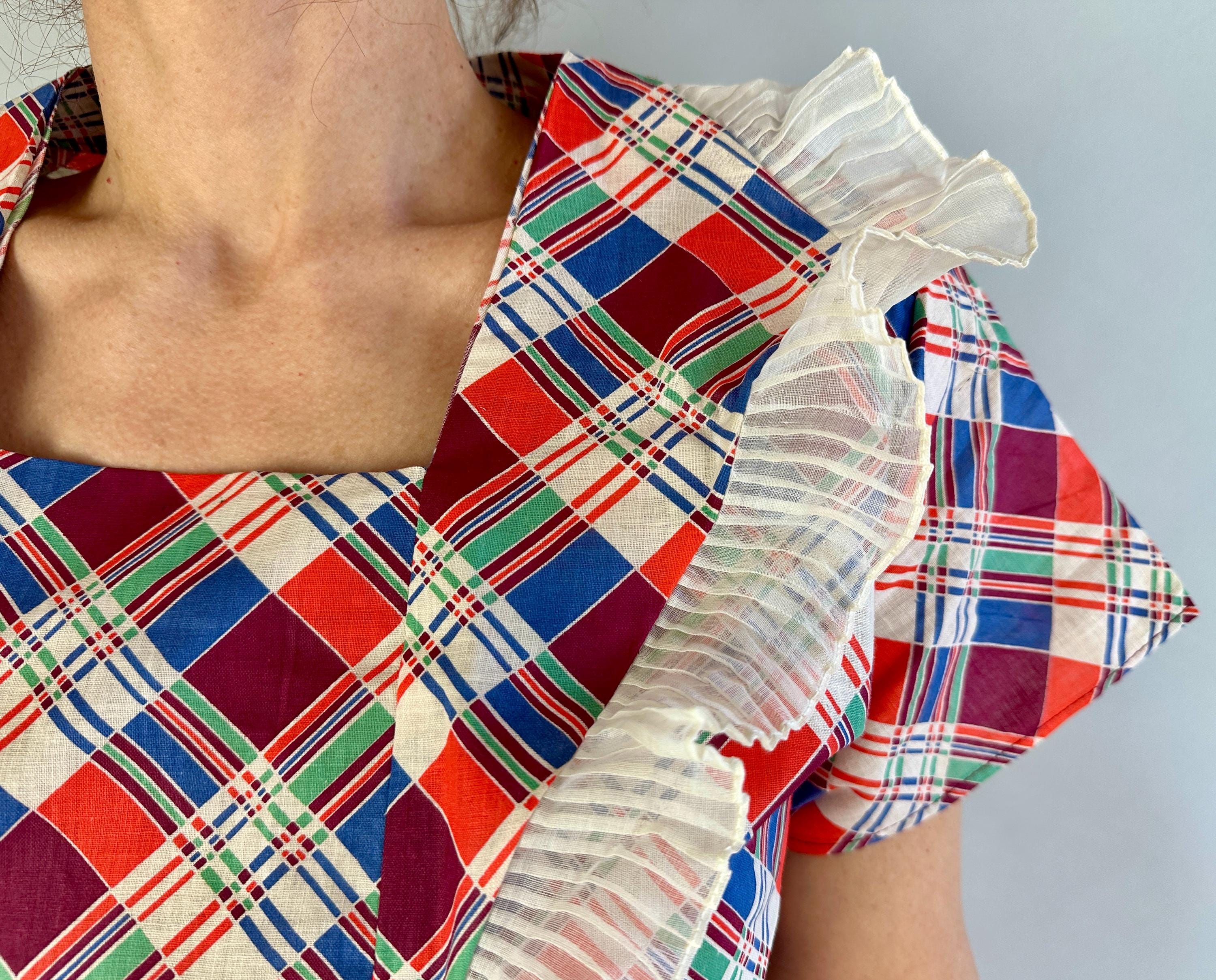 From gathering eggs to picnicking by the pond, this 1930’s dress will be a picturesque go to! Made of cotton in a plaid of tomato red, mint green, white, admiral blue, and maroon, with a delightful girlish accent of white organdy pleated into a ruffle edging the wing lapels. It is also styled with a square neckline, cap sleeves, Basque waist with ties attached for cinching, and a straight cut skirt. Slips on overhead. This dress is in excellent deadstock condition, with tags still attached and no holes, stains, or odors to note.