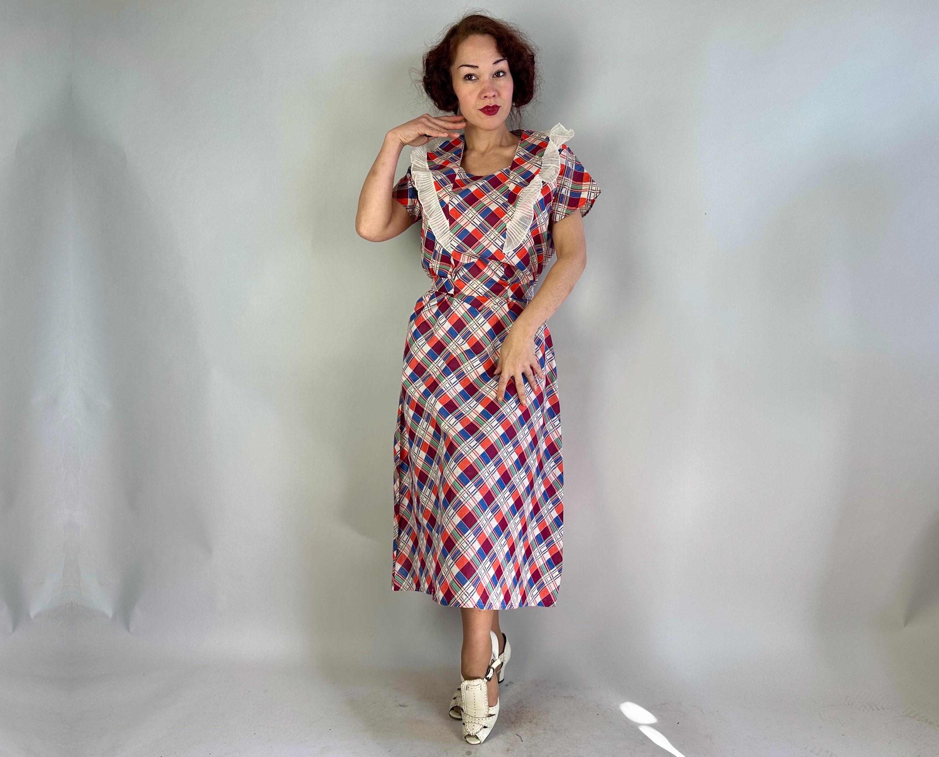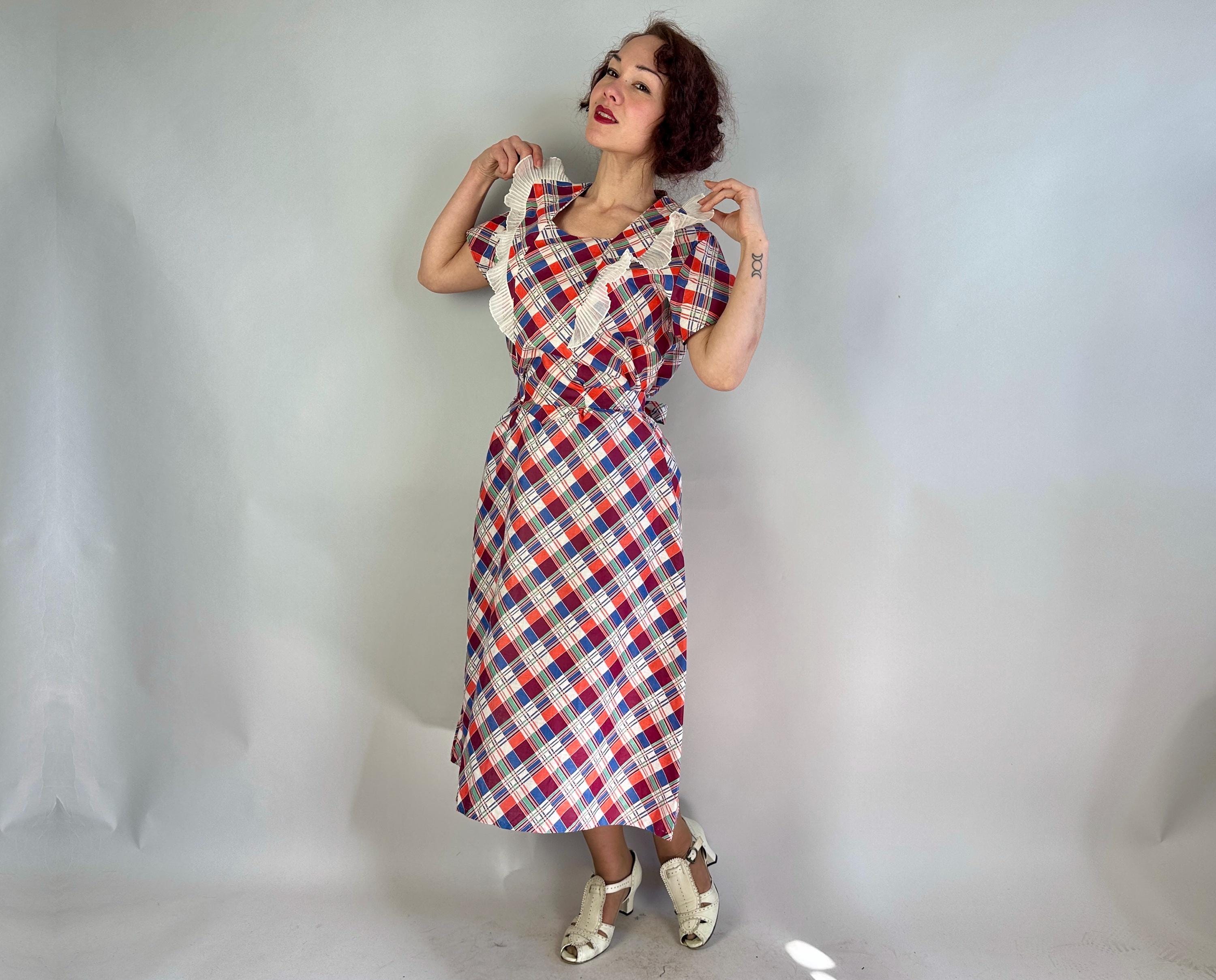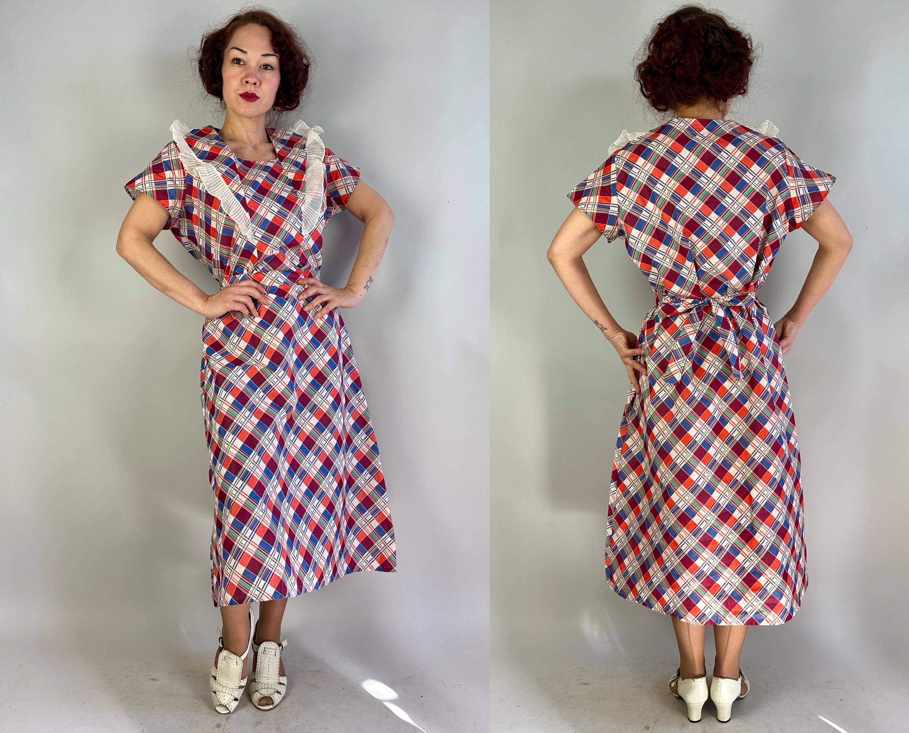 From gathering eggs to picnicking by the pond, this 1930’s dress will be a picturesque go to! Made of cotton in a plaid of tomato red, mint green, white, admiral blue, and maroon, with a delightful girlish accent of white organdy pleated into a ruffle edging the wing lapels. It is also styled with a square neckline, cap sleeves, Basque waist with ties attached for cinching, and a straight cut skirt. Slips on overhead. This dress is in excellent deadstock condition, with tags still attached and no holes, stains, or odors to note.