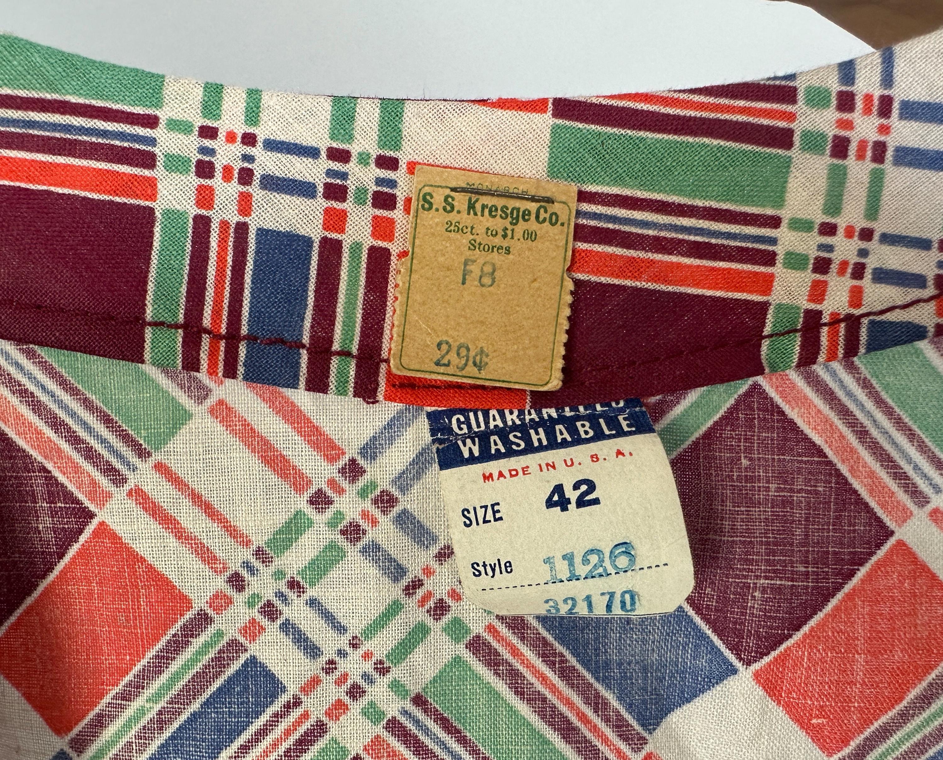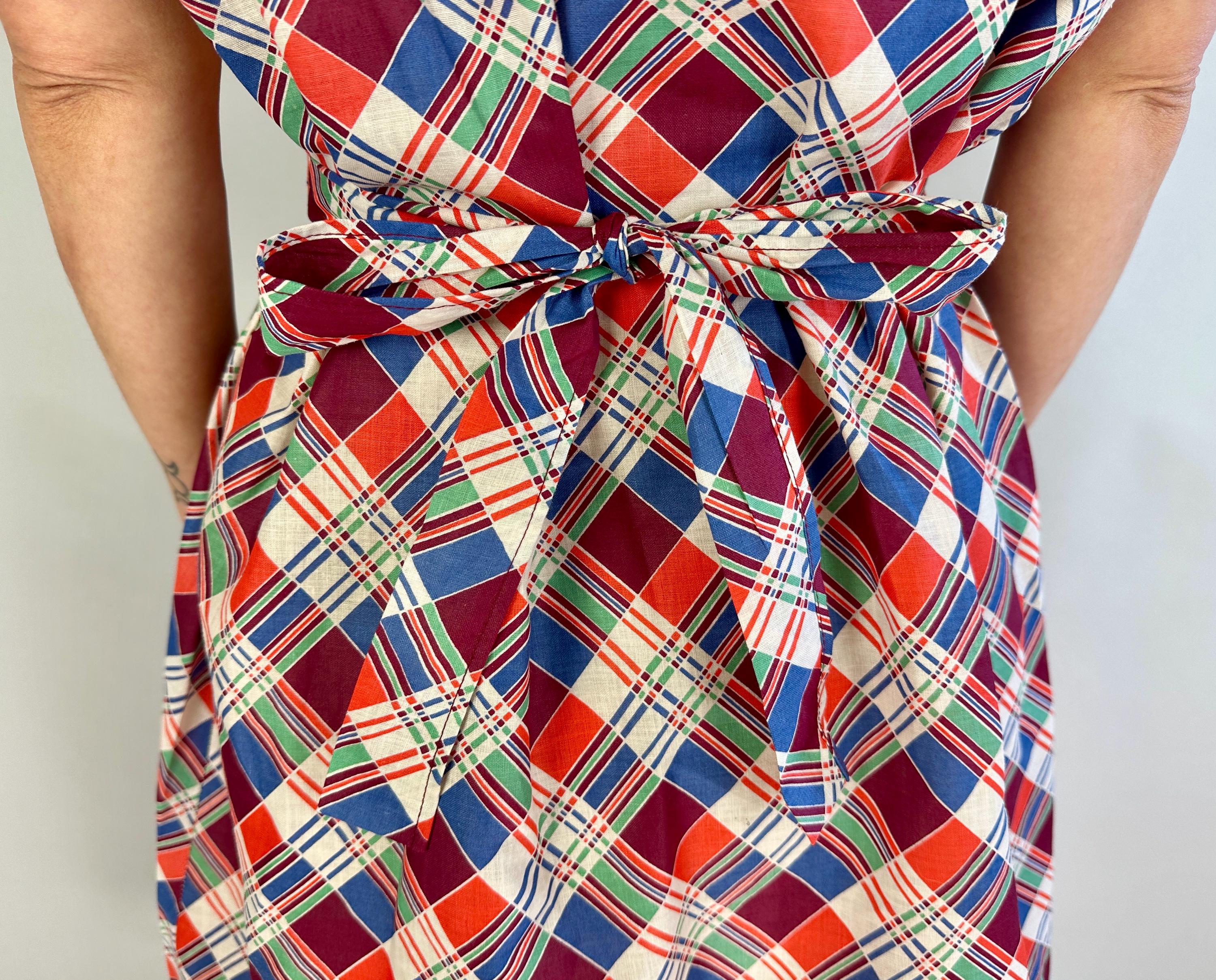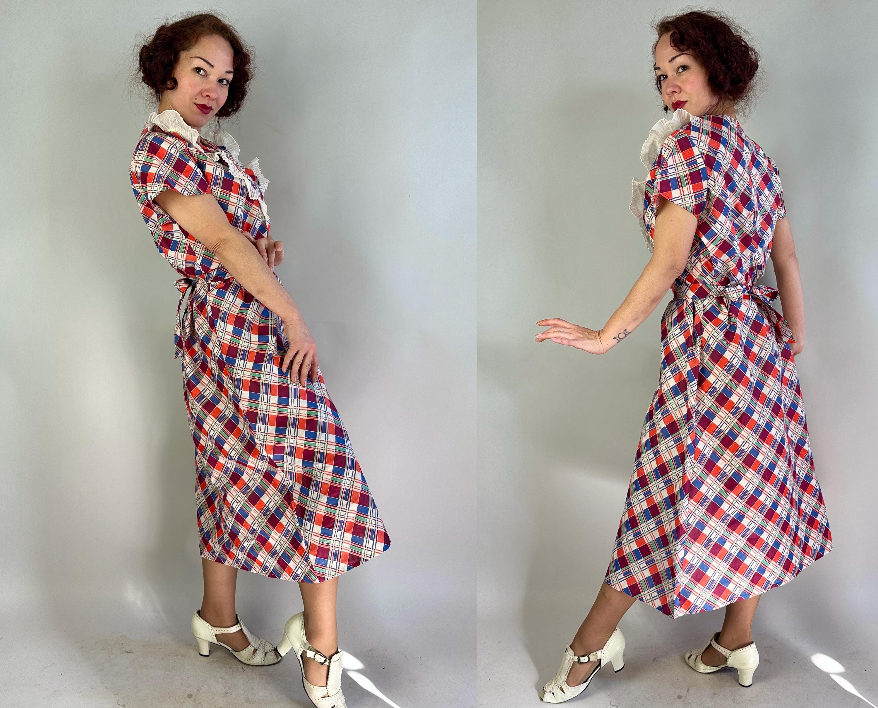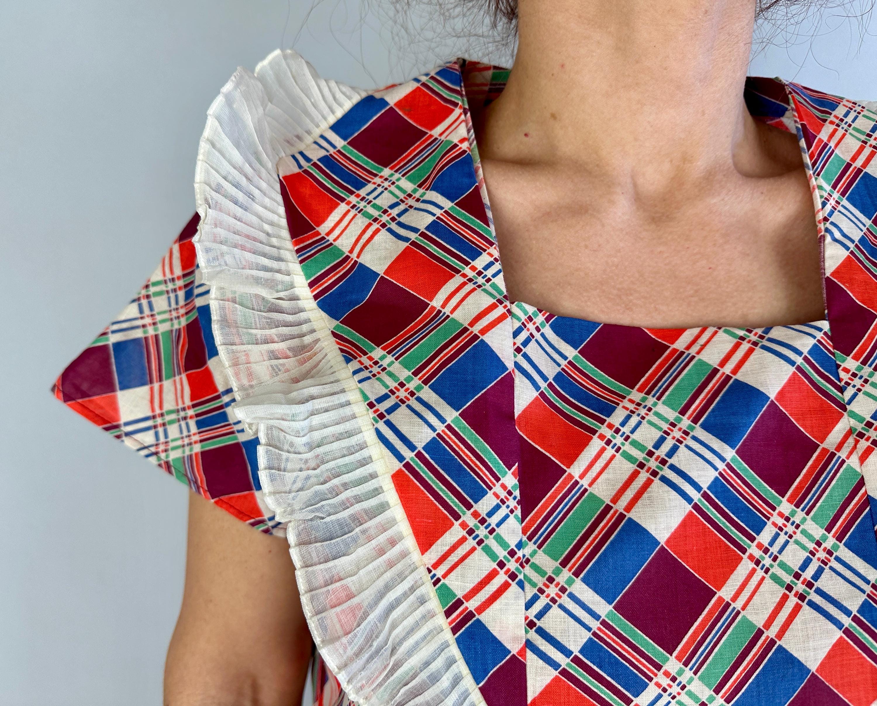 From gathering eggs to picnicking by the pond, this 1930’s dress will be a picturesque go to! Made of cotton in a plaid of tomato red, mint green, white, admiral blue, and maroon, with a delightful girlish accent of white organdy pleated into a ruffle edging the wing lapels. It is also styled with a square neckline, cap sleeves, Basque waist with ties attached for cinching, and a straight cut skirt. Slips on overhead. This dress is in excellent deadstock condition, with tags still attached and no holes, stains, or odors to note.