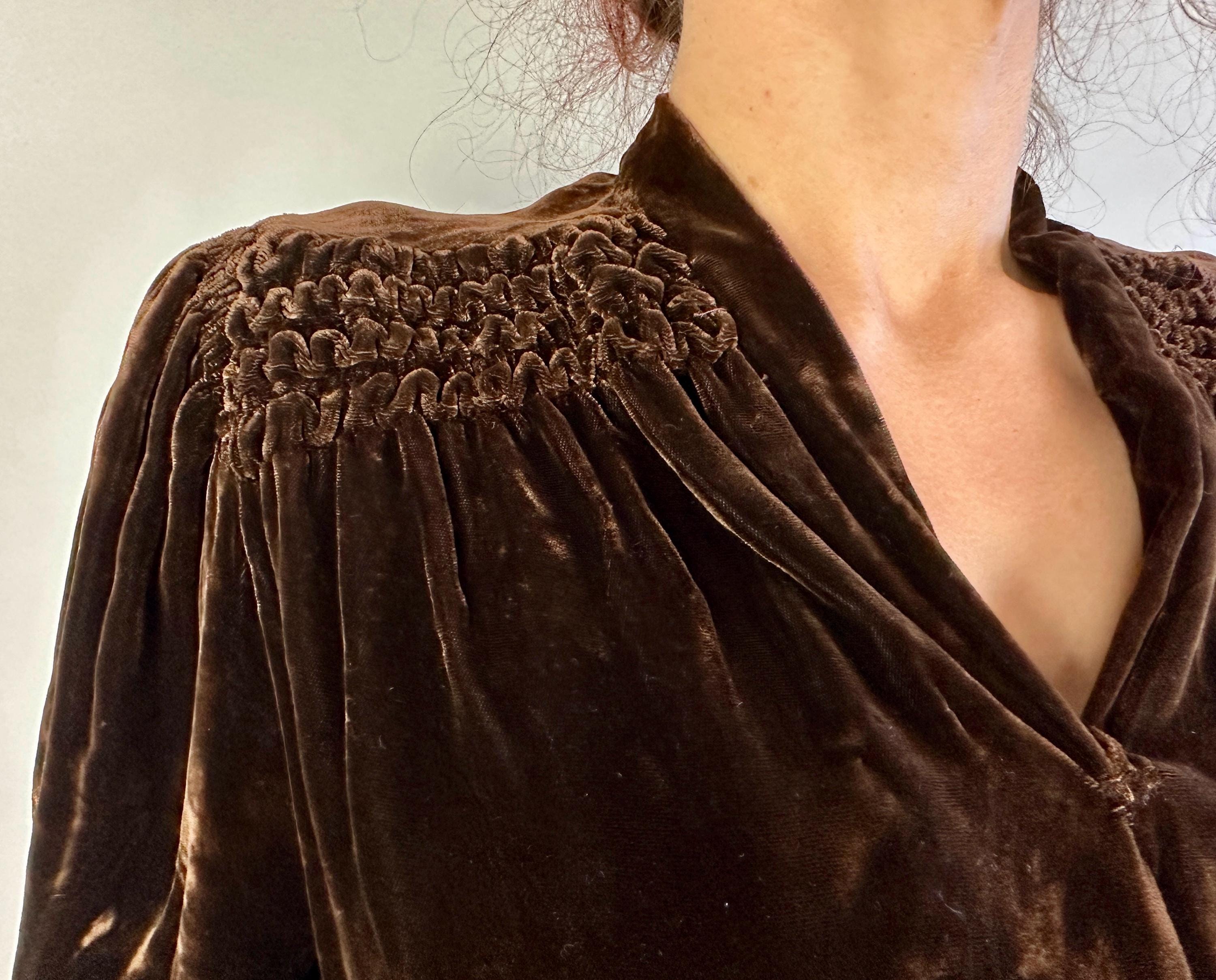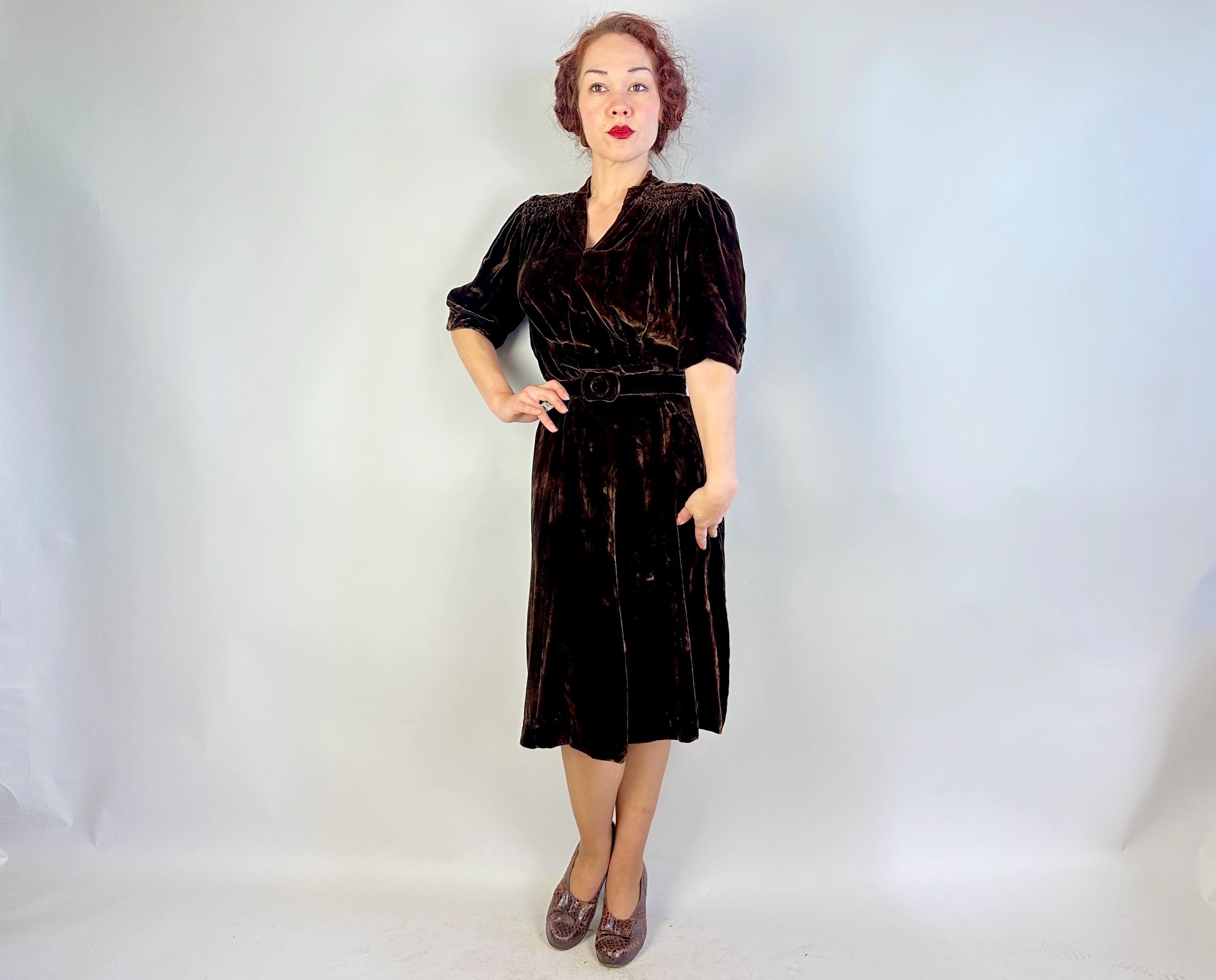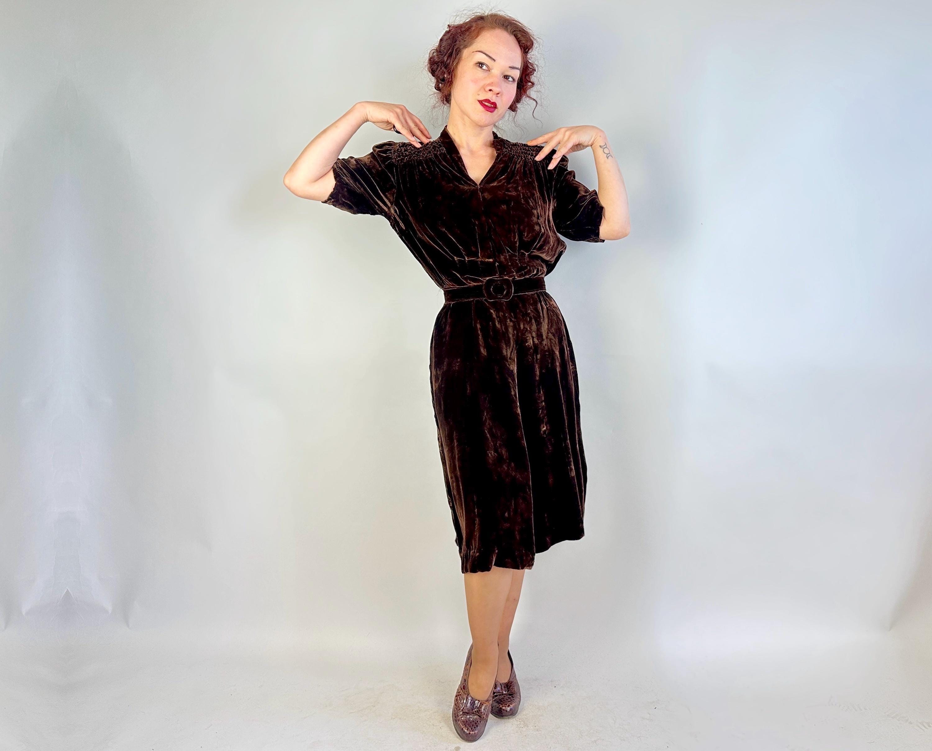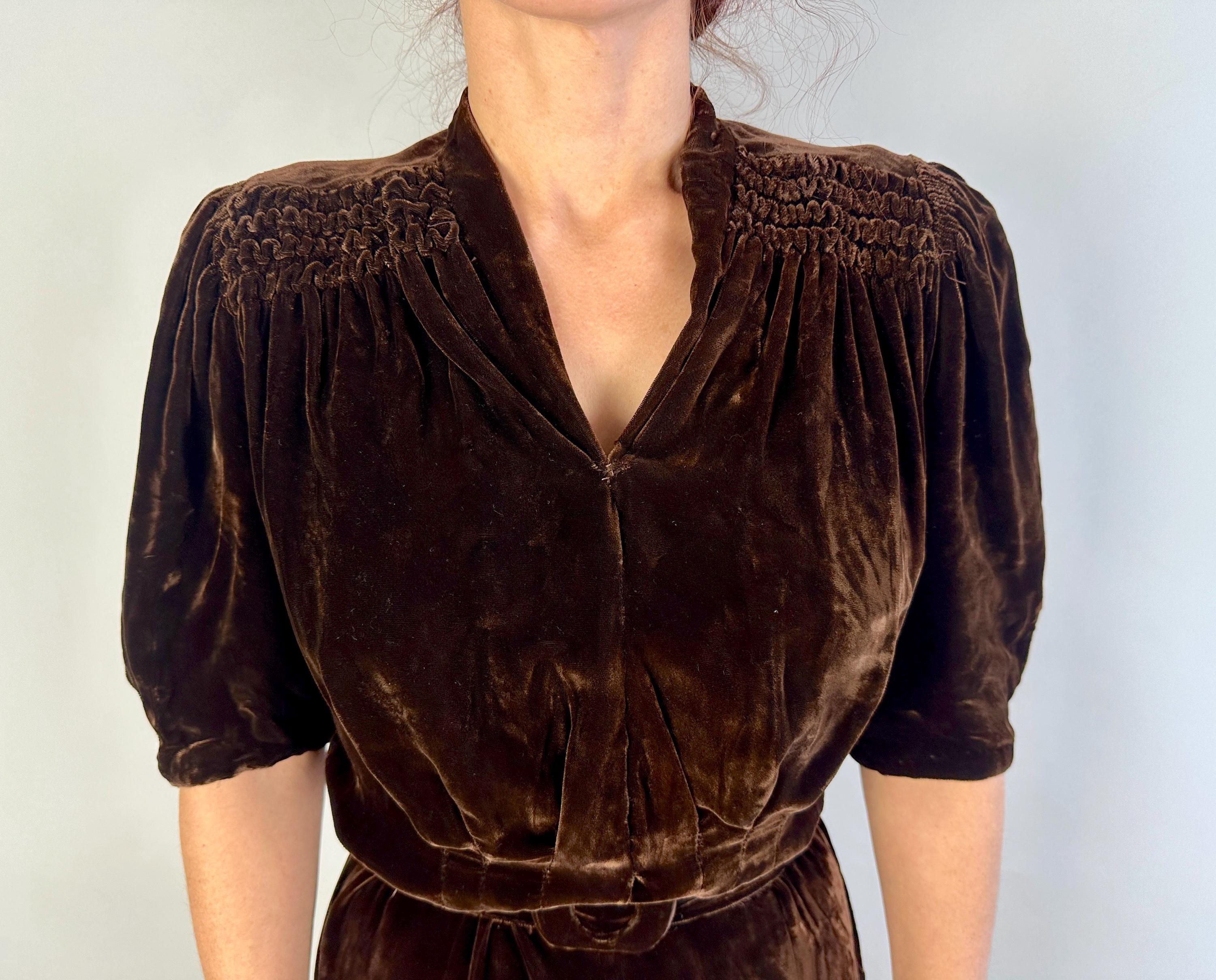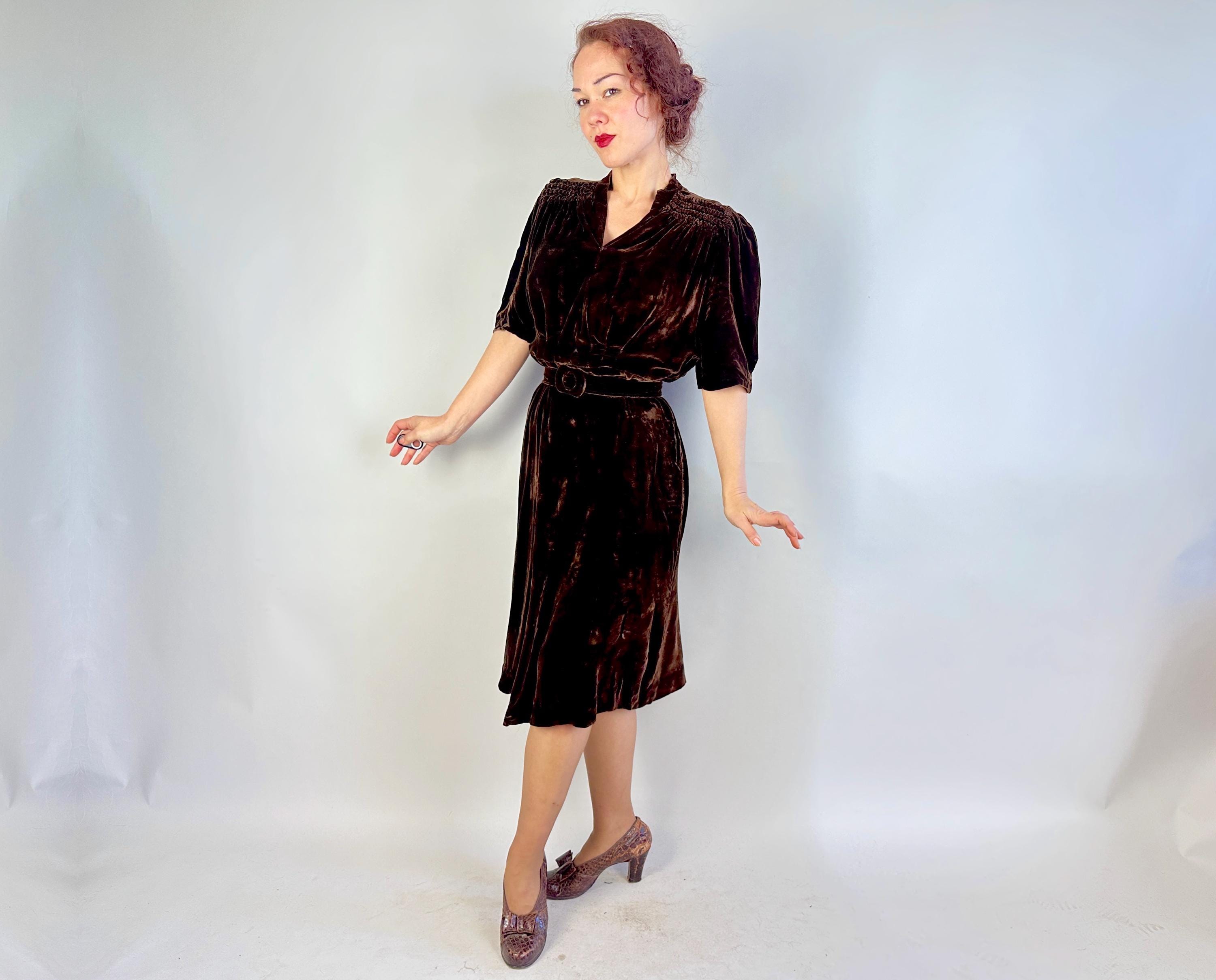Just like an expensive box of fancy chocolates, you'll be a delightful surprise with a touch of decadence in this 1940s dress! The sumptuous silk velvet in dark chocolate brown has a delicious sheen. It features a V-neck flanked by smocking along the shoulder line with a raised wavy detail, inverted dart pleats shaping the bodice as well as on the sleeve cuffs to emphasize the shoulders which are densely gathered. The gored skirt is lightly flared and a self fabric slide belt cinches the waist. Metal "Talon" zipper fastens on the side. This dress is in great vintage condition, with no holes, stains, or odors to note.