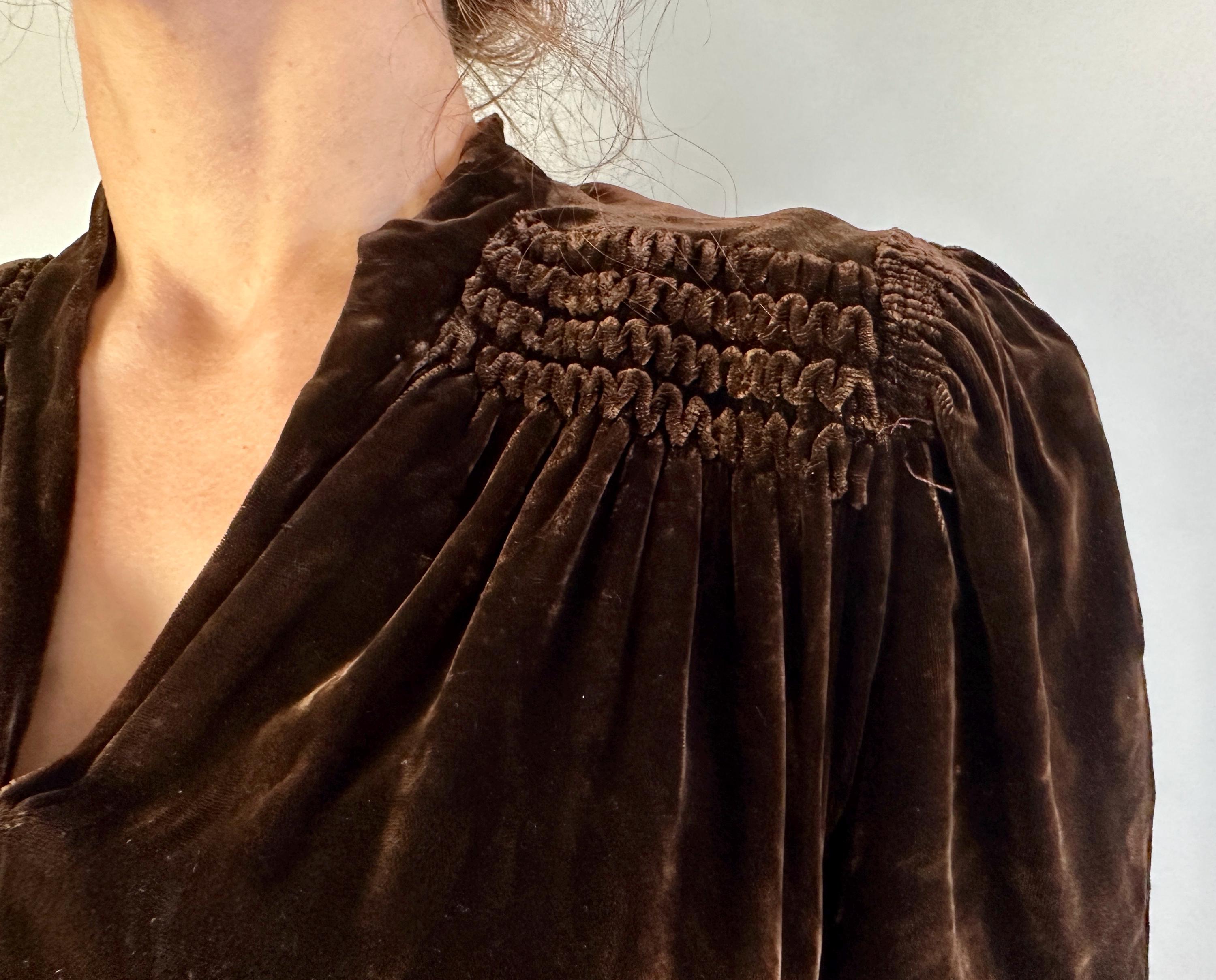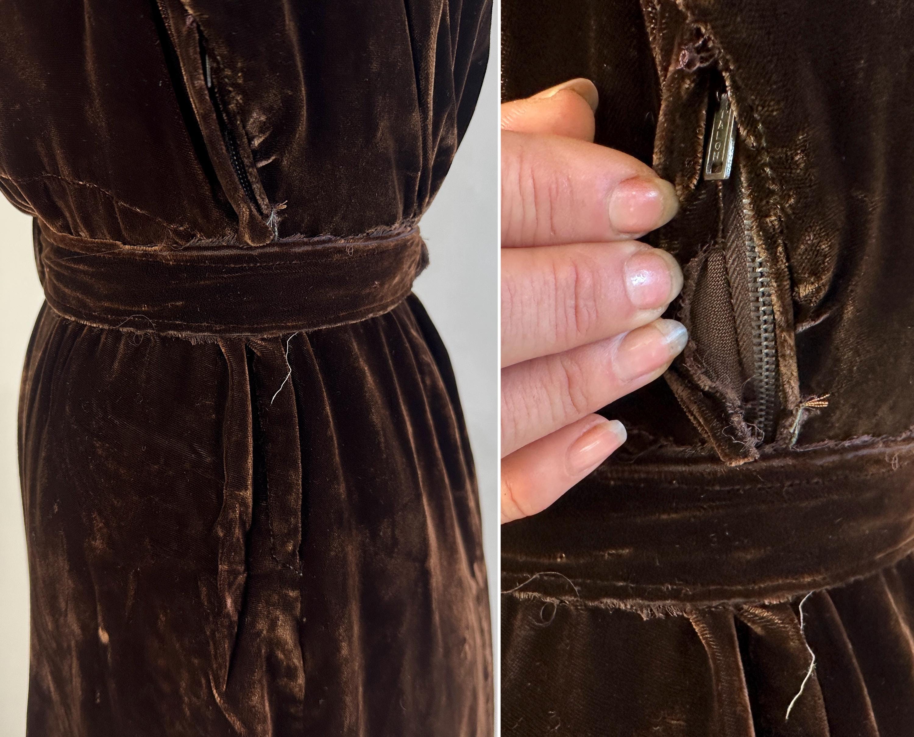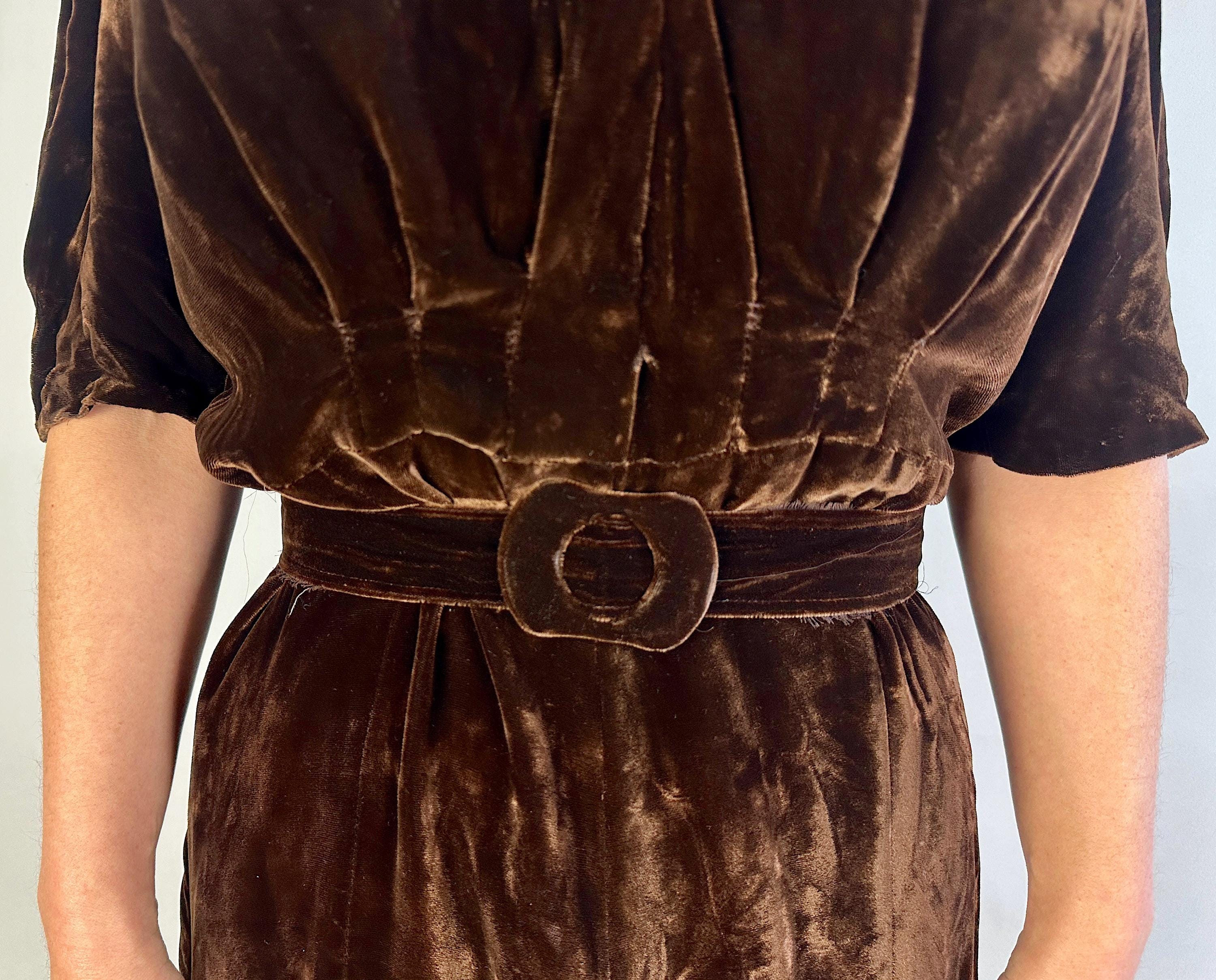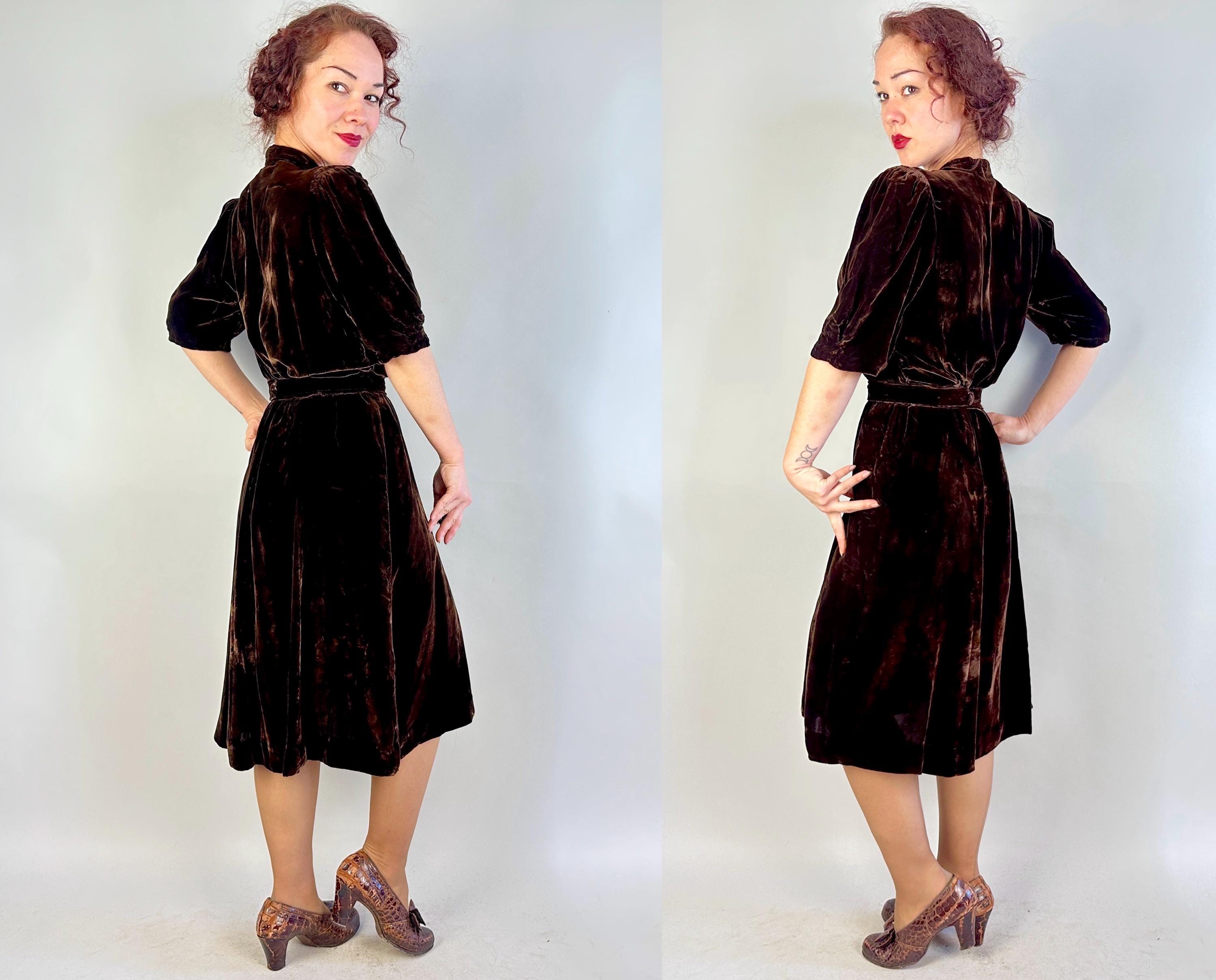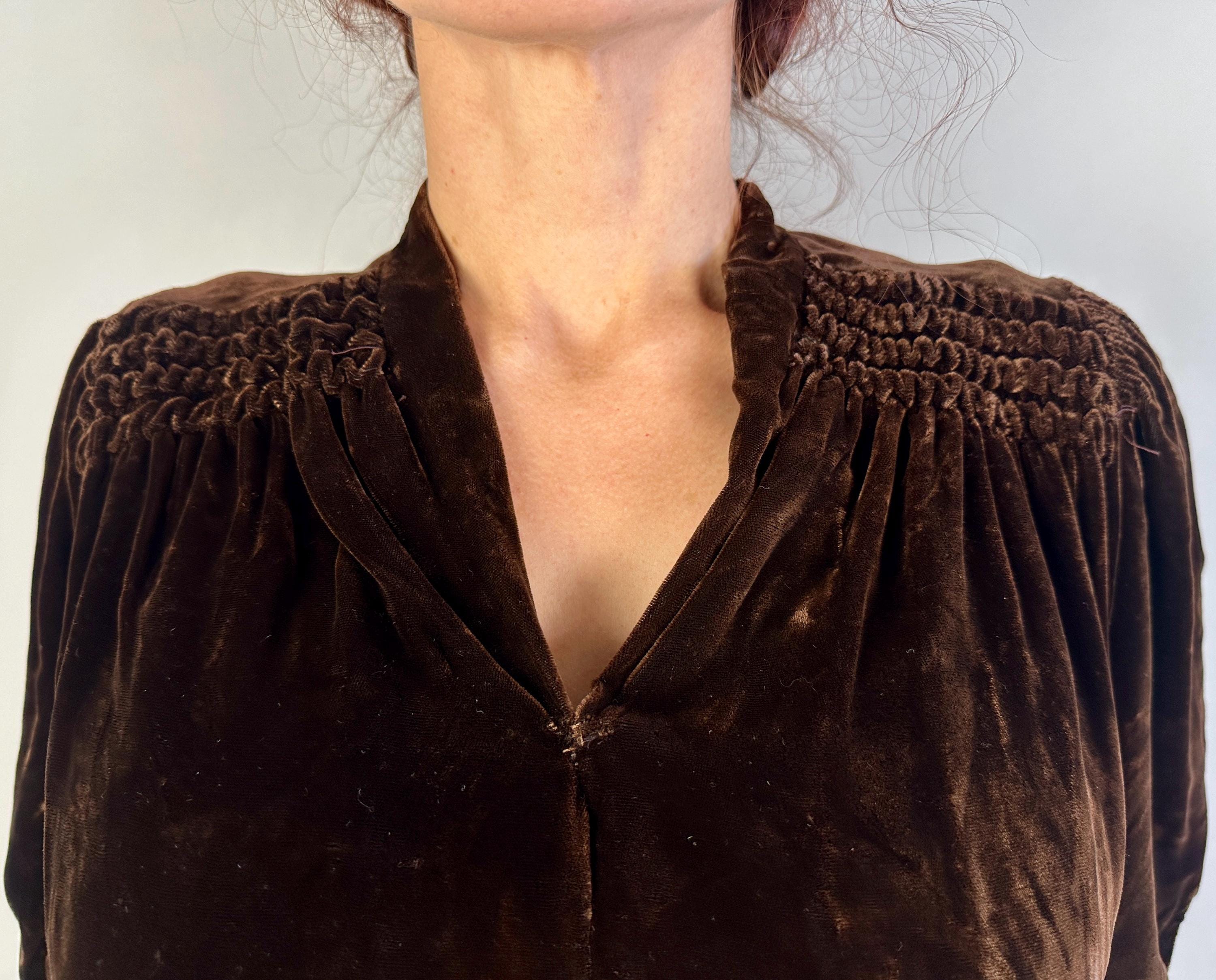 Just like an expensive box of fancy chocolates, you'll be a delightful surprise with a touch of decadence in this 1940s dress! The sumptuous silk velvet in dark chocolate brown has a delicious sheen. It features a V-neck flanked by smocking along the shoulder line with a raised wavy detail, inverted dart pleats shaping the bodice as well as on the sleeve cuffs to emphasize the shoulders which are densely gathered. The gored skirt is lightly flared and a self fabric slide belt cinches the waist. Metal "Talon" zipper fastens on the side. This dress is in great vintage condition, with no holes, stains, or odors to note.