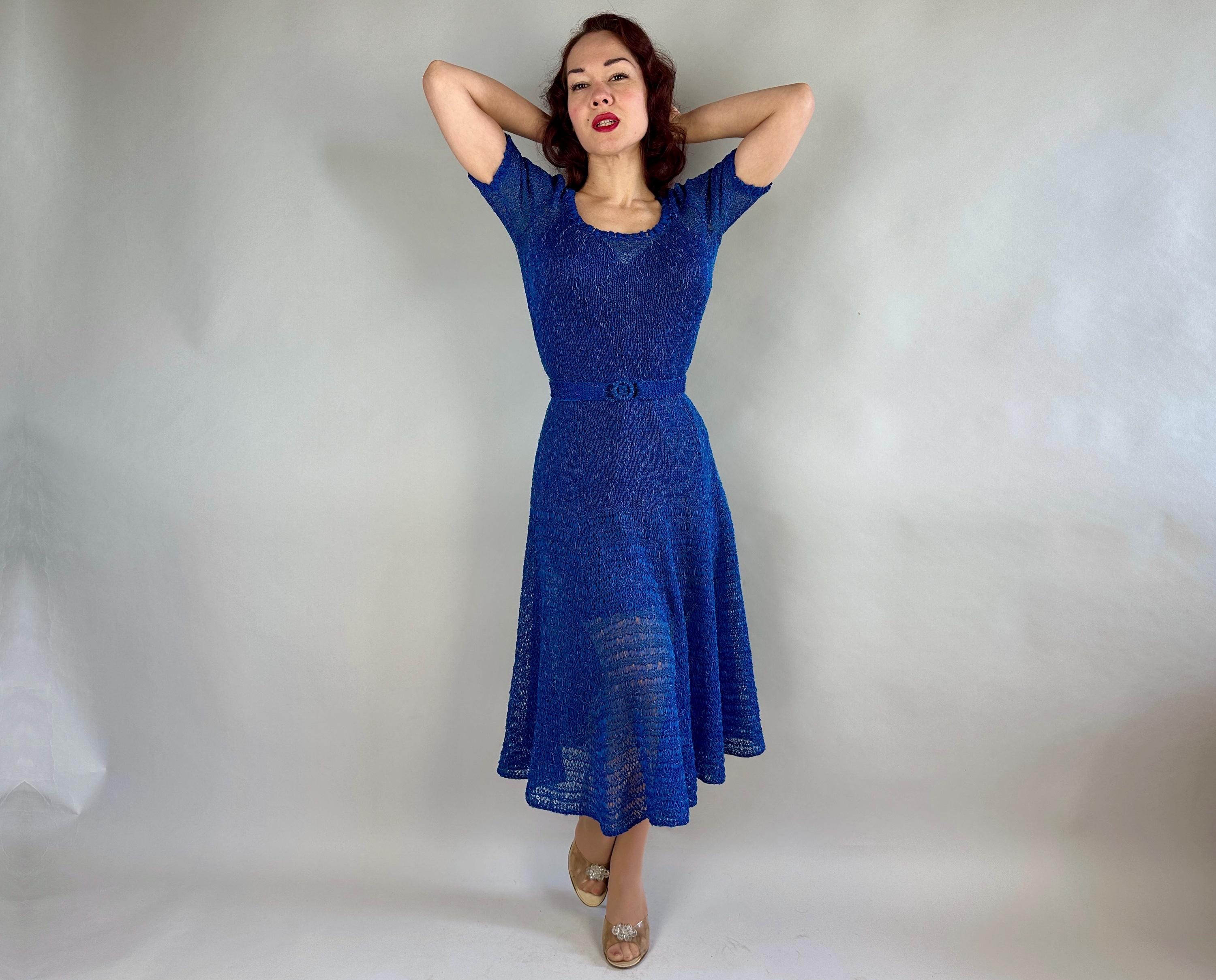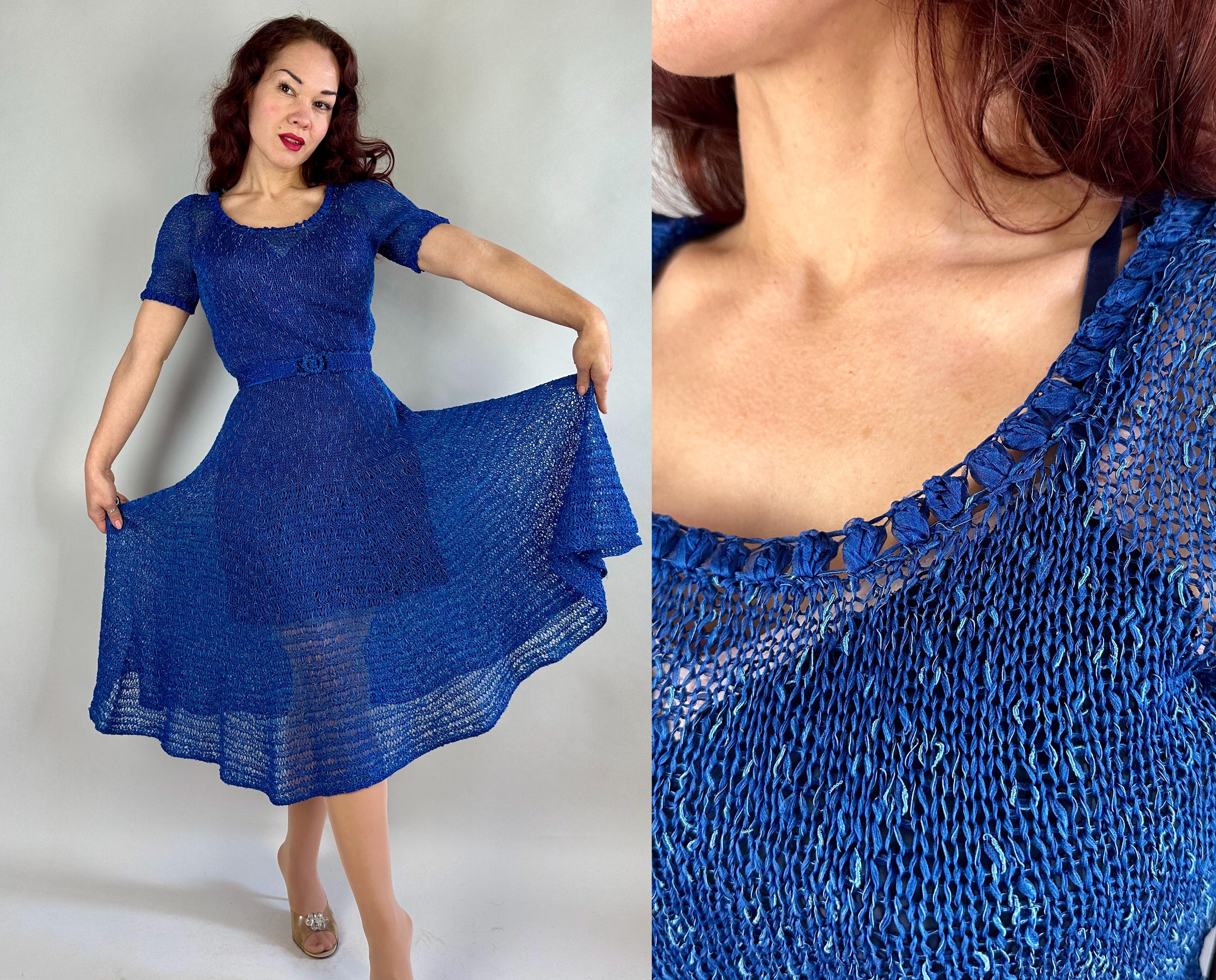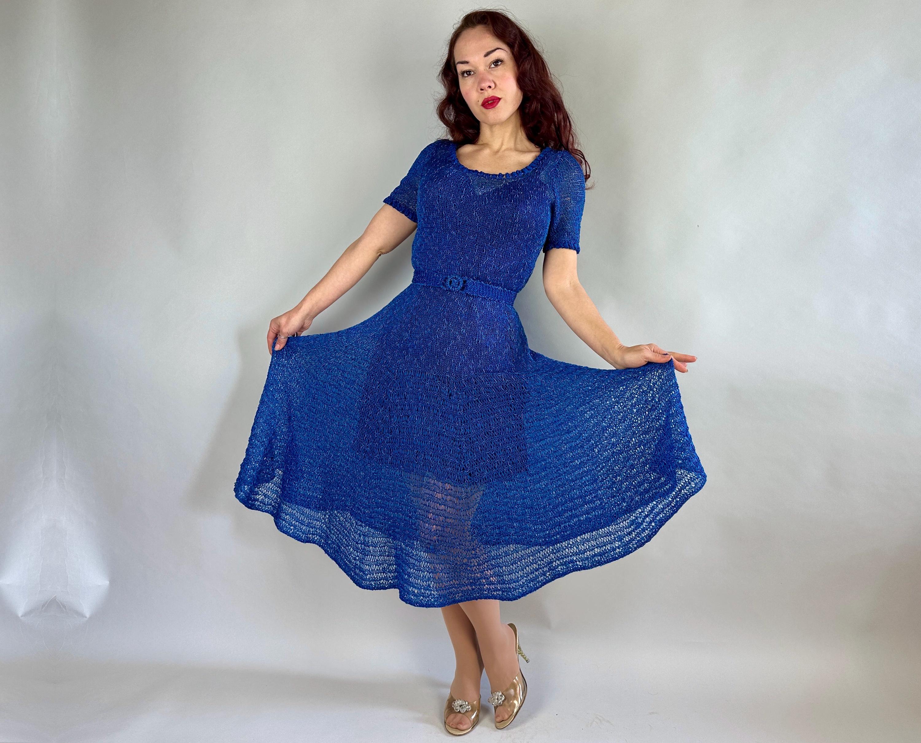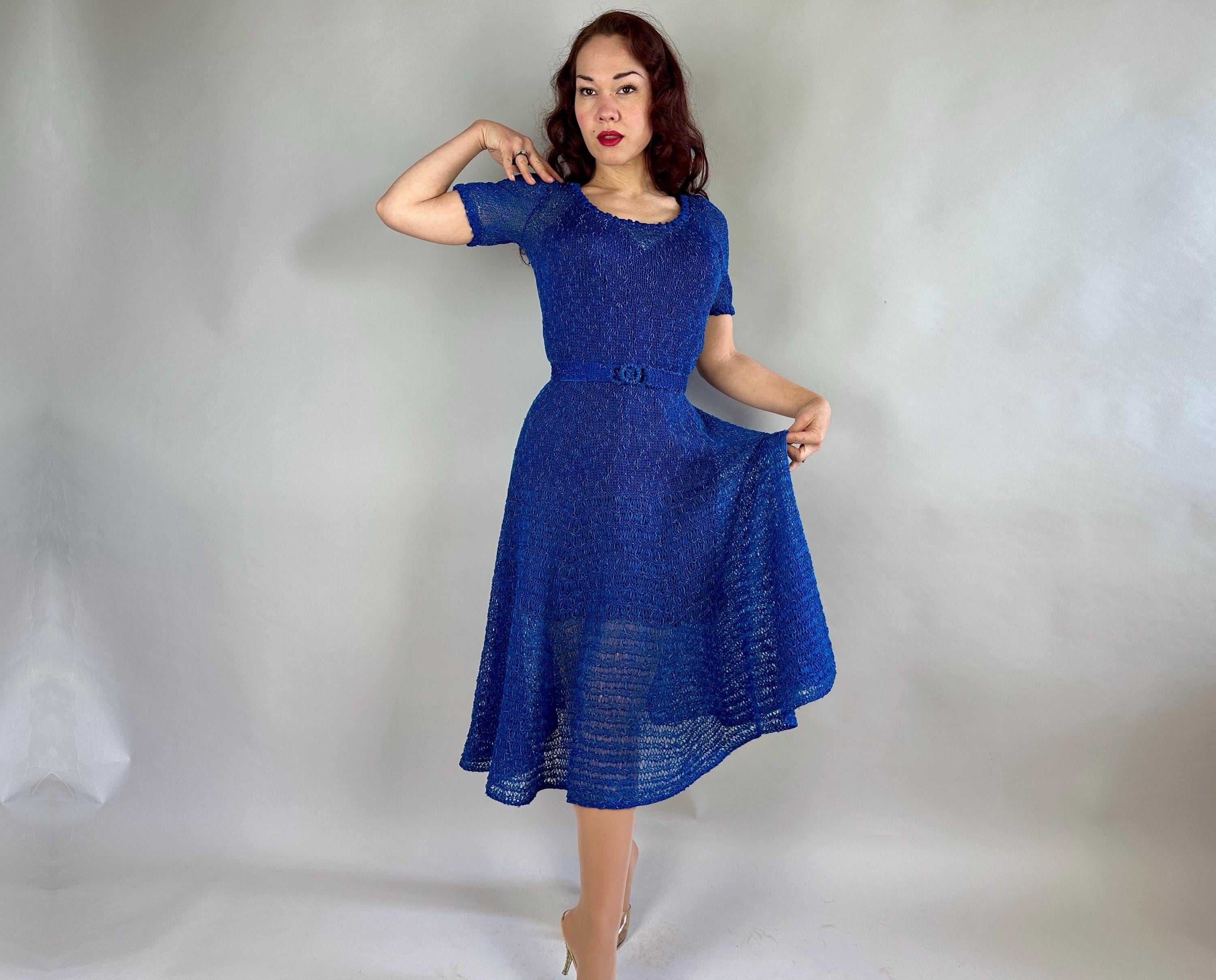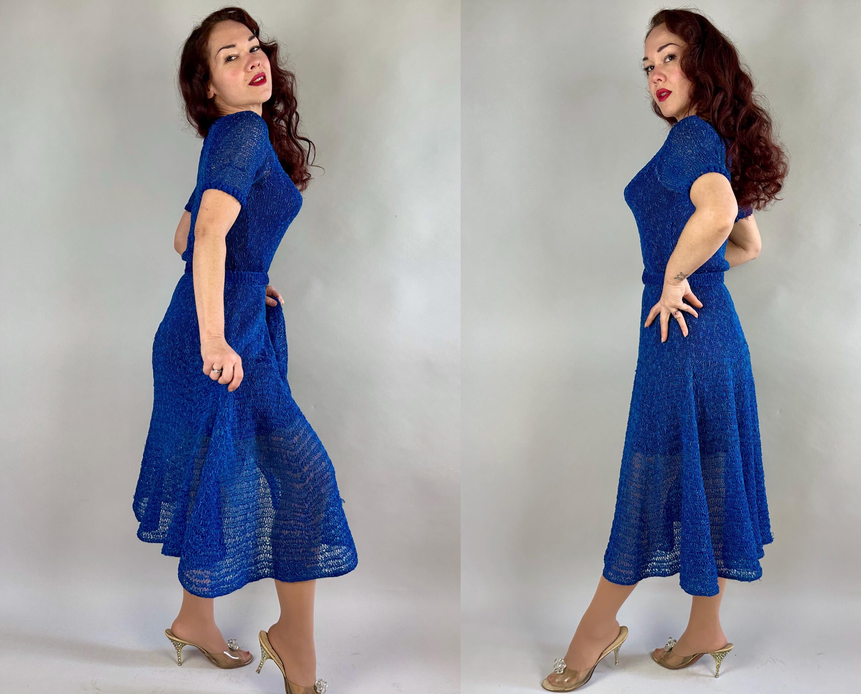 You won't be found standing alone when you go out in this striking 1940s knit dress! Knit with a thin ribbon of cobalt and flecked with strands of sky blue satin cord, the stitch pattern creates horizontal stripes with openwork for a sheer look that allows for colour play when choosing your slip. With lots of stretch it is very curve hugging up top while the skirt has a full flair perfect for twirling. Wide scoop neckline and a matching belt with triple hoop buckle are lovely touches. This dress is in great vintage condition, with no holes, stains, or odors to note. Please note, slip is model's own.