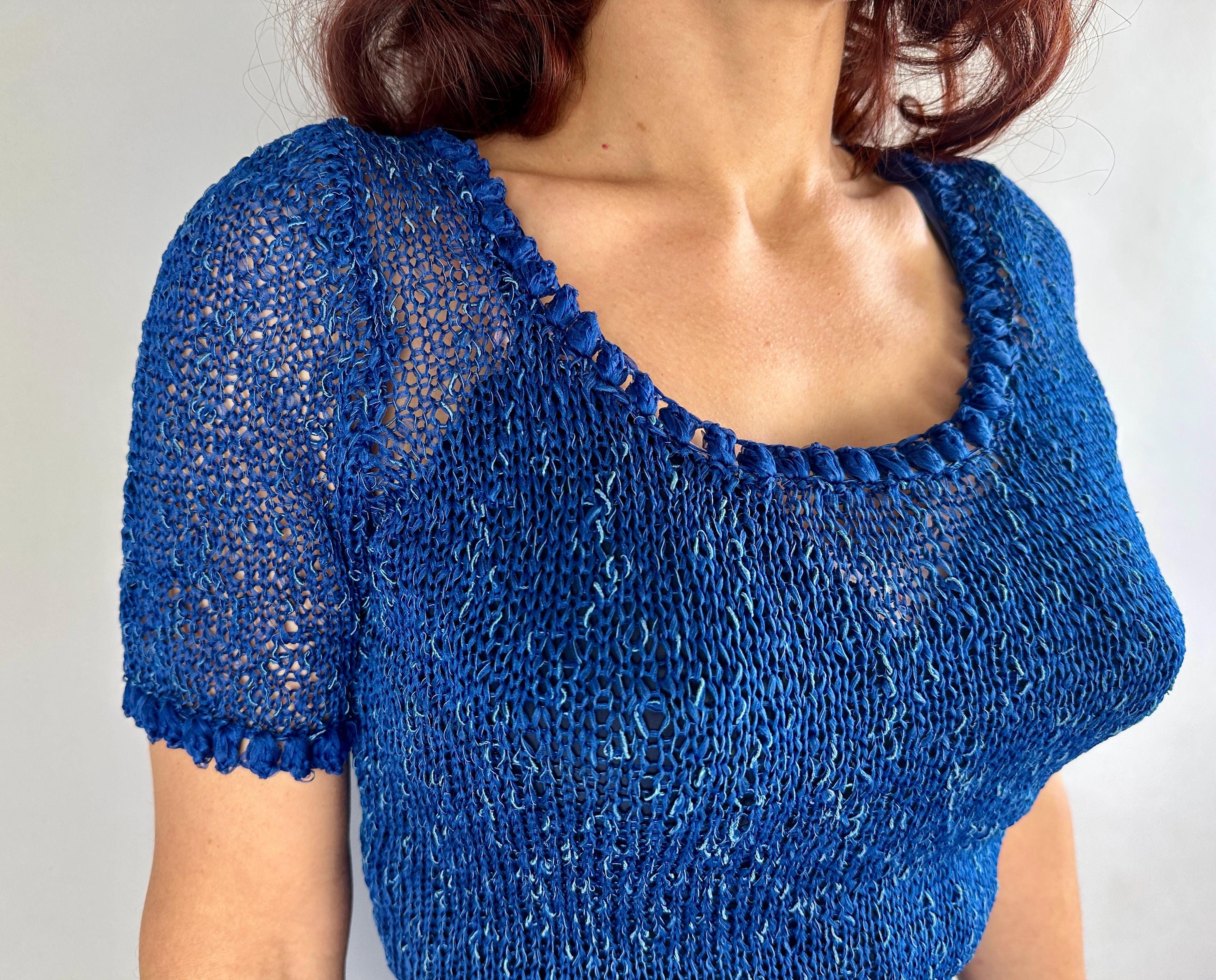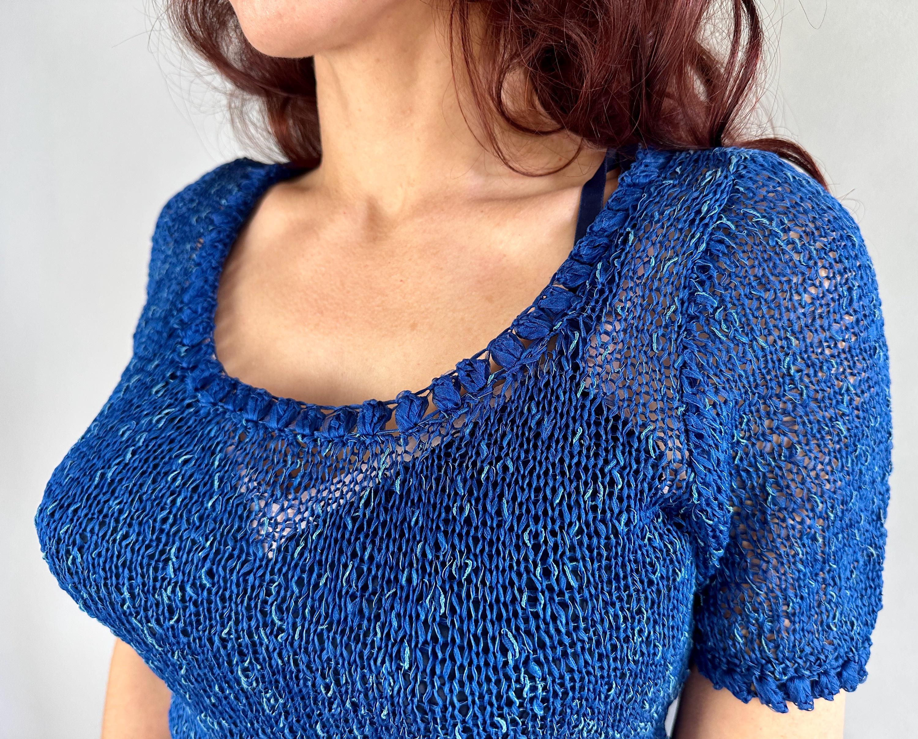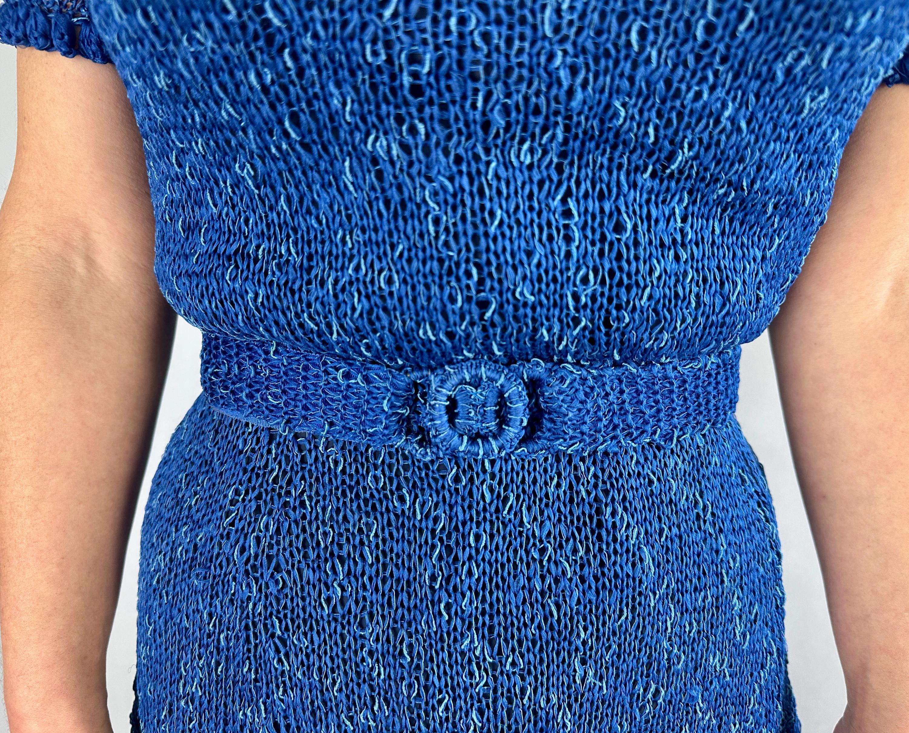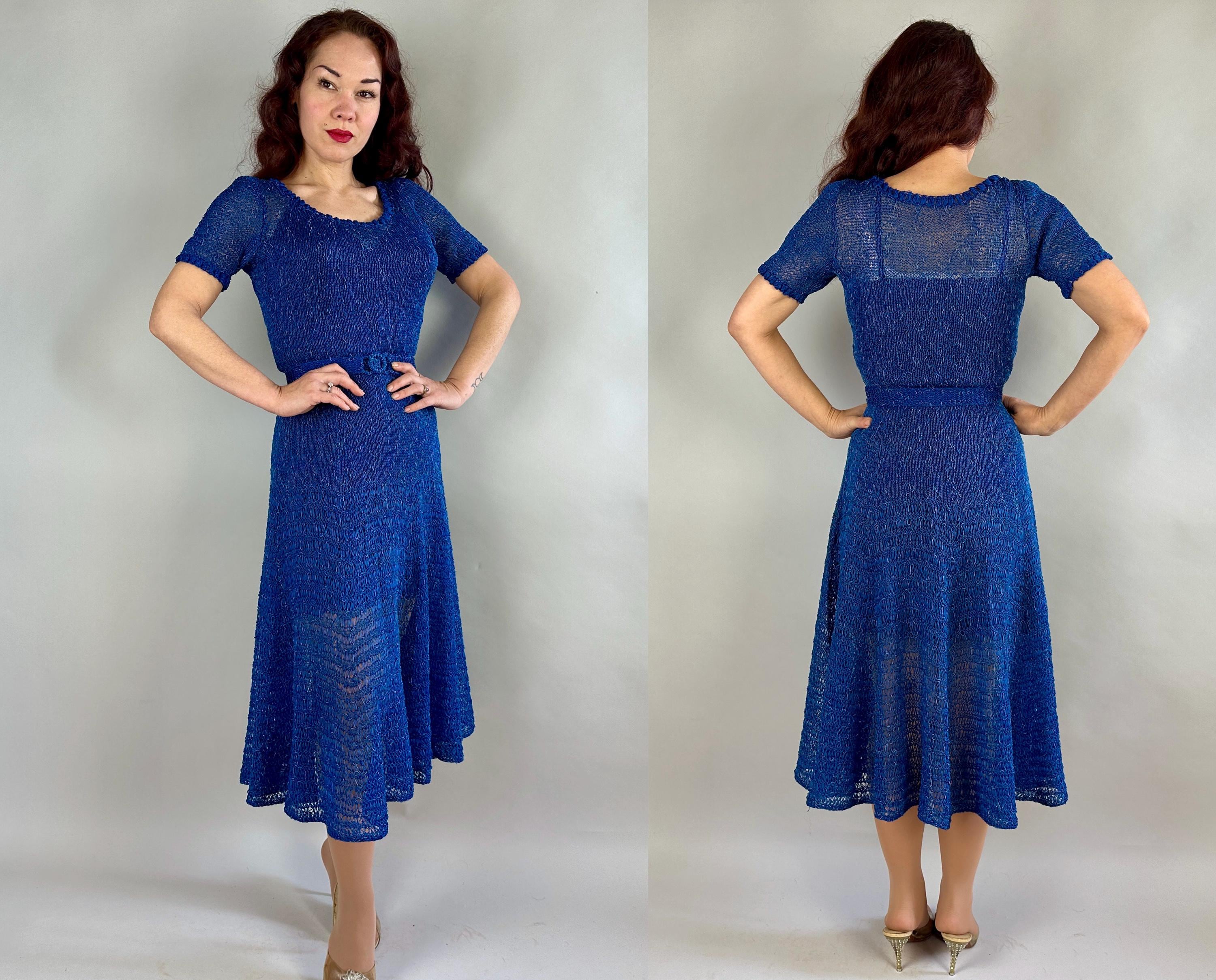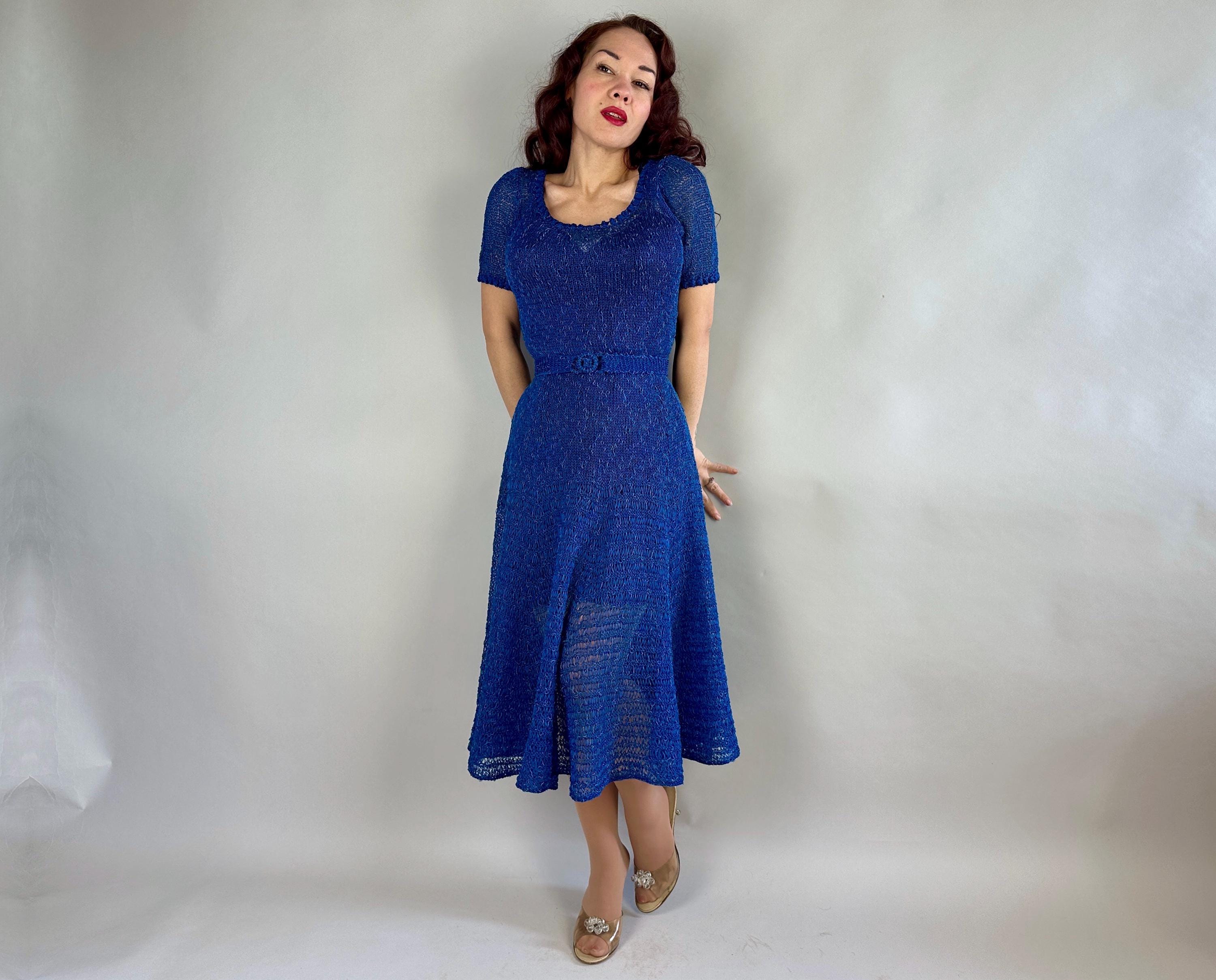 You won't be found standing alone when you go out in this striking 1940s knit dress! Knit with a thin ribbon of cobalt and flecked with strands of sky blue satin cord, the stitch pattern creates horizontal stripes with openwork for a sheer look that allows for colour play when choosing your slip. With lots of stretch it is very curve hugging up top while the skirt has a full flair perfect for twirling. Wide scoop neckline and a matching belt with triple hoop buckle are lovely touches. This dress is in great vintage condition, with no holes, stains, or odors to note. Please note, slip is model's own.
