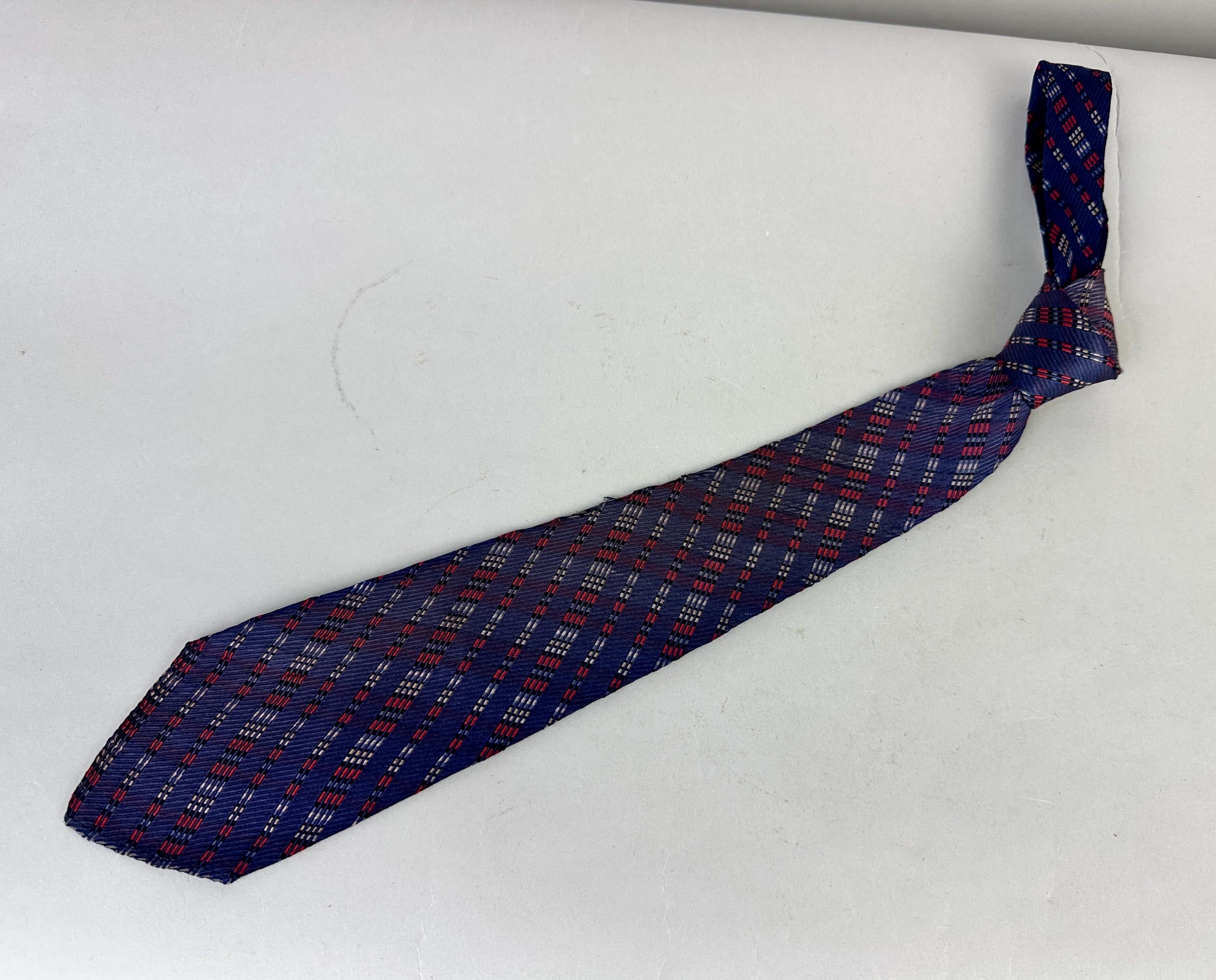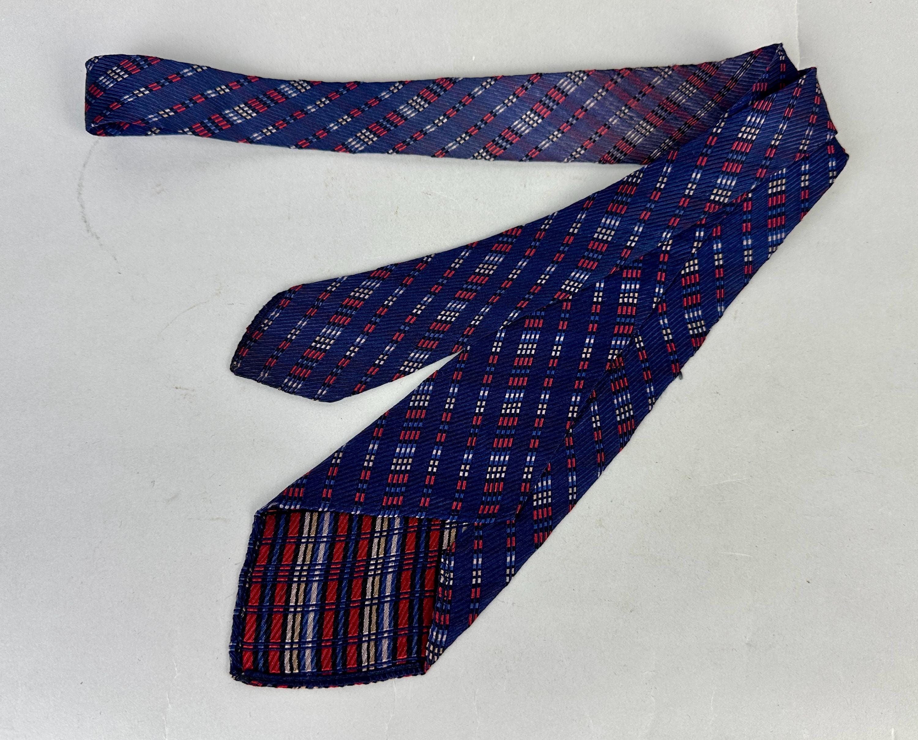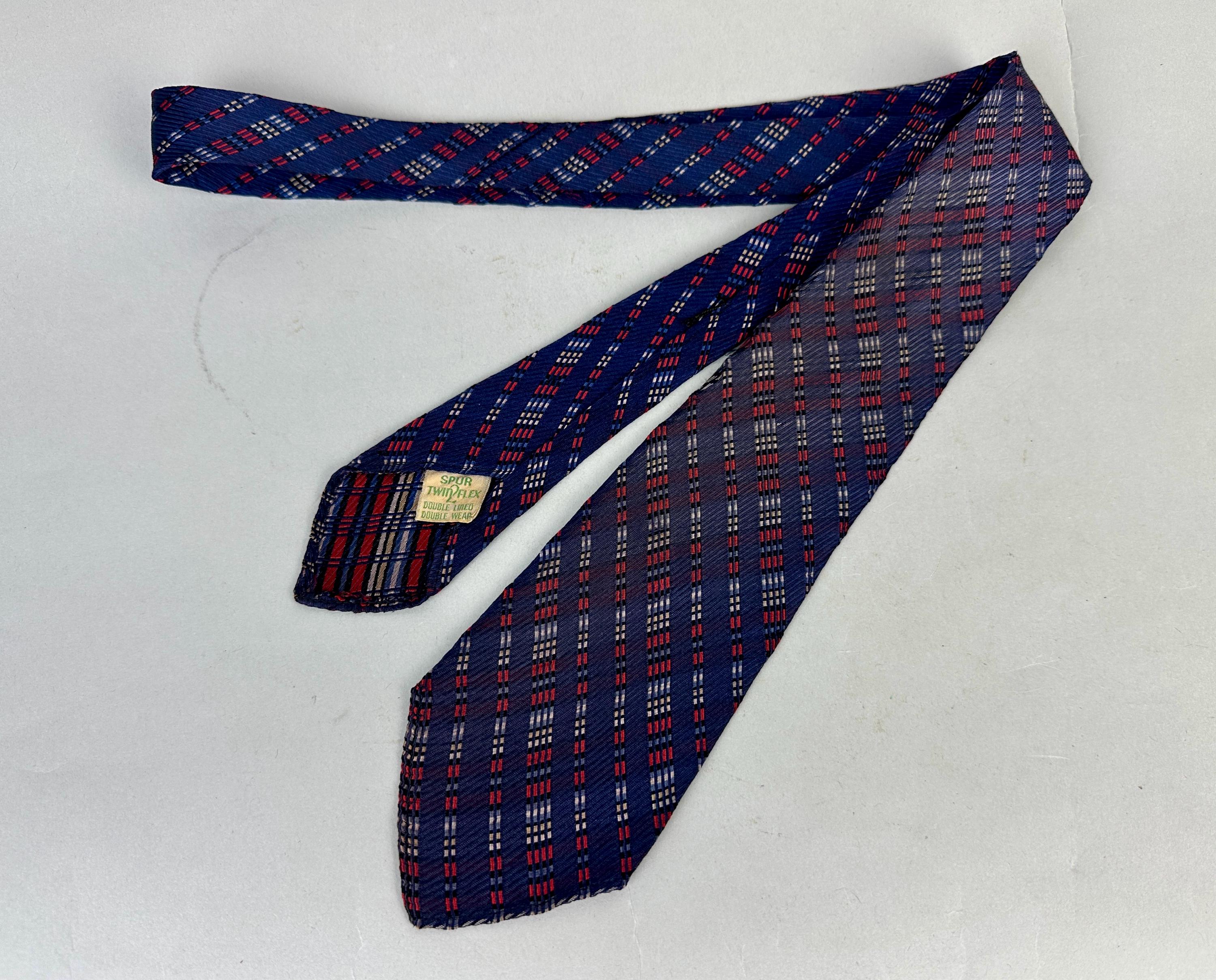 For the graphic designer in you, this 1930s necktie will line you up for success! This silk tie has a midnight blue background with diagonal jacquard stripes in dashes of varying lengths woven in scarlet, black, white, and periwinkle. Those stripes are mirrored on the opposite diagonal in a very subtle shadow plaid. Labeled "Spur Twin Flex Double Lined Double Wear", though unlined we believe the label is referring to the interfacing. Pairs well with a wide variety of Art Deco and Mid-Century suit colors and fabric types. This tie is in great vintage condition with no flaws found!