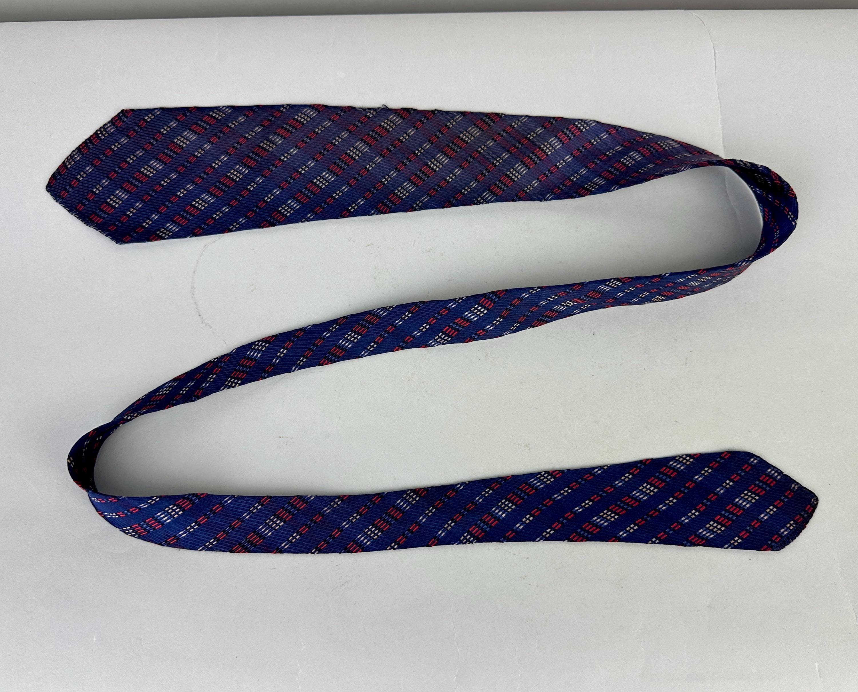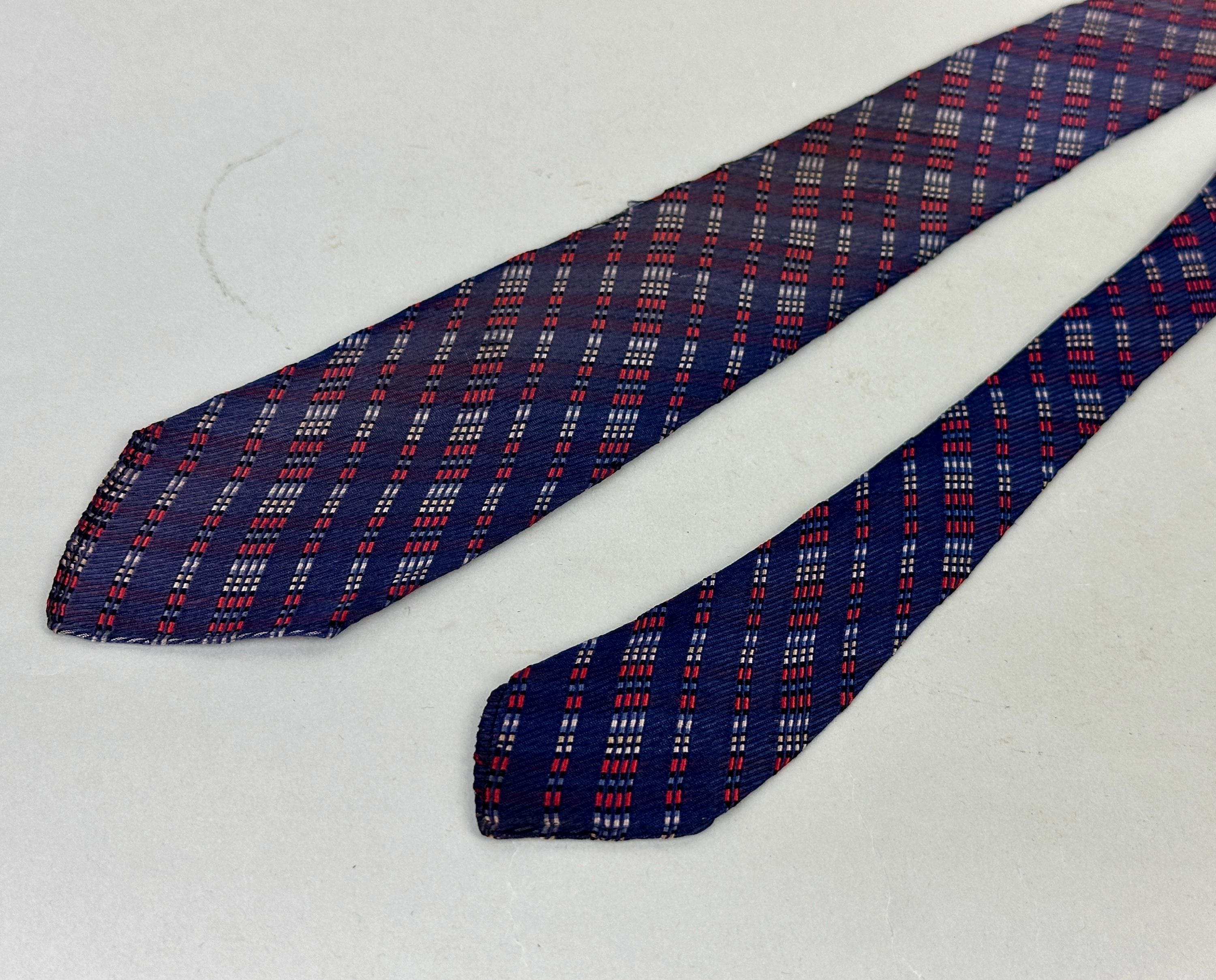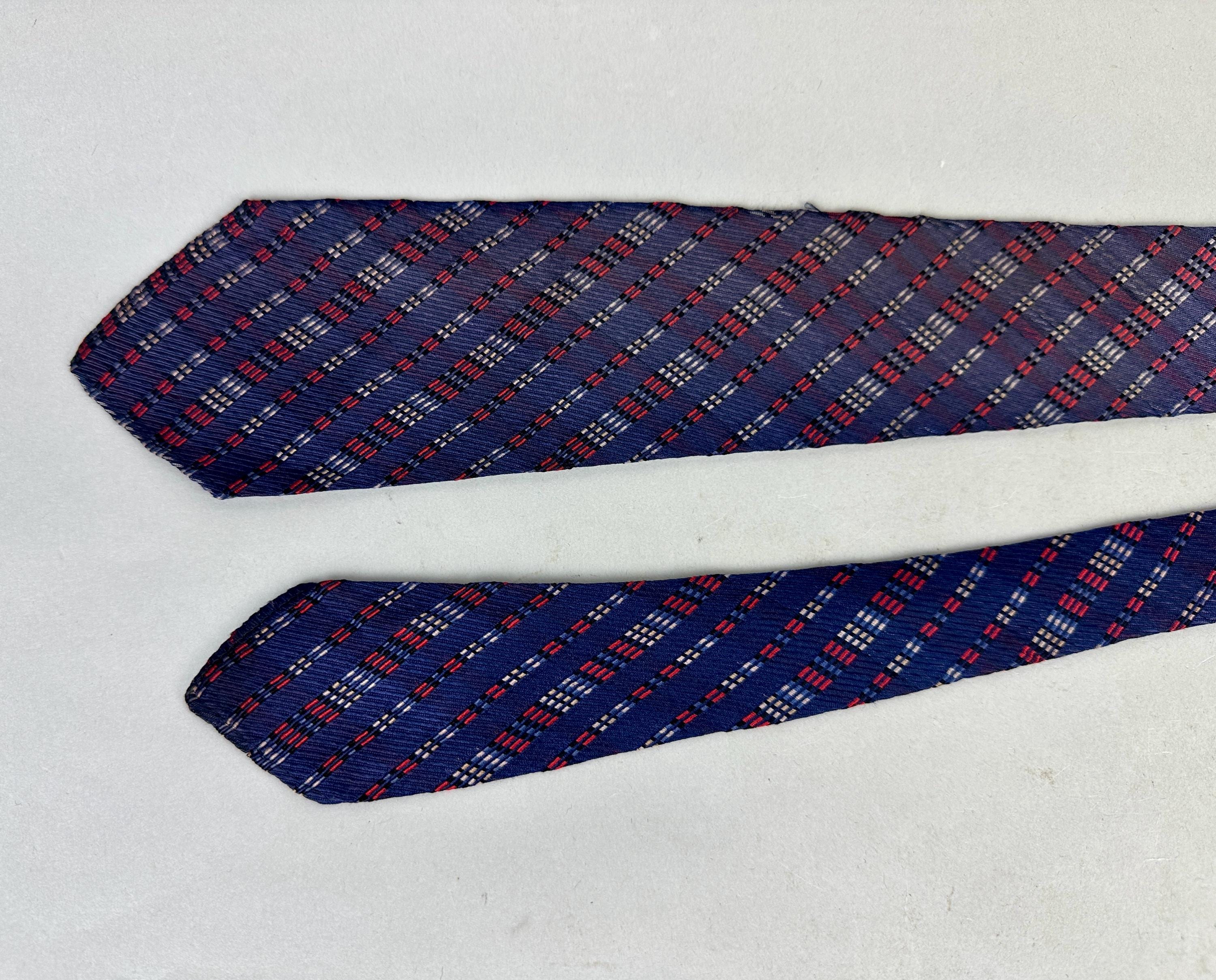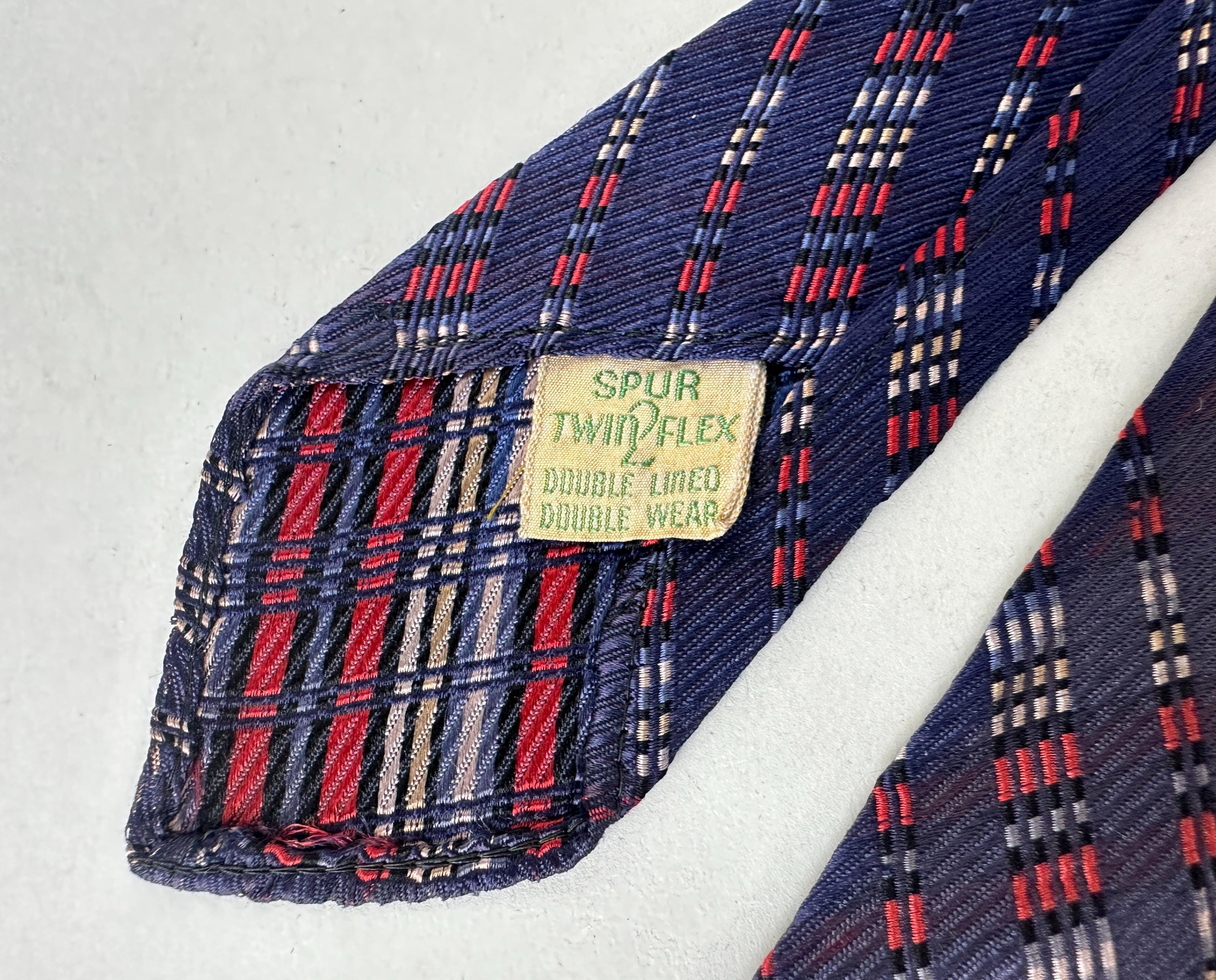 For the graphic designer in you, this 1930s necktie will line you up for success! This silk tie has a midnight blue background with diagonal jacquard stripes in dashes of varying lengths woven in scarlet, black, white, and periwinkle. Those stripes are mirrored on the opposite diagonal in a very subtle shadow plaid. Labeled "Spur Twin Flex Double Lined Double Wear", though unlined we believe the label is referring to the interfacing. Pairs well with a wide variety of Art Deco and Mid-Century suit colors and fabric types. This tie is in great vintage condition with no flaws found!