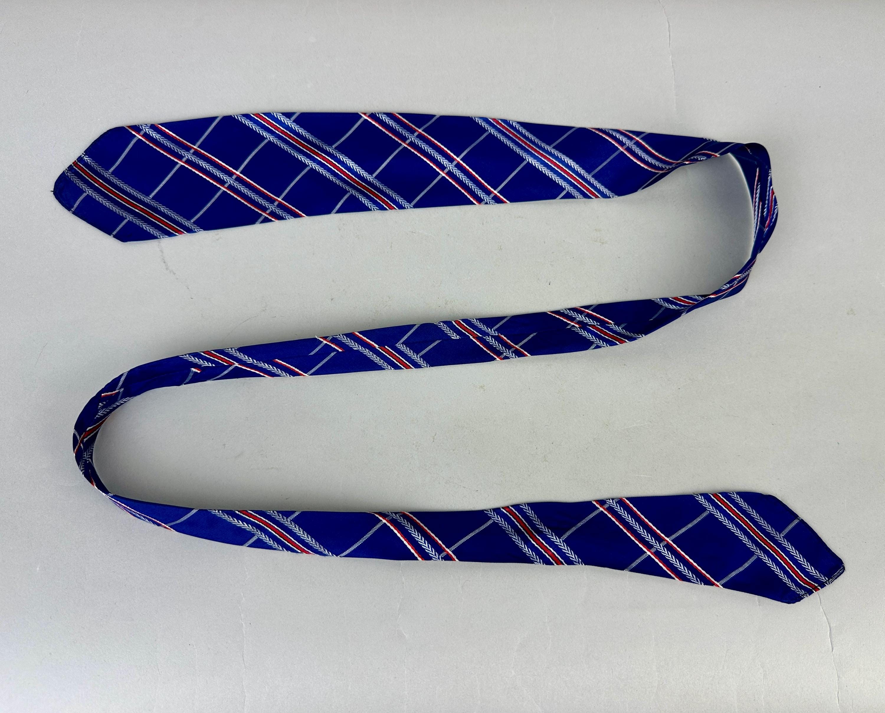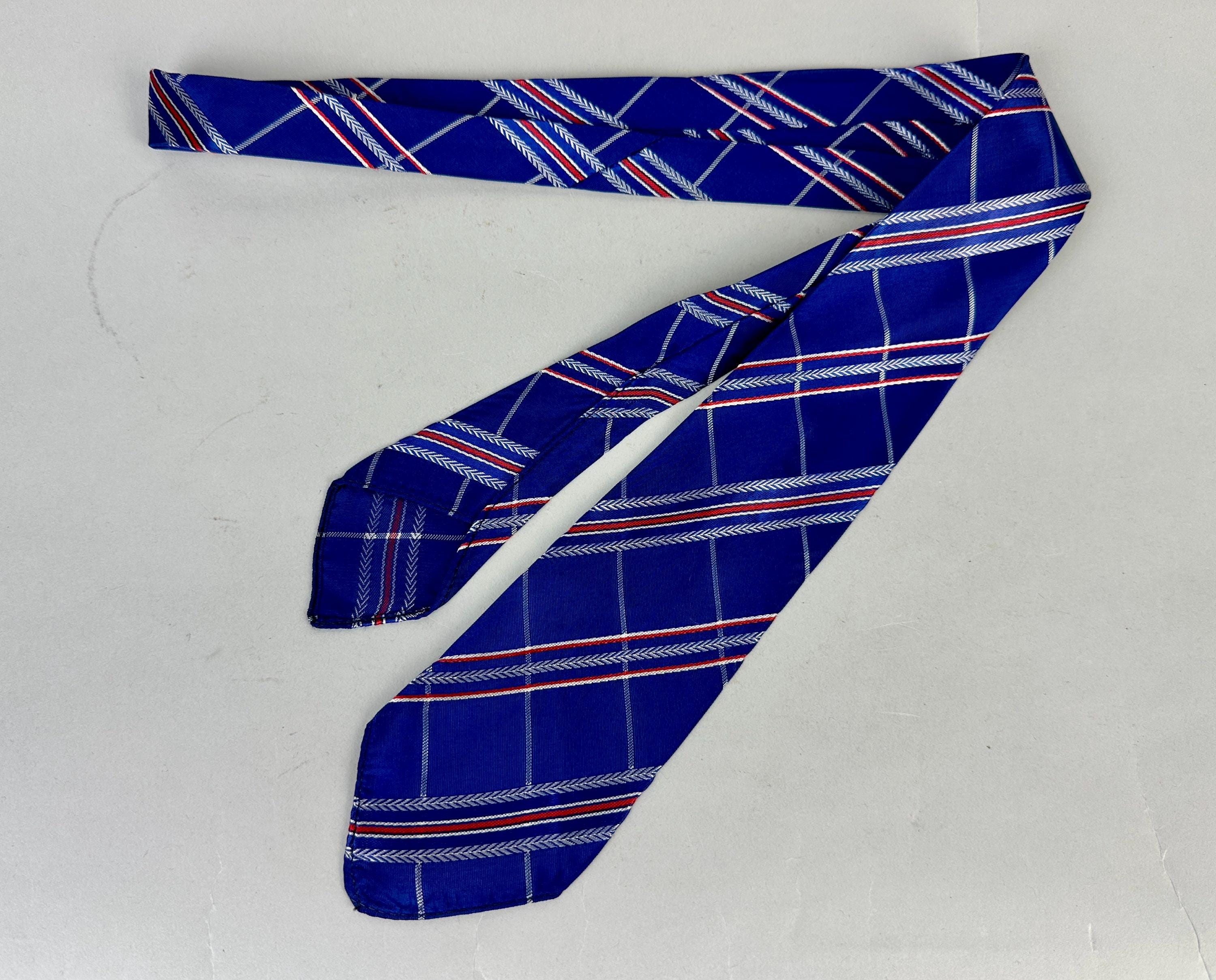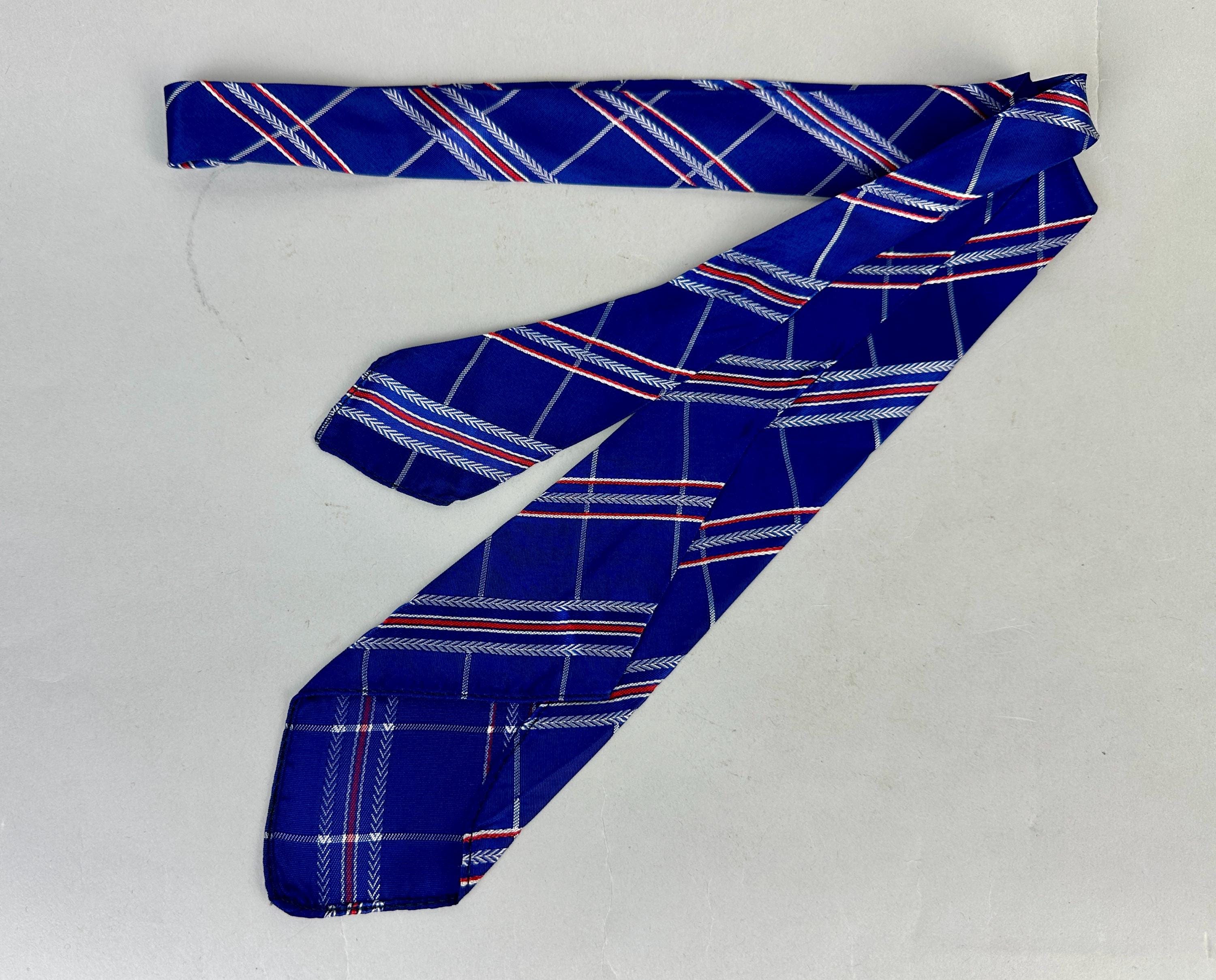 An elevated plaid for a proud event, this 1930s necktie will always be a top choice! Woven mainly in a midnight blue silk and made a plaid with stripes of scarlet and icy white. Some of the white stripes are done in a chevron giving a little fancy accent. Unlined. Pairs well with a wide variety of Art Deco and Mid-Century suit colors and fabric types. This tie is in great vintage condition with no flaws found.