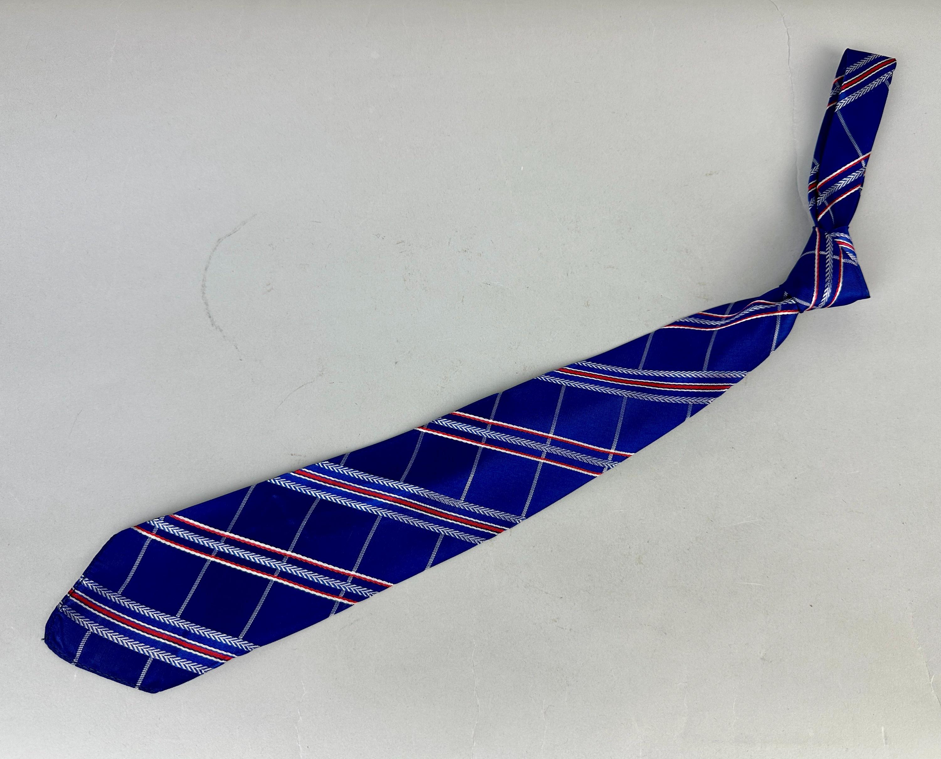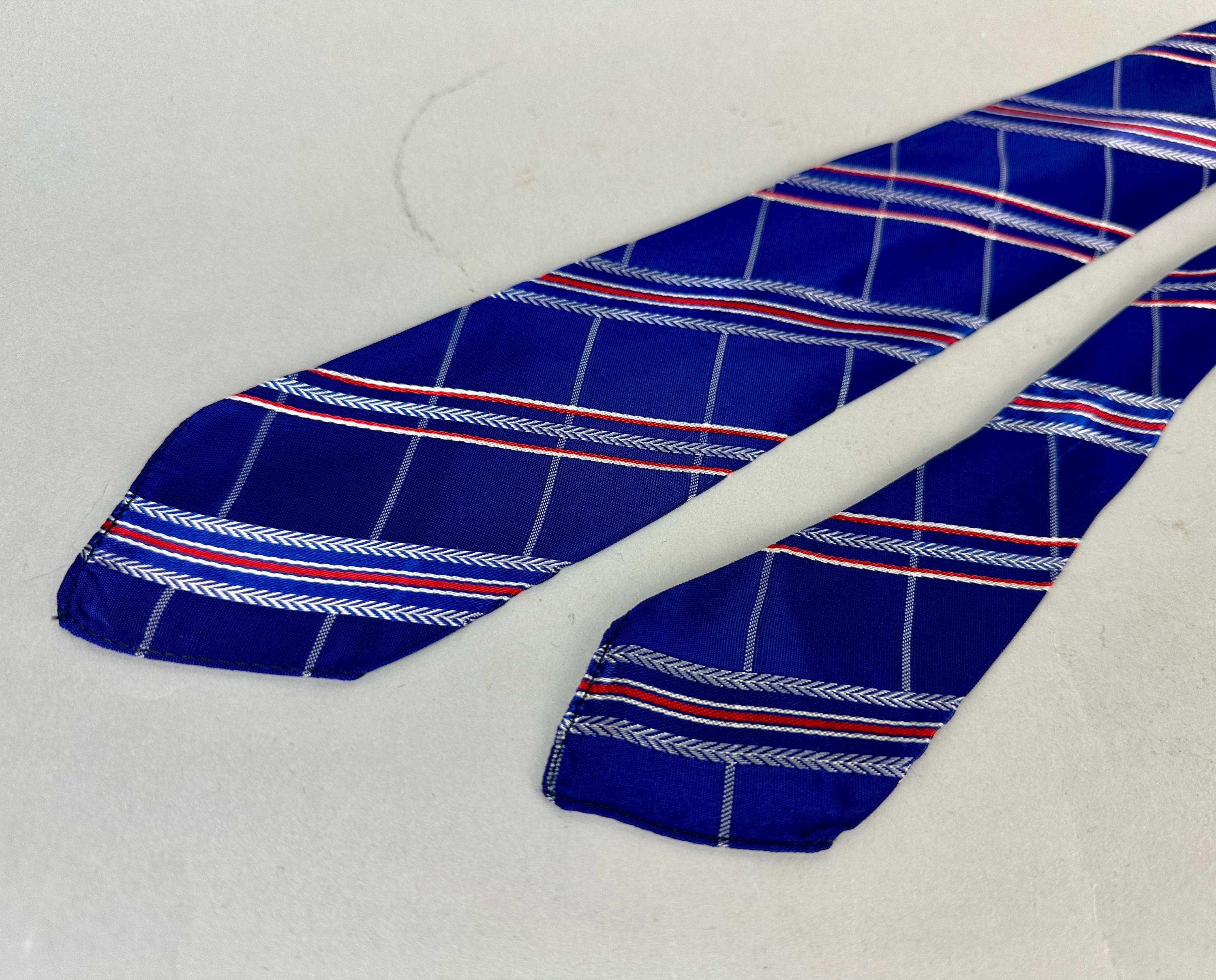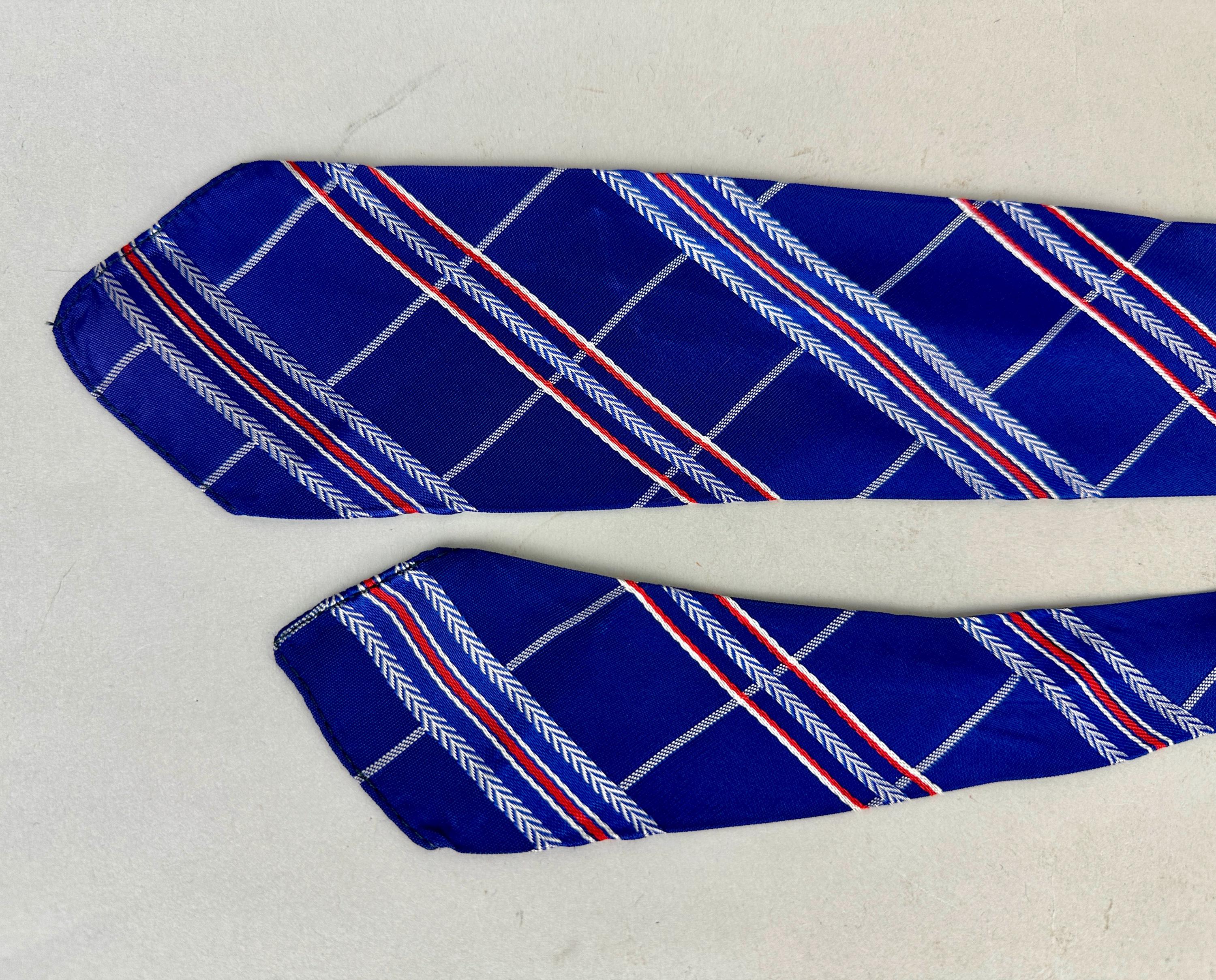 An elevated plaid for a proud event, this 1930s necktie will always be a top choice! Woven mainly in a midnight blue silk and made a plaid with stripes of scarlet and icy white. Some of the white stripes are done in a chevron giving a little fancy accent. Unlined. Pairs well with a wide variety of Art Deco and Mid-Century suit colors and fabric types. This tie is in great vintage condition with no flaws found.