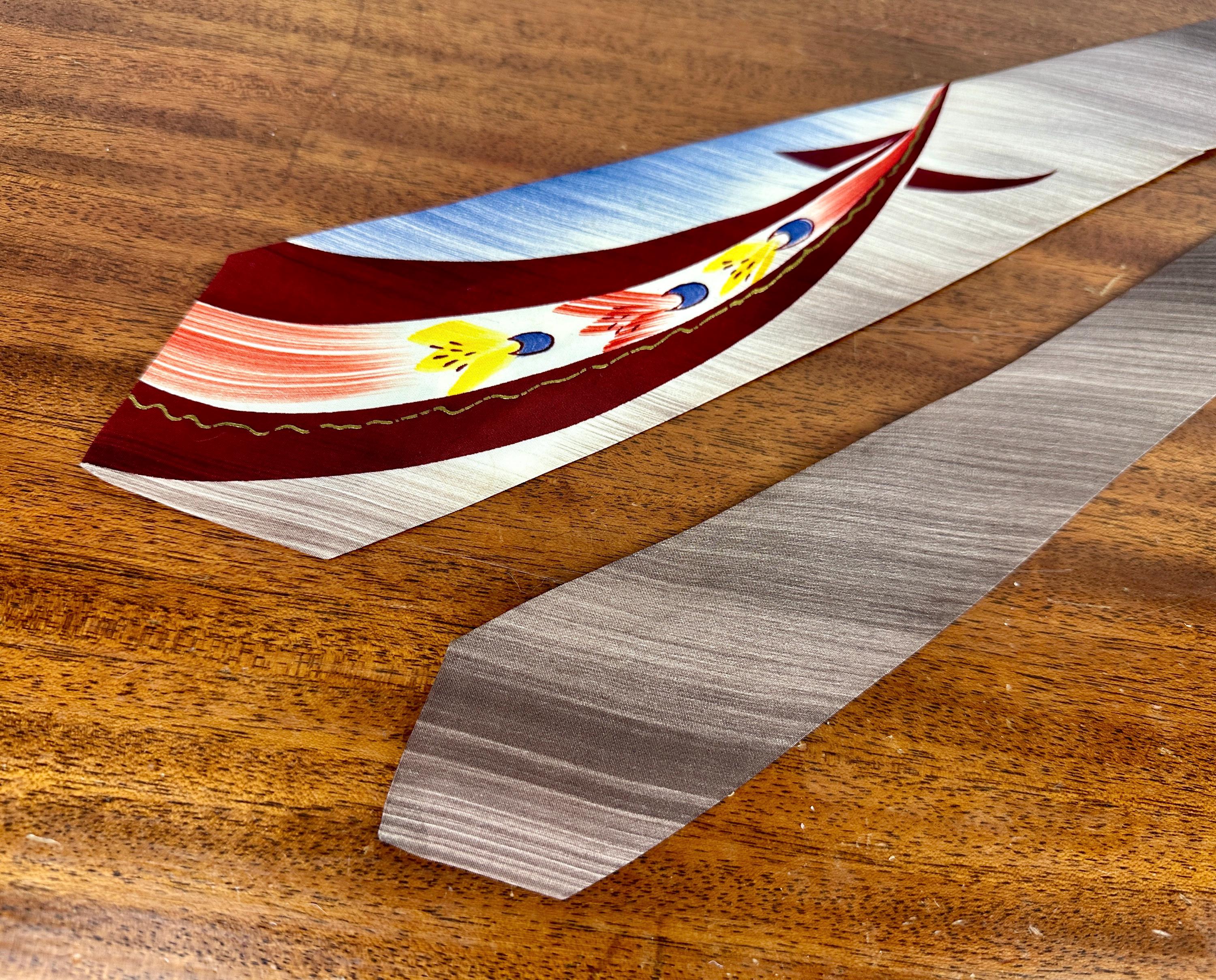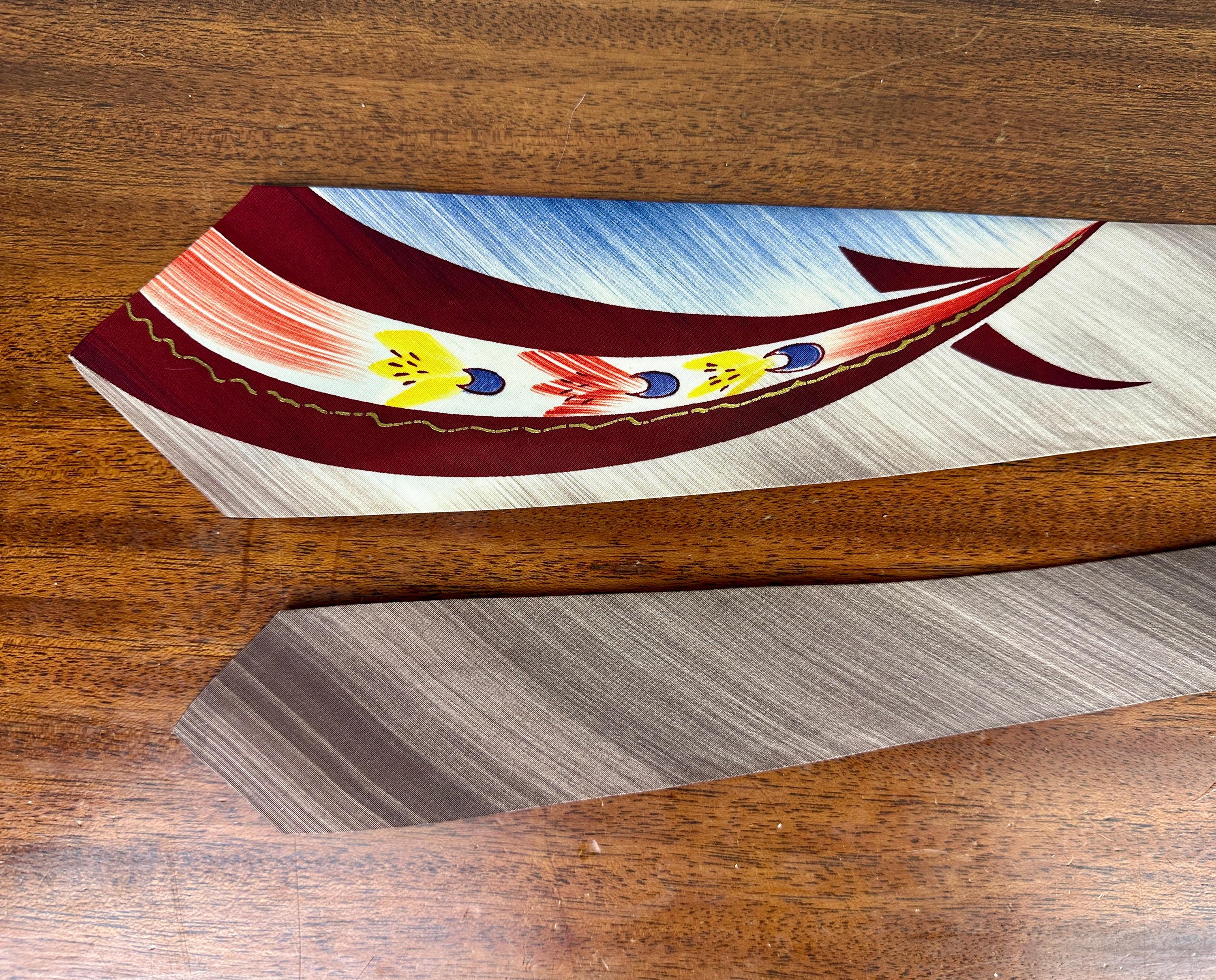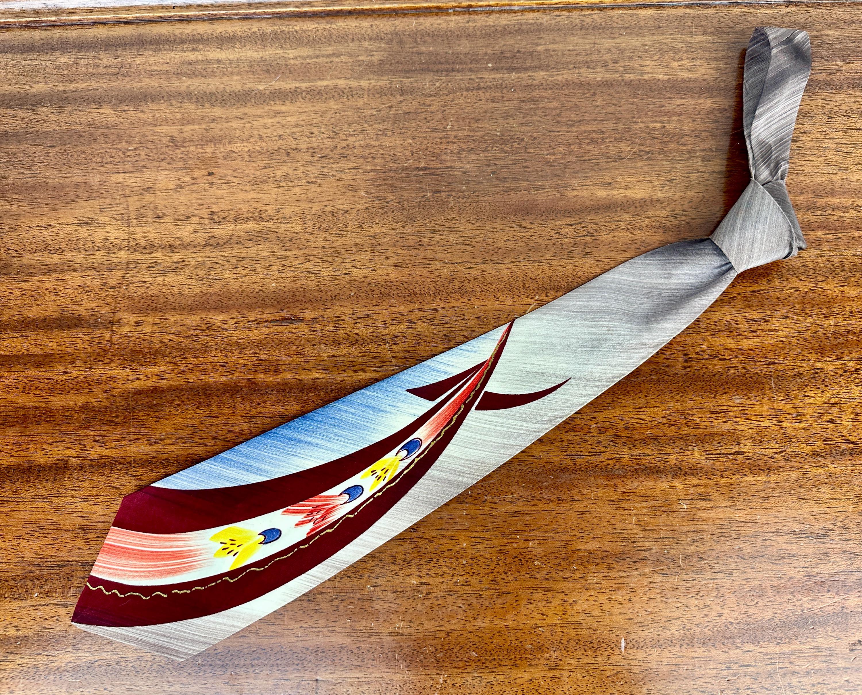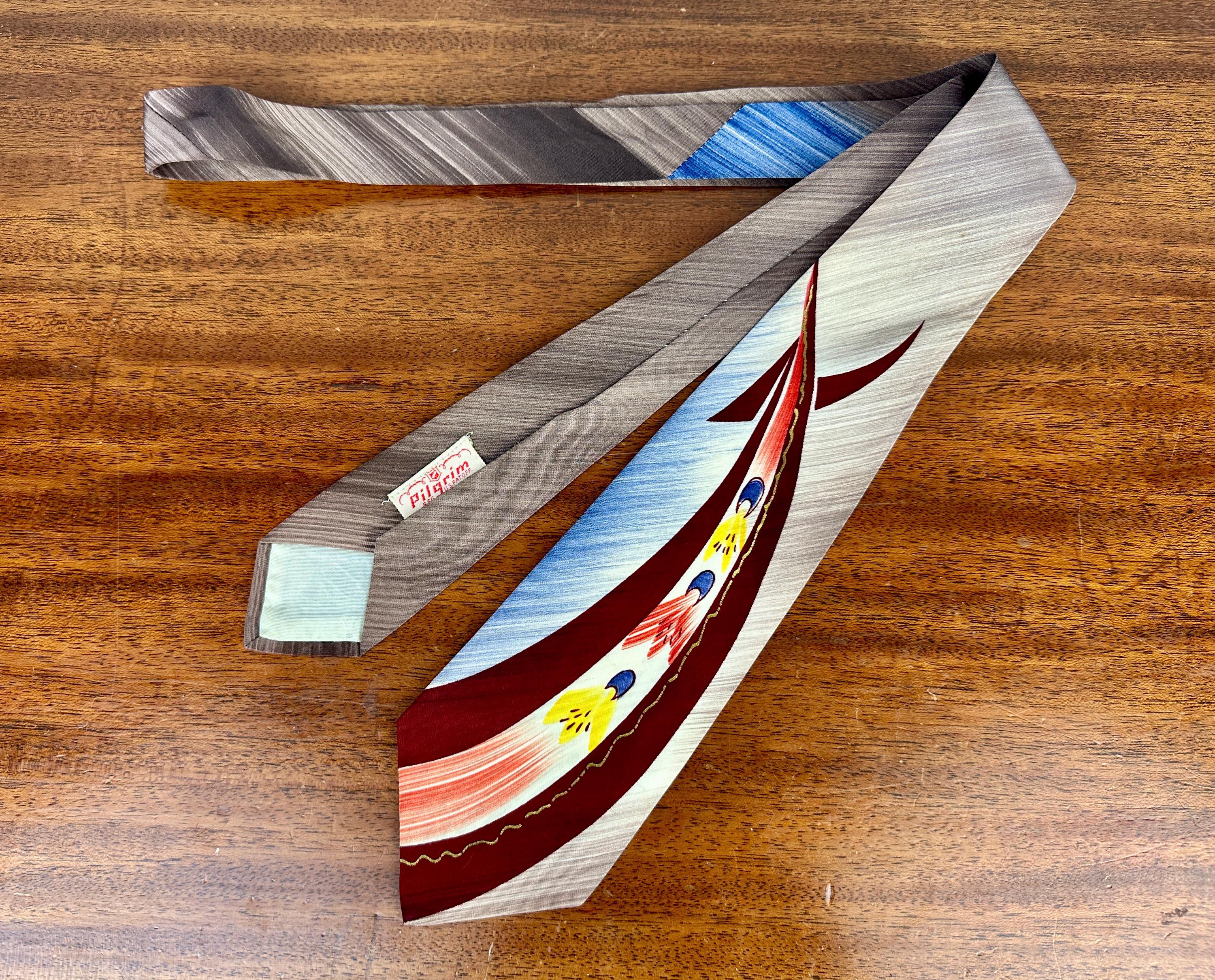 Rocket your way to a tip top look by accessorizing with this 1950s necktie! This silk tie has an airbrush stroke background of smokey purple and navy blue topped with a stream of blasting rockets in maroon, brick red, blue, and sunny yellow. Hand painted gold accents are a nice touch. Fully lined and labeled "Pilgrim". Pairs well with a wide variety of Art Deco and Mid-Century suit colors and fabric types. This tie is in great vintage condition with no flaws found!