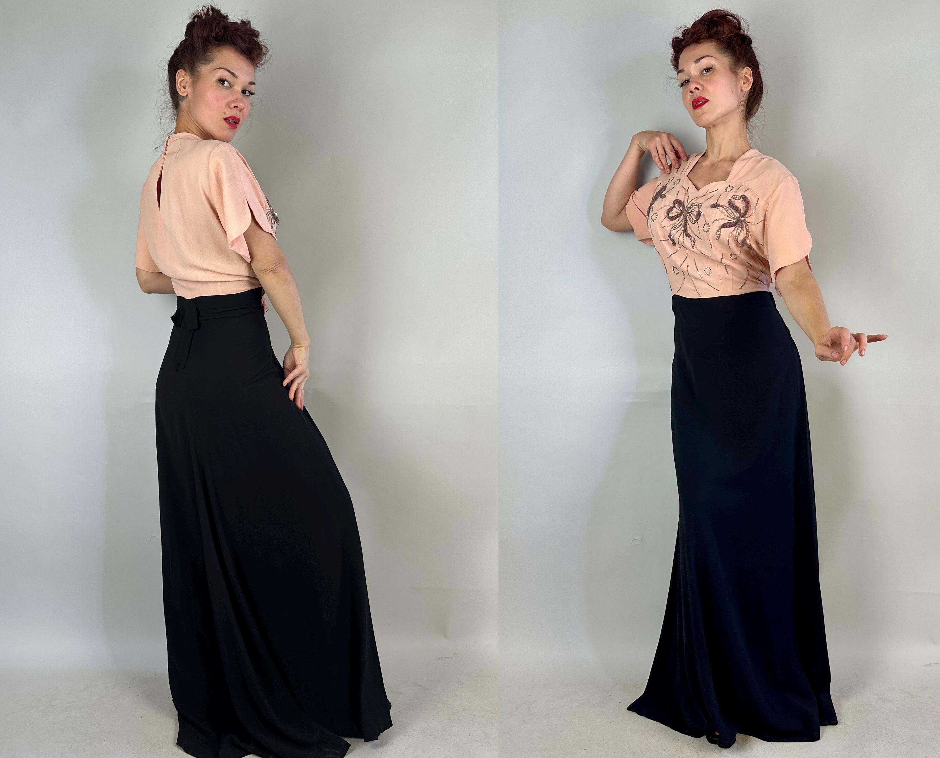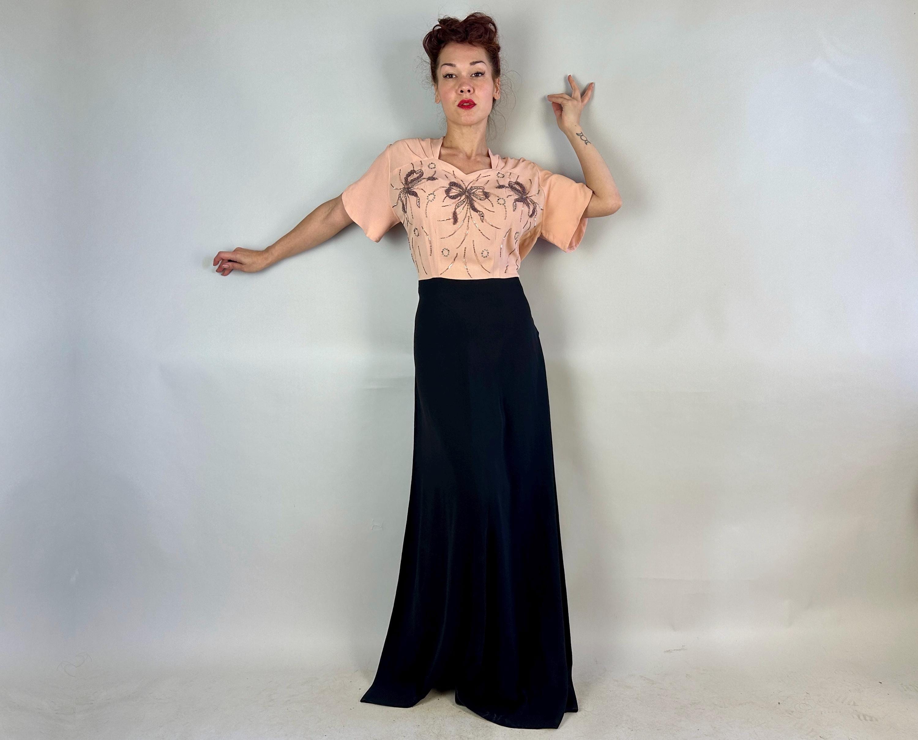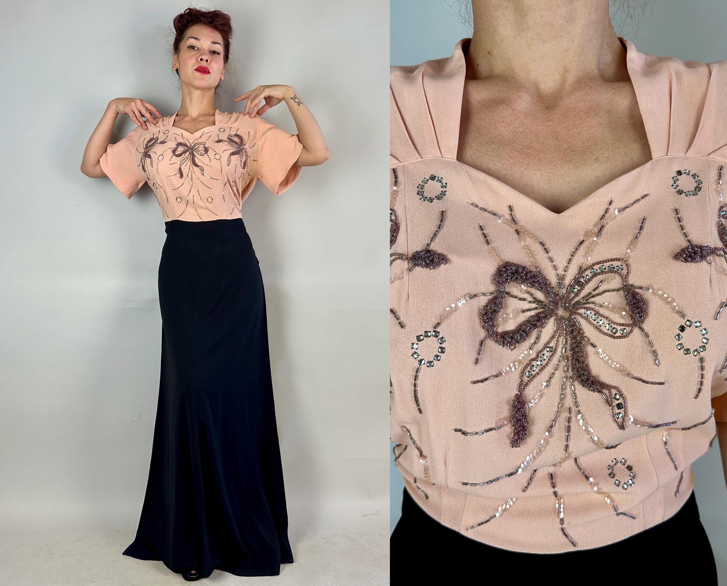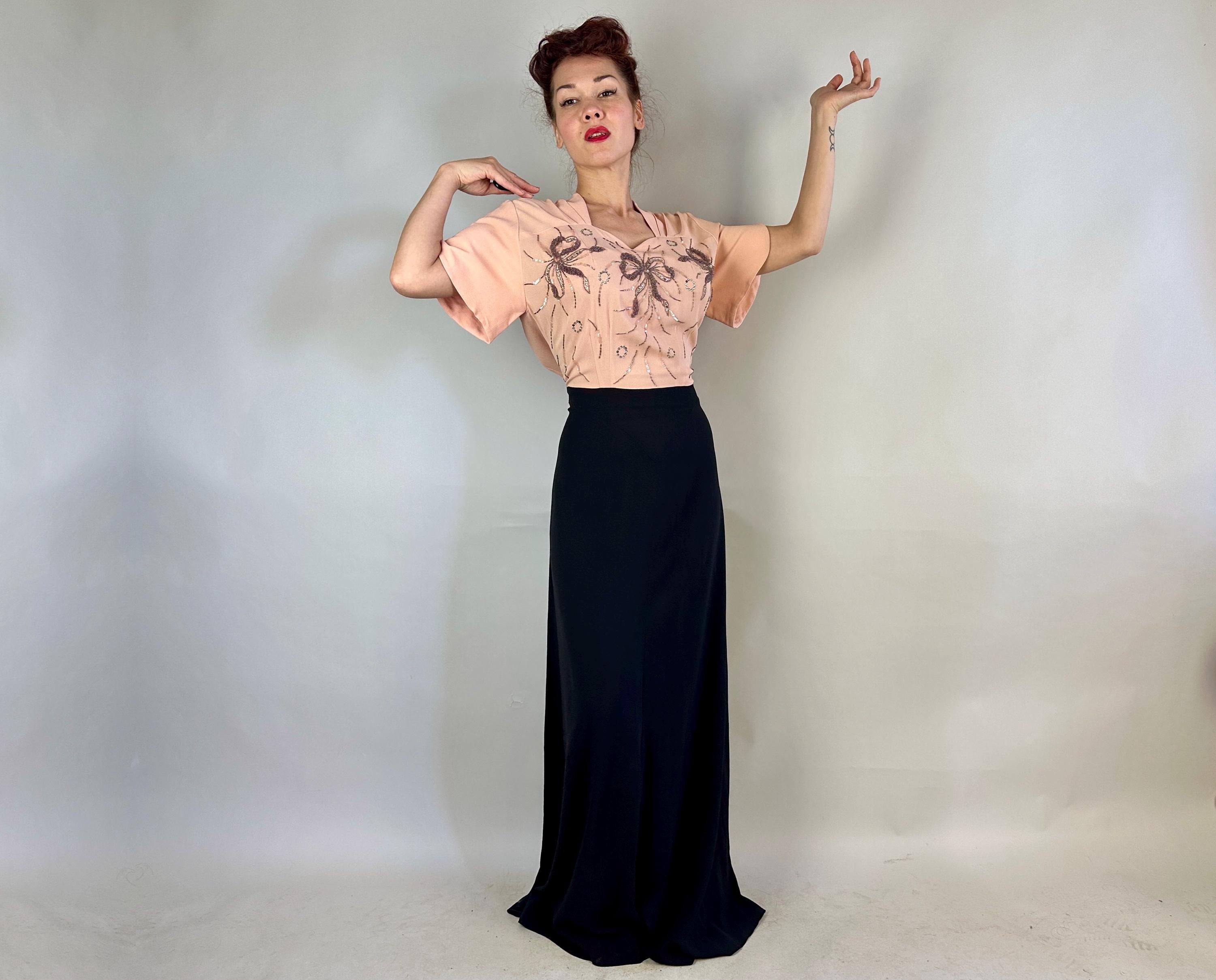 Captivating a crowd will be no problem in this 1940s color block evening gown! Made of rayon crepe with ballet pink on the top and black on the bottom. The bodice has a pleated sweetheart neckline and is covered with clear gelatin sequins, rhinestones, silver bugle beads, and dusty rose seed beads with a formation of three bows being the main design. The floor length skirt cascades to a wide sweep and a bow at the small of the back highlights a faux belt. Loop buttons at the nape make a keyhole opening. Metal zipper on the side. This dress is in great vintage condition, with no holes, stains, or odors to note. It has been pinned on model to show fit.