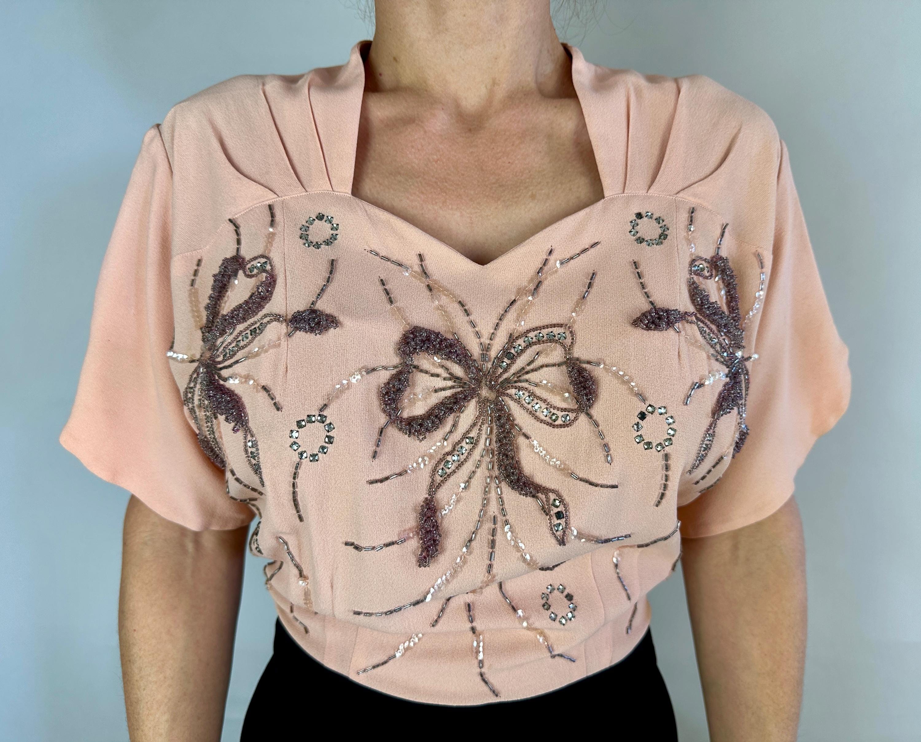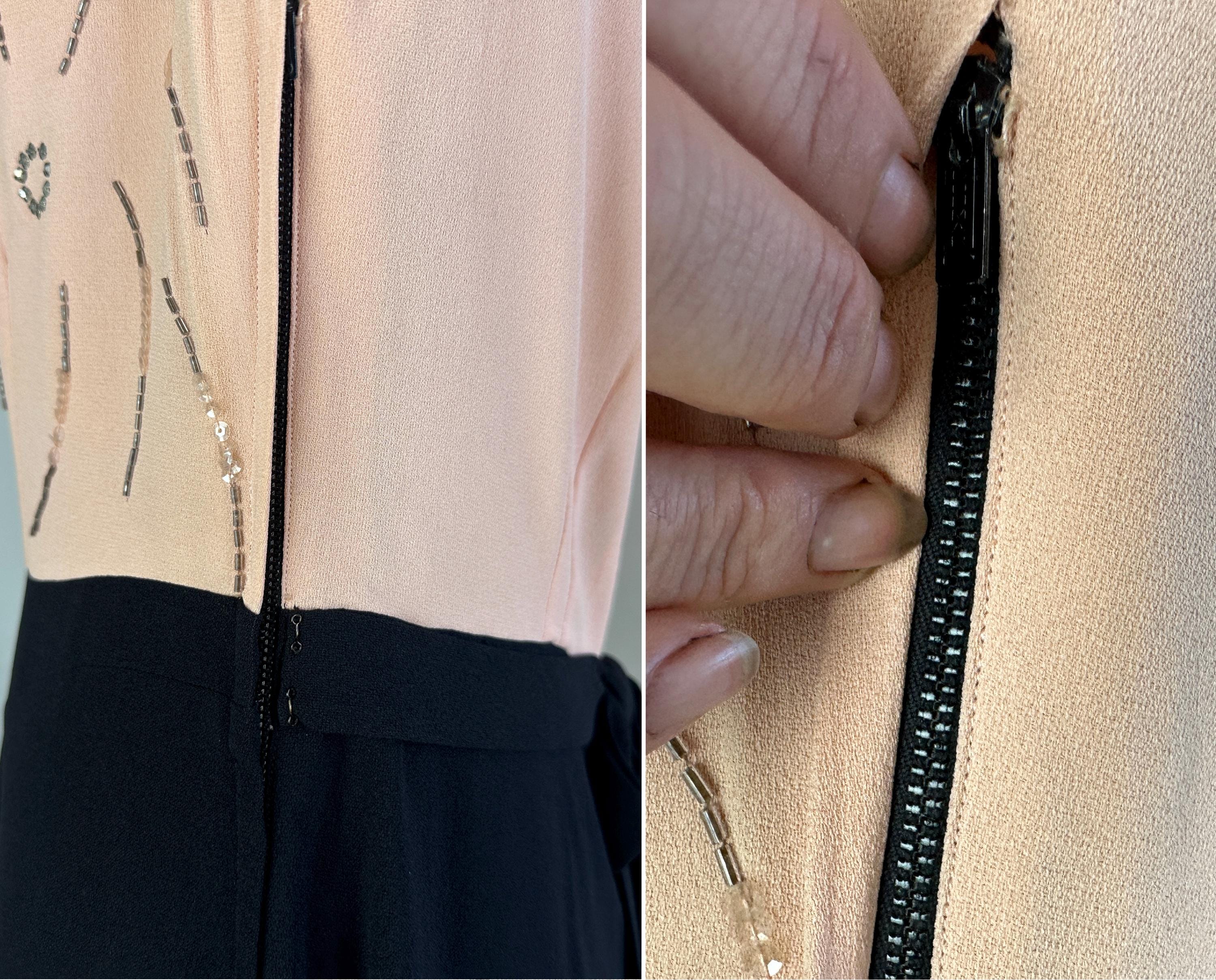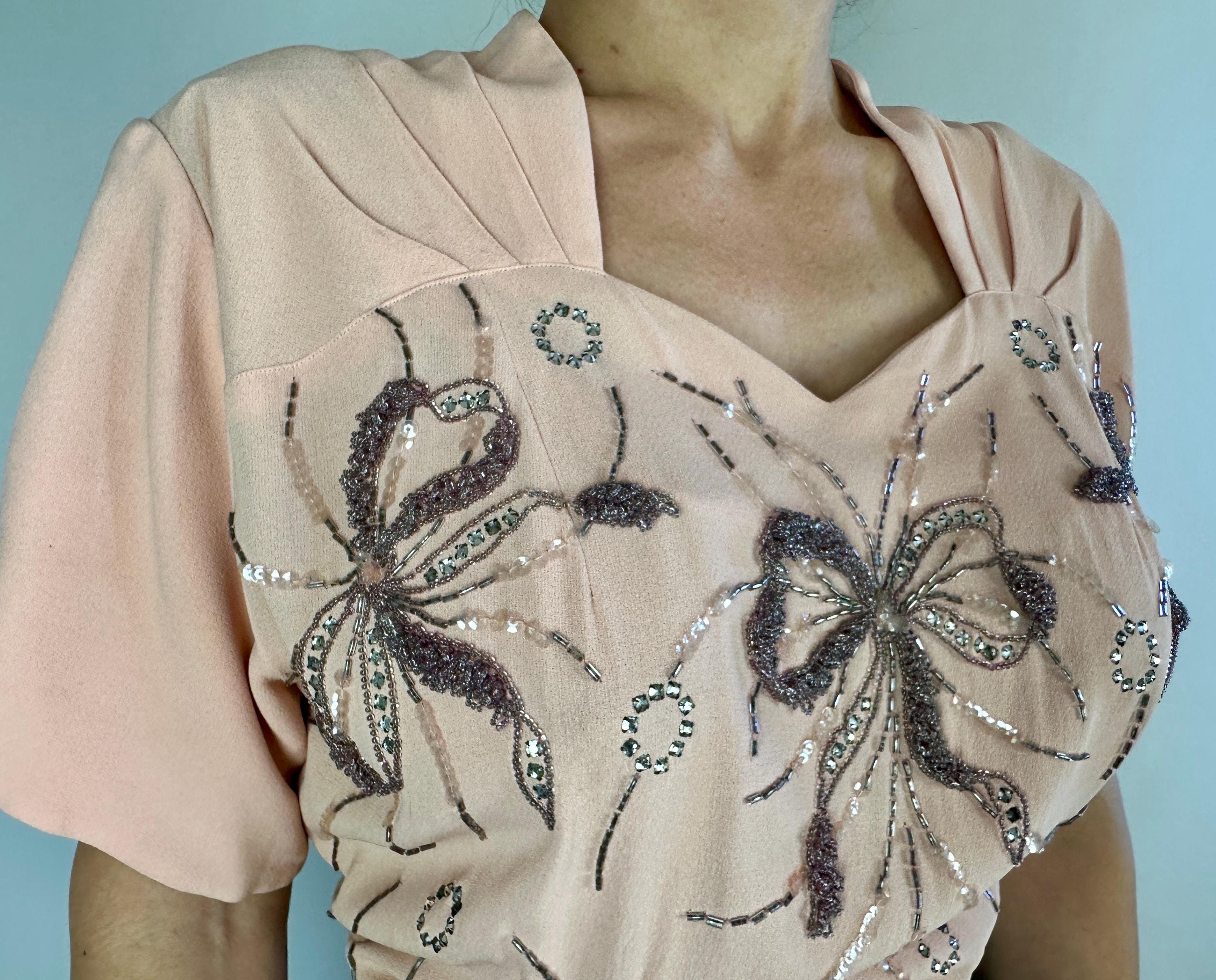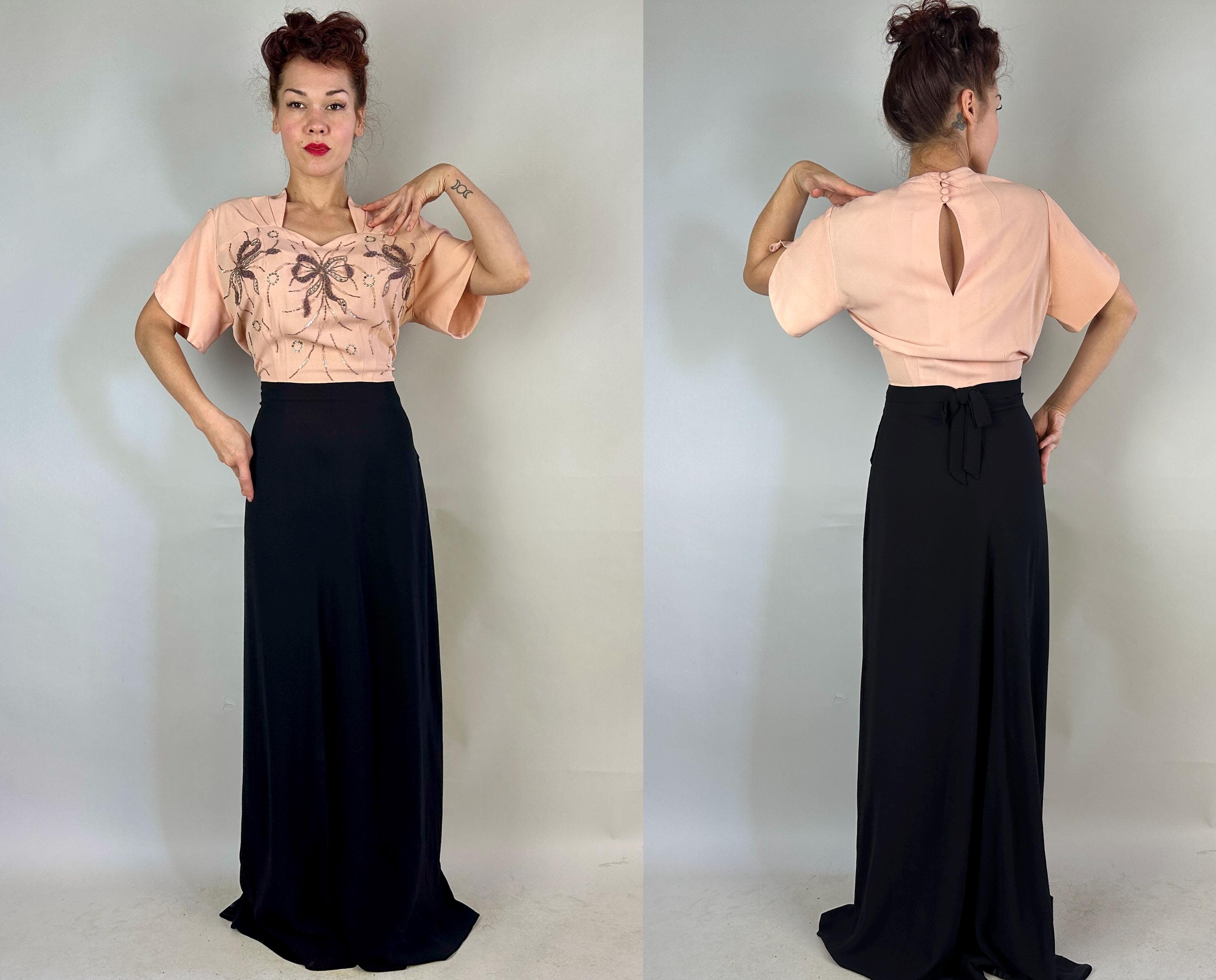 Captivating a crowd will be no problem in this 1940s color block evening gown! Made of rayon crepe with ballet pink on the top and black on the bottom. The bodice has a pleated sweetheart neckline and is covered with clear gelatin sequins, rhinestones, silver bugle beads, and dusty rose seed beads with a formation of three bows being the main design. The floor length skirt cascades to a wide sweep and a bow at the small of the back highlights a faux belt. Loop buttons at the nape make a keyhole opening. Metal zipper on the side. This dress is in great vintage condition, with no holes, stains, or odors to note. It has been pinned on model to show fit.