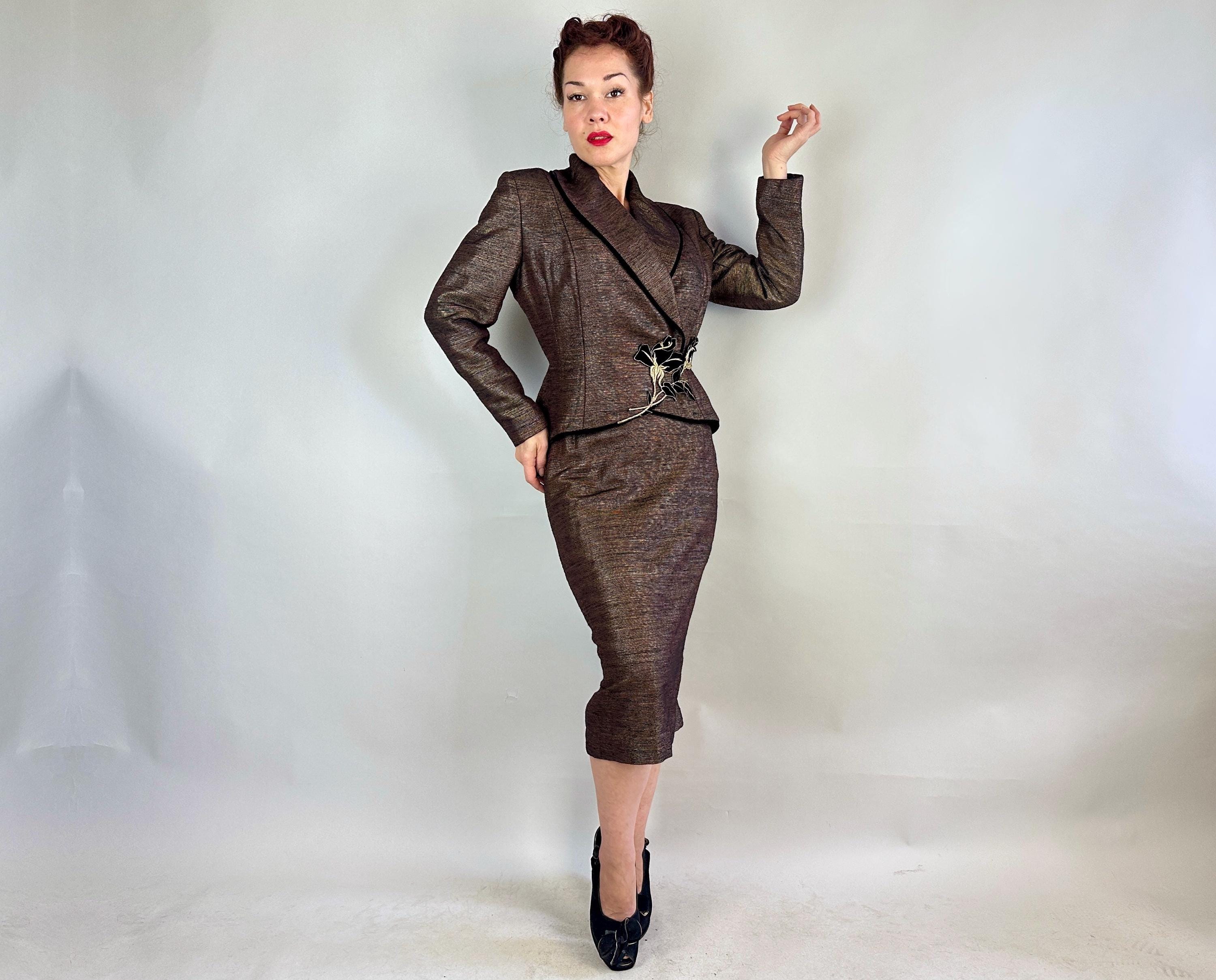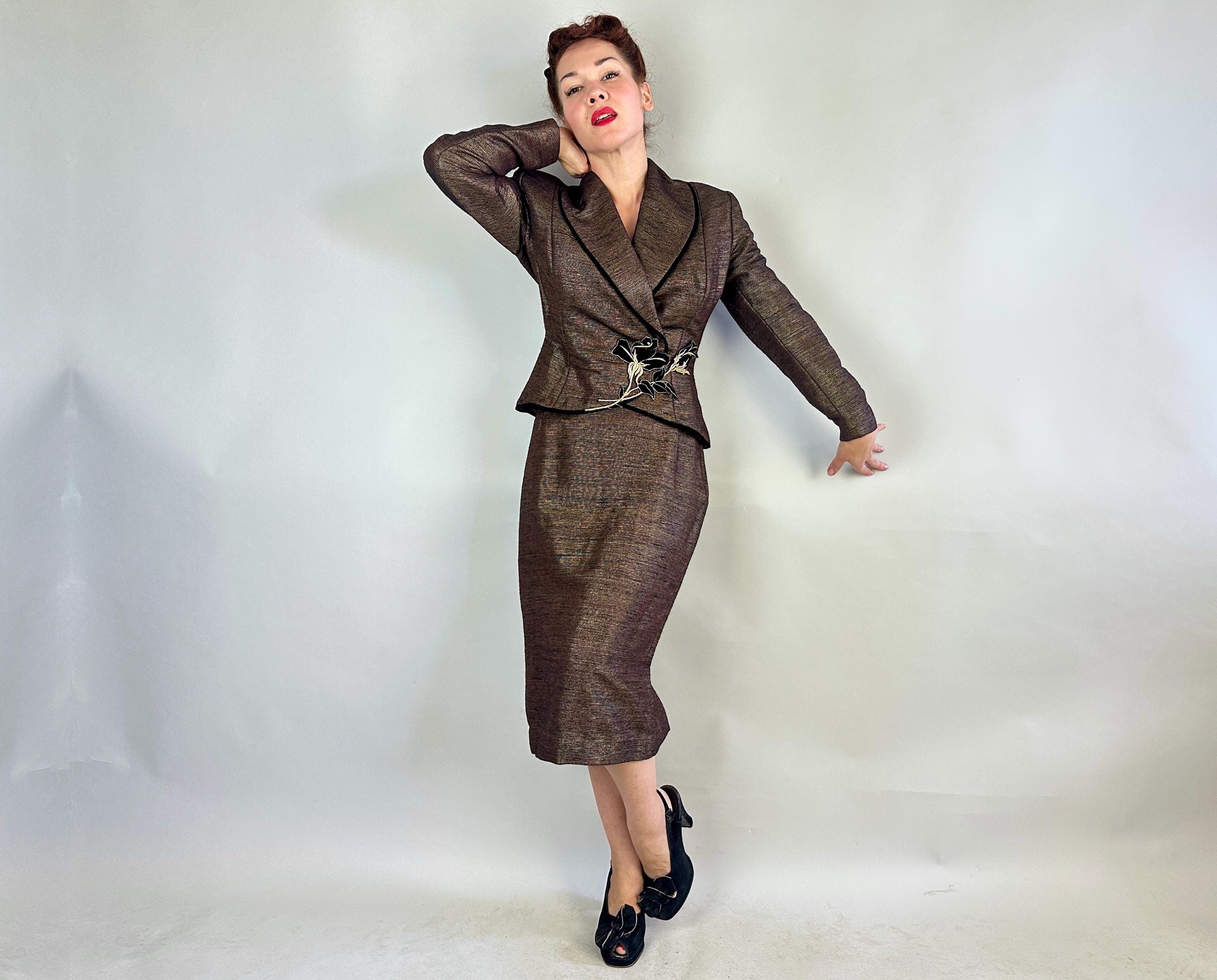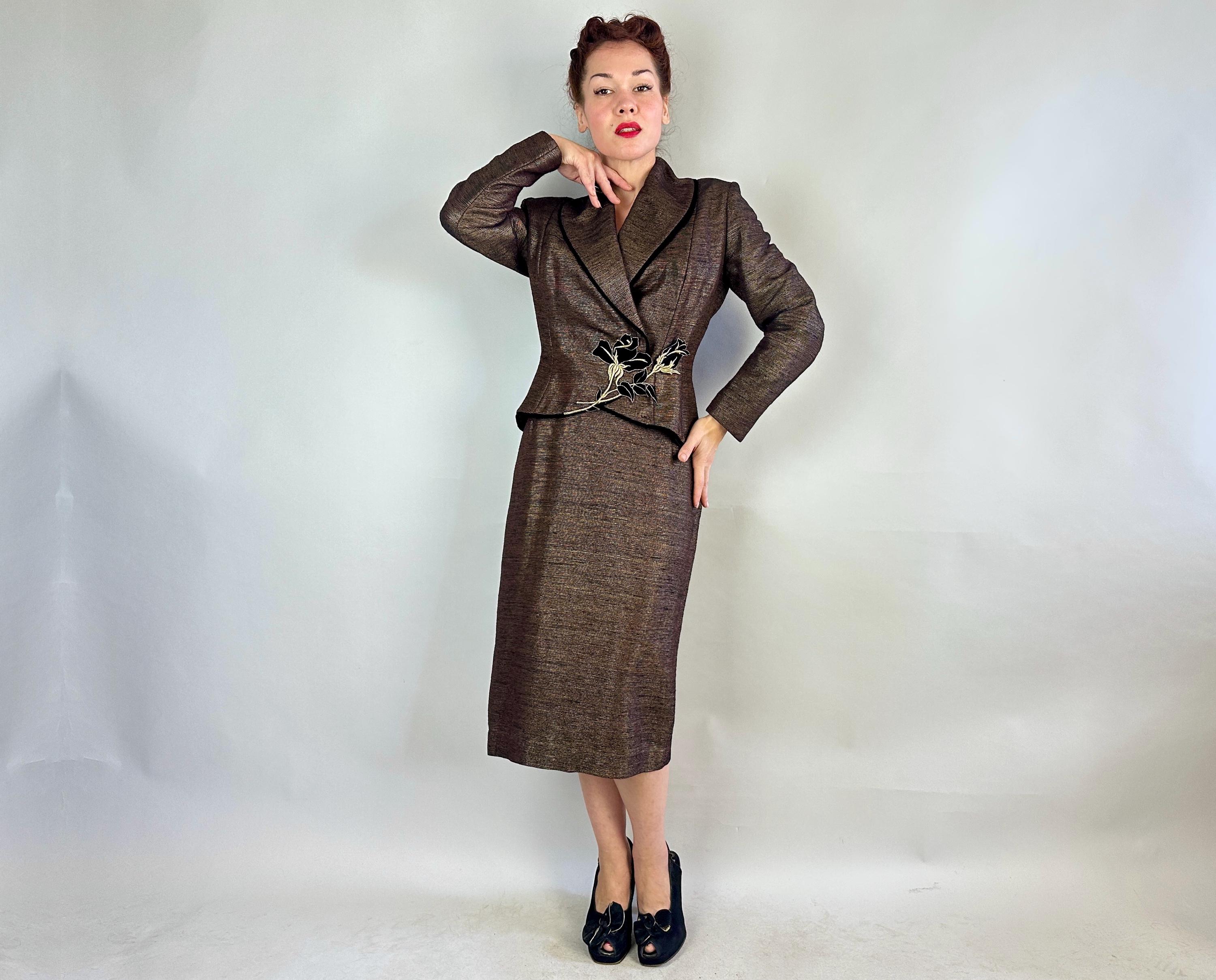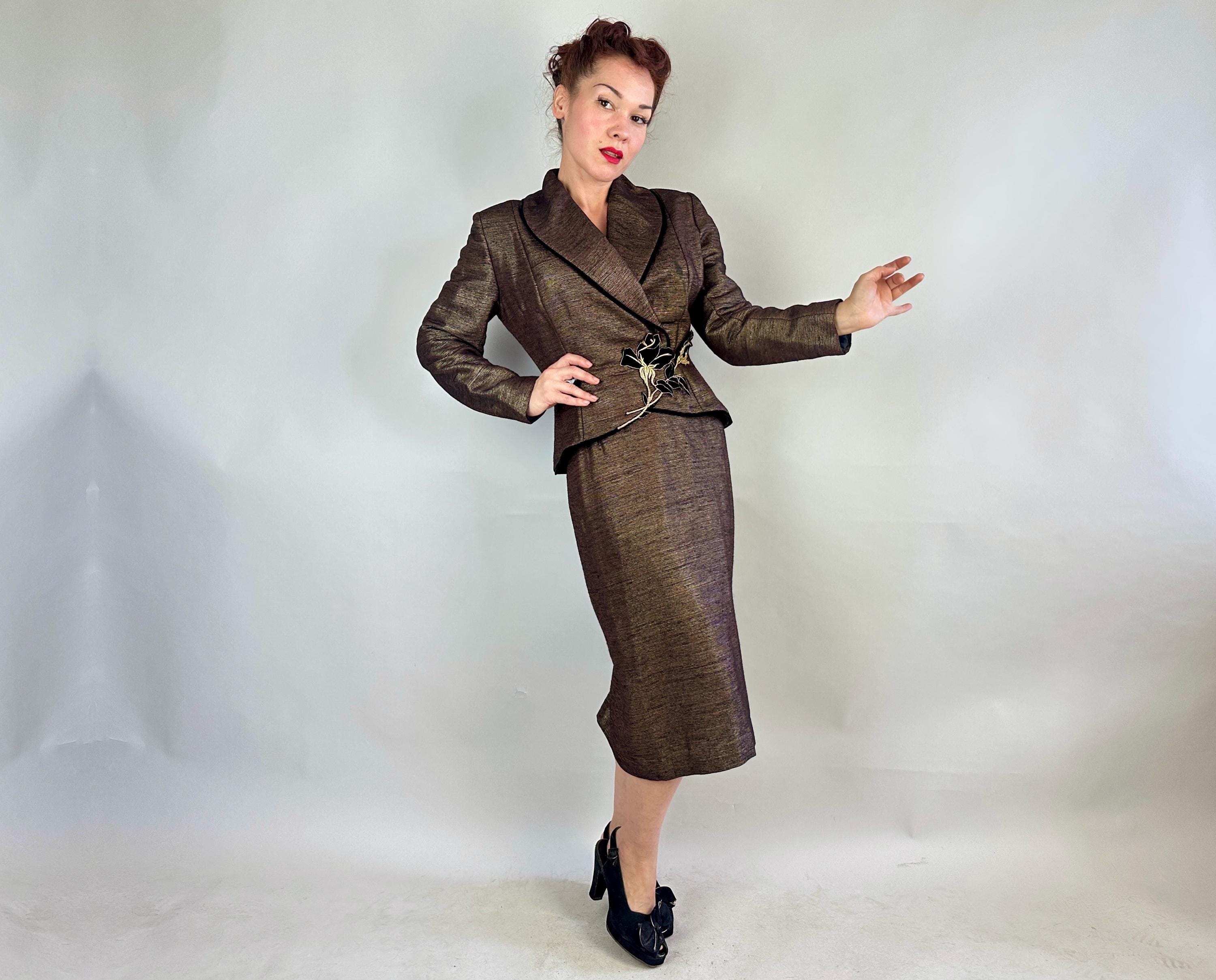 Is all that glitters truly gold? Who cares because you'll be golden in this 1950s "Lilli Ann" suit! The cloth is a black and brown wool and silk blend with a raised faille texture alternated with gold lamé giving an overall look of an antique bronze statue in a state of being polished. The jacket is beautifully styled with a wide shawl lapel, padded shoulders, the signature "Lilli Ann" shaped seamwork, and a rose applique sitting asymmetrically on the waist that disguises the snap fastenings. The rose is of black velvet with gold metal thread making embroidered details and black velvet is also used as a piped trim. The pencil skirt has a knife kick pleat and side metal zipper with button for closure. Black rayon crepe fully lines the jacket and partially lines he skirt. This suit is in great vintage condition, with a small subtle mend on the skirt waistband (obviously not seen when worn) but no holes, stains, nor odors to note.