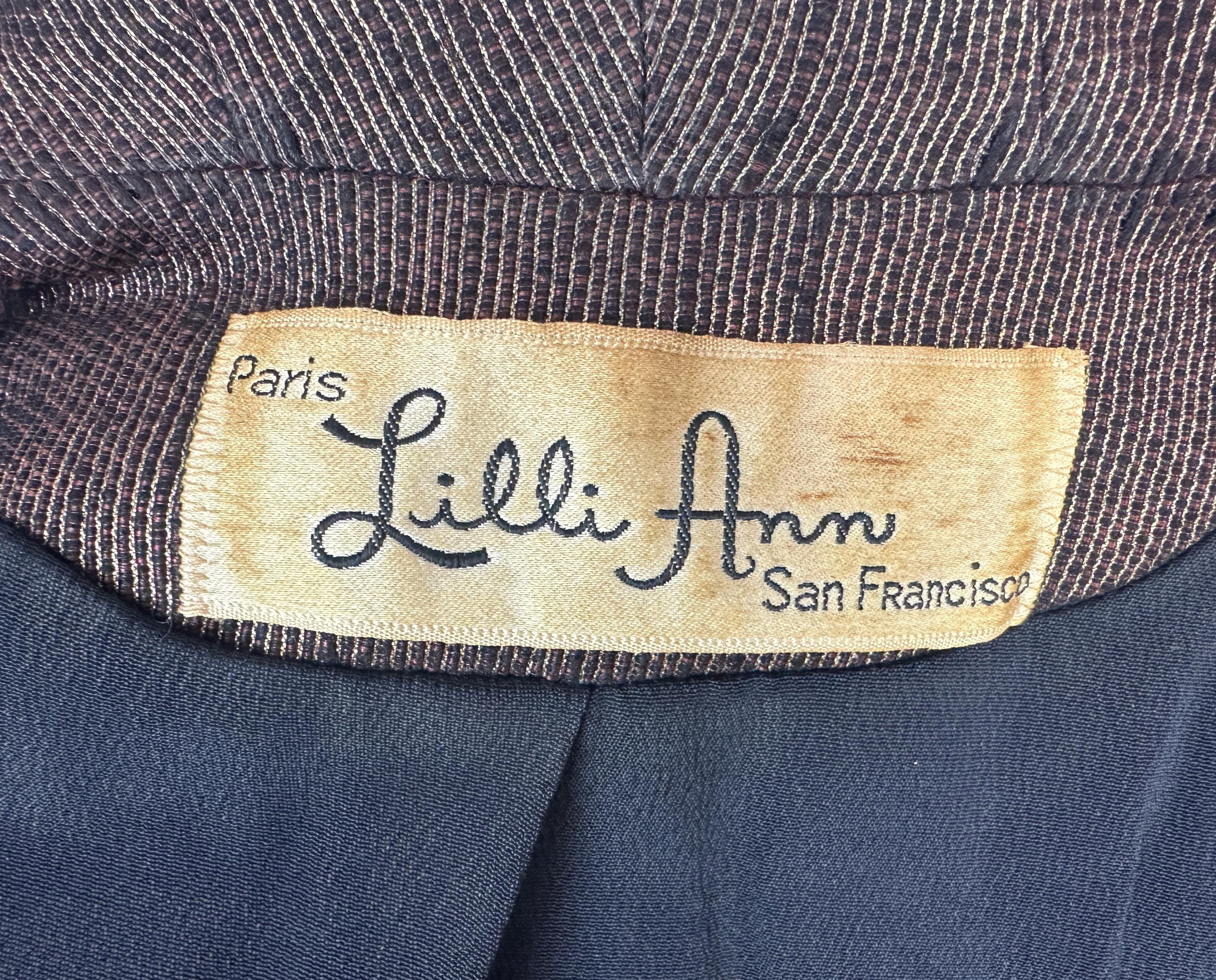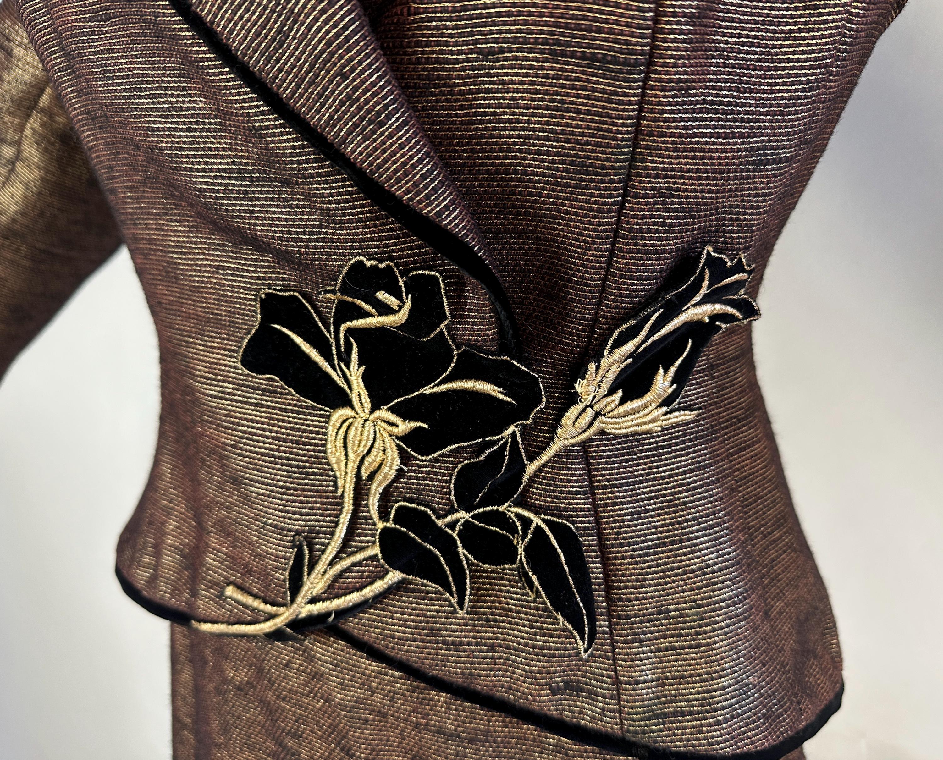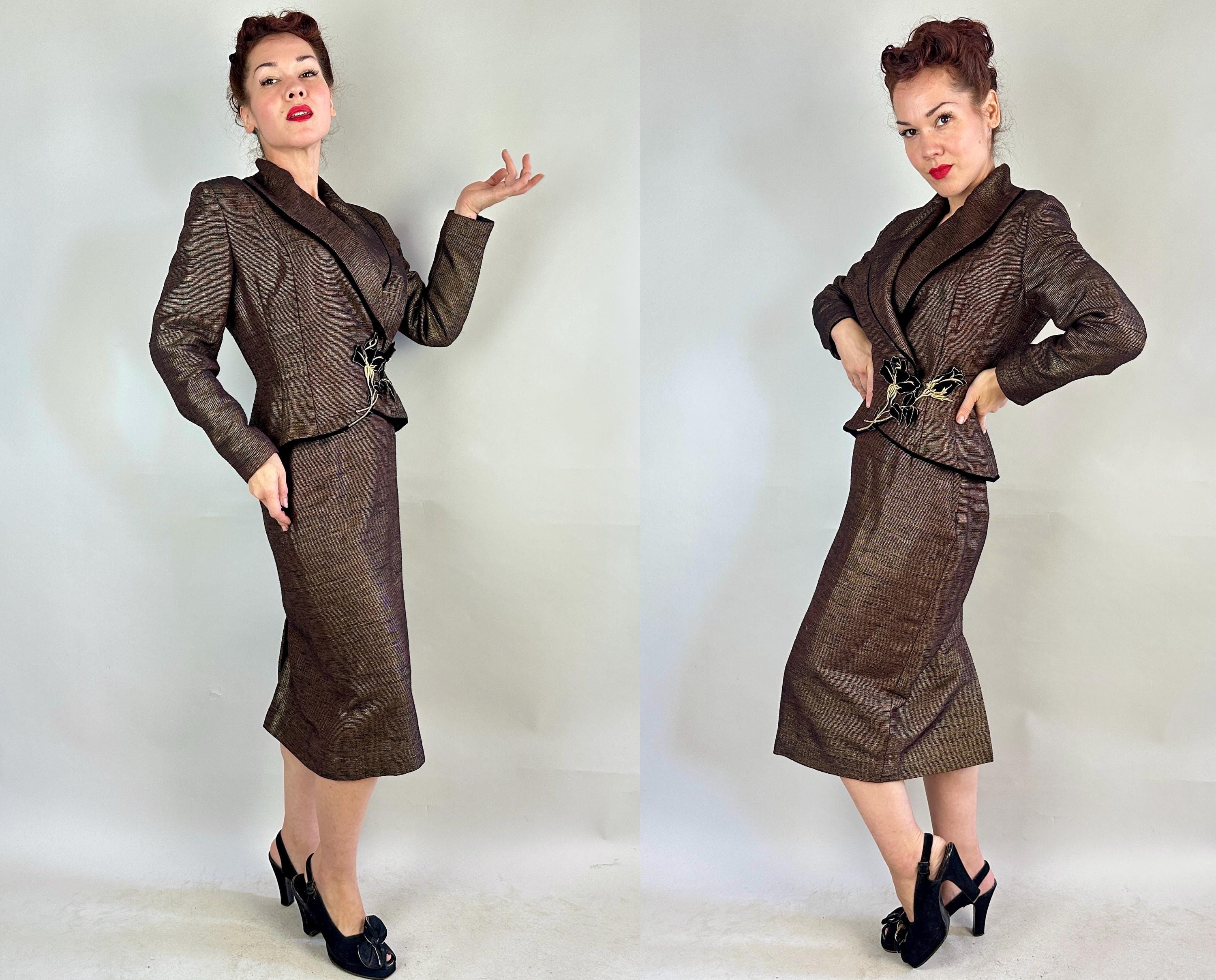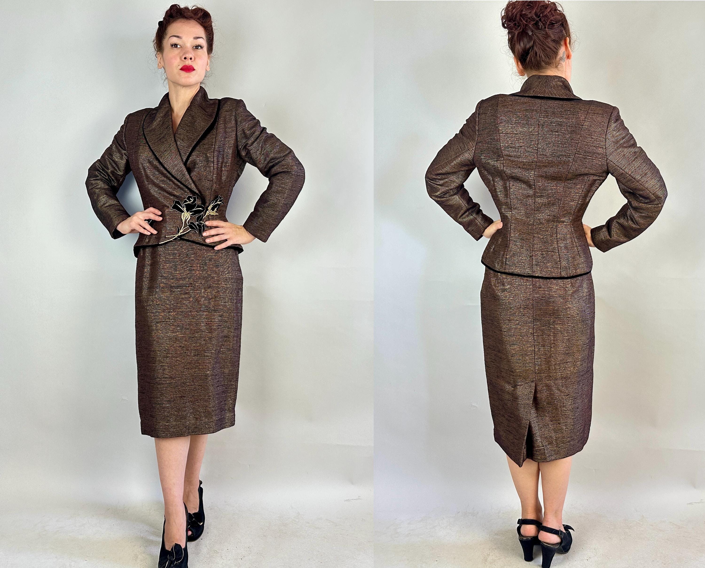 Is all that glitters truly gold? Who cares because you'll be golden in this 1950s "Lilli Ann" suit! The cloth is a black and brown wool and silk blend with a raised faille texture alternated with gold lamé giving an overall look of an antique bronze statue in a state of being polished. The jacket is beautifully styled with a wide shawl lapel, padded shoulders, the signature "Lilli Ann" shaped seamwork, and a rose applique sitting asymmetrically on the waist that disguises the snap fastenings. The rose is of black velvet with gold metal thread making embroidered details and black velvet is also used as a piped trim. The pencil skirt has a knife kick pleat and side metal zipper with button for closure. Black rayon crepe fully lines the jacket and partially lines he skirt. This suit is in great vintage condition, with a small subtle mend on the skirt waistband (obviously not seen when worn) but no holes, stains, nor odors to note.