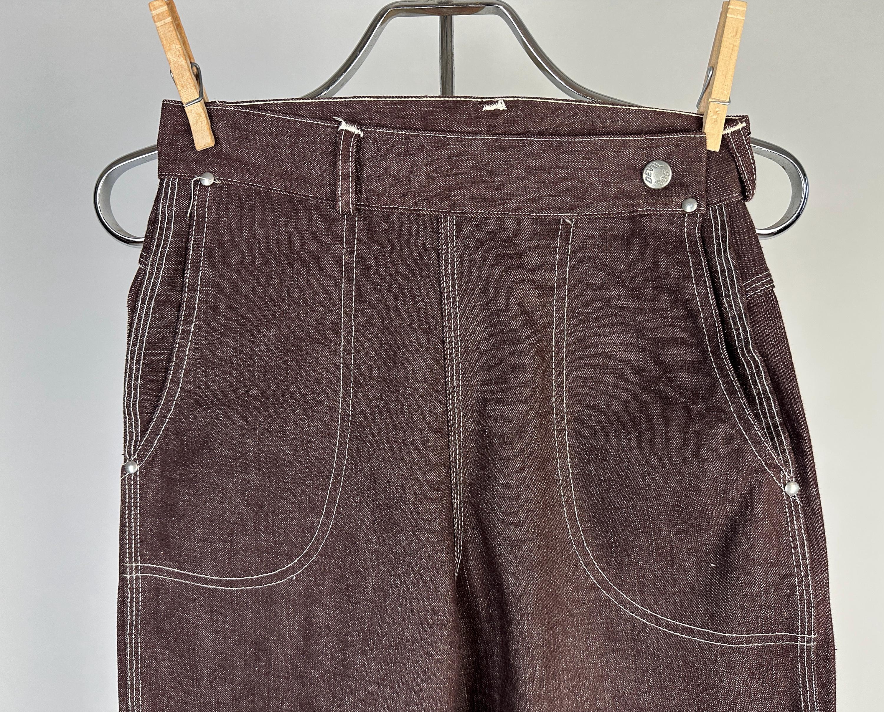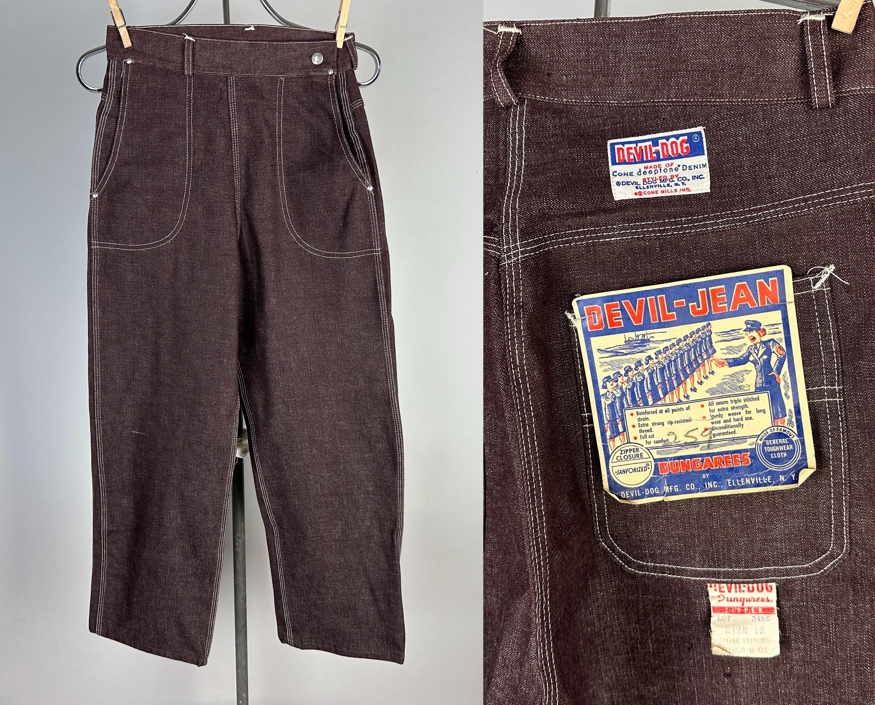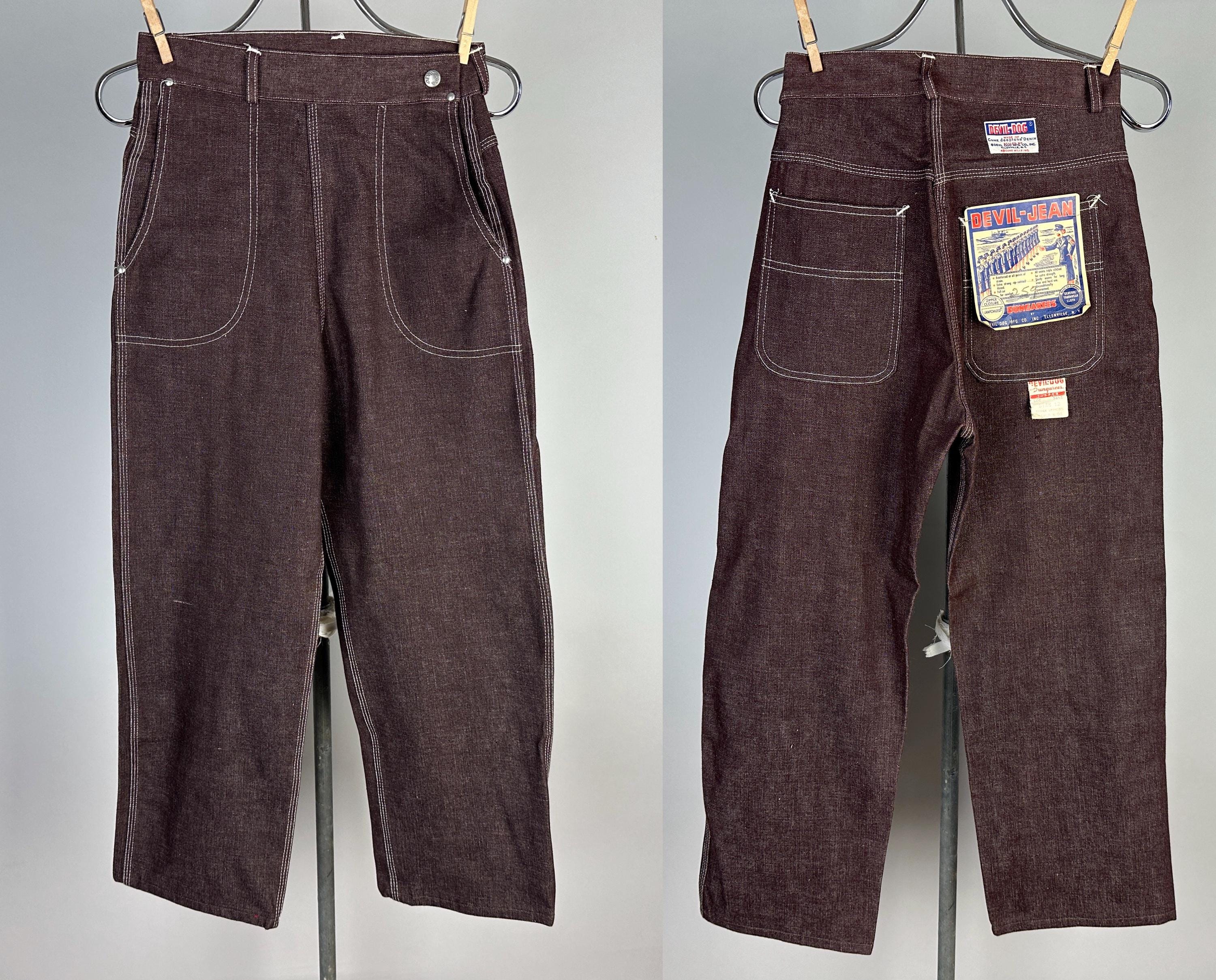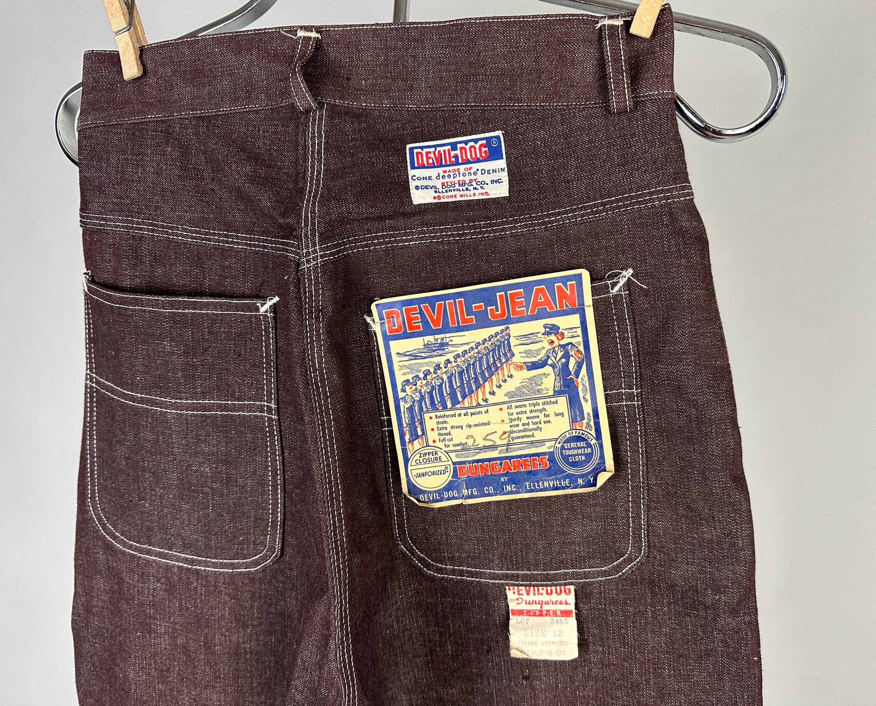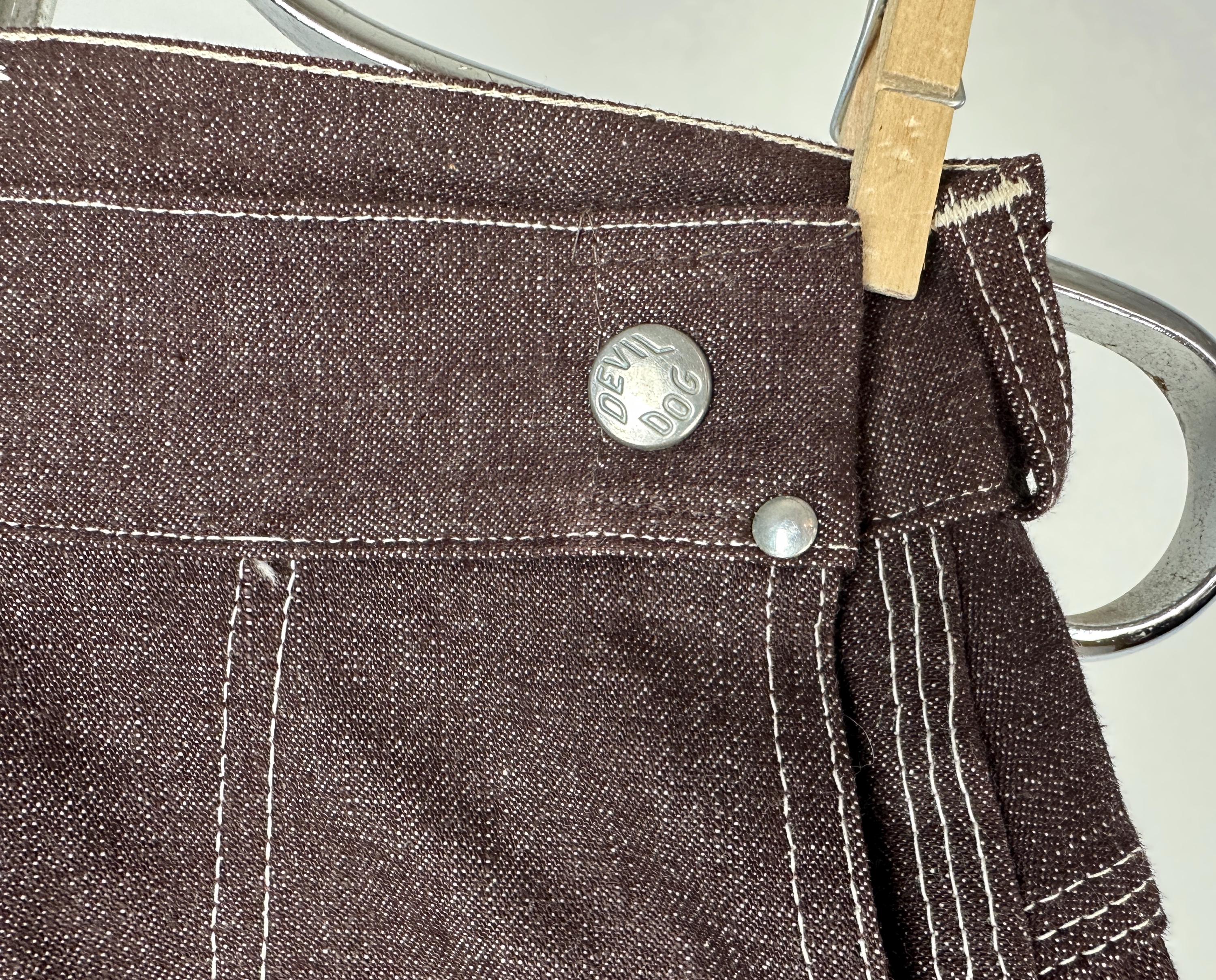 Dare to be active while being your stylish self in these deadstock 1950s jeans! You'll be the first to don these "Devil-Dog" jeans made of cotton denim in a unique shade of walnut brown. They feature white top stitching, four roomy pockets, silver rivets, and "Devil-Dog" branded snap fastener. Brass side zip is hidden in the left hand pocket. These snazzy jeans still have the original tags attached and with such fun branding they really standout as a premier NOS piece! These jeans are in excellent vintage condition, with no holes, stains, odors to note.