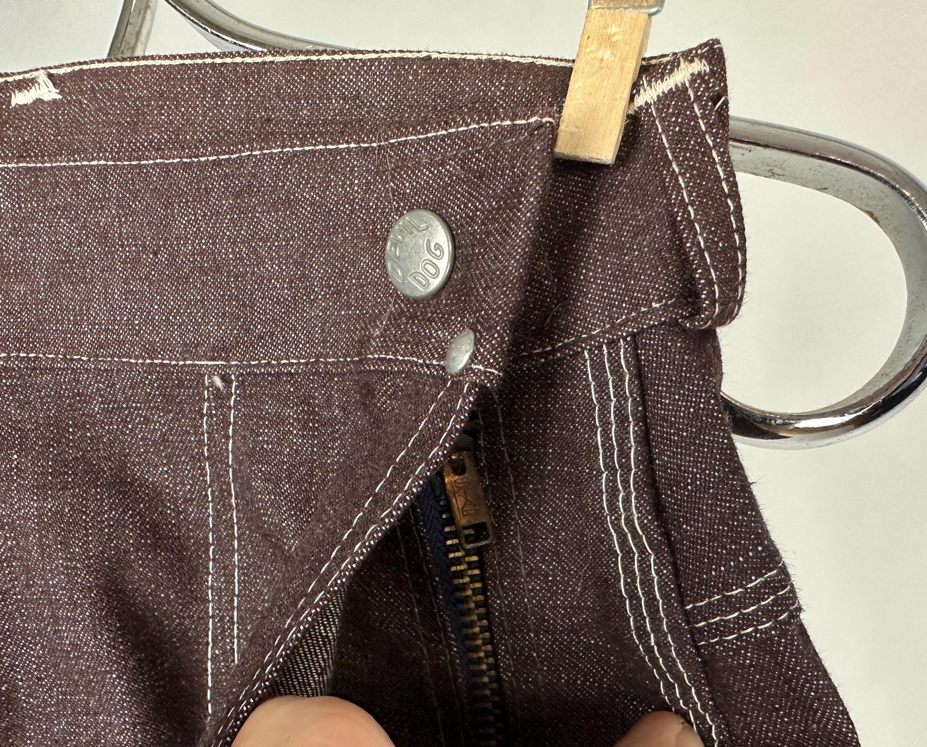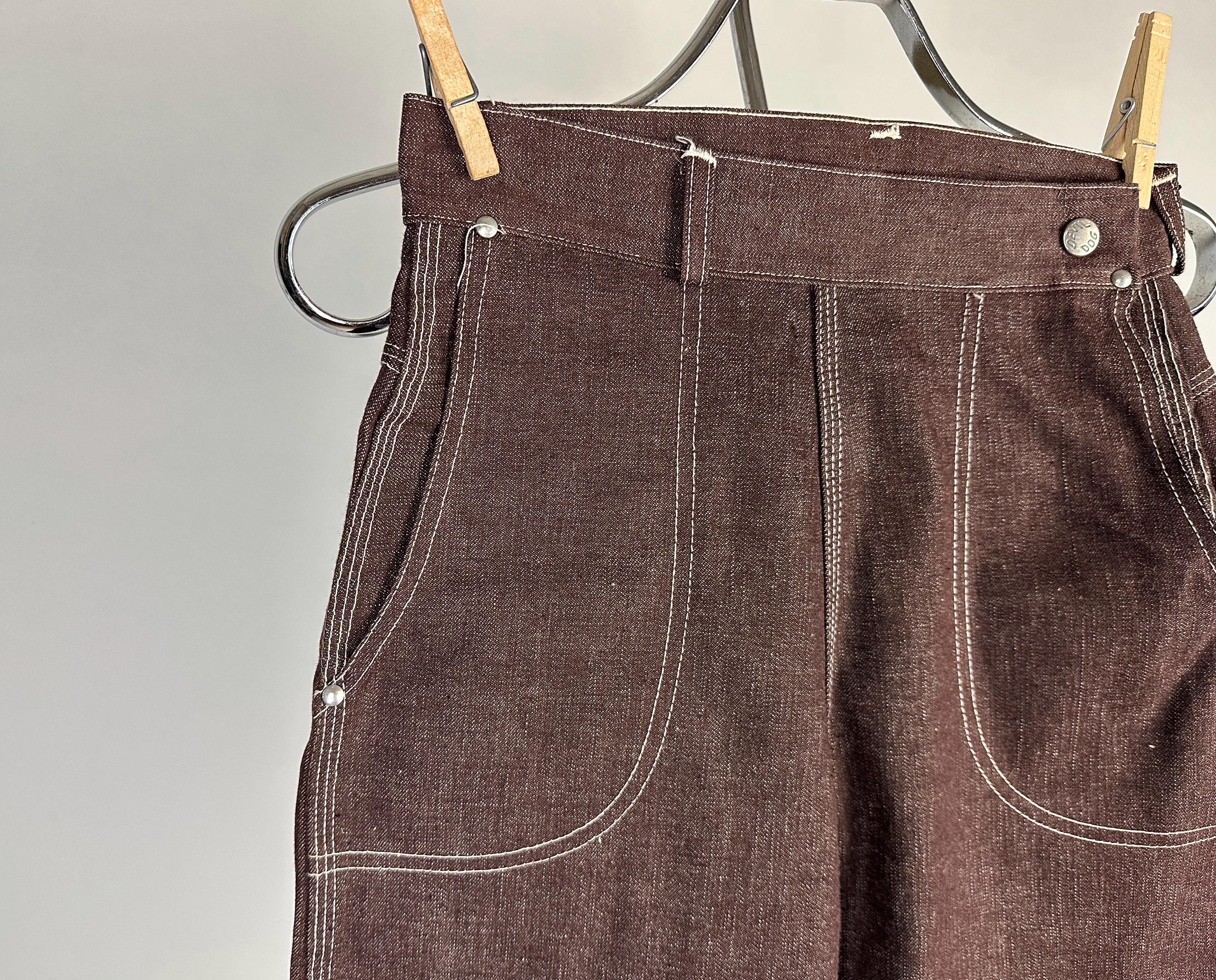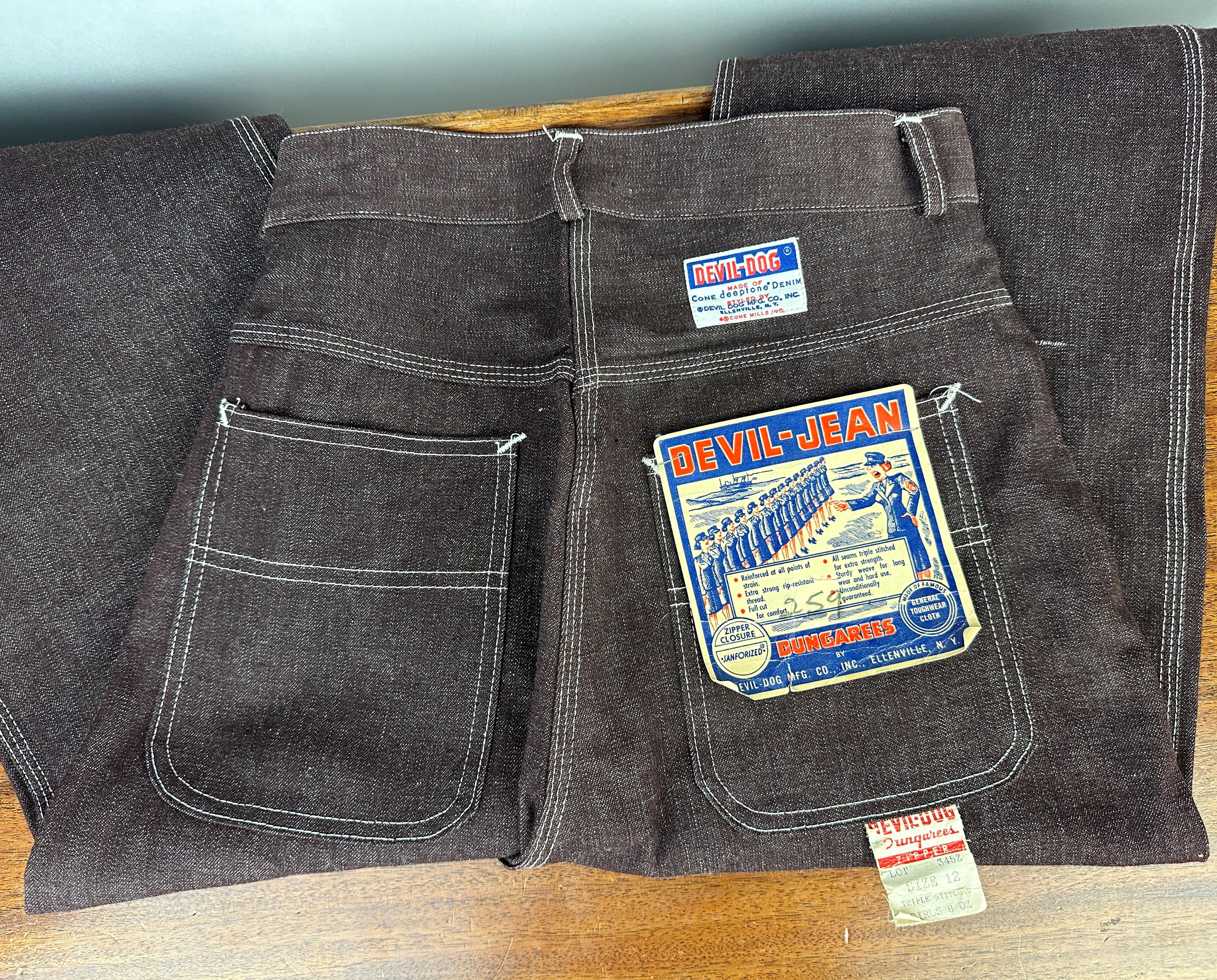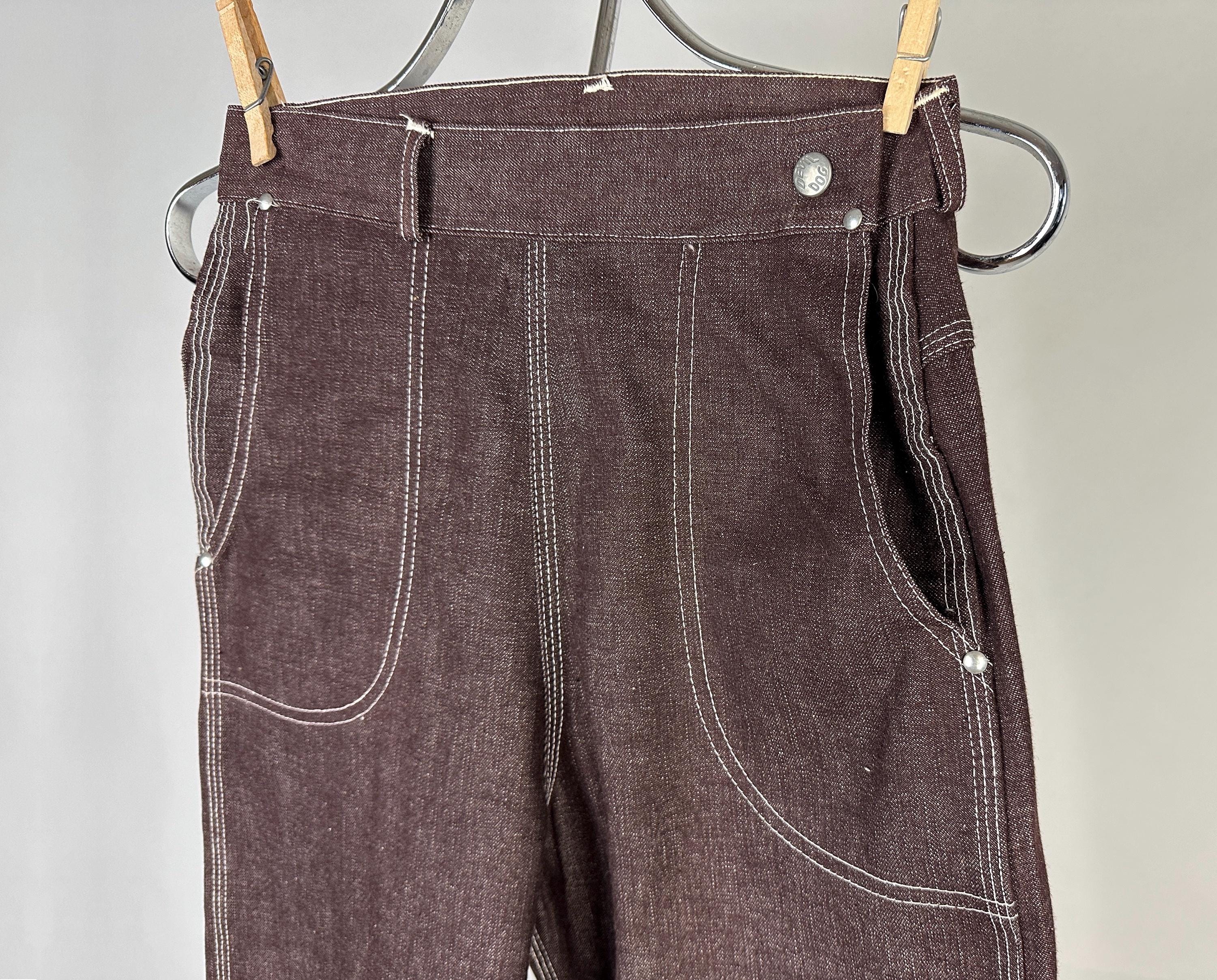 Dare to be active while being your stylish self in these deadstock 1950s jeans! You'll be the first to don these "Devil-Dog" jeans made of cotton denim in a unique shade of walnut brown. They feature white top stitching, four roomy pockets, silver rivets, and "Devil-Dog" branded snap fastener. Brass side zip is hidden in the left hand pocket. These snazzy jeans still have the original tags attached and with such fun branding they really standout as a premier NOS piece! These jeans are in excellent vintage condition, with no holes, stains, odors to note.