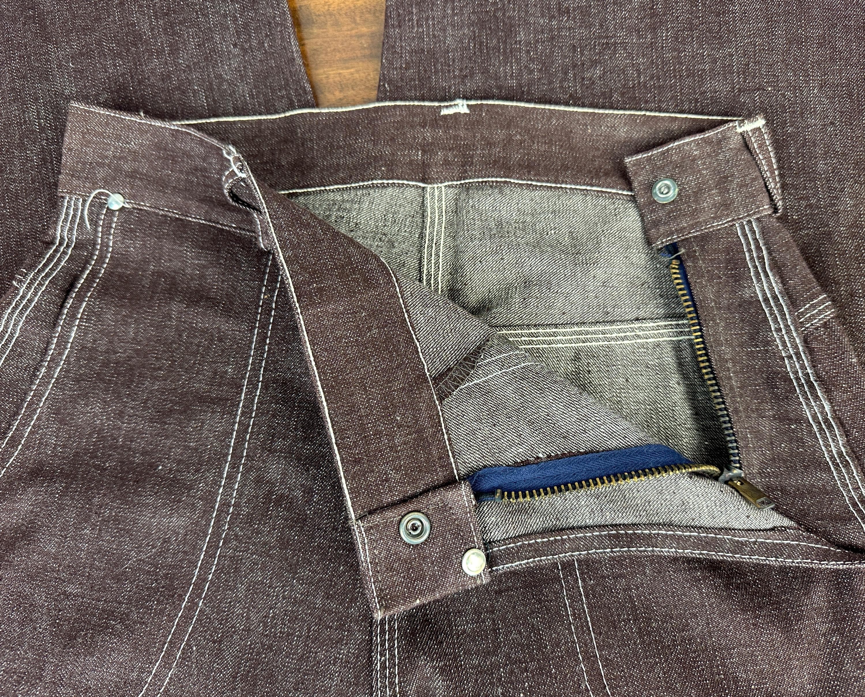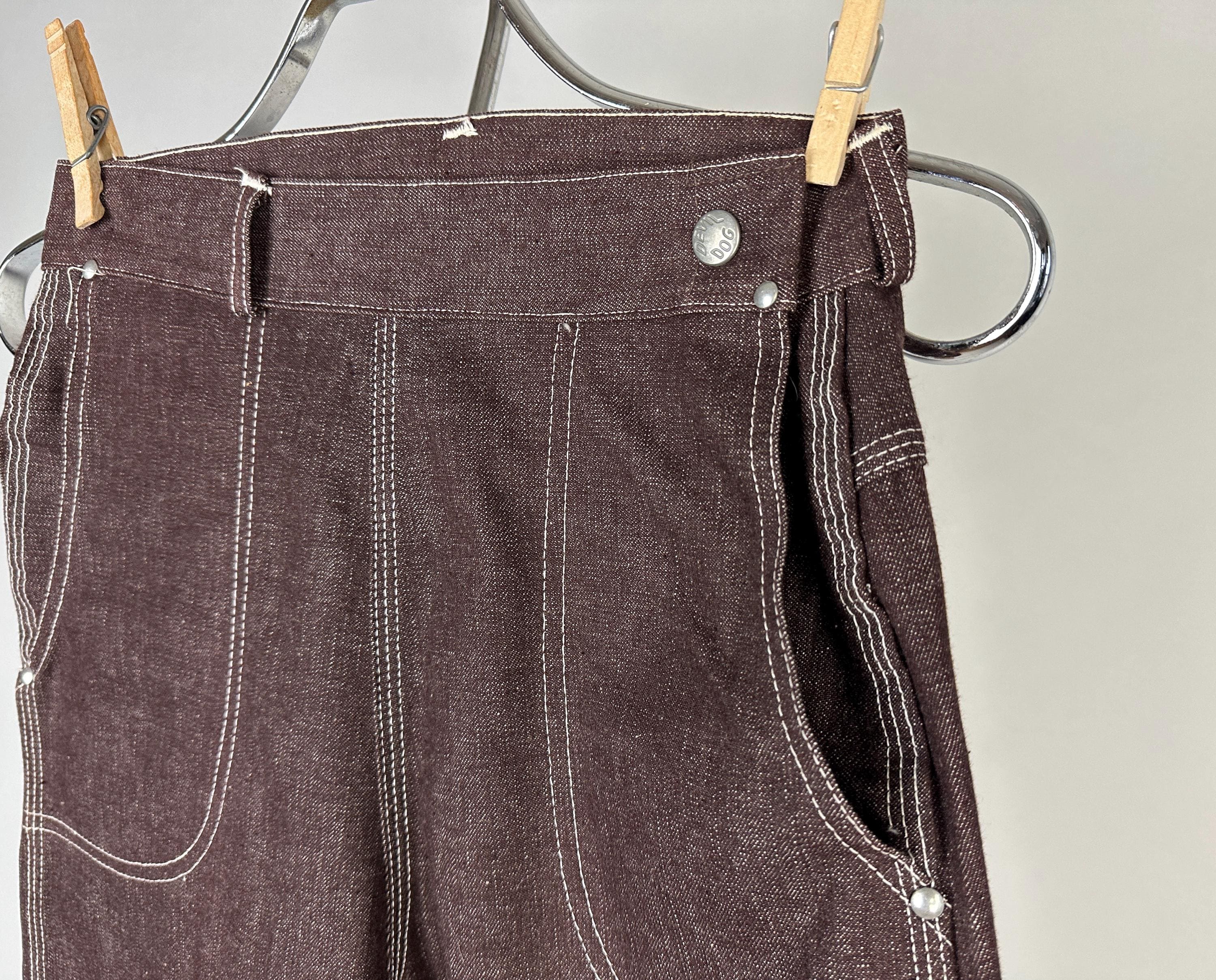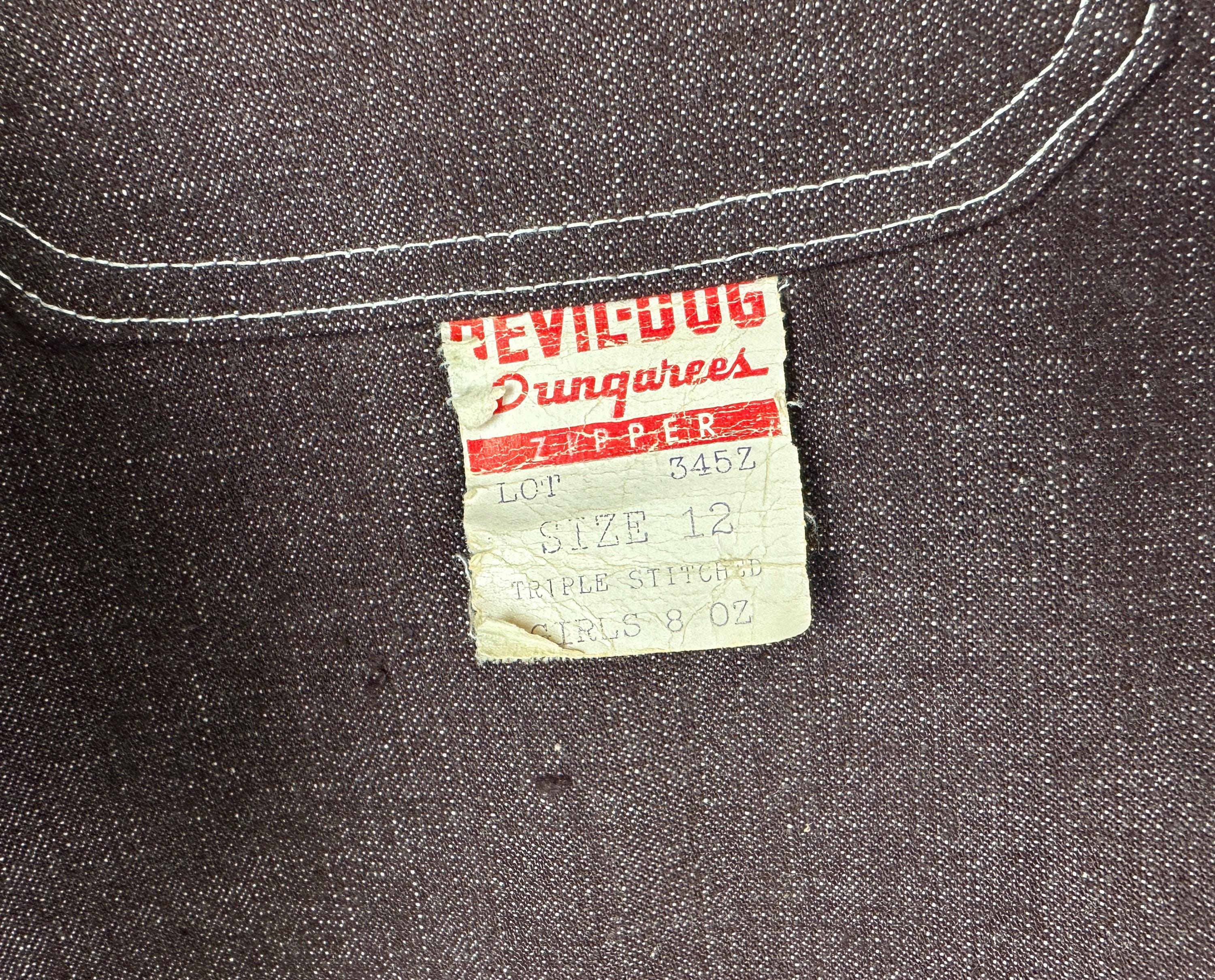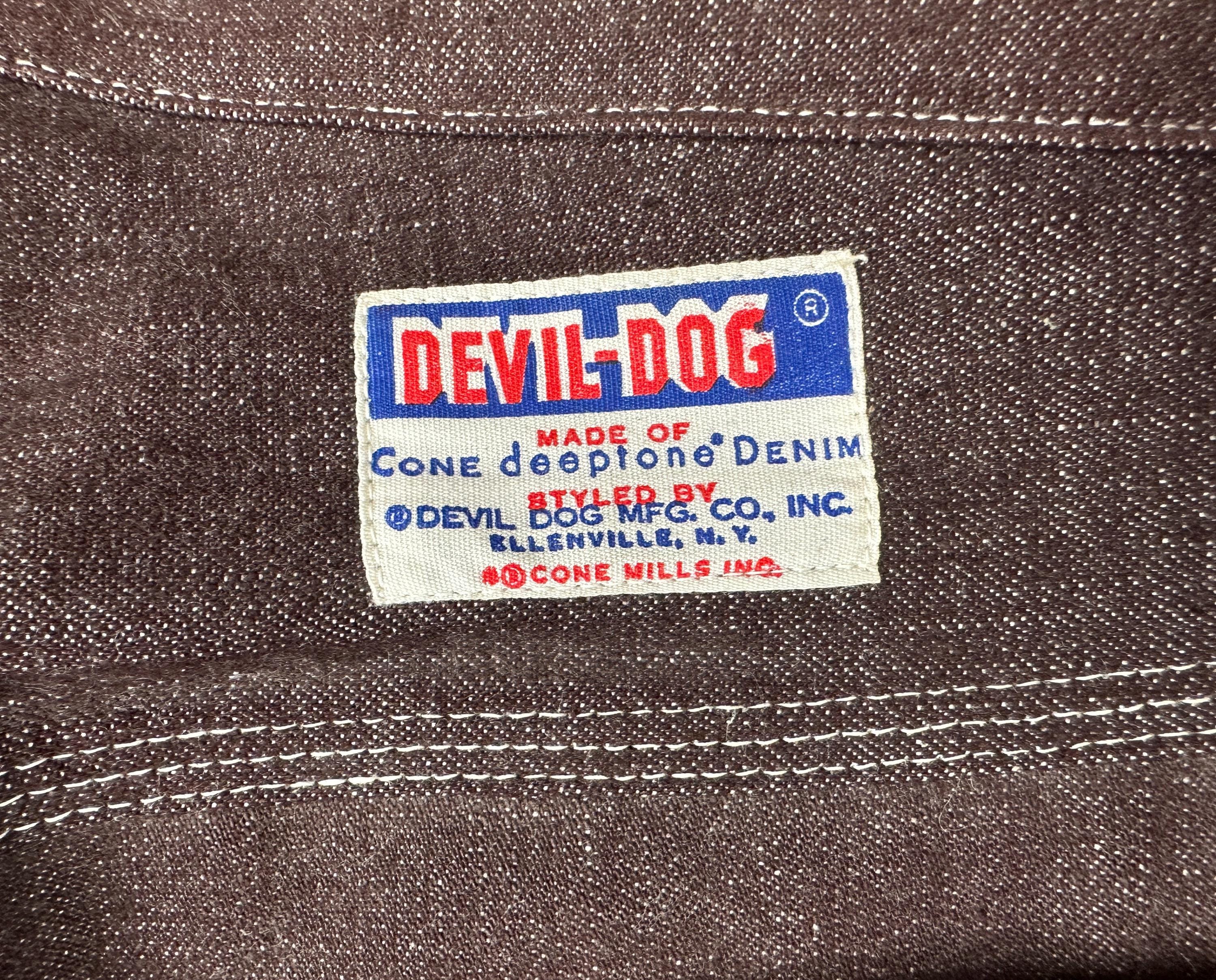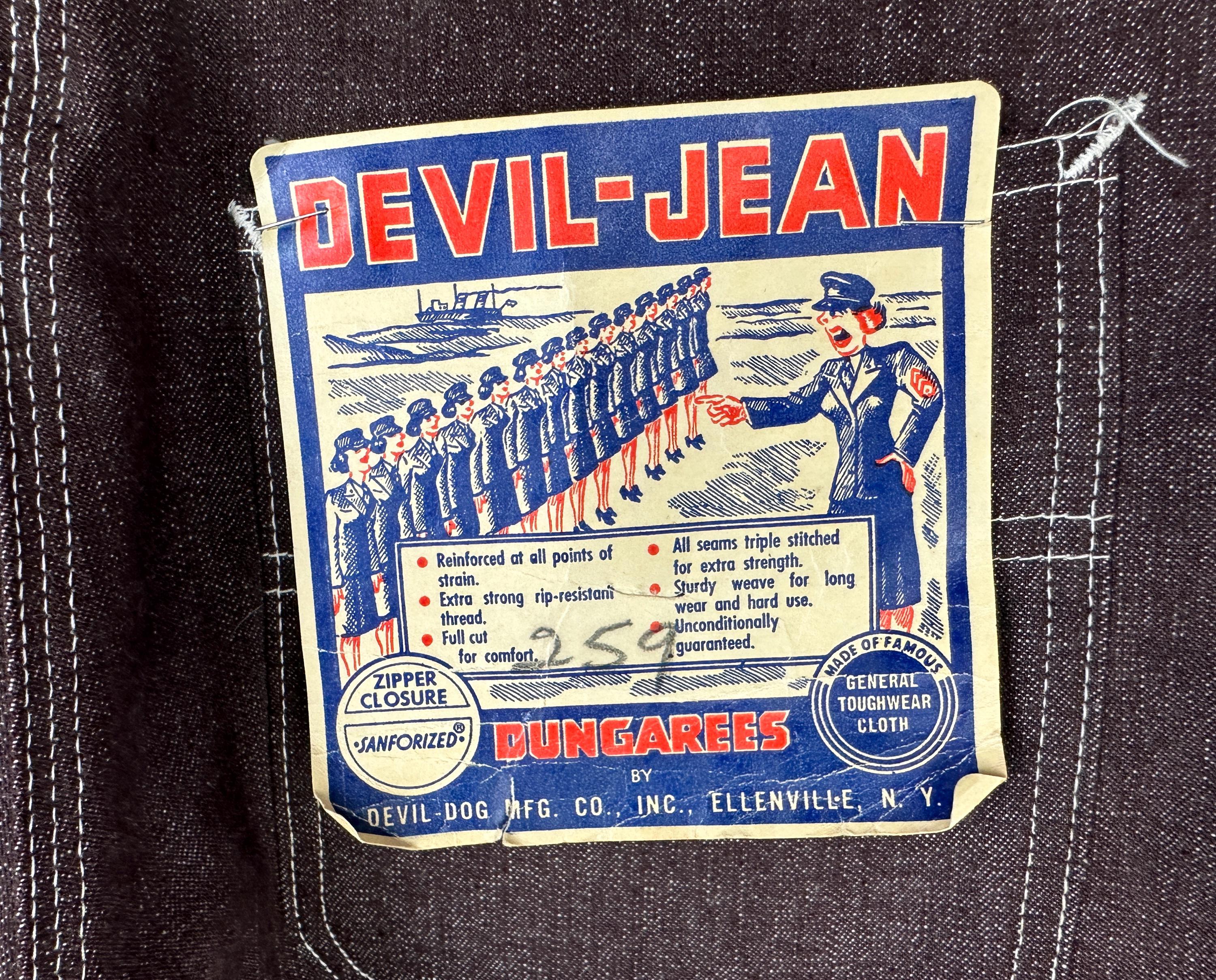 Dare to be active while being your stylish self in these deadstock 1950s jeans! You'll be the first to don these "Devil-Dog" jeans made of cotton denim in a unique shade of walnut brown. They feature white top stitching, four roomy pockets, silver rivets, and "Devil-Dog" branded snap fastener. Brass side zip is hidden in the left hand pocket. These snazzy jeans still have the original tags attached and with such fun branding they really standout as a premier NOS piece! These jeans are in excellent vintage condition, with no holes, stains, odors to note.