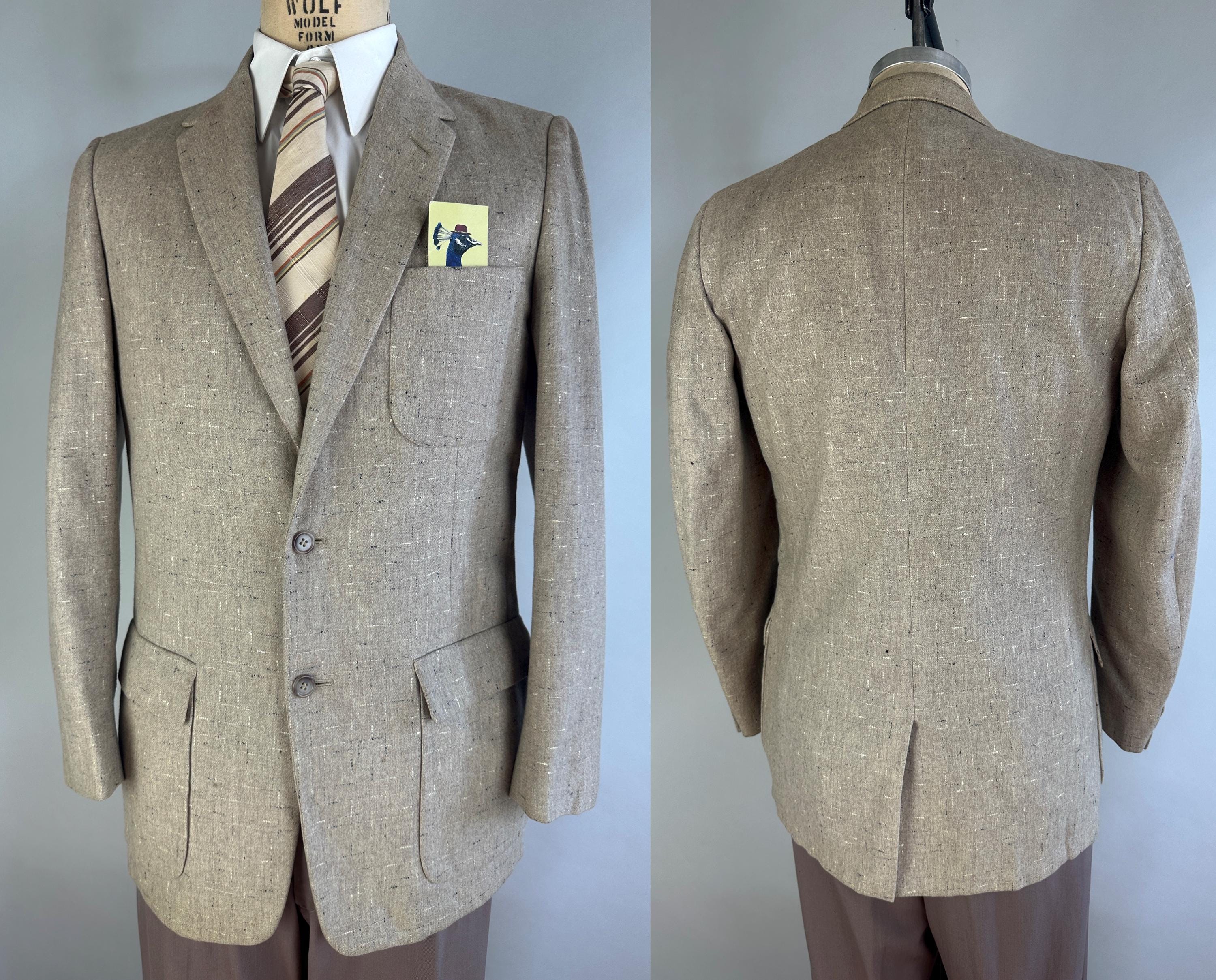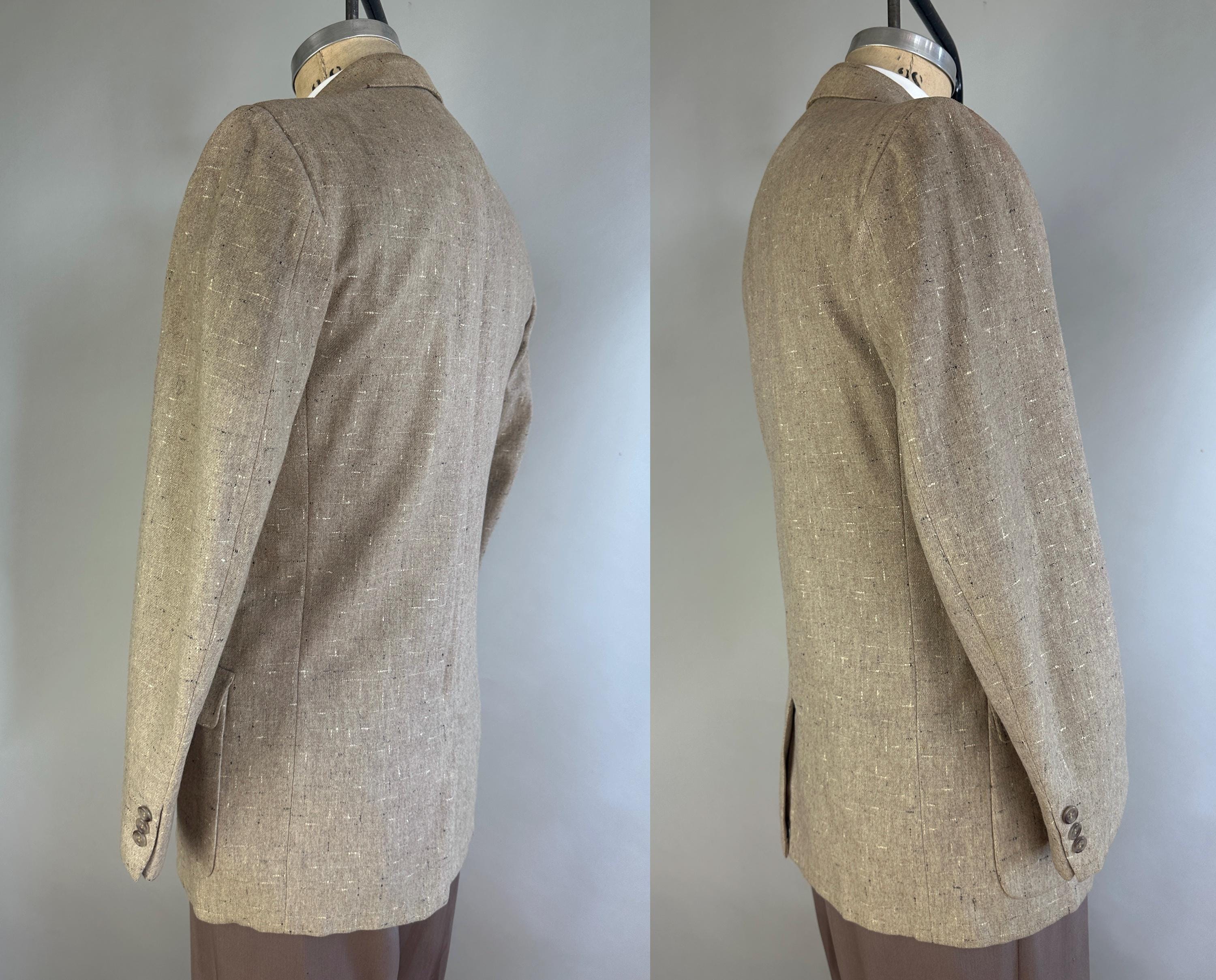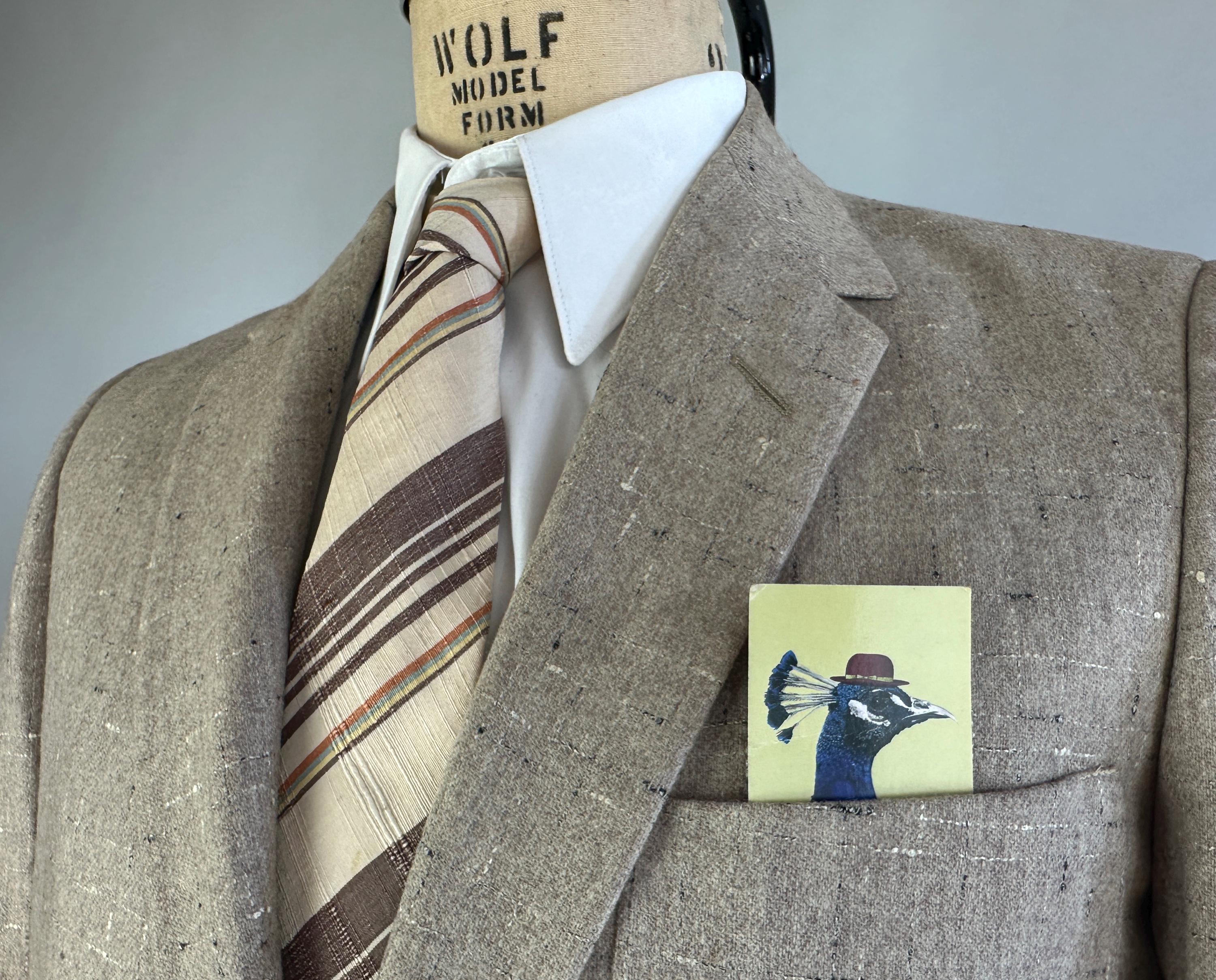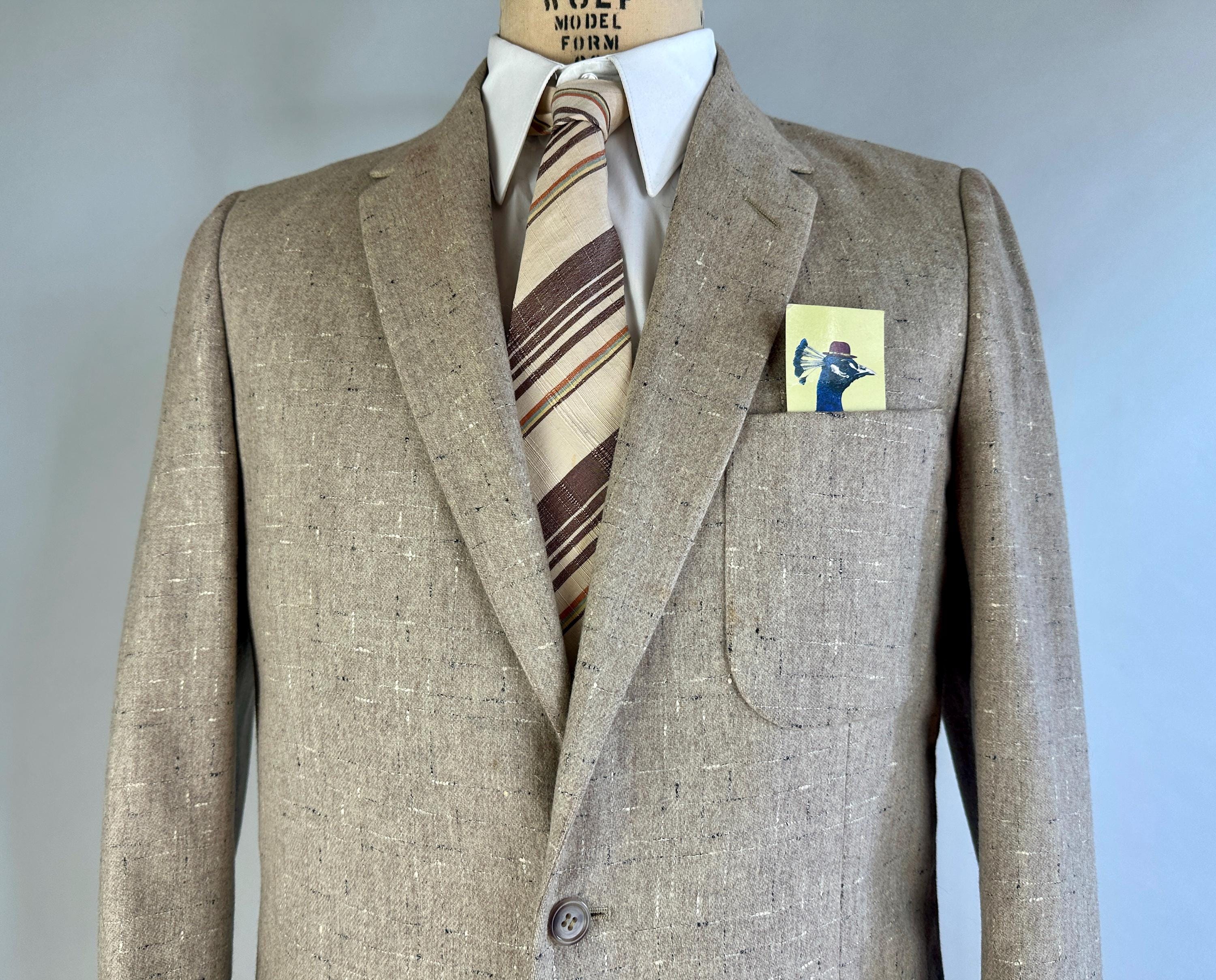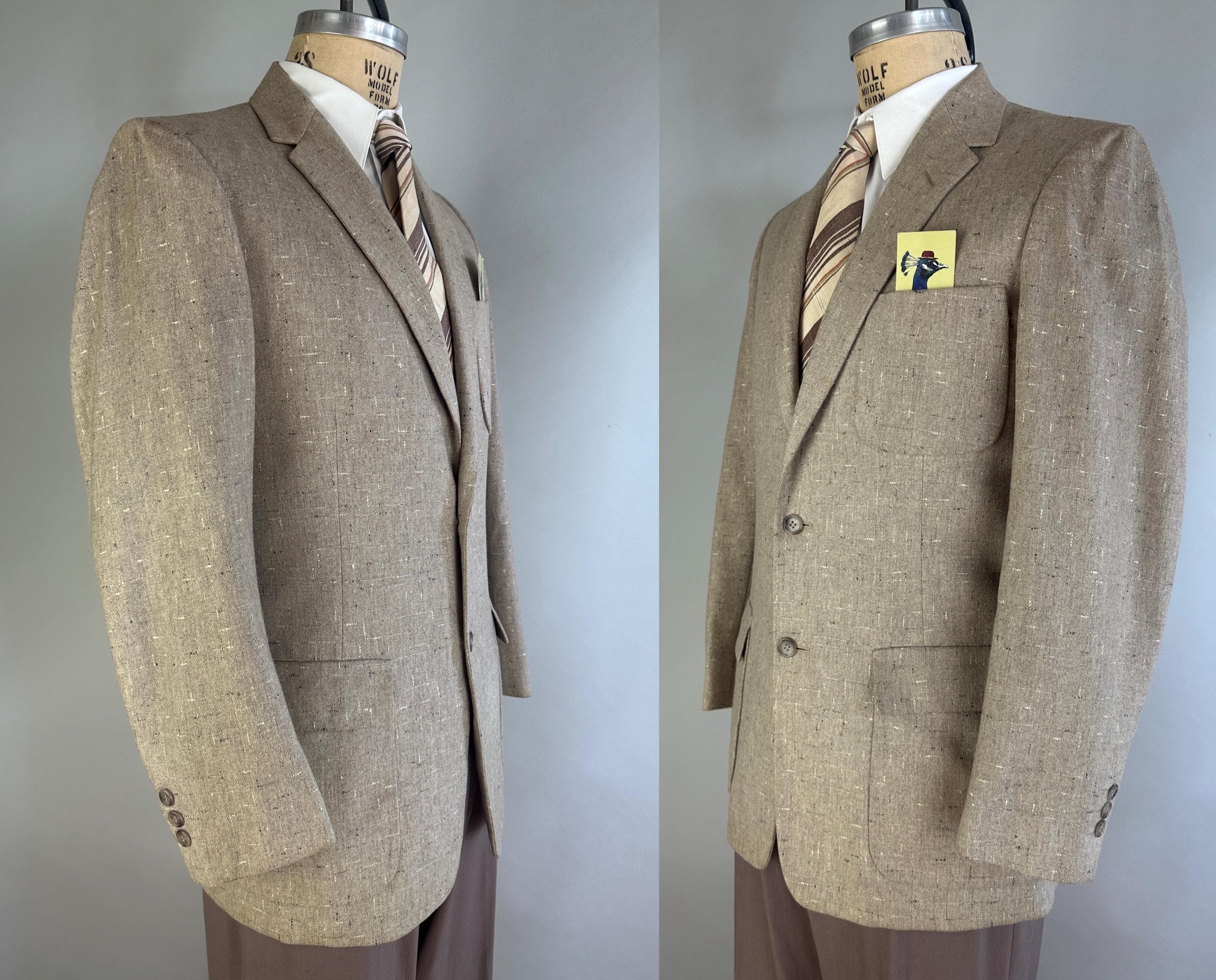 Make a fabulous fashion statement by pairing this 1950s sport coat with everything from the casual to the dinner date! Made of wool in taupe and flecked with black and white in a subtle cross hatch pattern, perfect neutrals for carefree matching. Single breasted with two button closure, it features details such as notch lapels, patch chest pocket, flapped patch hip pockets, single vent, shoulder pads, and butterfly lining with two inner pockets. Labeled “Gentry Penney's" and includes a 1949-62 Union Label dating this jacket to the 1950s. This sport coat is in great vintage condition, with a small very very faint small smudge and no holes nor odors to note.