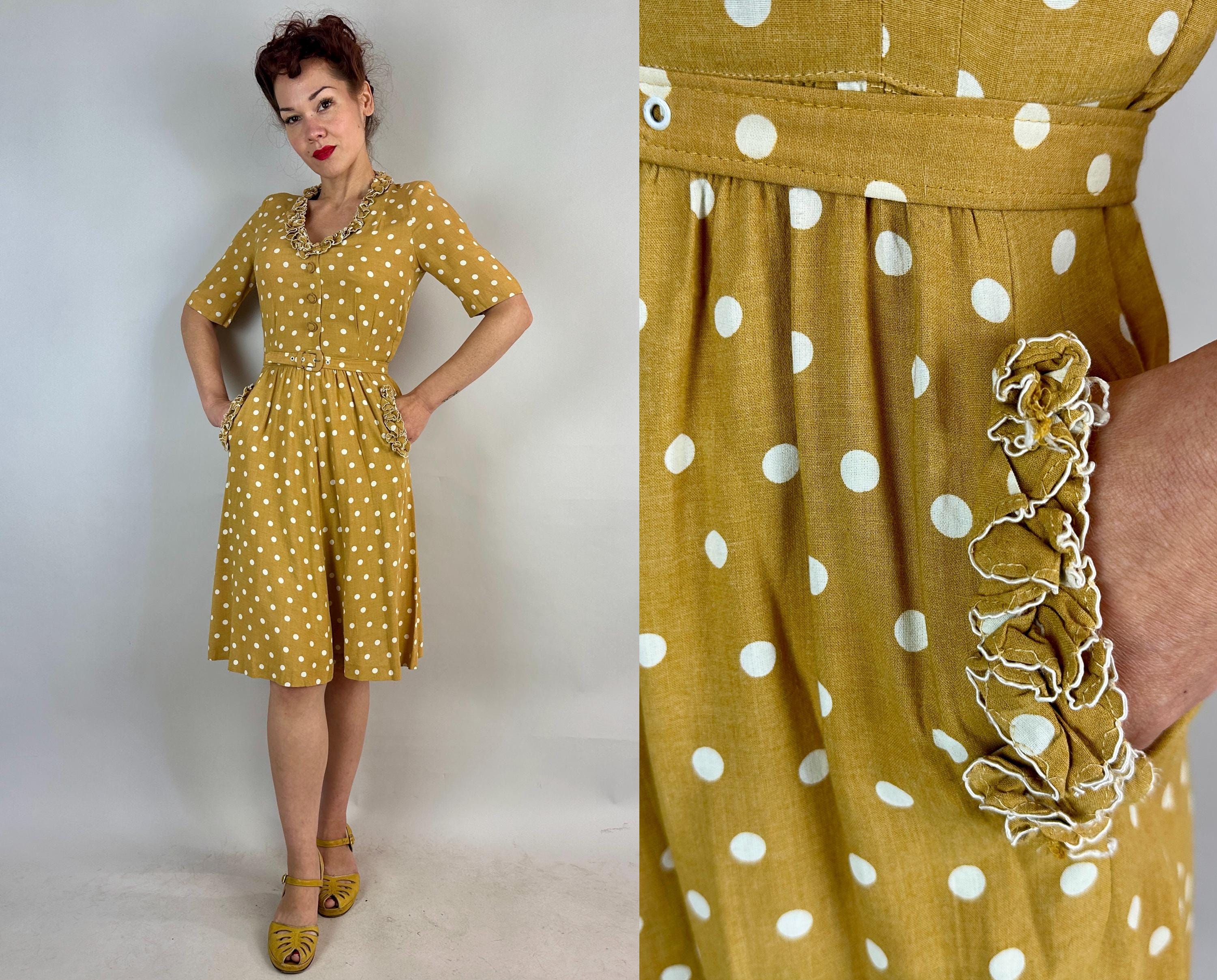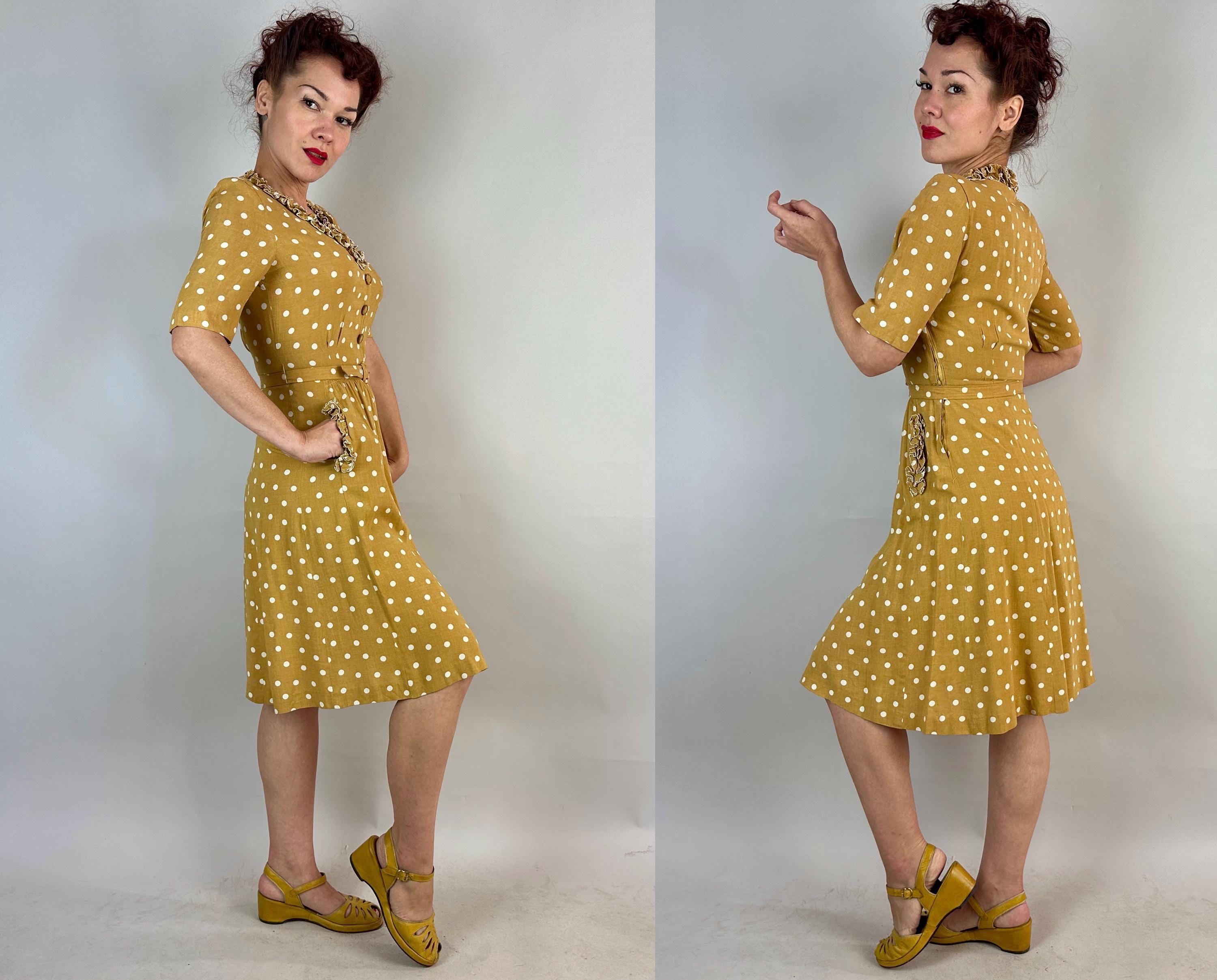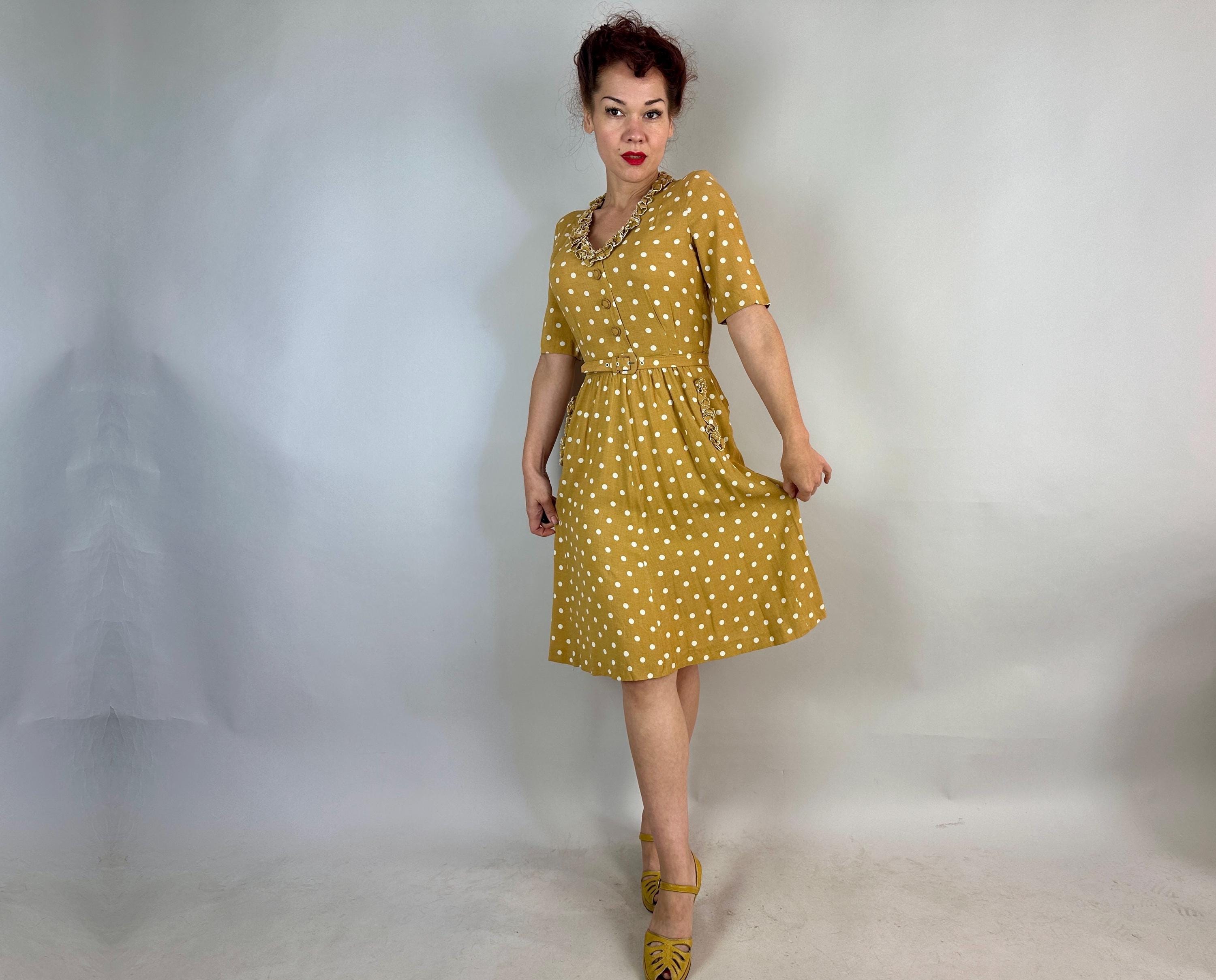 You'll have more moxie than the spiciest French mustard in this 1930s dress! Mustard yellow cotton with white polkadots looks extra cute with it's trim of white piped ruffles around the V-neck and skirt pockets . A lovely silhuoette is created with padded shoulders, pleated waist darts, and smocking below the waistline. Matching self belt pulls it all together. Buttons fasten on the side while self fabric buttons make decoration on the bodice. This dress is in great vintage condition with no holes, stains, odors to note.