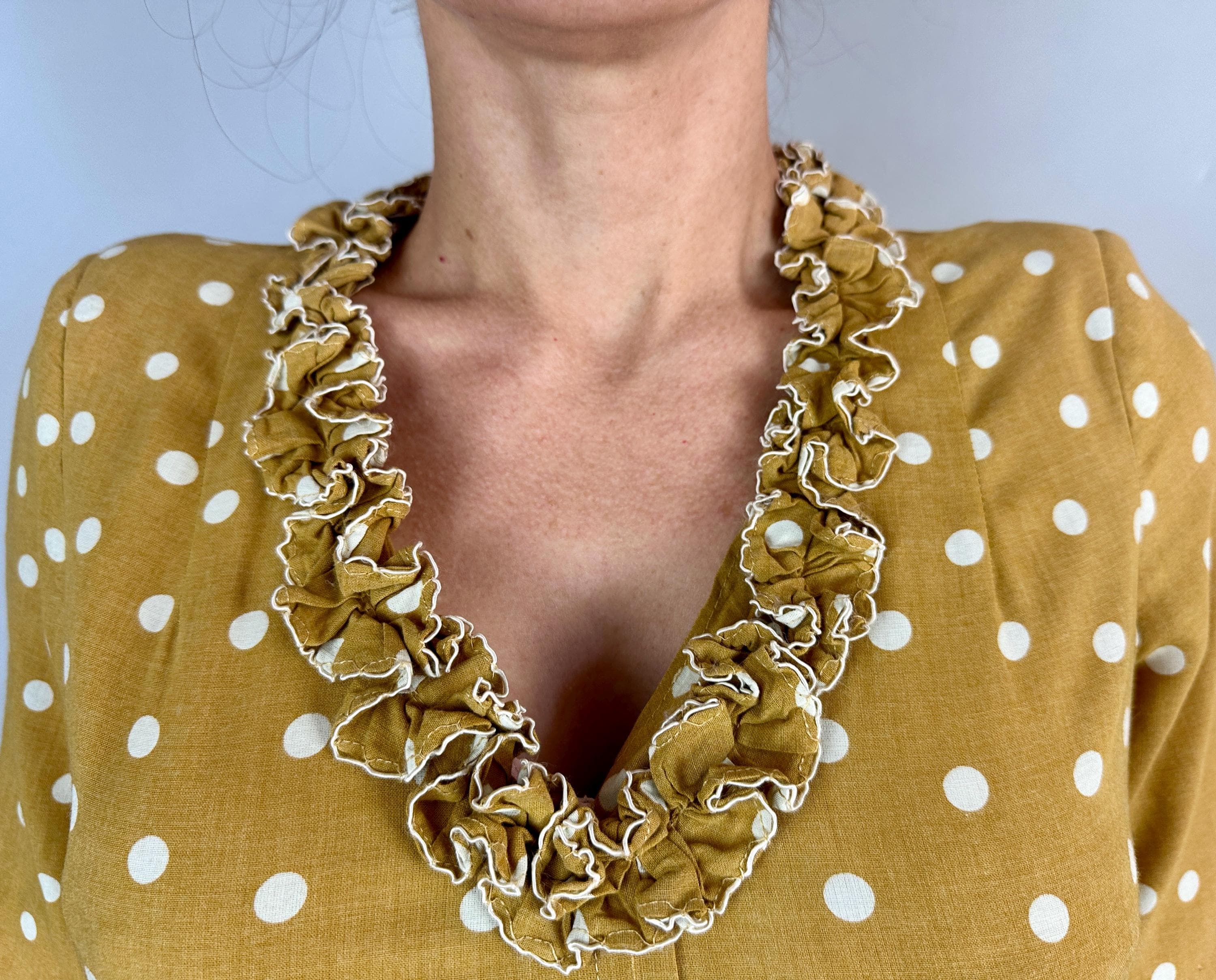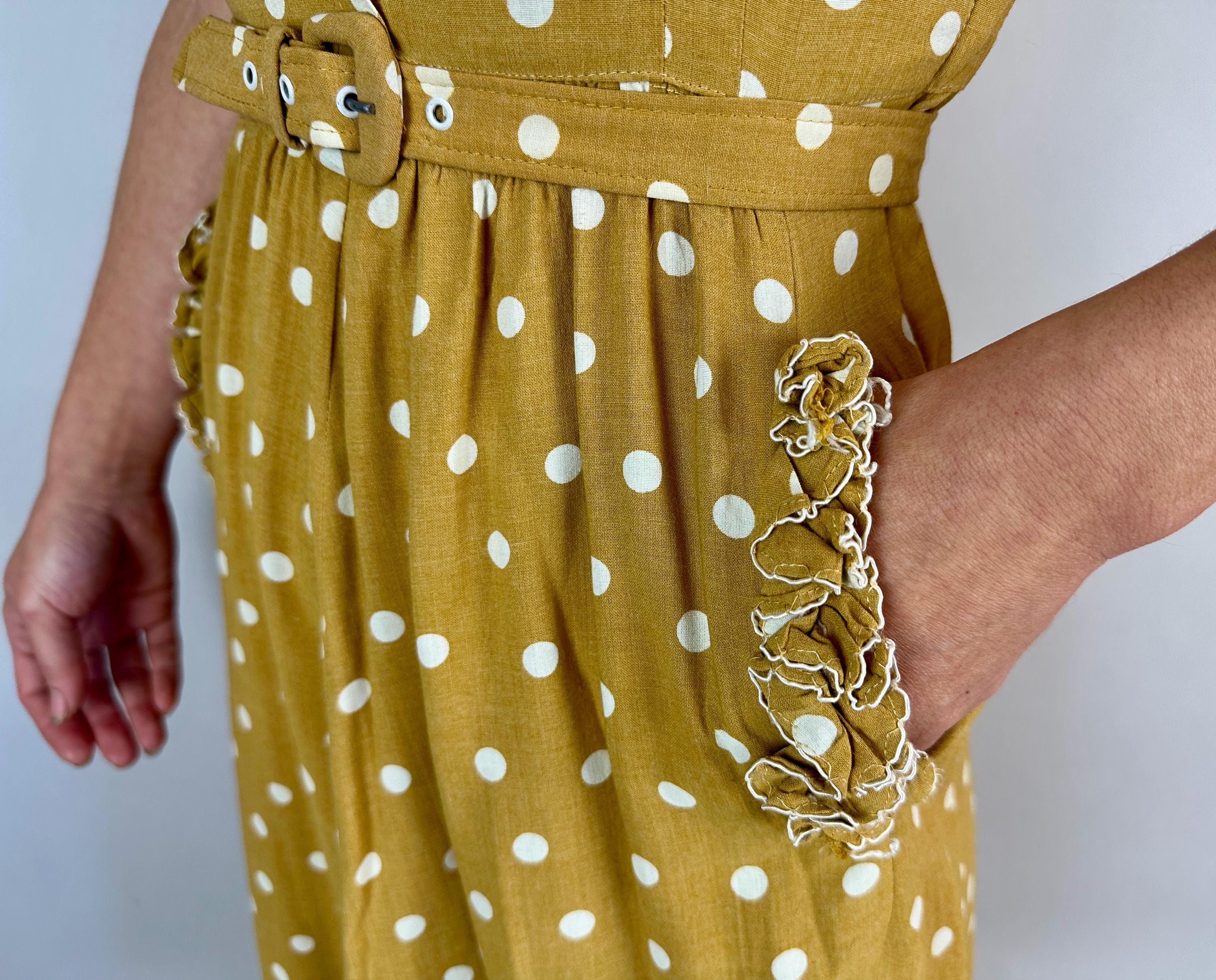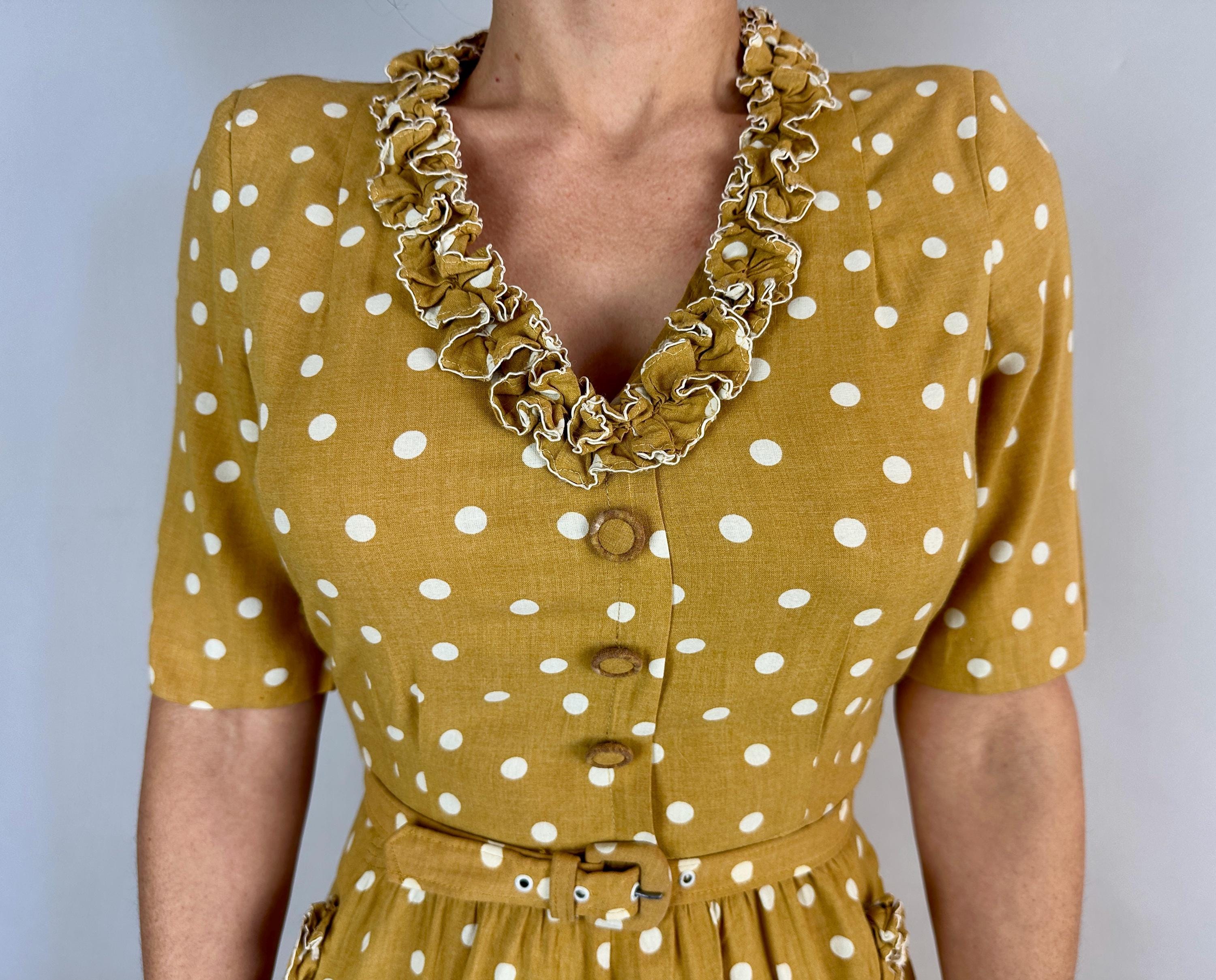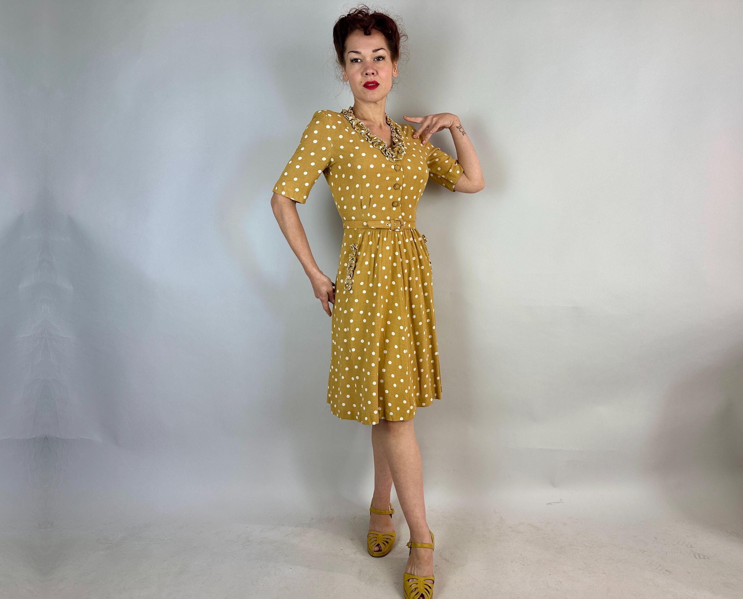You'll have more moxie than the spiciest French mustard in this 1930s dress! Mustard yellow cotton with white polkadots looks extra cute with it's trim of white piped ruffles around the V-neck and skirt pockets . A lovely silhuoette is created with padded shoulders, pleated waist darts, and smocking below the waistline. Matching self belt pulls it all together. Buttons fasten on the side while self fabric buttons make decoration on the bodice. This dress is in great vintage condition with no holes, stains, odors to note.