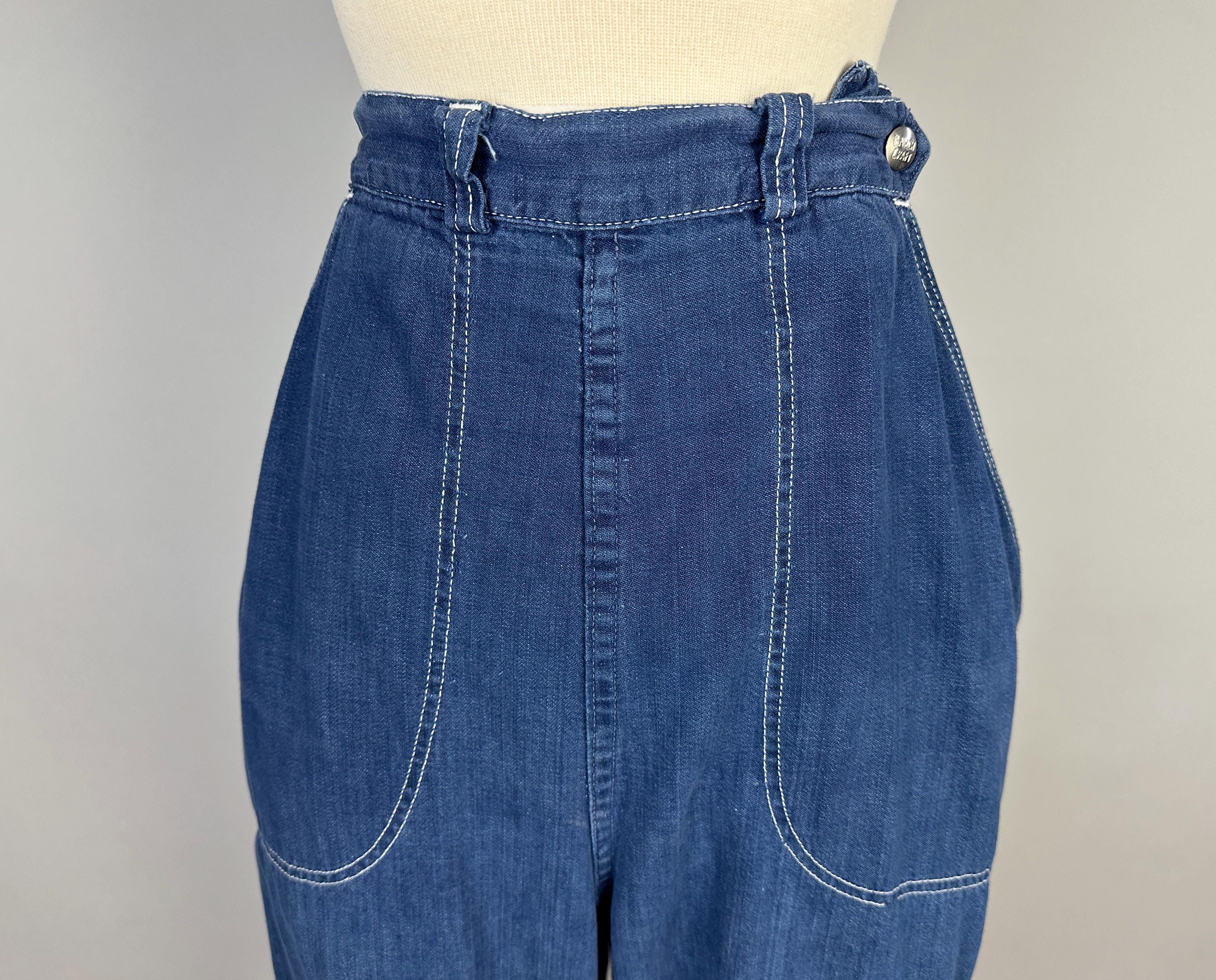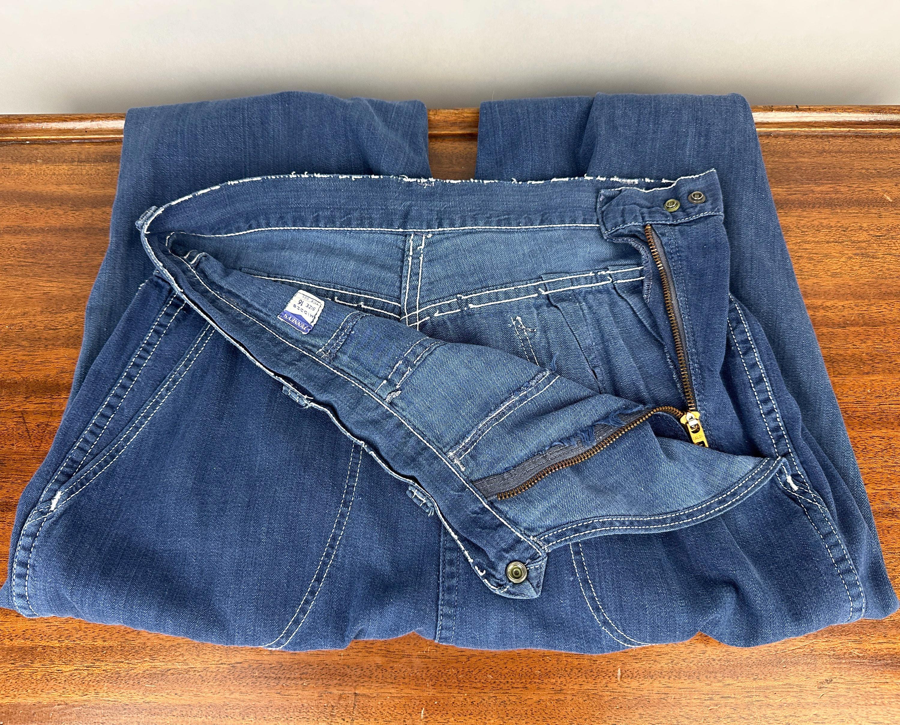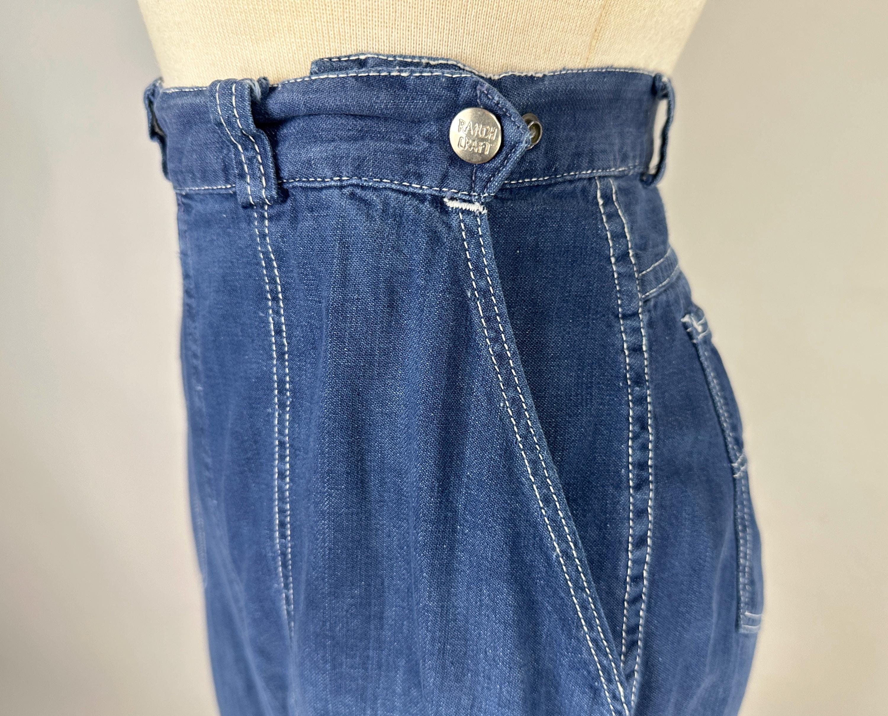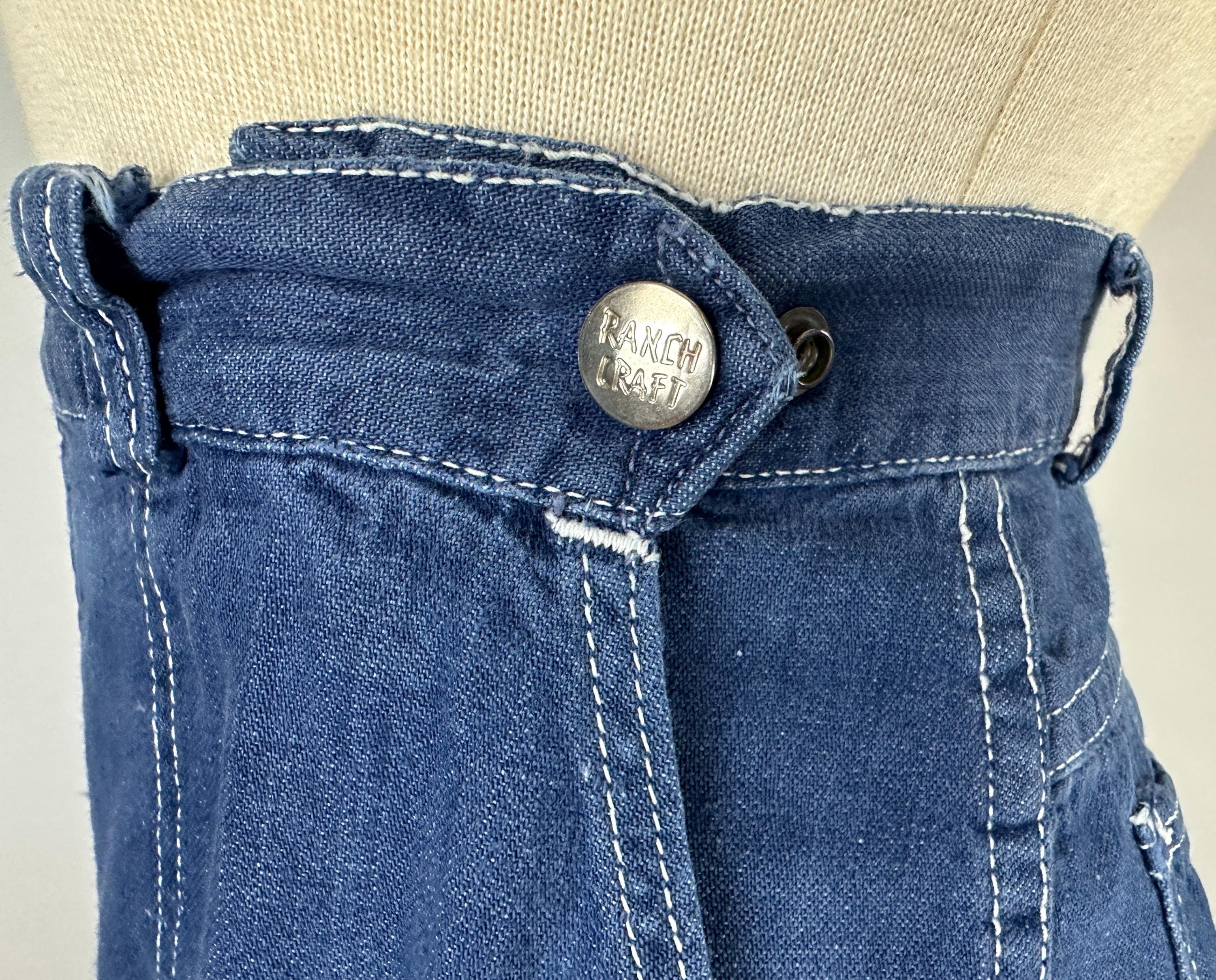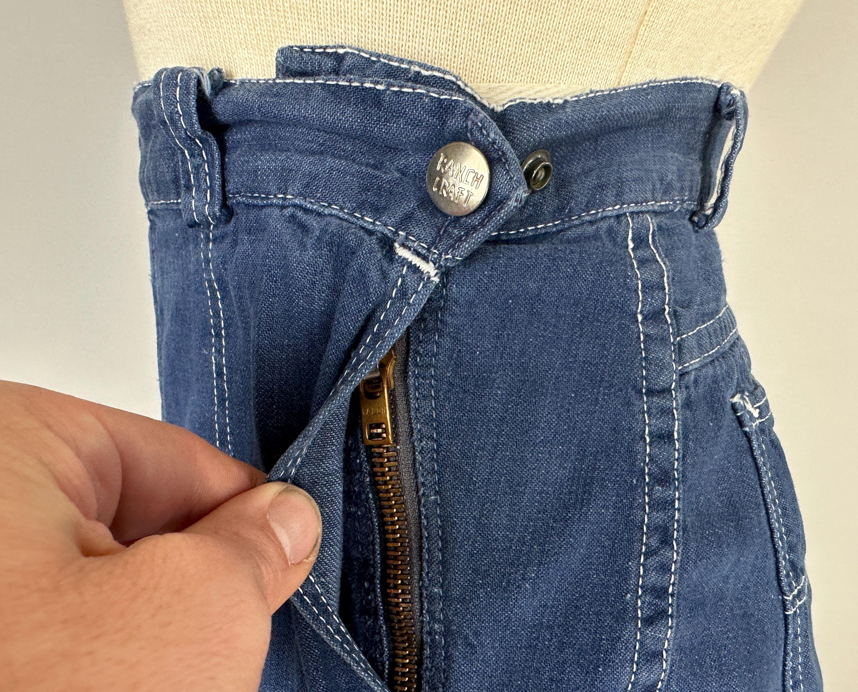 These 1950s jeans were made for ranch life and dance life! Indigo cotton denim is perfectly broken in and soft. The top stitching is bold, bright white and they have four roomy pockets, belt loops, snap fastener with two size options and metal zipper on the side. Branded "Ranch Craft". These jeans are in great vintage condition, top stitching on the waist is a bit frayed but no stains, holes, or odors to note.