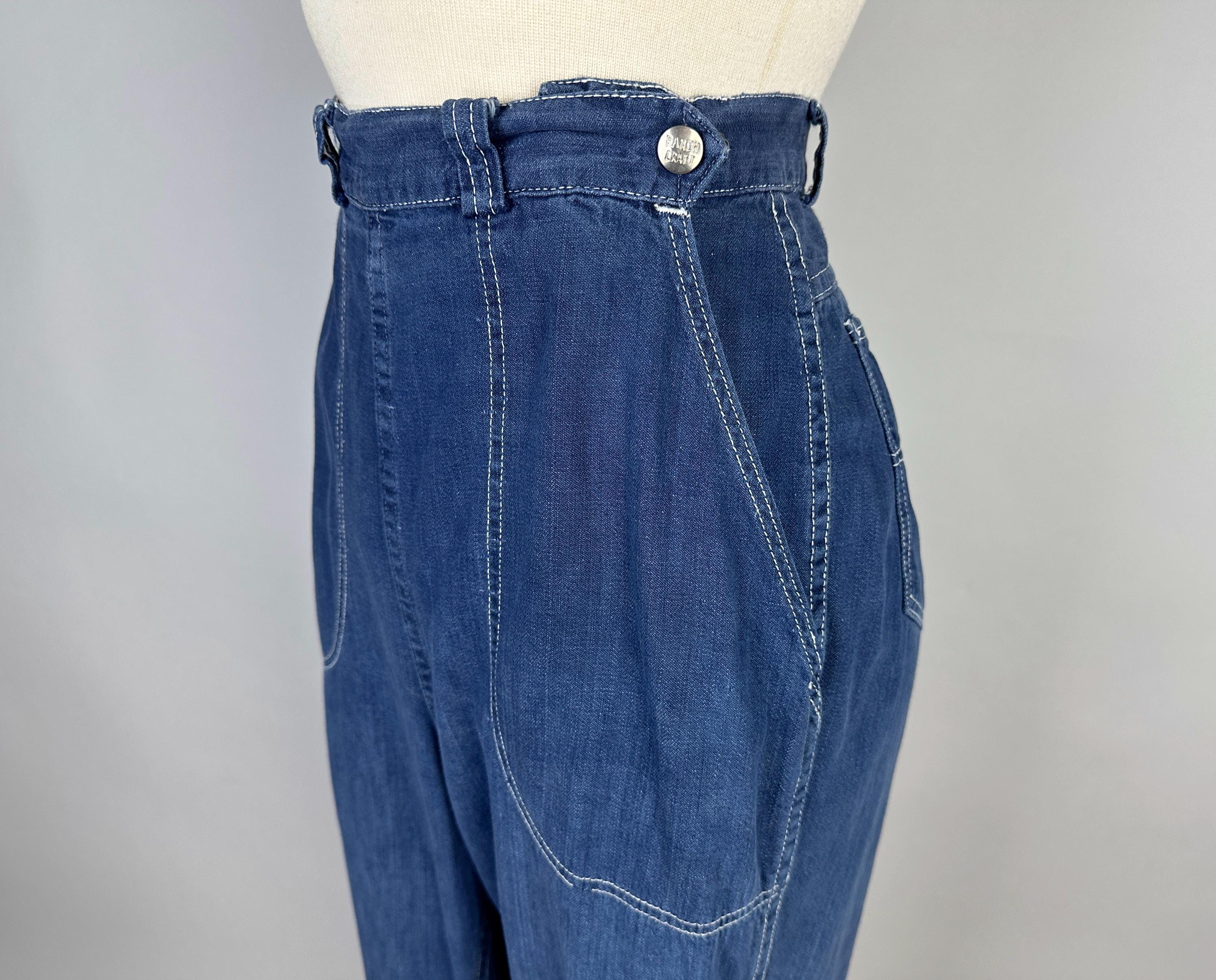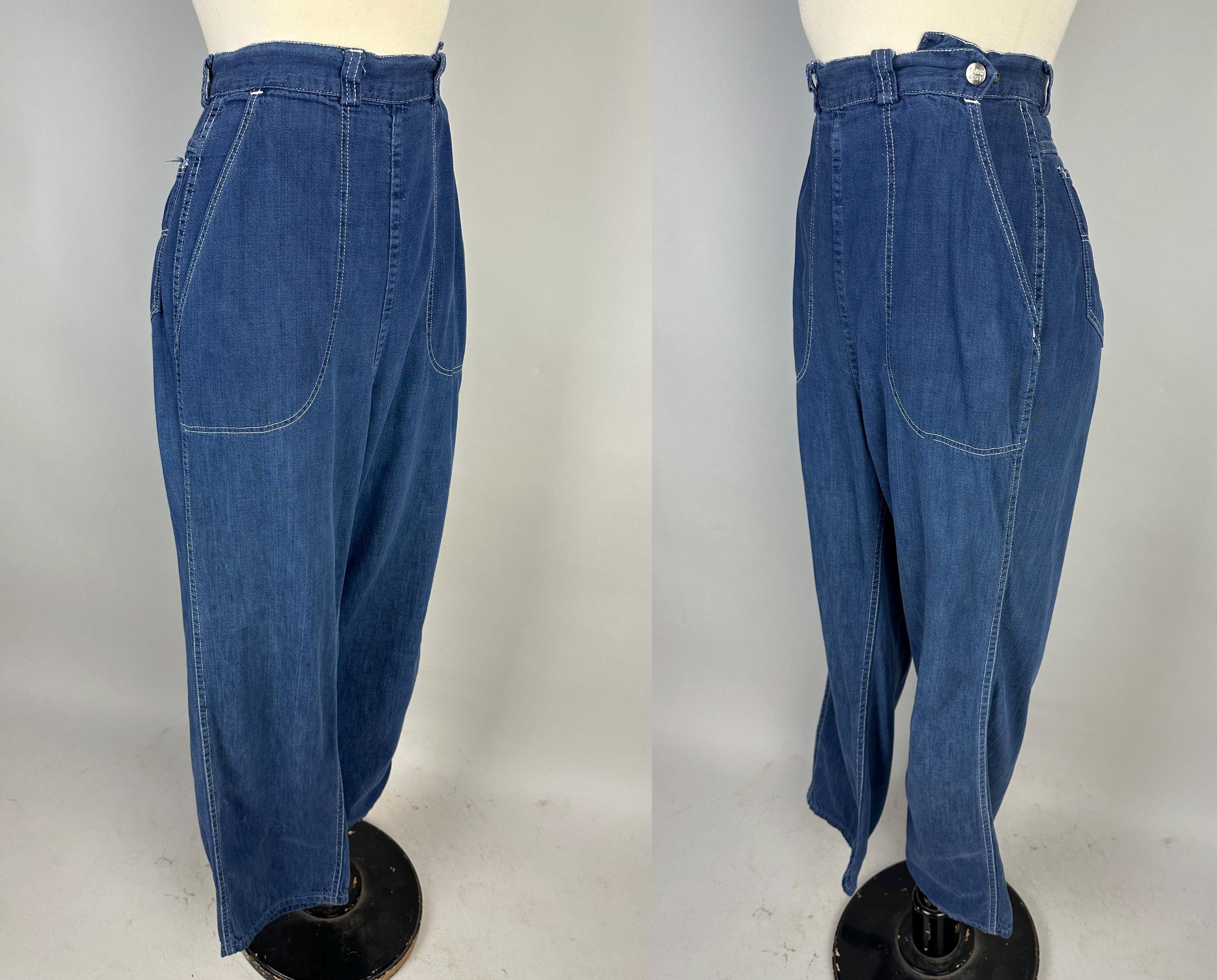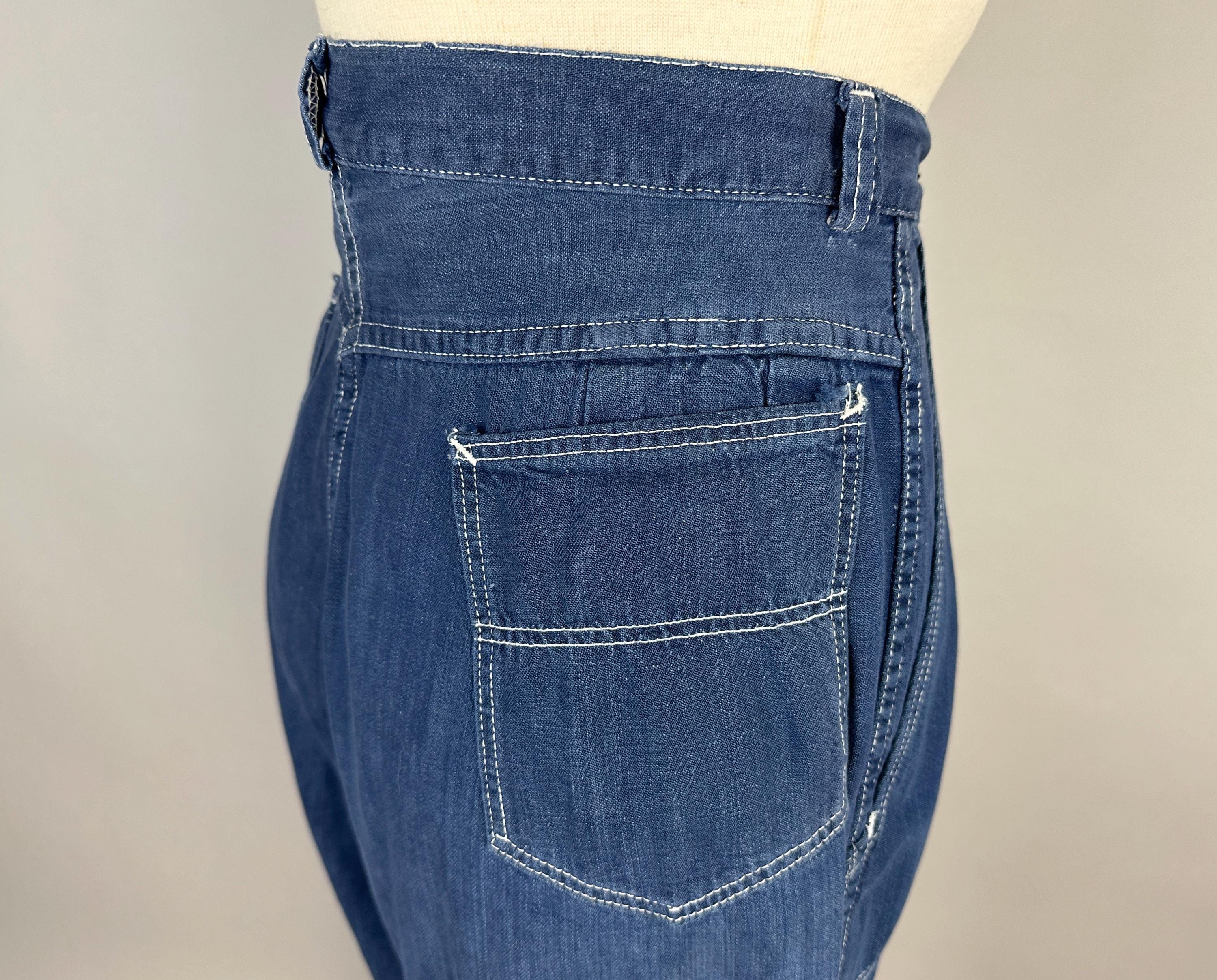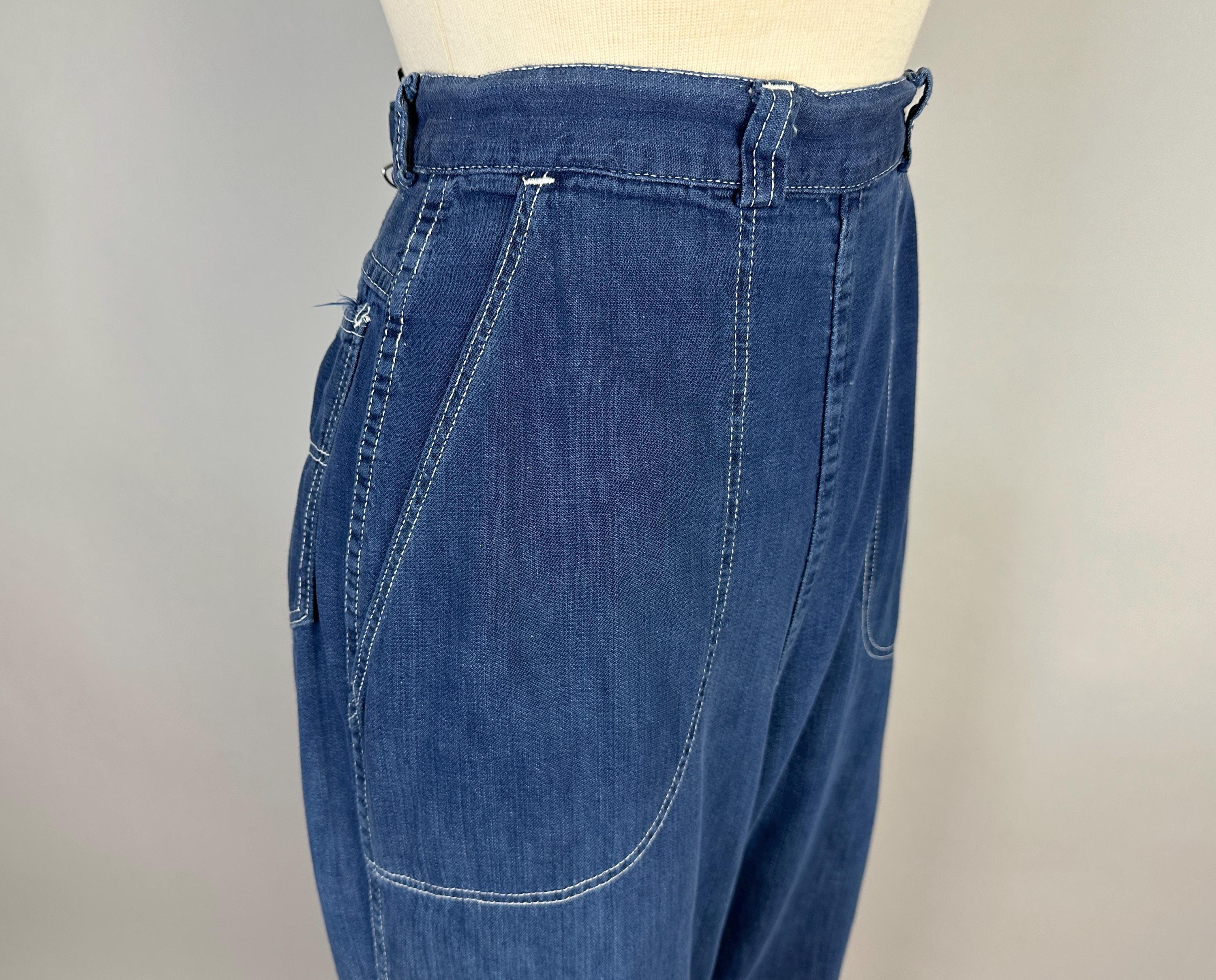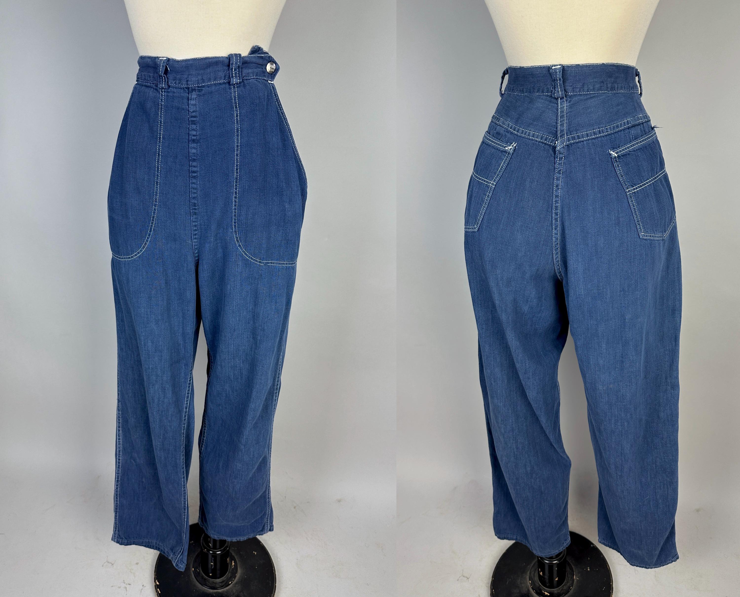These 1950s jeans were made for ranch life and dance life! Indigo cotton denim is perfectly broken in and soft. The top stitching is bold, bright white and they have four roomy pockets, belt loops, snap fastener with two size options and metal zipper on the side. Branded "Ranch Craft". These jeans are in great vintage condition, top stitching on the waist is a bit frayed but no stains, holes, or odors to note.