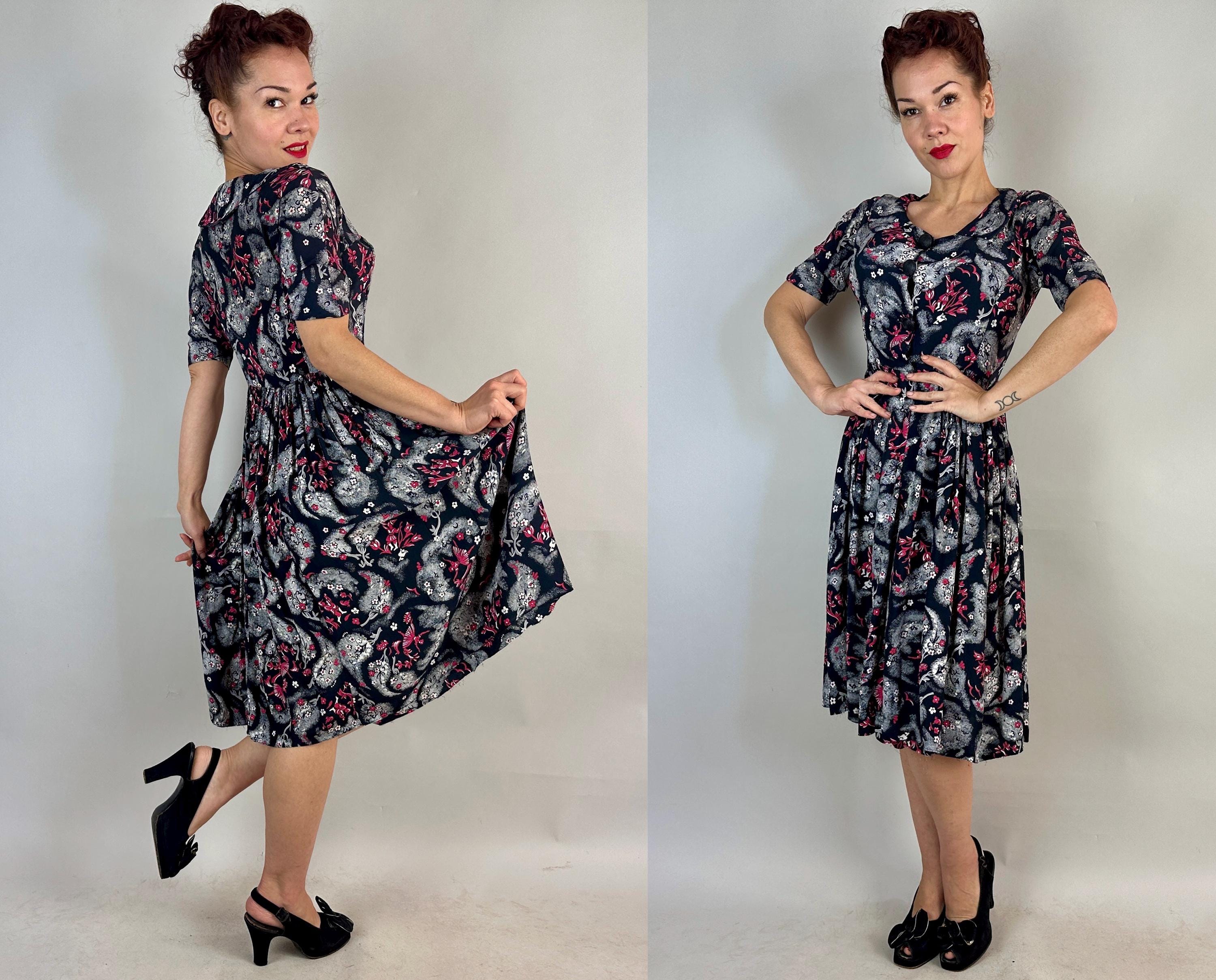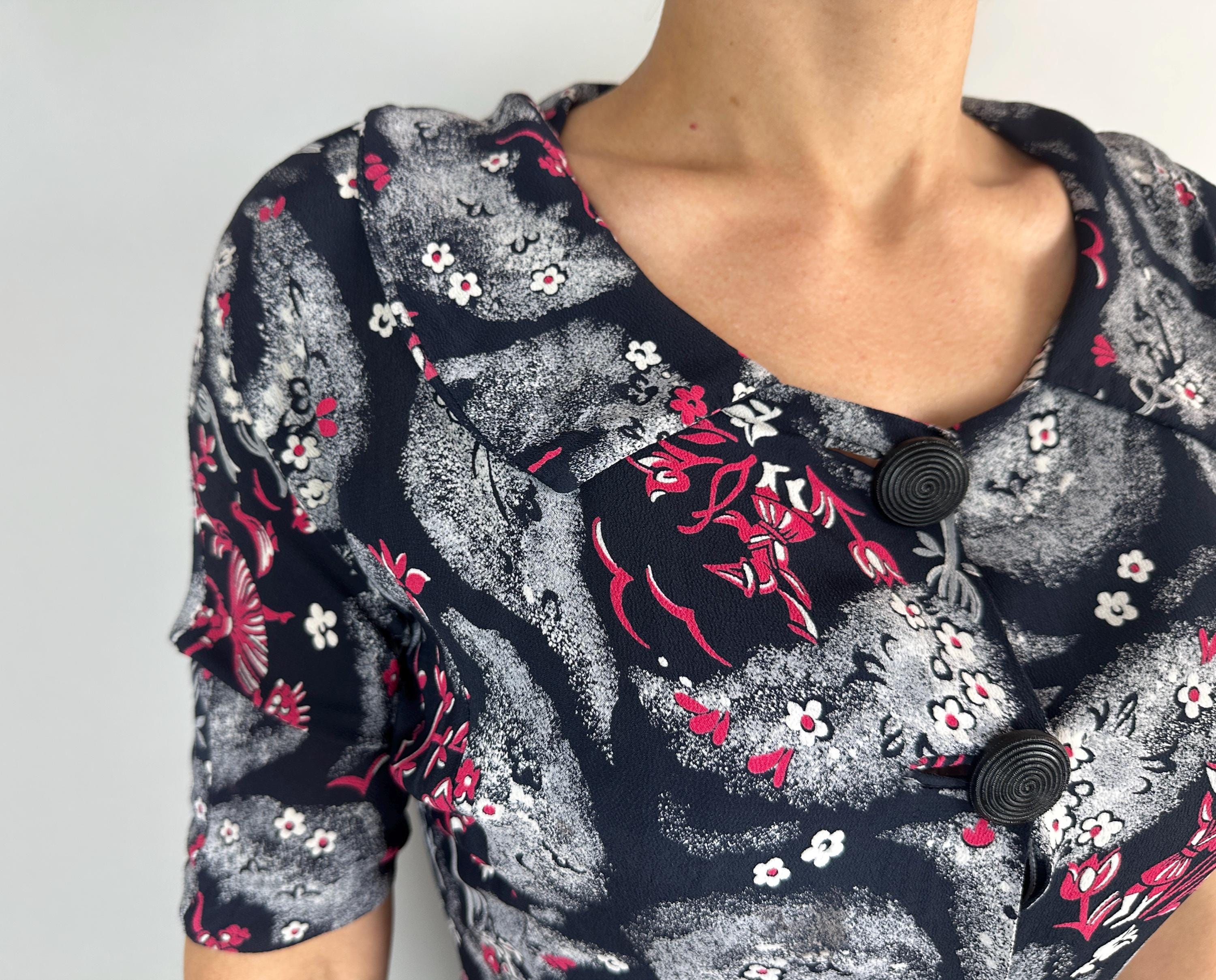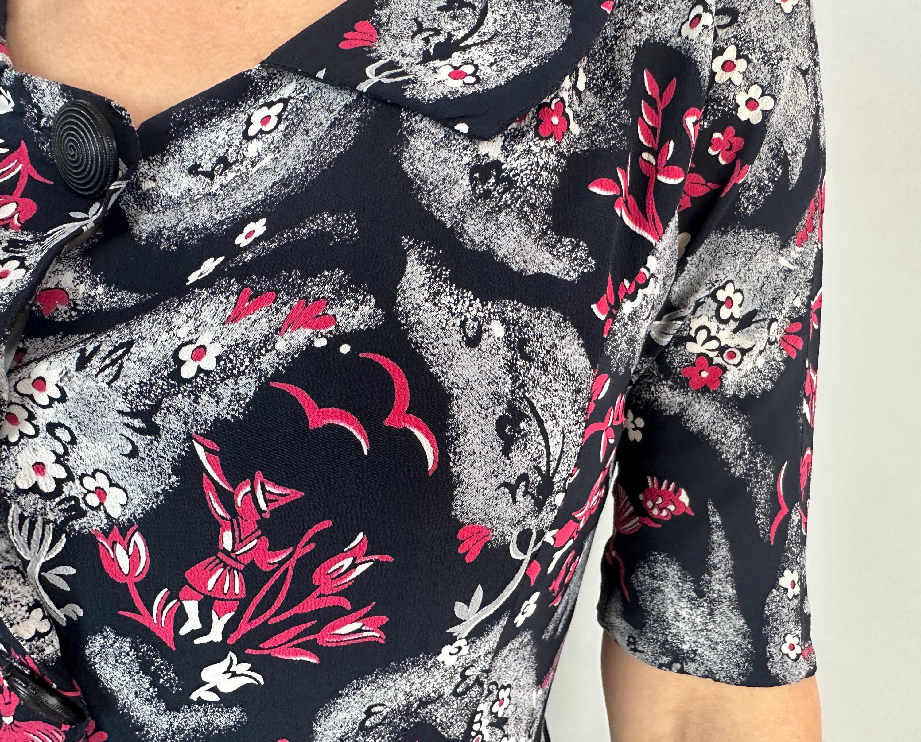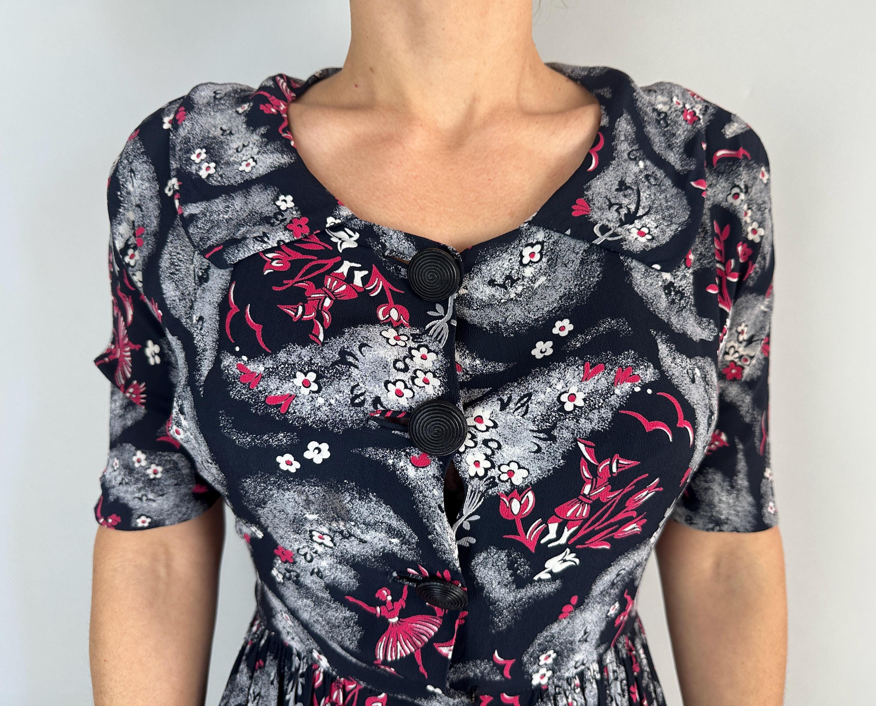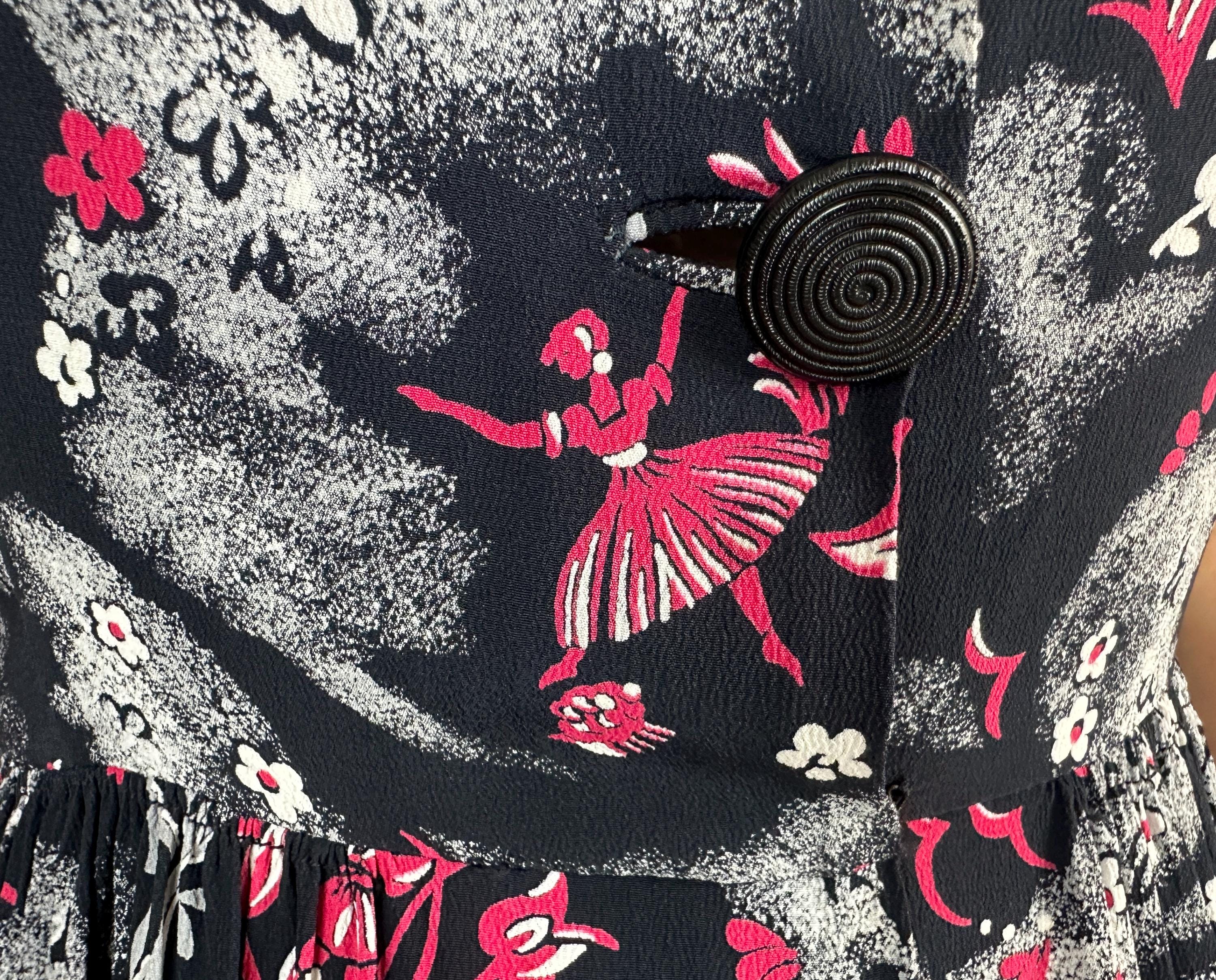 A matinee at the ballet will be extra delightful in this 1940s novelty print dress! Made of black rayon crepe with smokey grey trees in a sponged style allows the white and hot pink ballerinas, musicians, birds, and flowers really pop. The shirtwaist fastens with large black spiral buttons and it has elbow length sleeves, pointed Peter Pan collar, and full skirt gathered around the waist. This dress is in great vintage condition, with a small subtle underarm mend but no stains or odors to note.