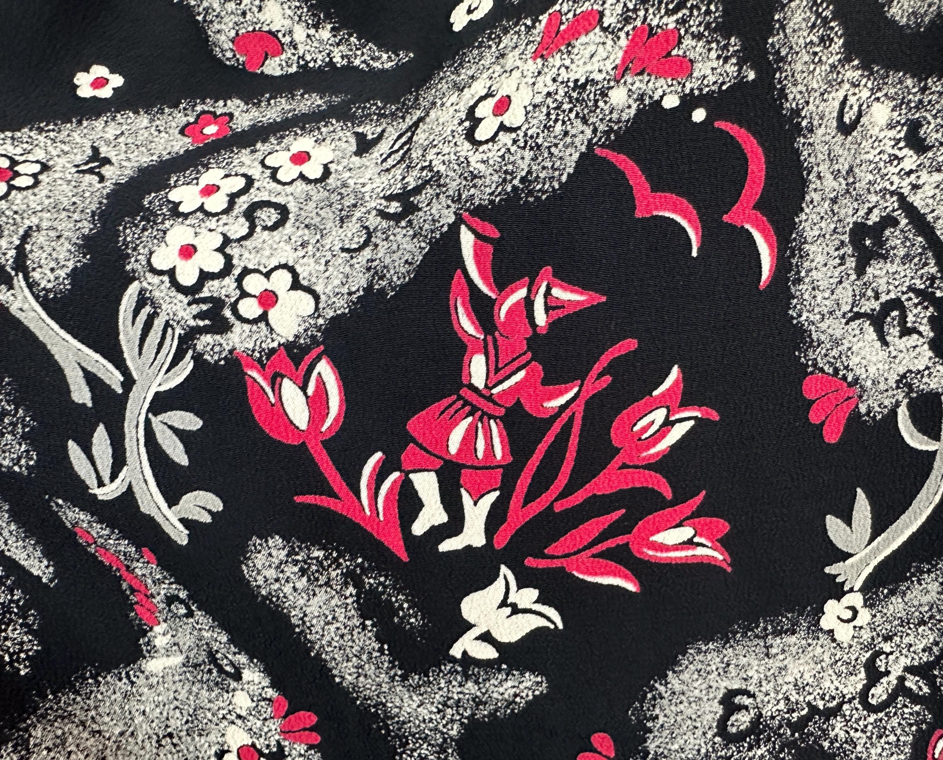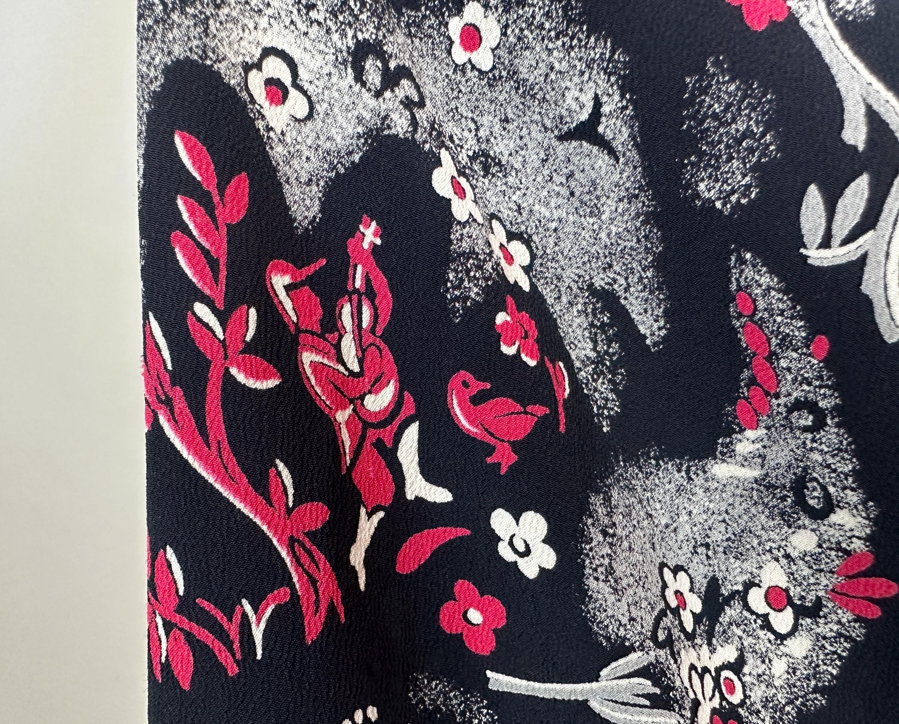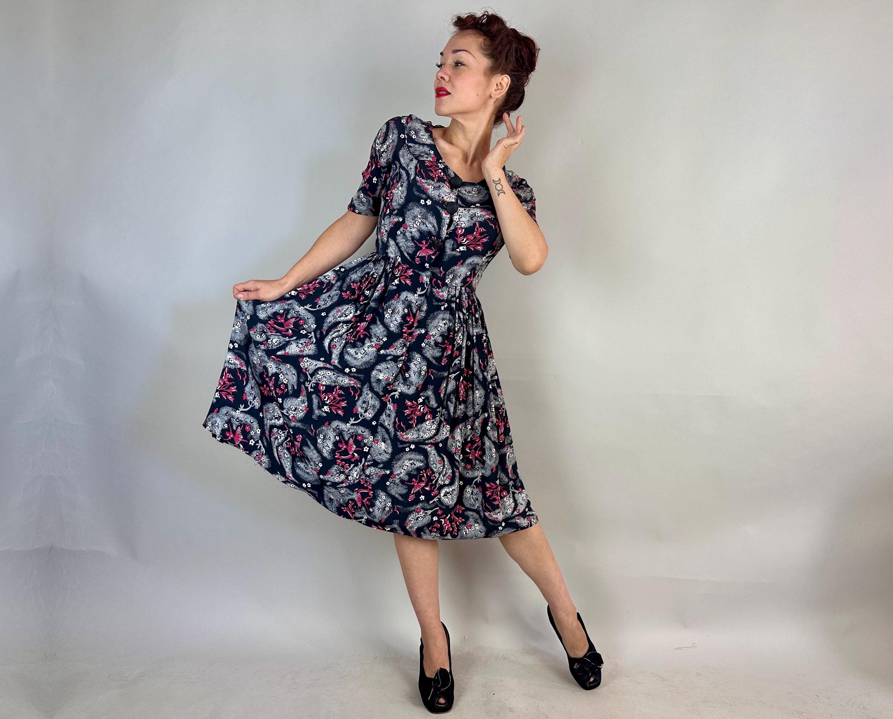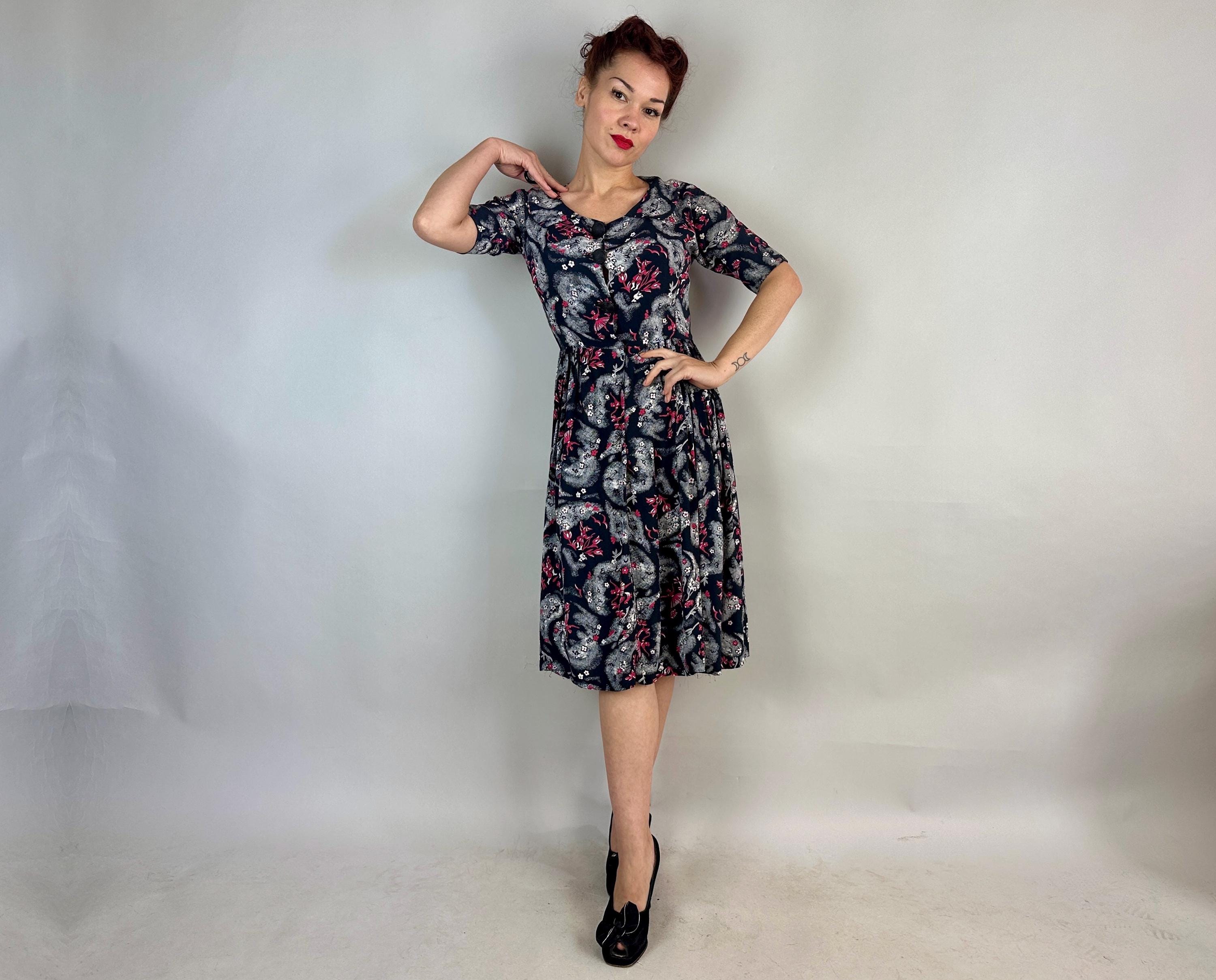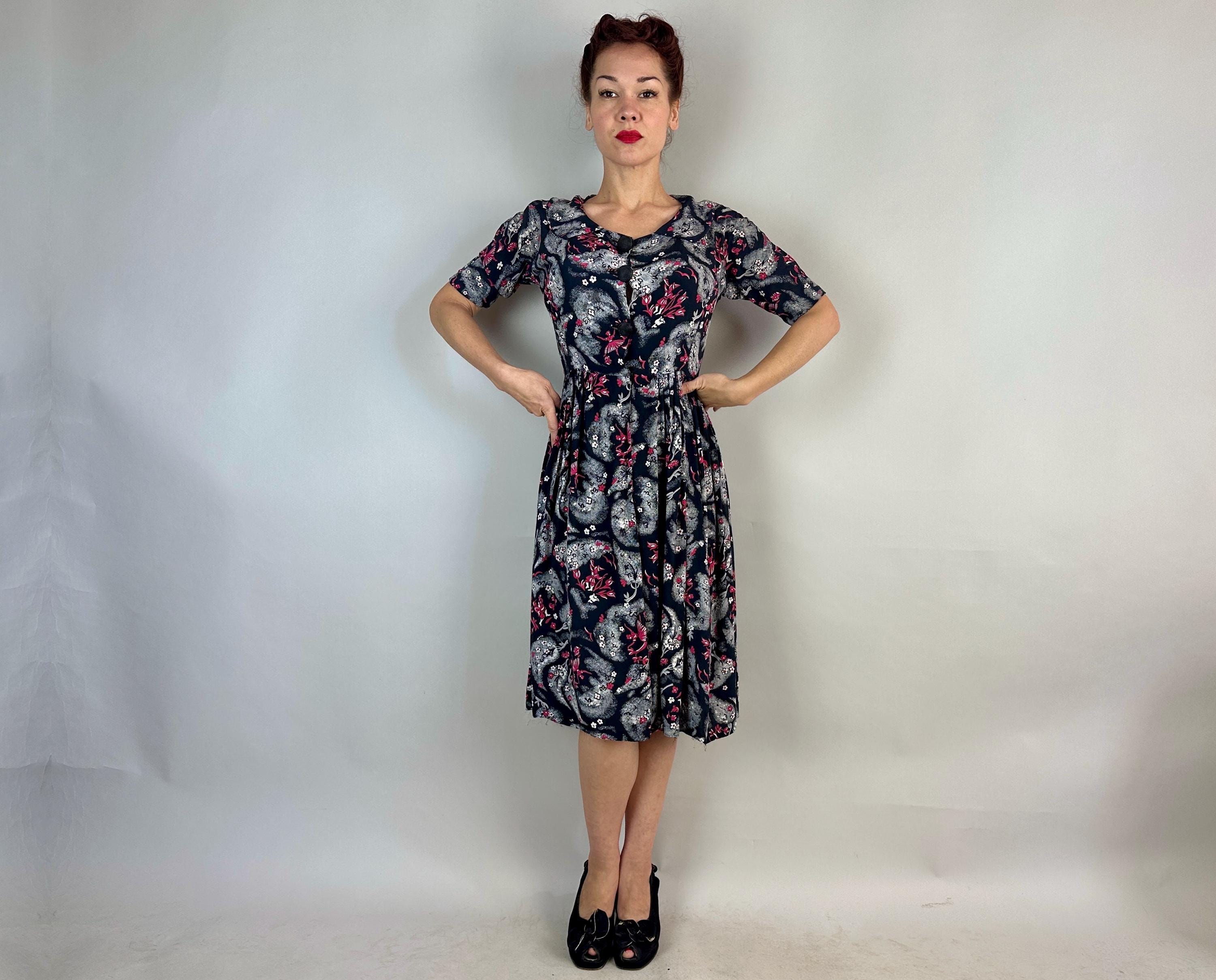 A matinee at the ballet will be extra delightful in this 1940s novelty print dress! Made of black rayon crepe with smokey grey trees in a sponged style allows the white and hot pink ballerinas, musicians, birds, and flowers really pop. The shirtwaist fastens with large black spiral buttons and it has elbow length sleeves, pointed Peter Pan collar, and full skirt gathered around the waist. This dress is in great vintage condition, with a small subtle underarm mend but no stains or odors to note.