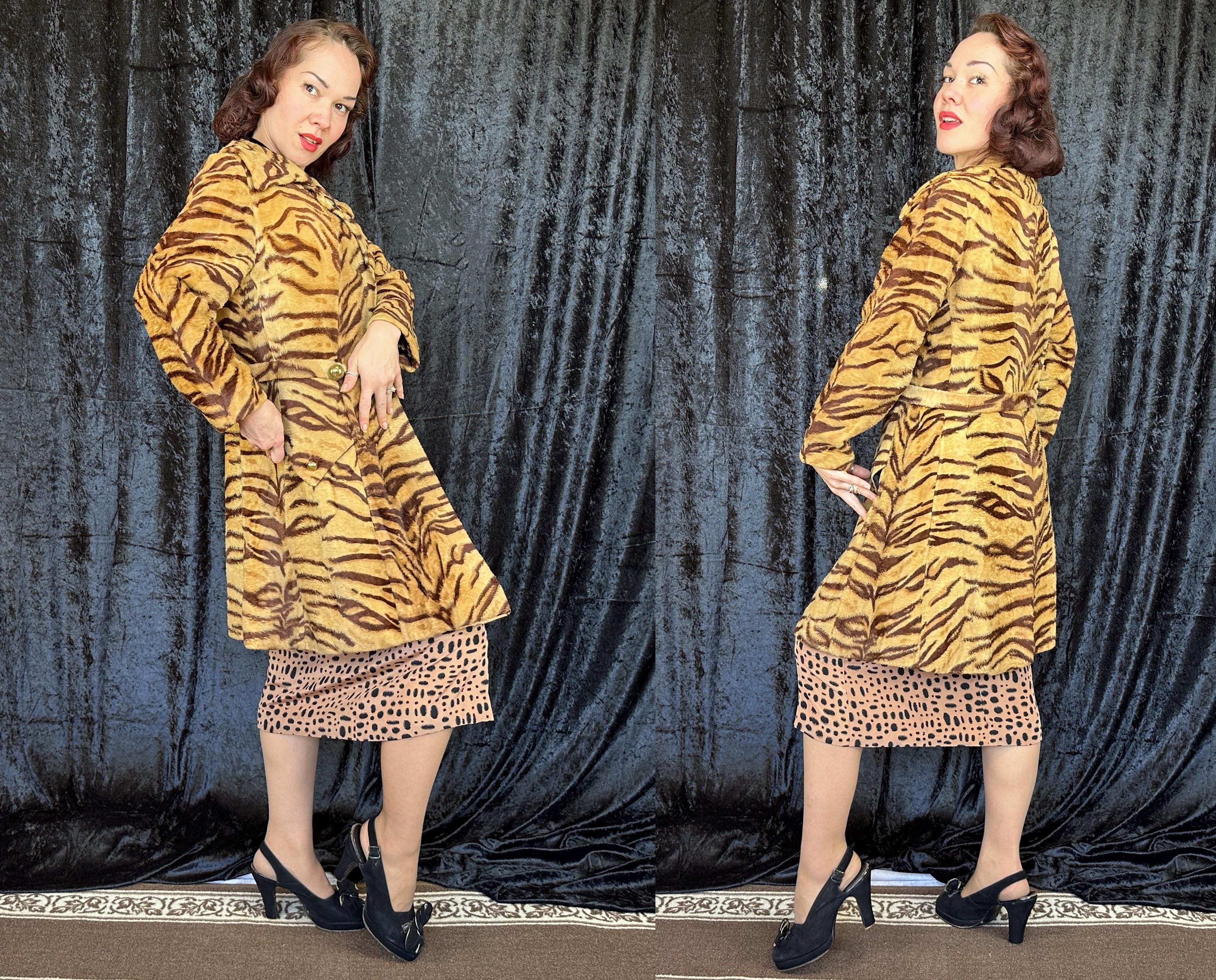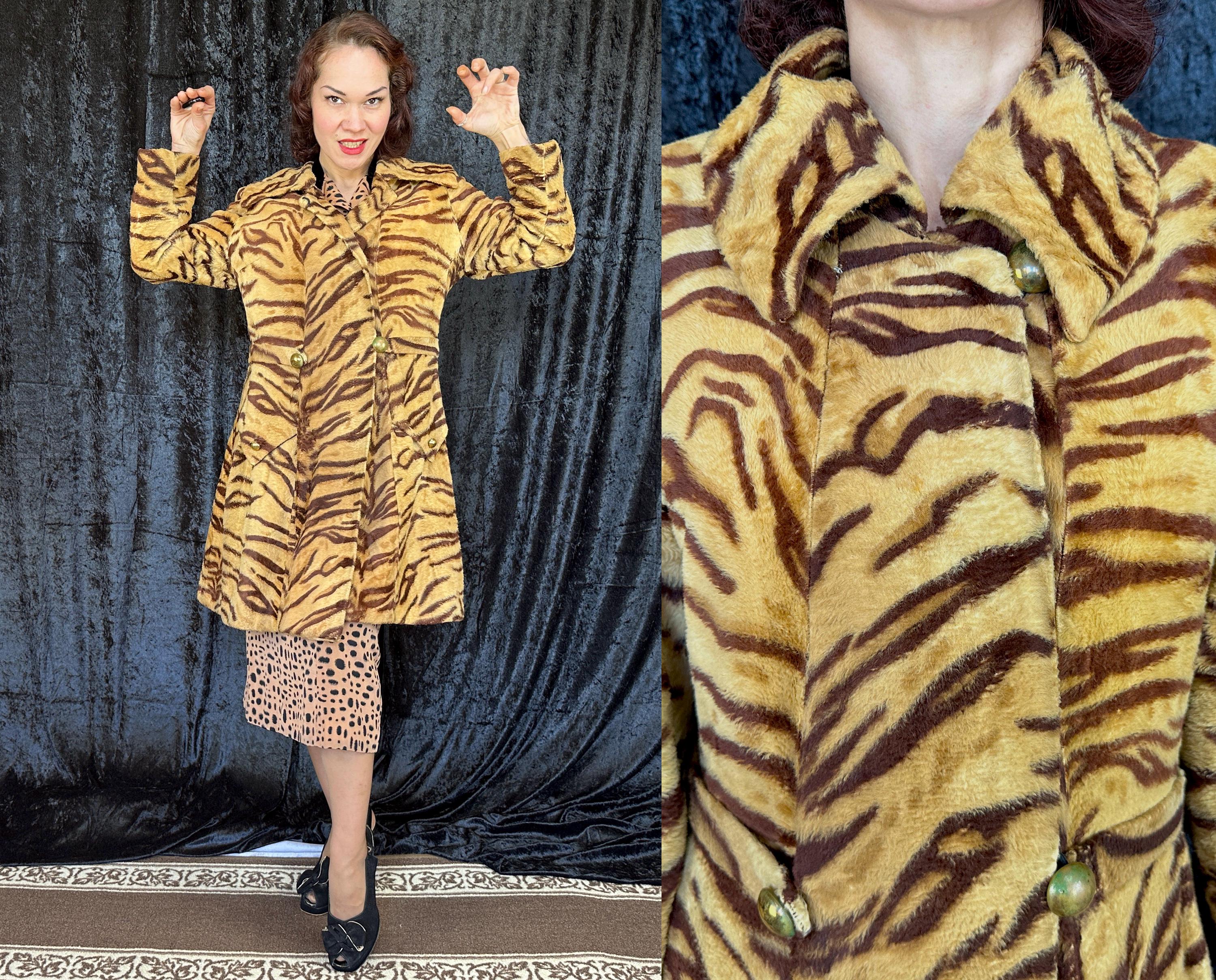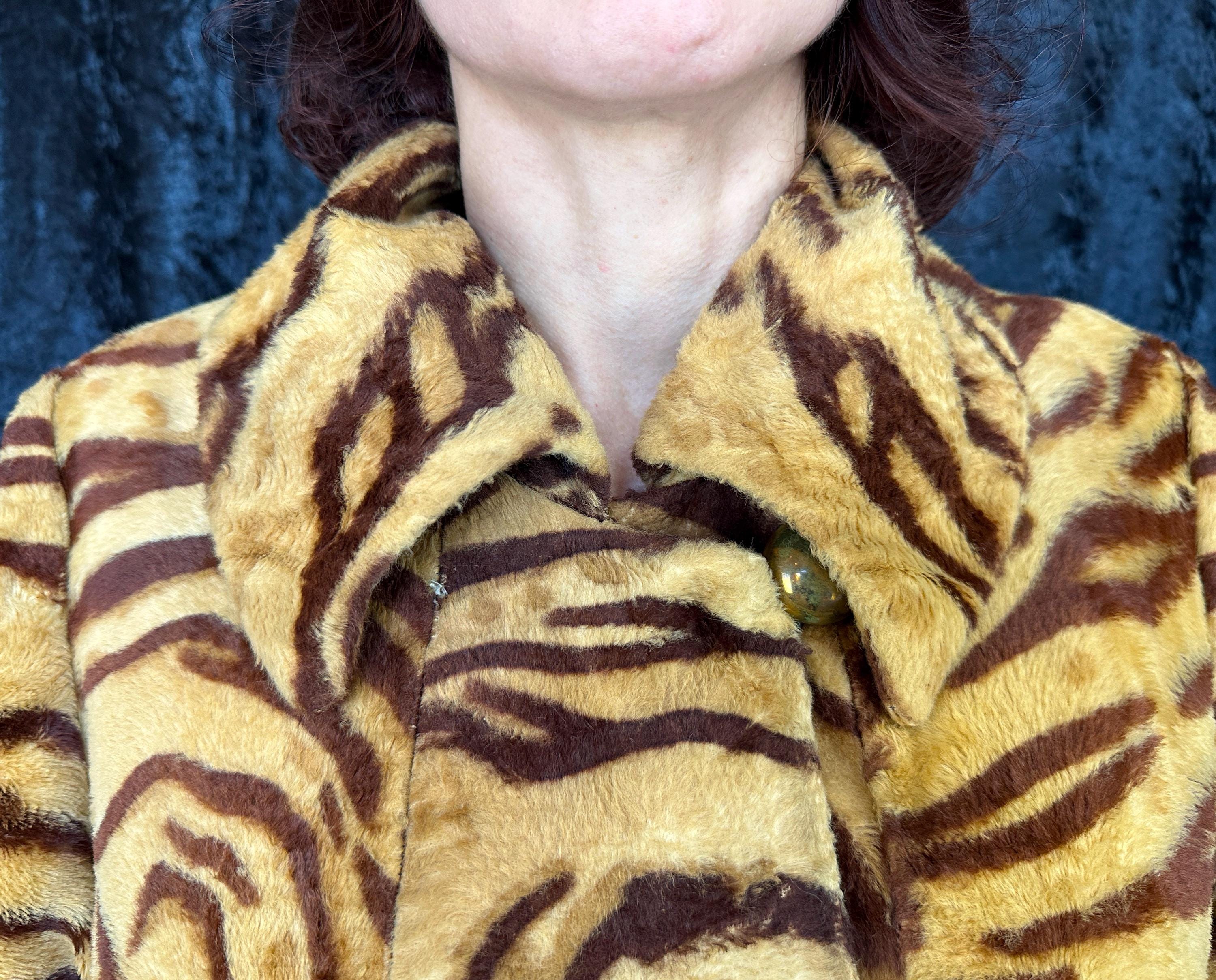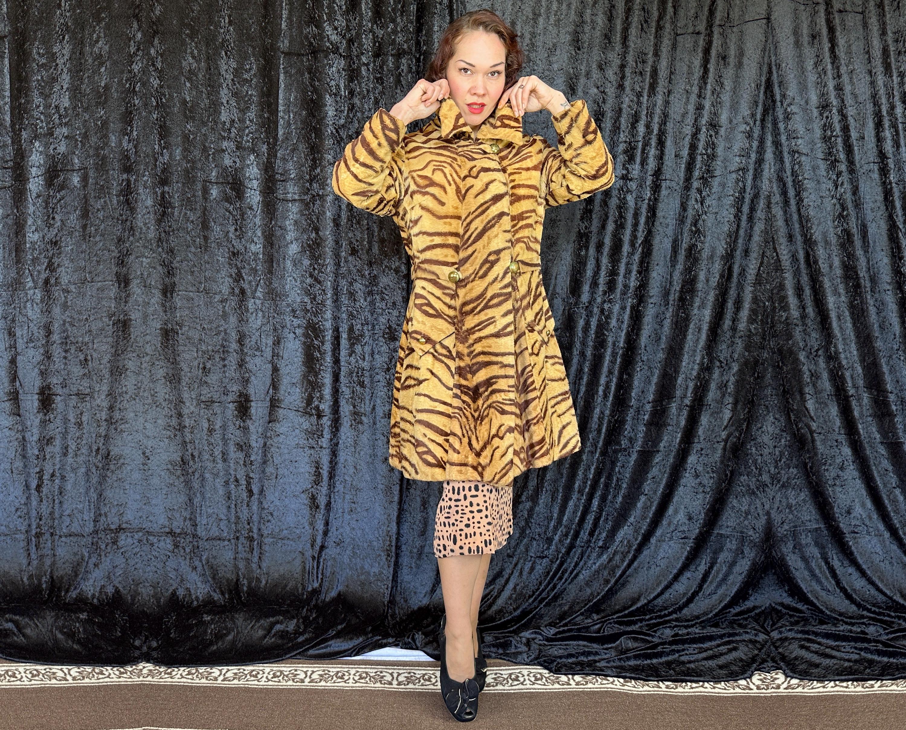 Take a walk on the wild with this 1960s coat and show that sassy snarl! Fully lined with black rayon satin, the outer shell is a cozy short nap faux tiger fur. It has a wide lapel that can be worn bundled up or with the notched points laid out and side seam pockets are decorated with flaps topped with brass buttons. A self-belt lays across the back and part way on the front with the ends adorned with larger brass buttons and are just shy of meeting. Hidden snaps are used in addition to the neck and waist buttons. From "Roos/Atkins". This coat is in great vintage condition, the buttons show wear but no holes, stains, or odors to note.