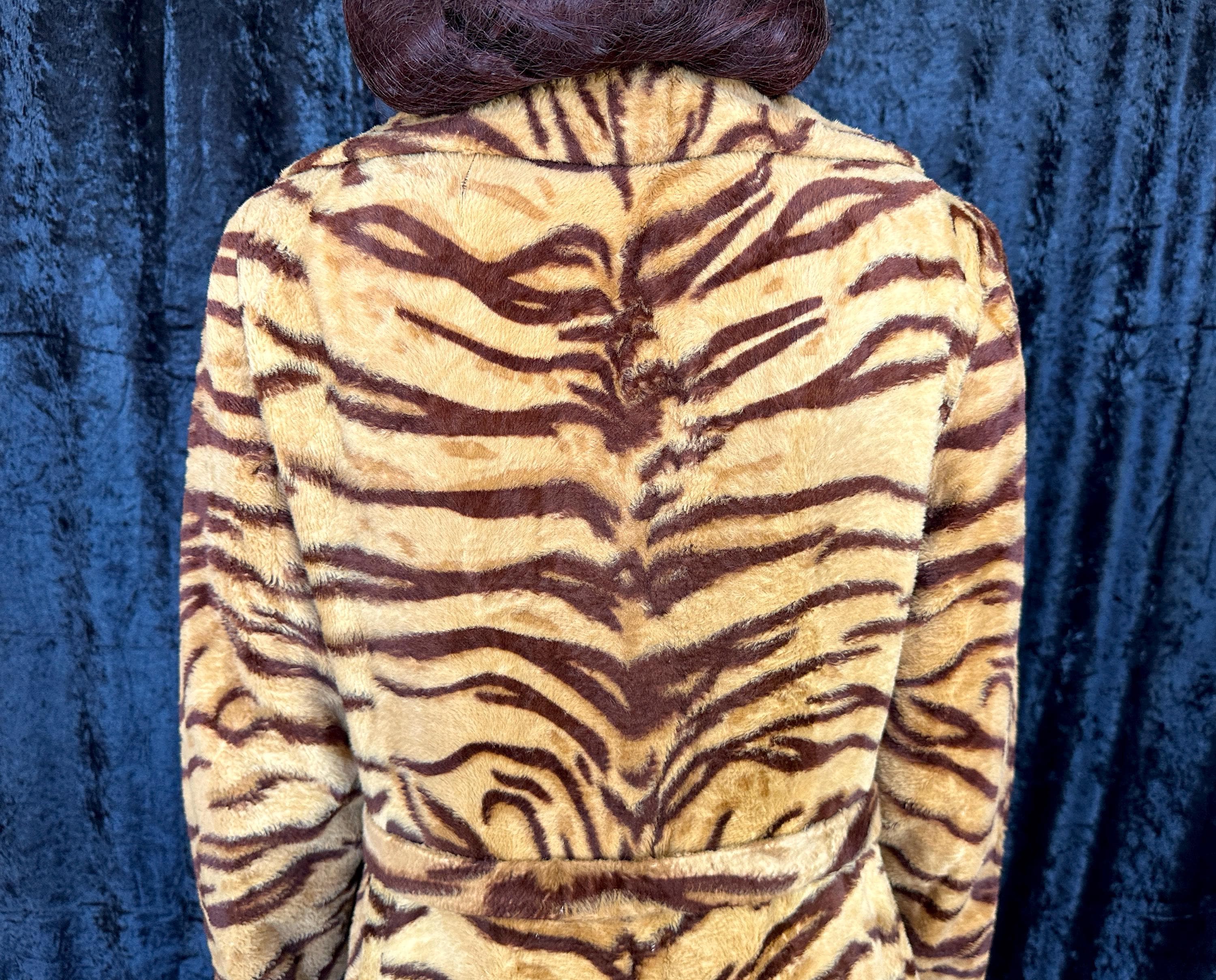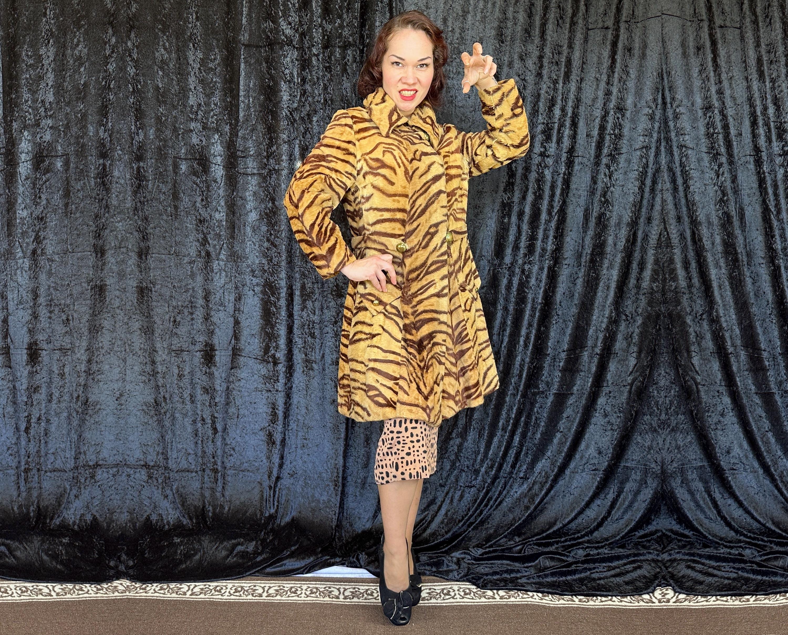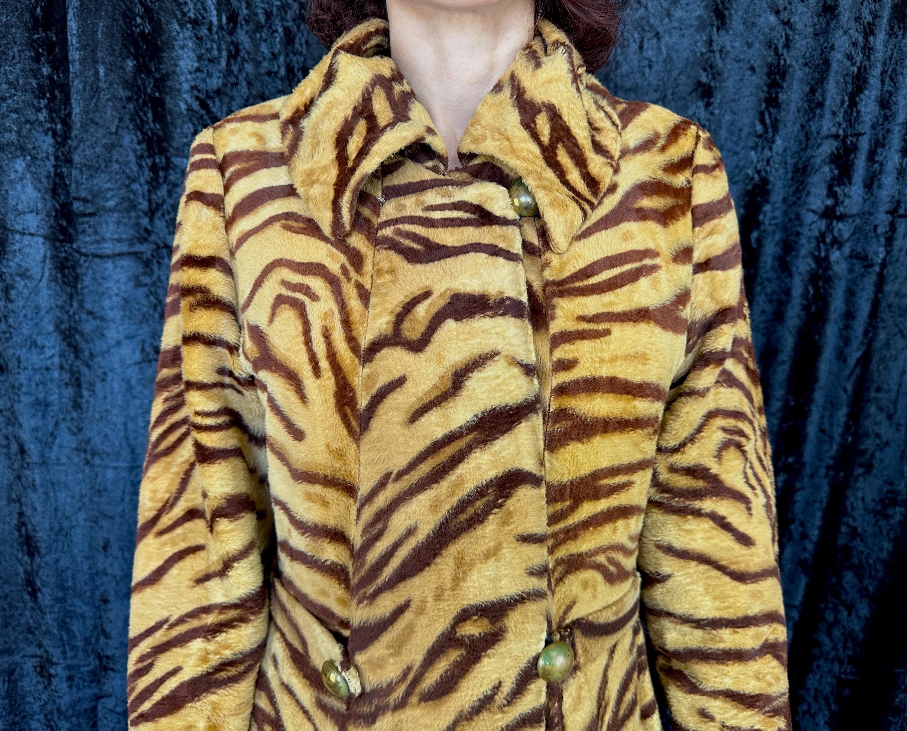 Take a walk on the wild with this 1960s coat and show that sassy snarl! Fully lined with black rayon satin, the outer shell is a cozy short nap faux tiger fur. It has a wide lapel that can be worn bundled up or with the notched points laid out and side seam pockets are decorated with flaps topped with brass buttons. A self-belt lays across the back and part way on the front with the ends adorned with larger brass buttons and are just shy of meeting. Hidden snaps are used in addition to the neck and waist buttons. From "Roos/Atkins". This coat is in great vintage condition, the buttons show wear but no holes, stains, or odors to note.